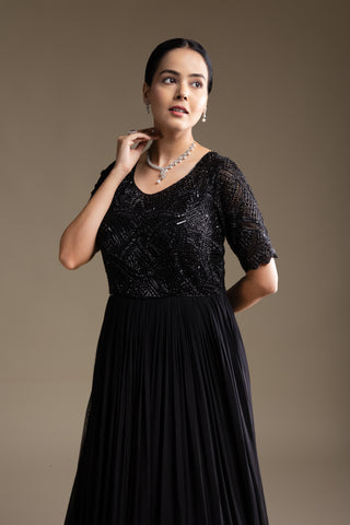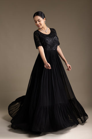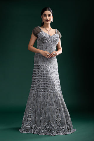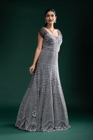 Silver Grey Sleeveless Gown with Sequins and Net Dupatta
