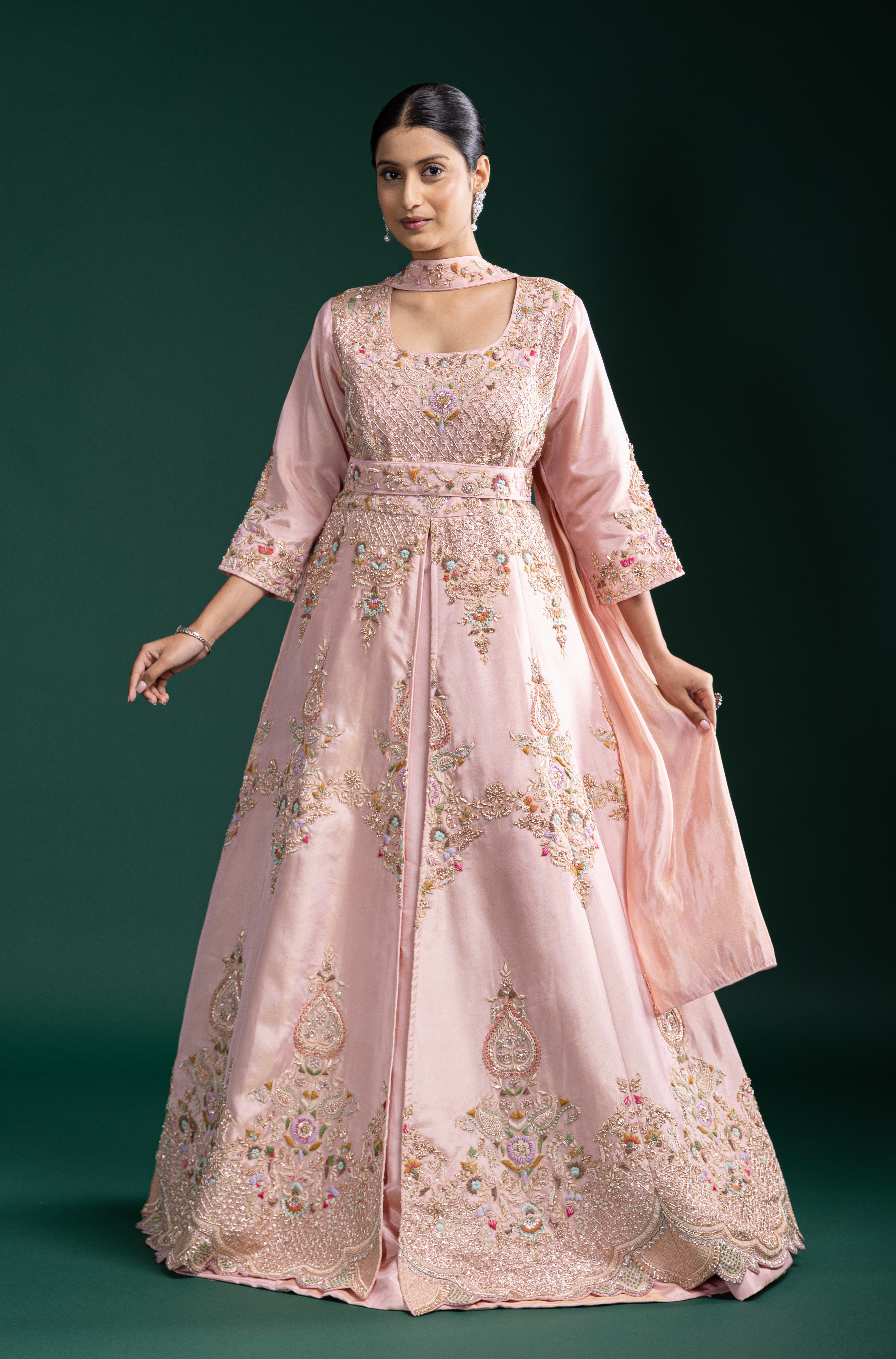Make an entrance with this royal blush silk gown, beautifully hand-embroidered with zardozi, resham, and sequin detailing,paired with a Belt and Dupatta, giving you a perfect blend of heritage and glam.