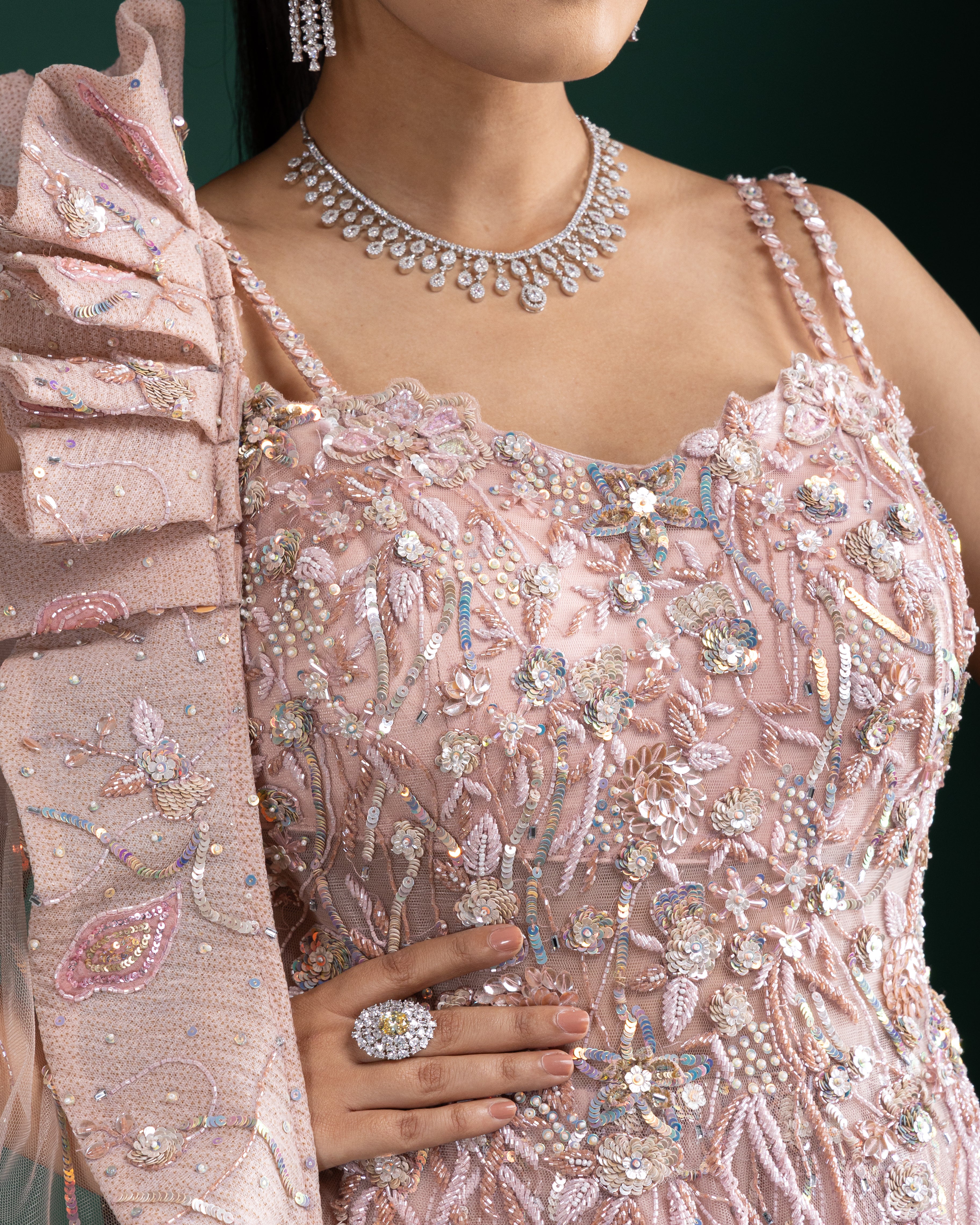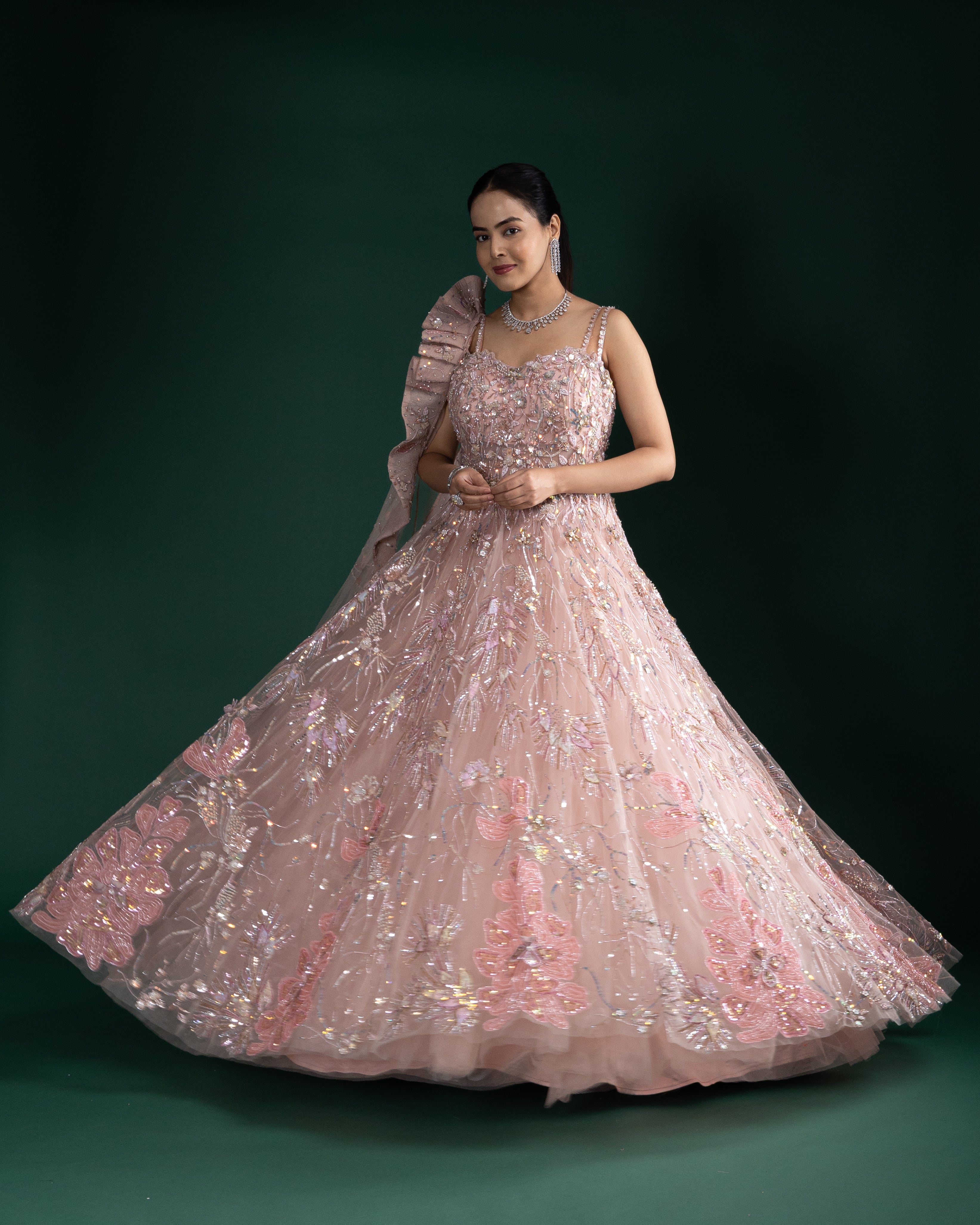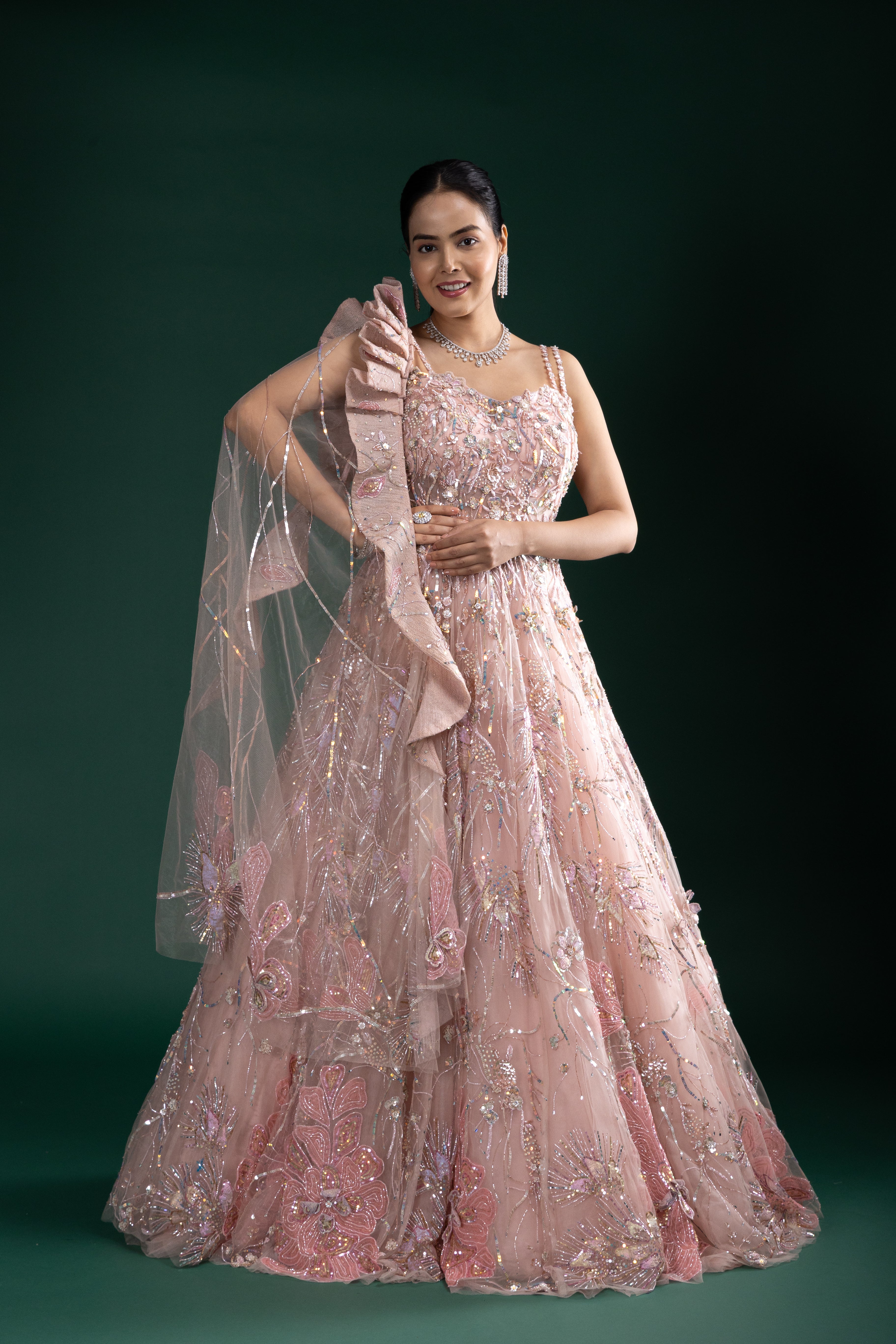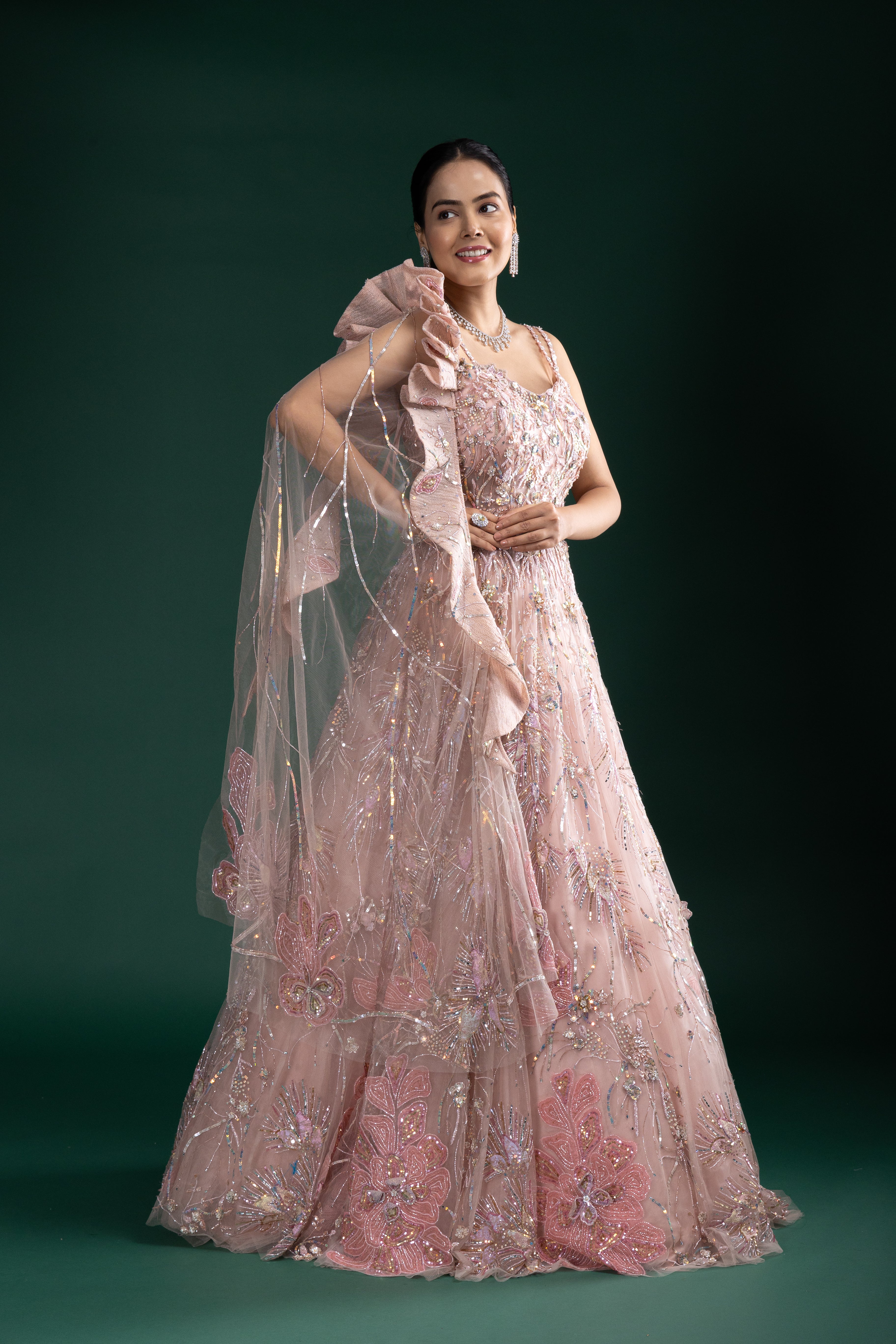 Blush Rose Glow Gown With 3D Floral Hand Embroidery And Attached Ruffled Dupatta