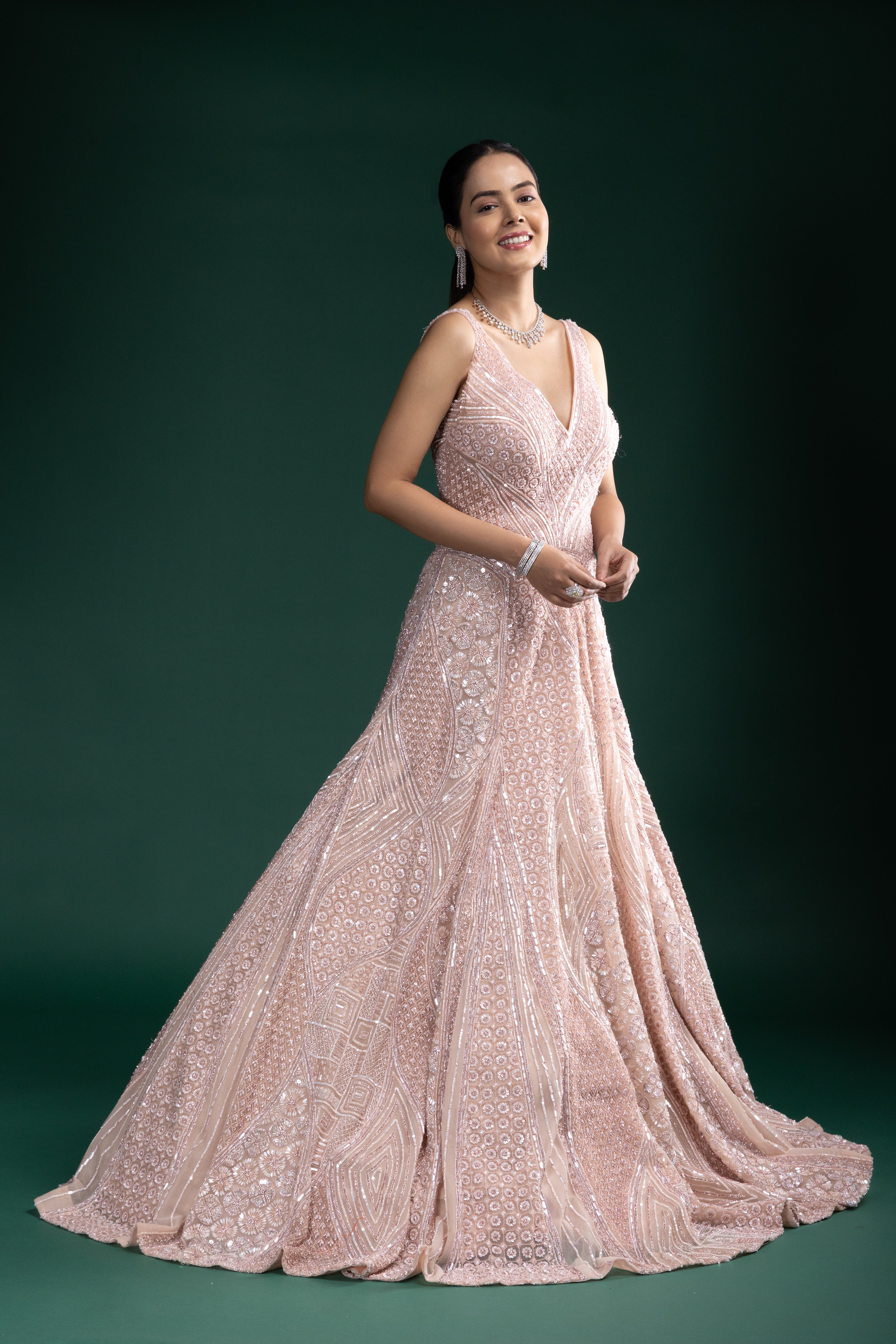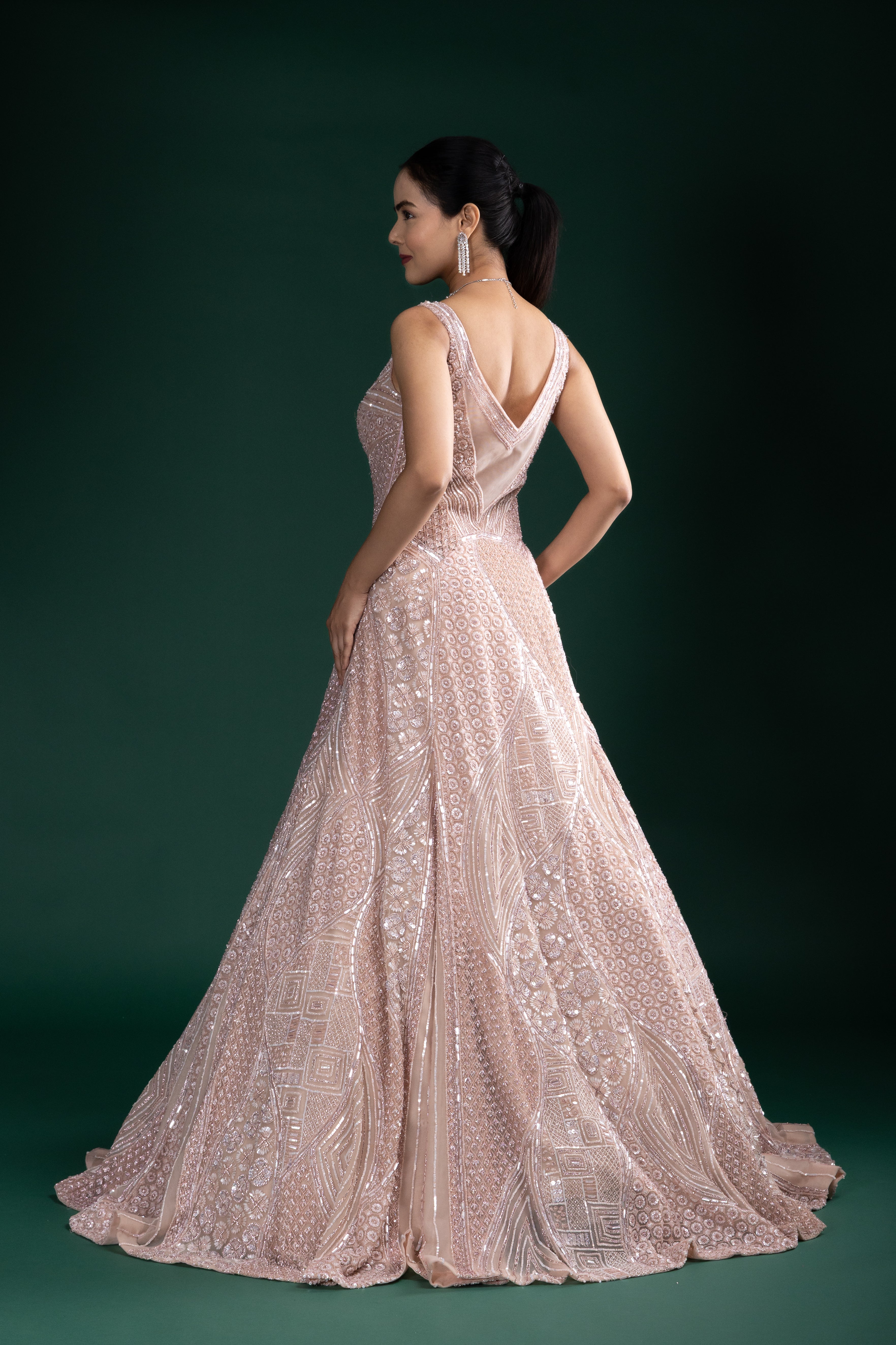Step into understated glamour with this soft blush pink gown featuring linear and geometric sequin embroidery, a flattering sleeveless neckline, and a soft, flared hem for graceful movement.