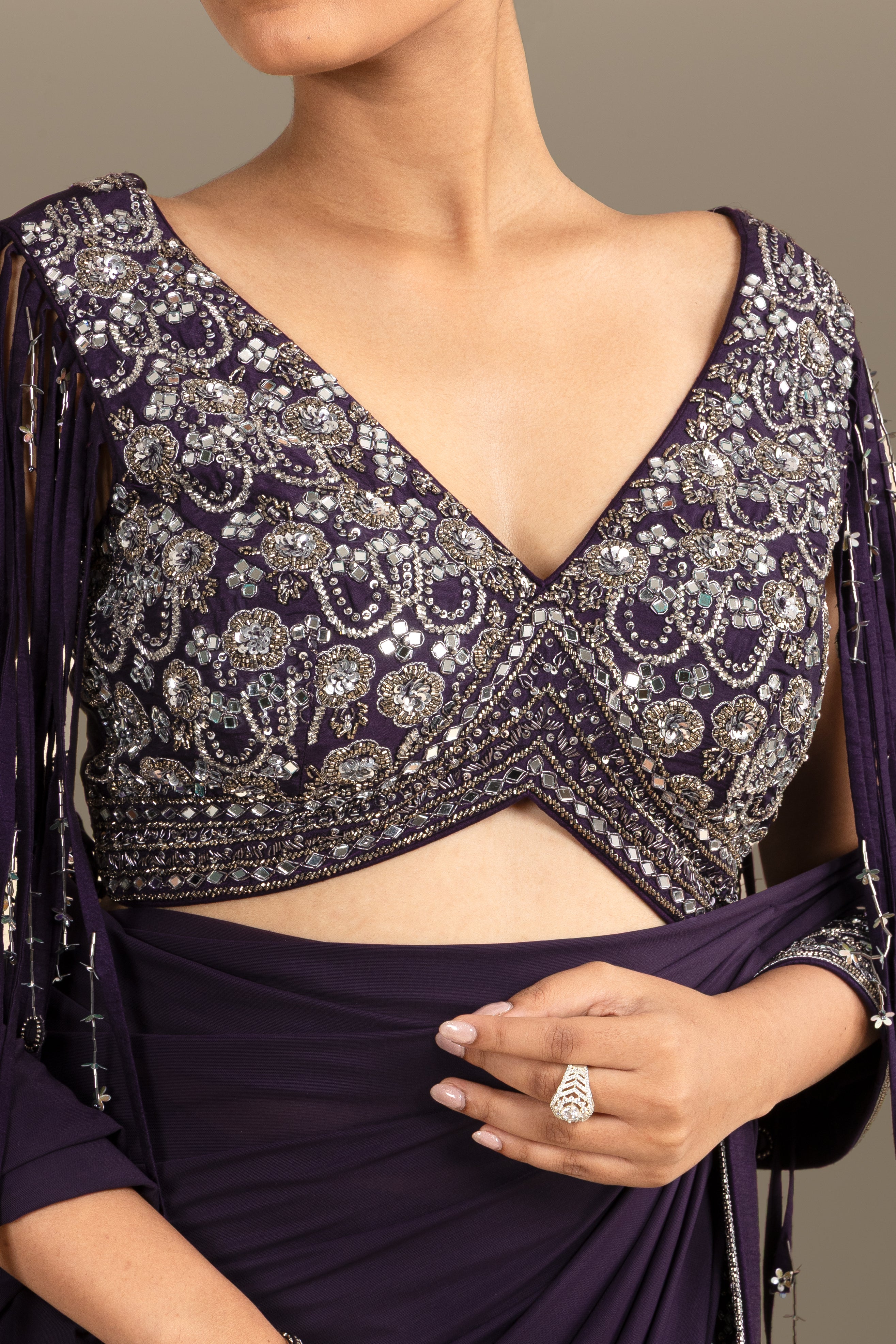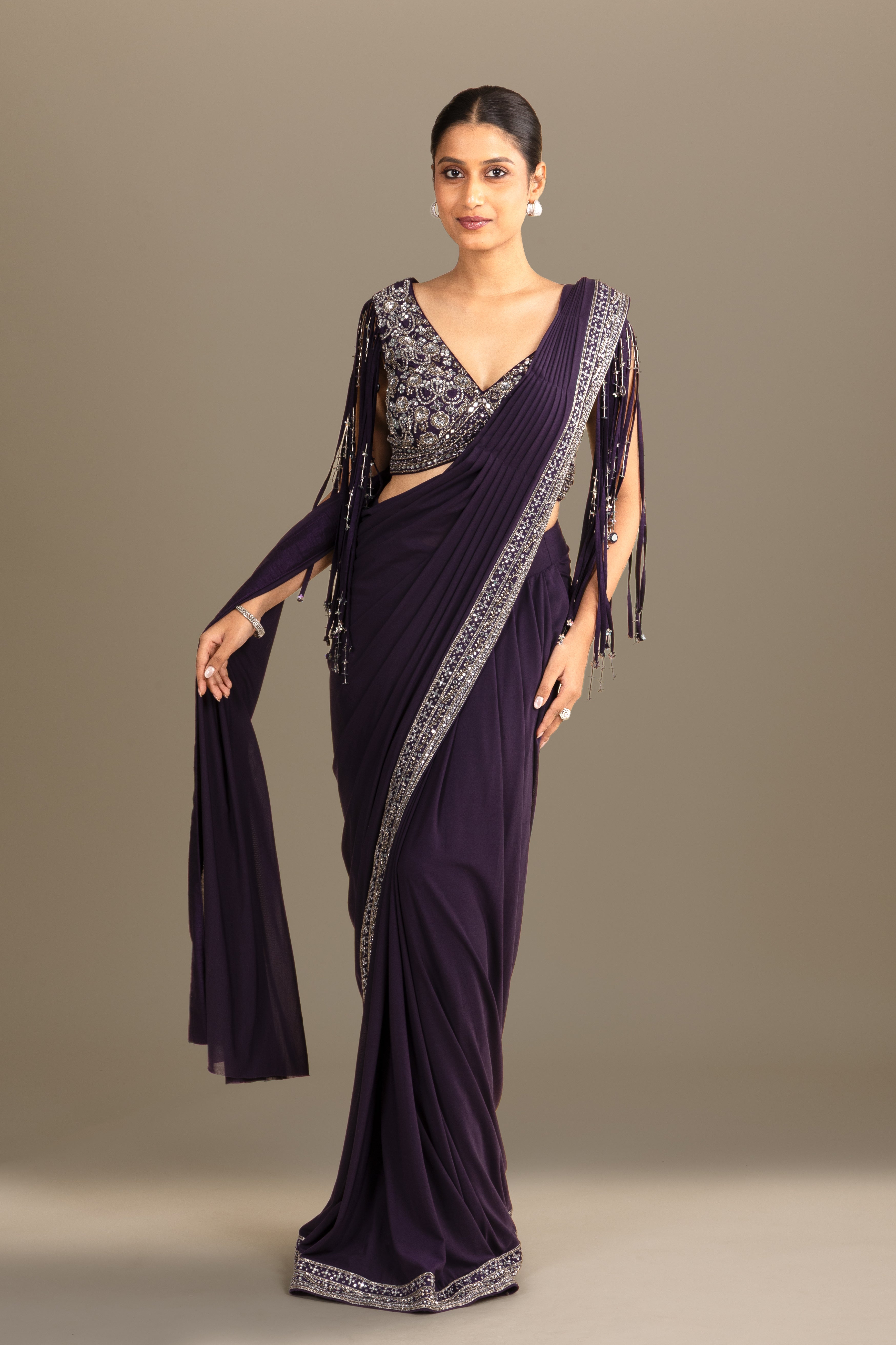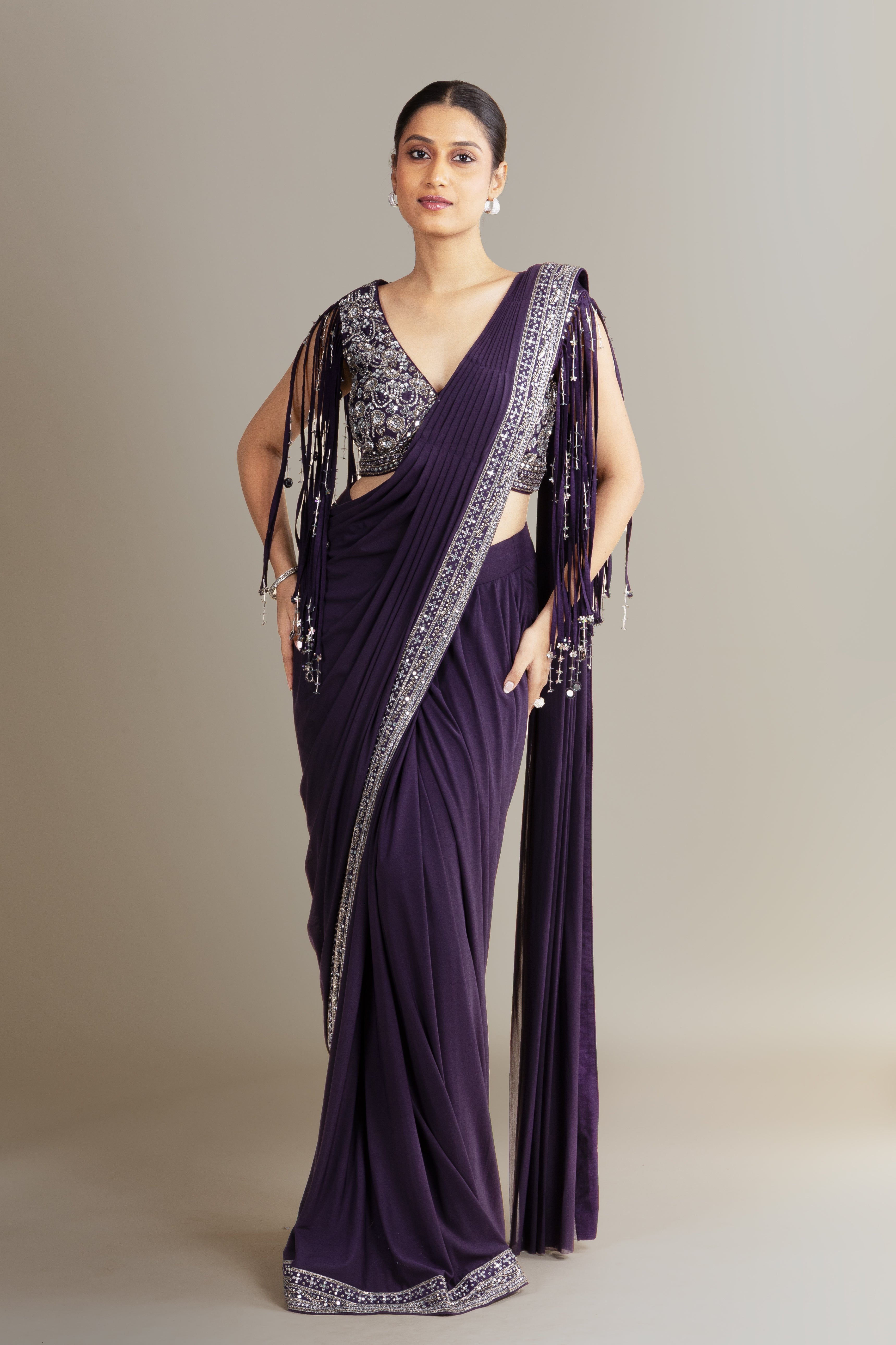 Turn heads with this plum saree featuring fringe details and ornate embroidery, a perfect fit for upscale cocktail parties and sangeet nights.