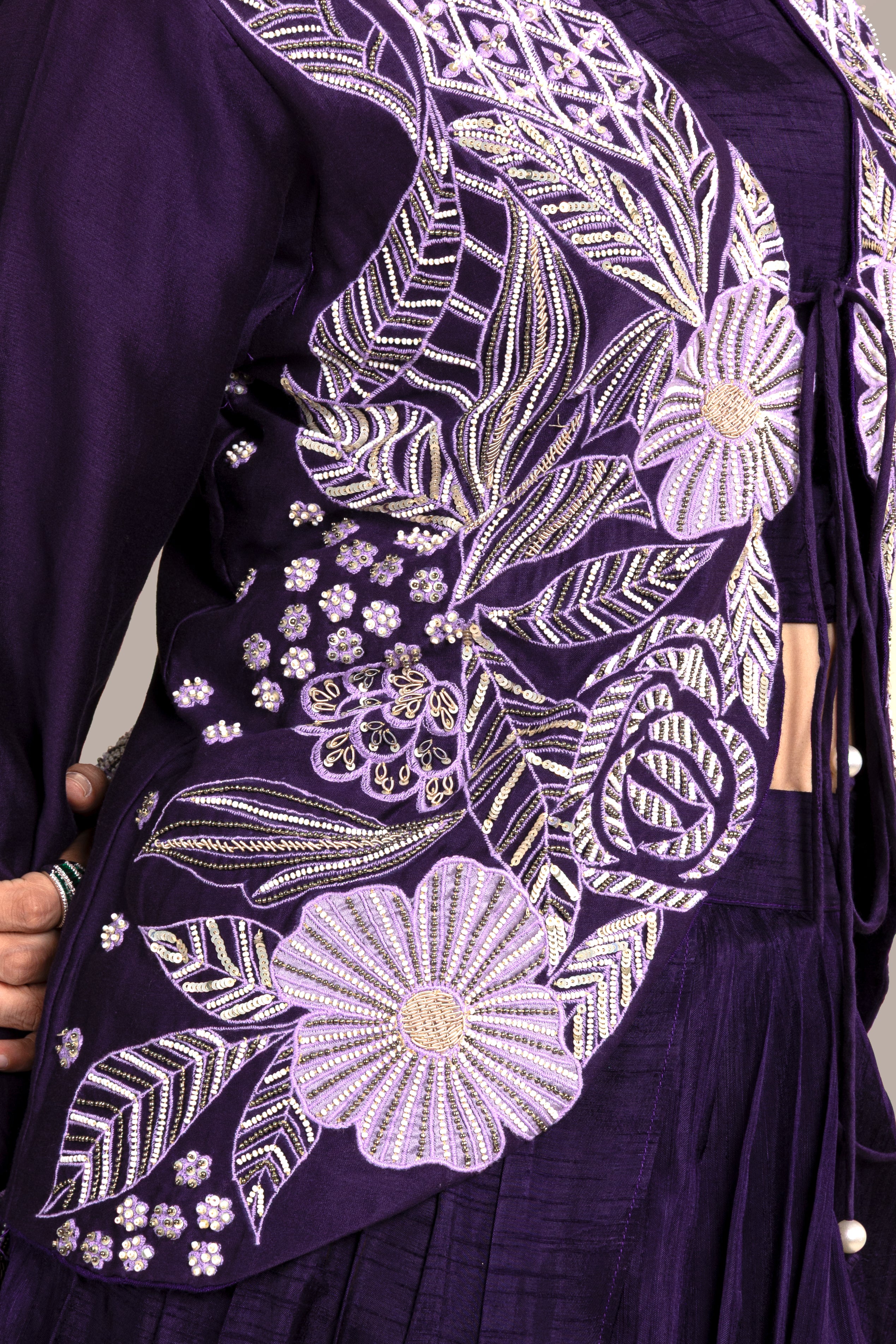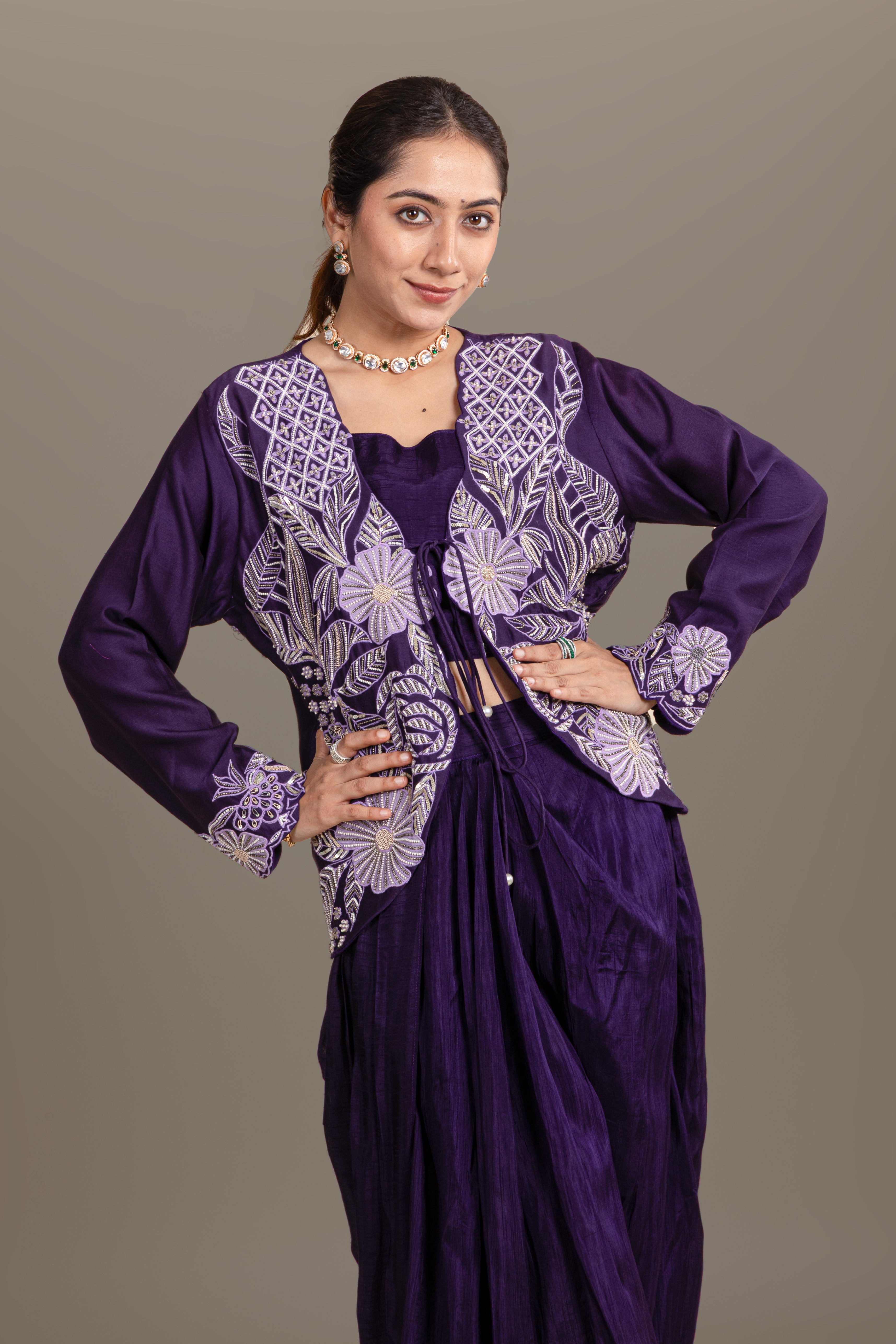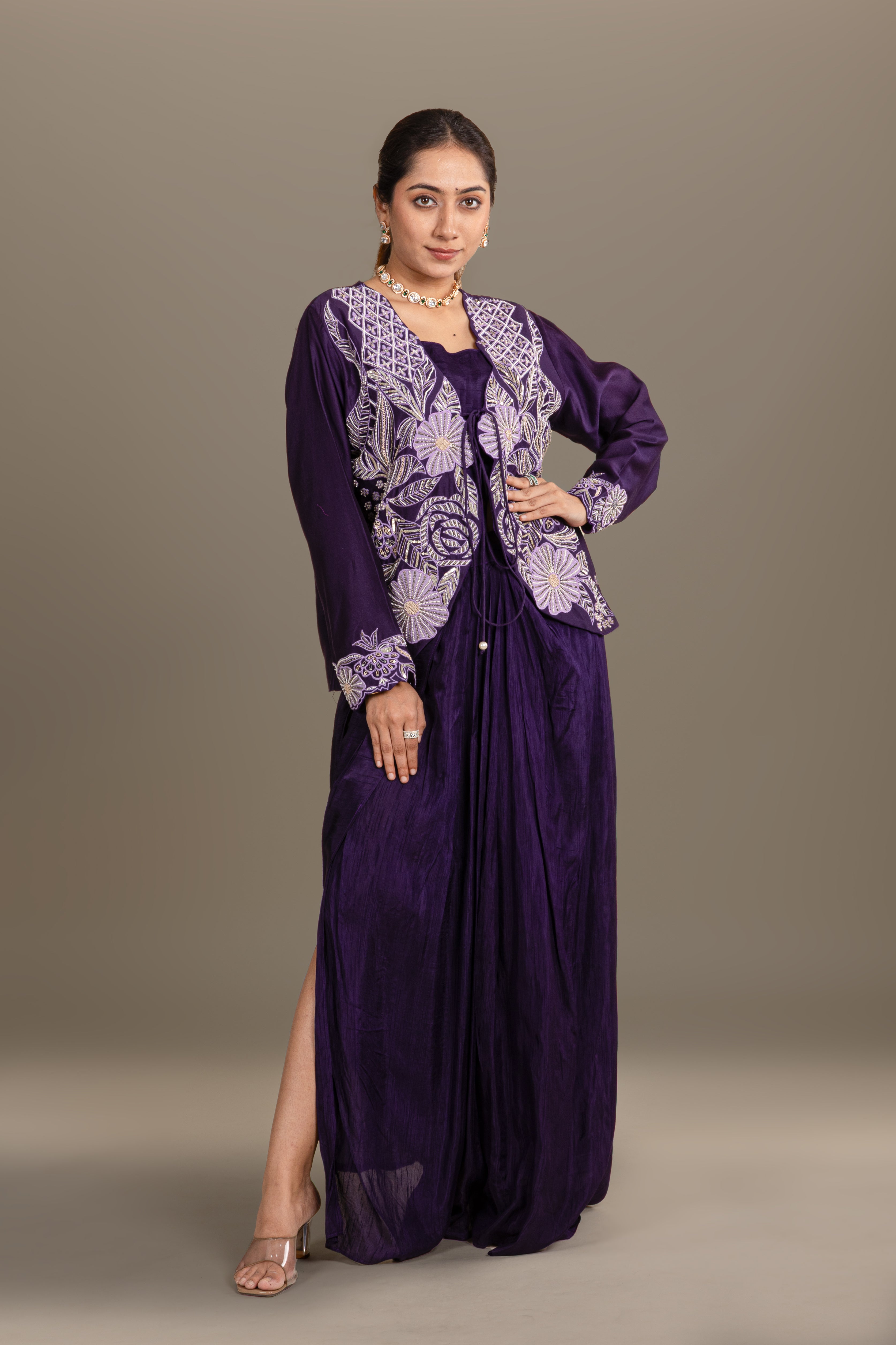 Embrace luxury with this royal plum noir drape set, featuring bold floral embroidery that adds a touch of modern opulence to traditional drapes.