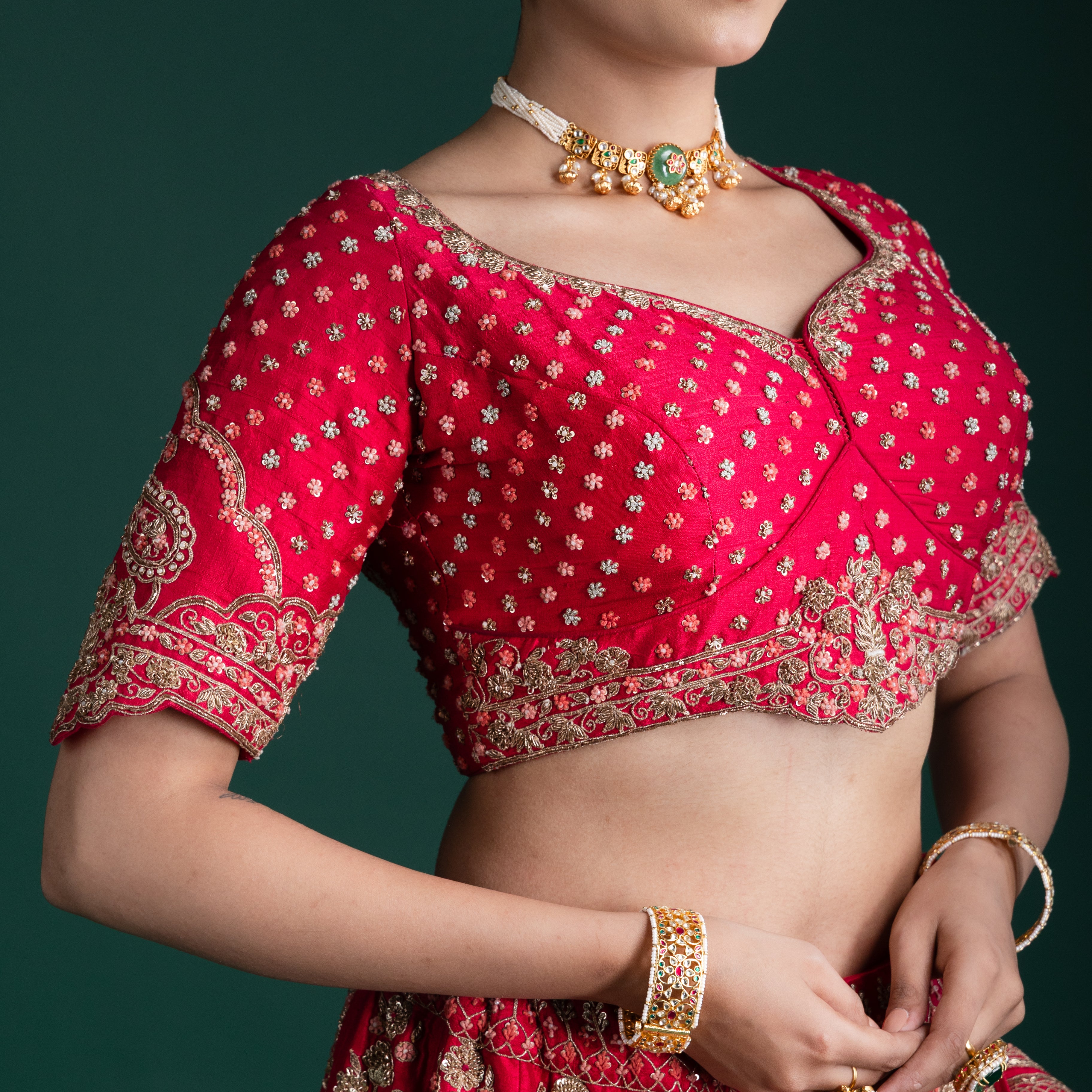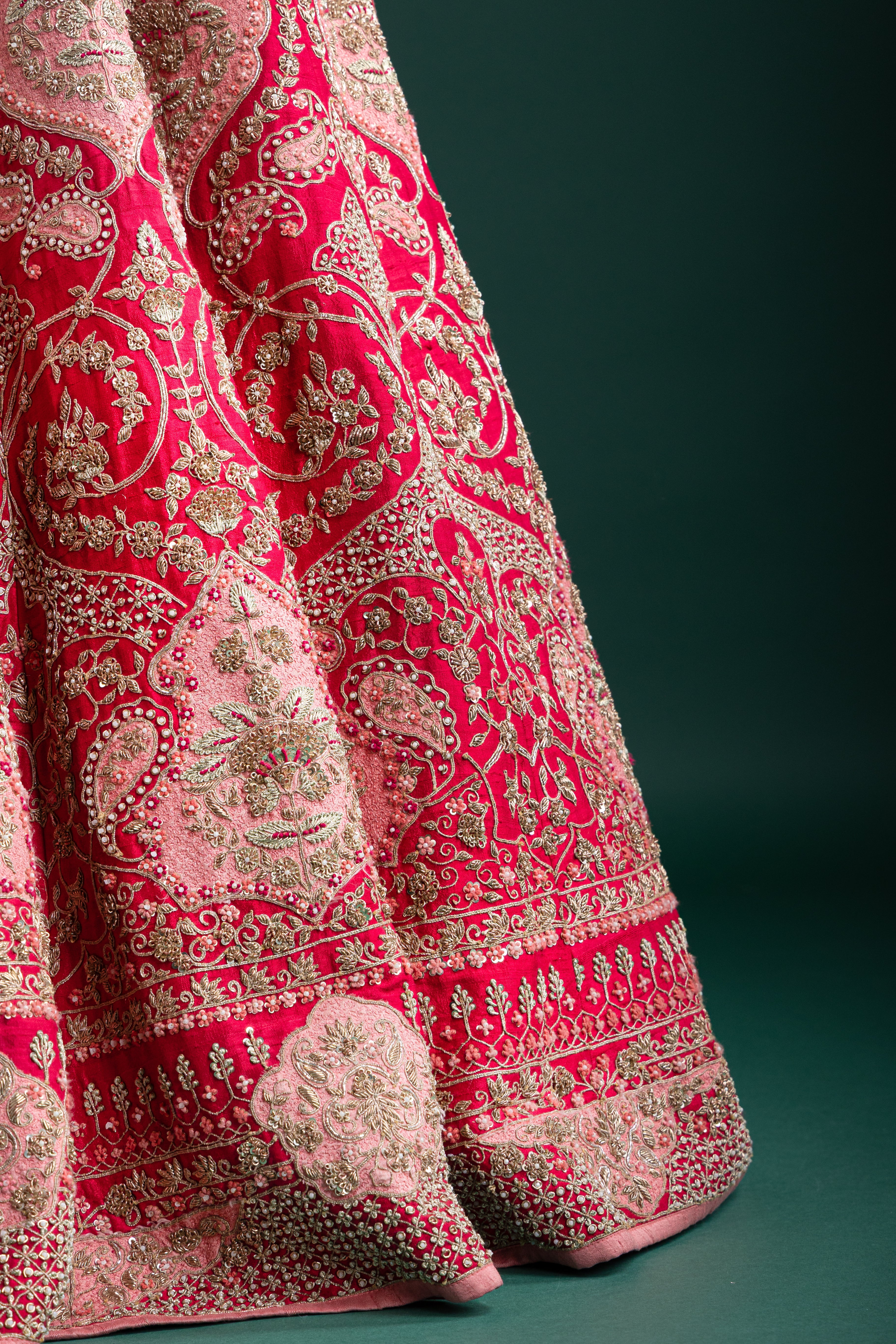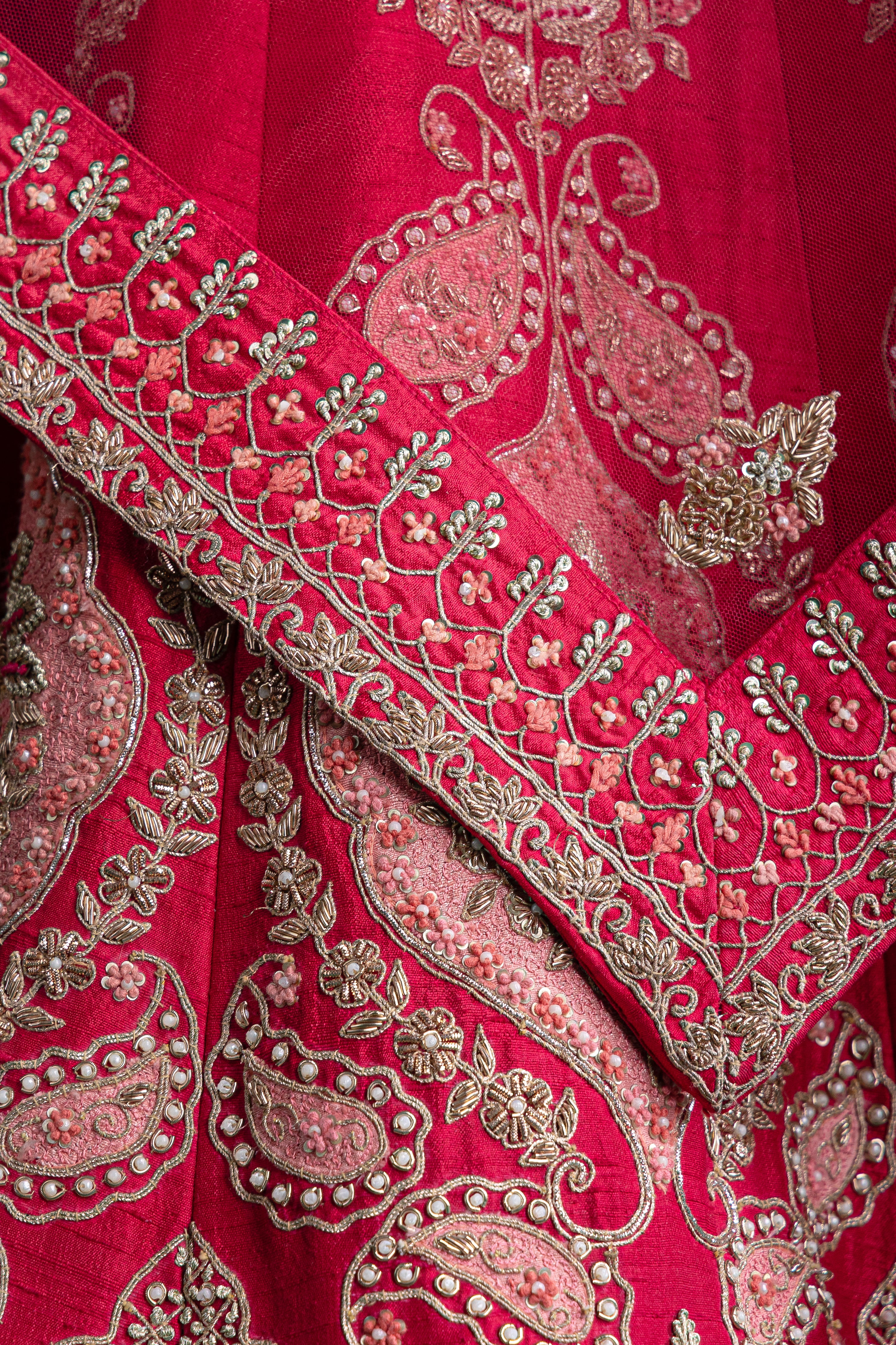 An imperial ruby lehenga that embodies royal elegance with grand zari detailing and delicate handwork for a high-fashion bridal aesthetic.