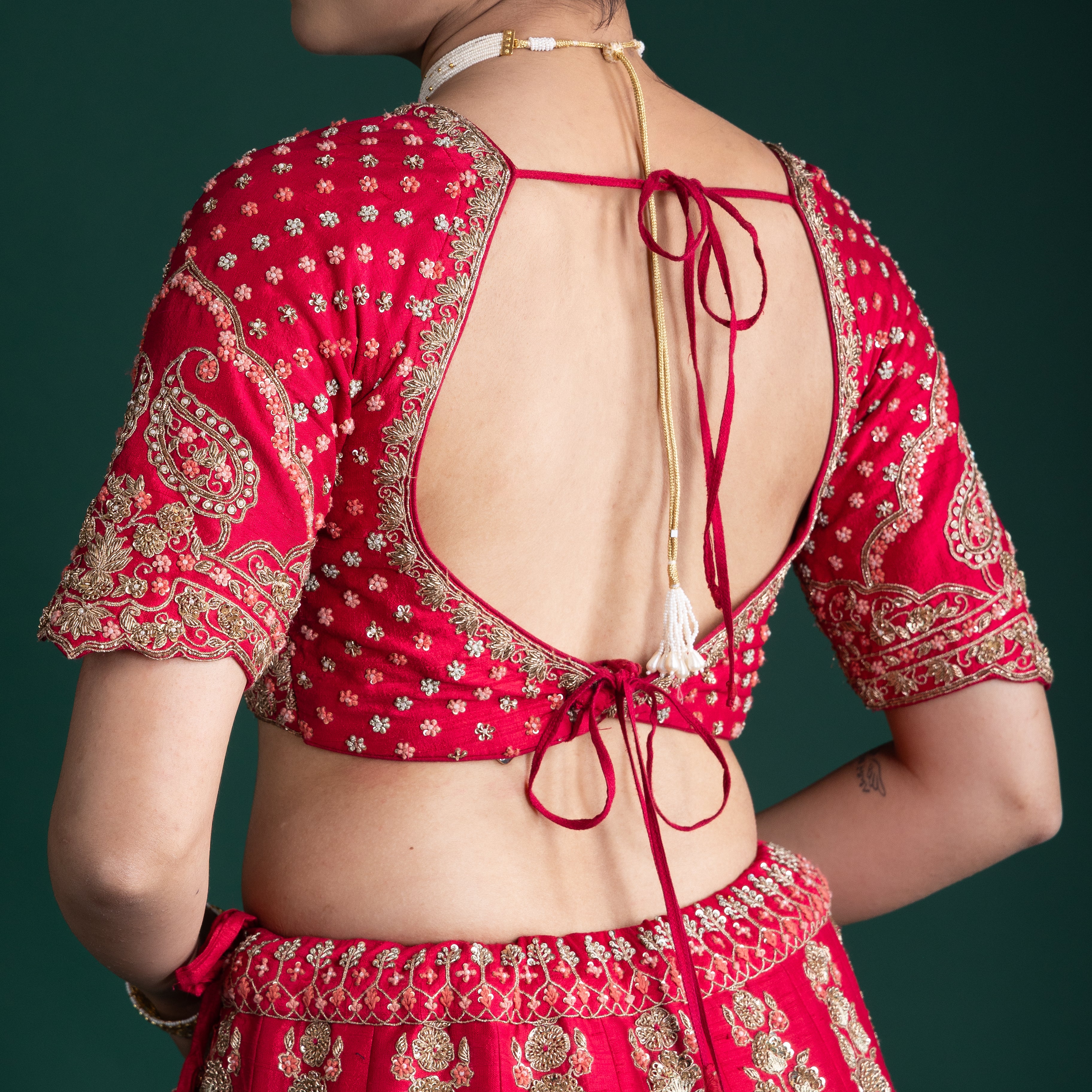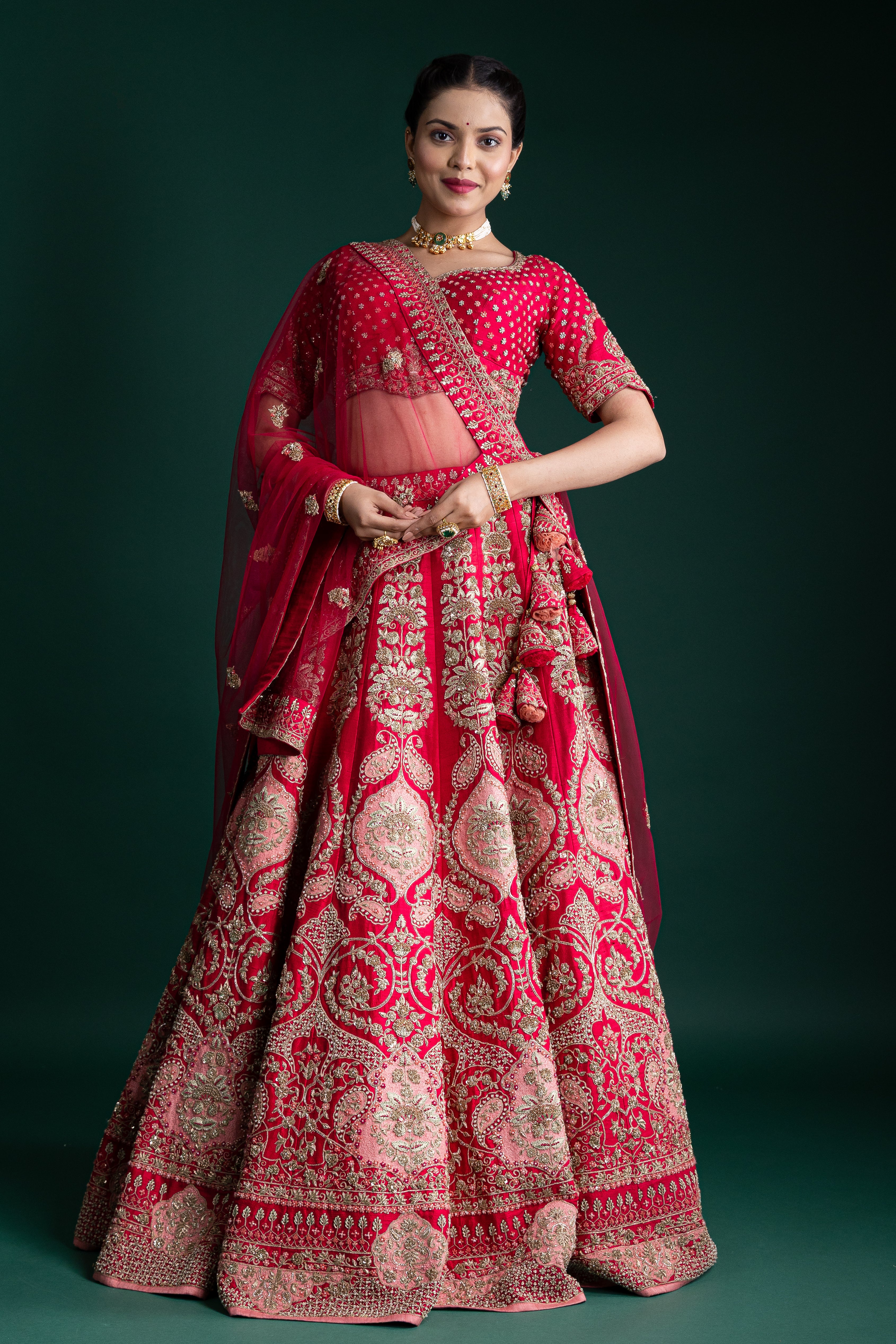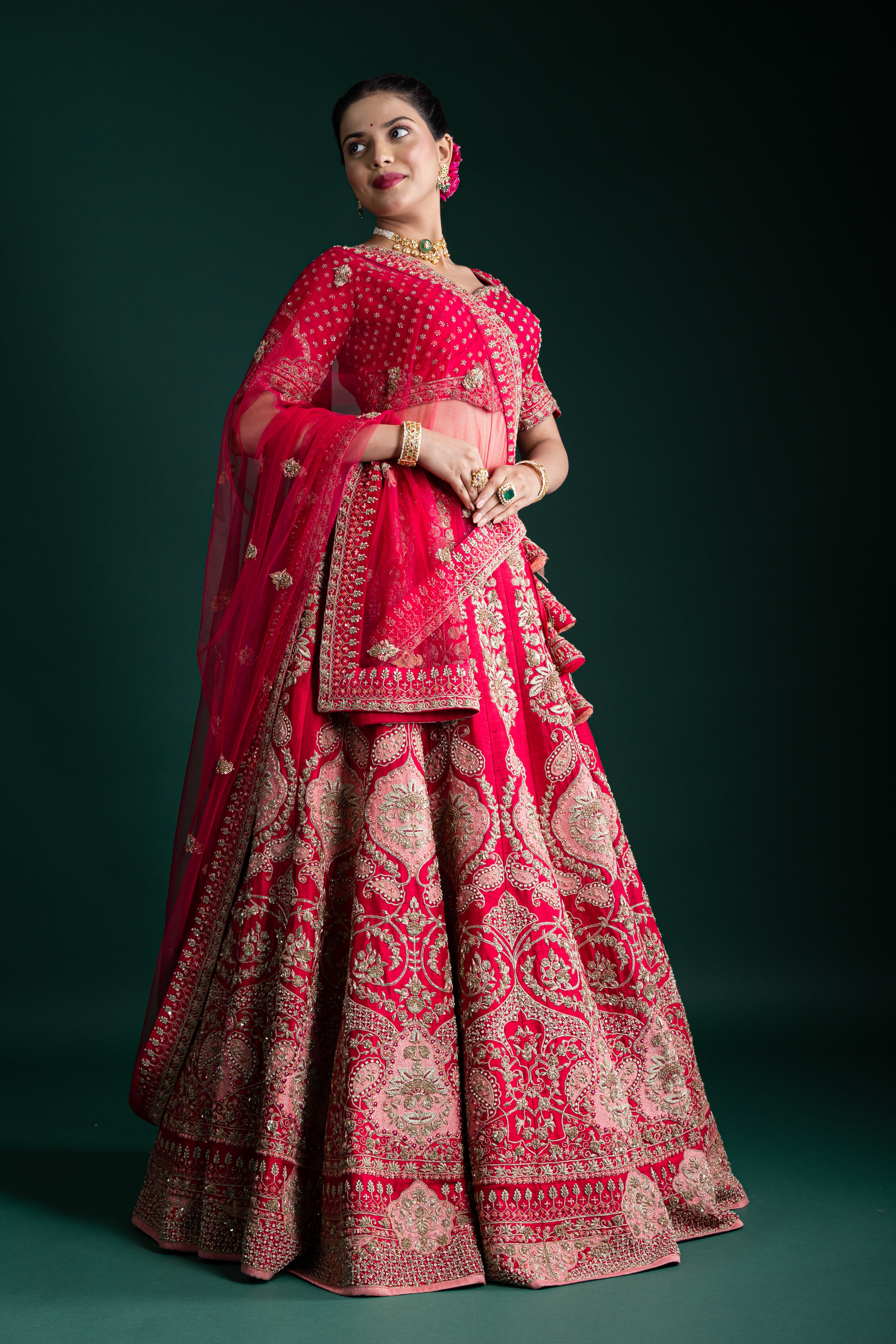 An imperial ruby lehenga that embodies royal elegance with grand zari detailing and delicate handwork for a high-fashion bridal aesthetic.