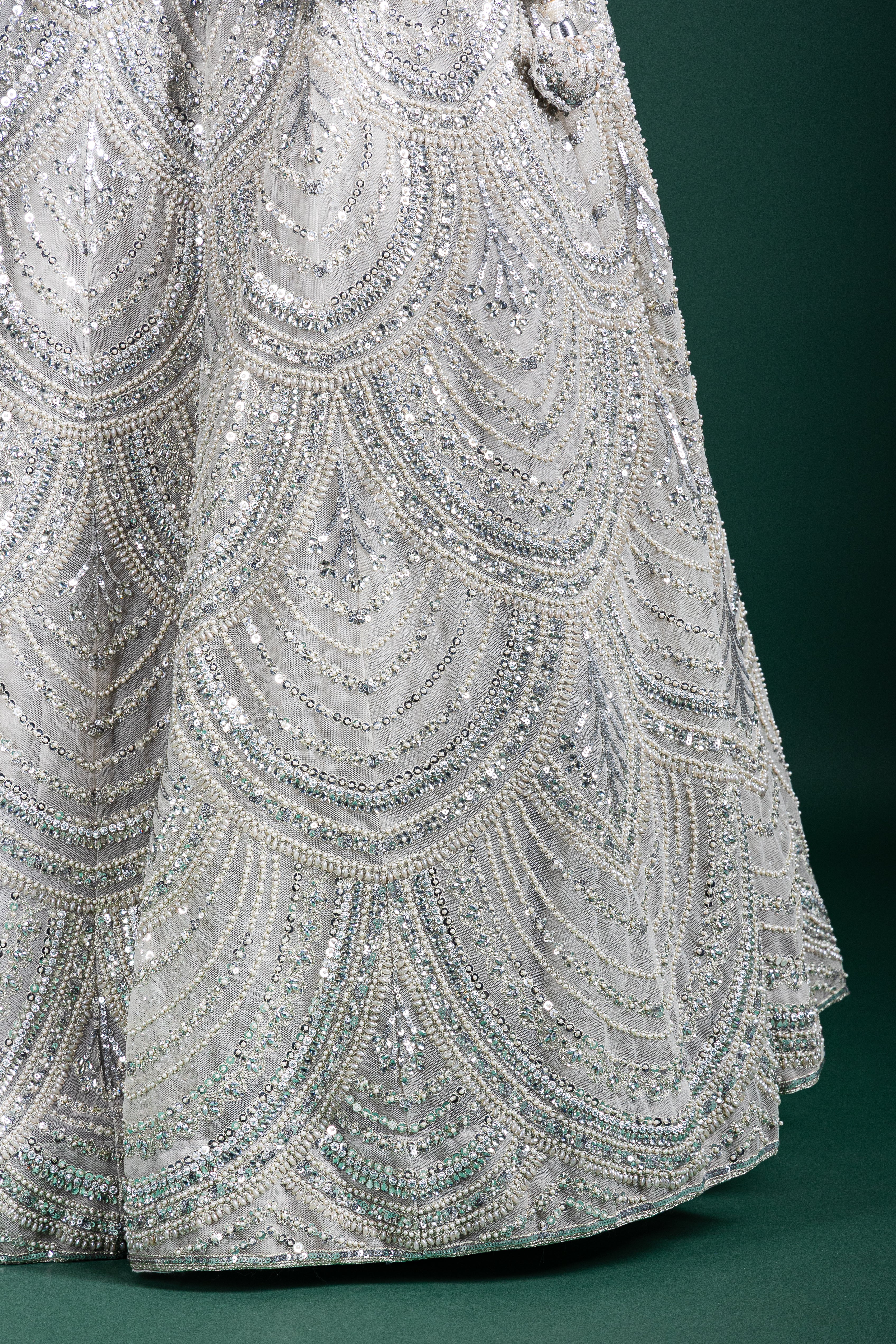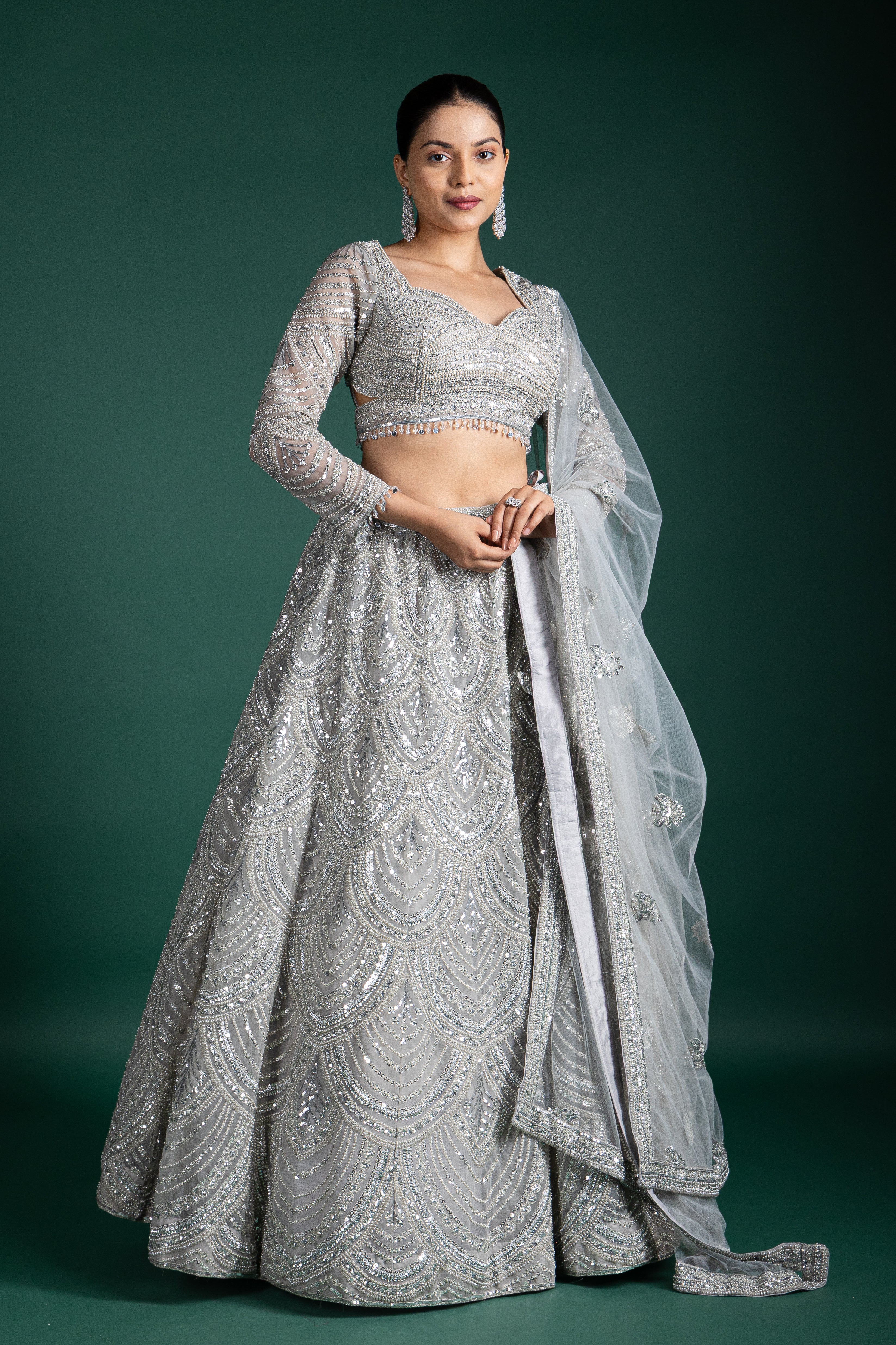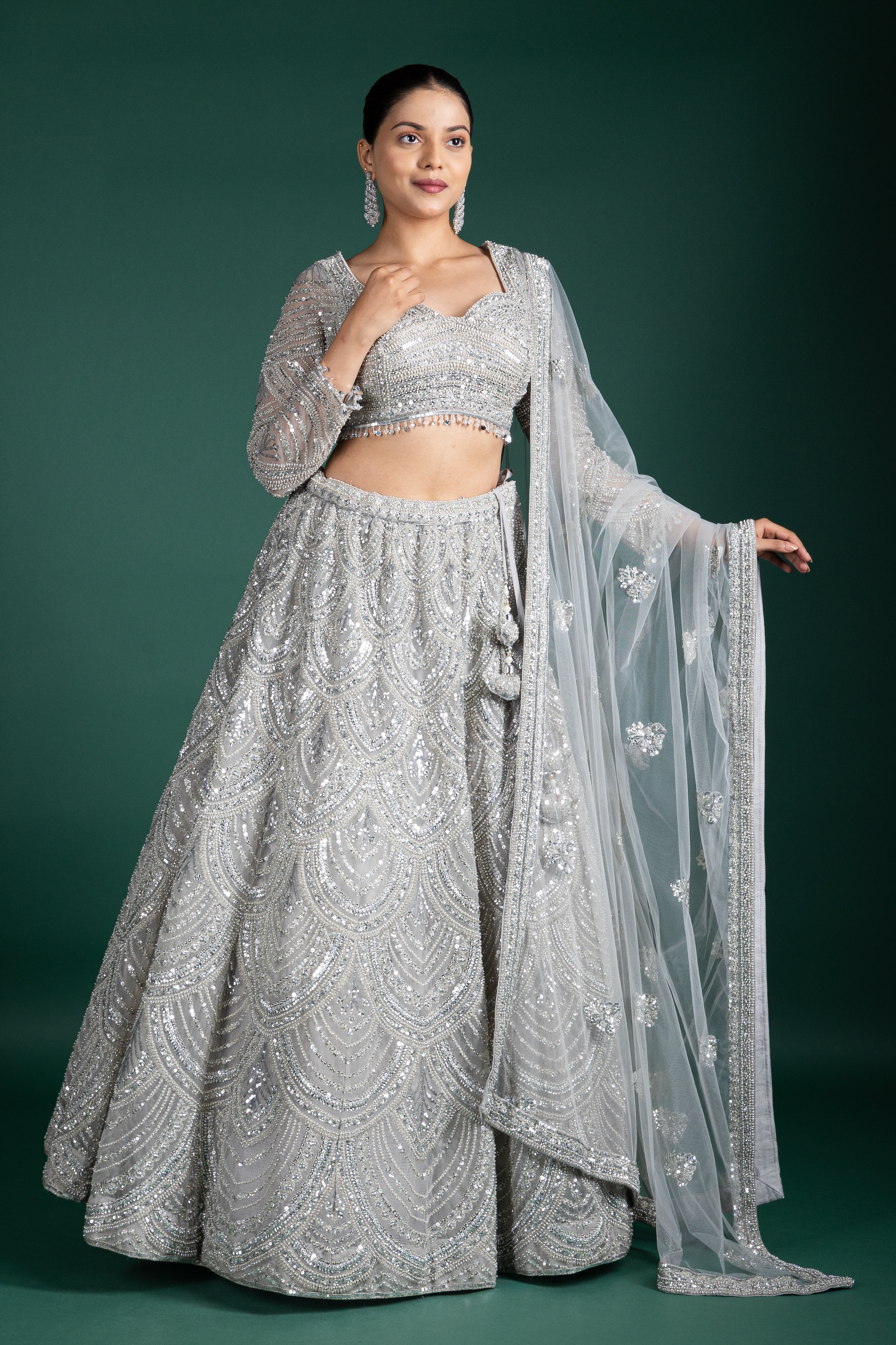 A striking silver-grey lehenga with heavy sequin work that catches the light perfectly, making it a statement piece for glamorous evening affairs.