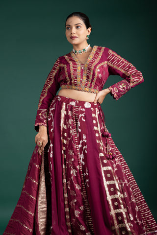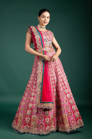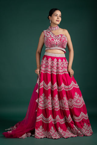 Vibrant Fuchsia Drape Skirt Set with Intricate Thread Embroidery