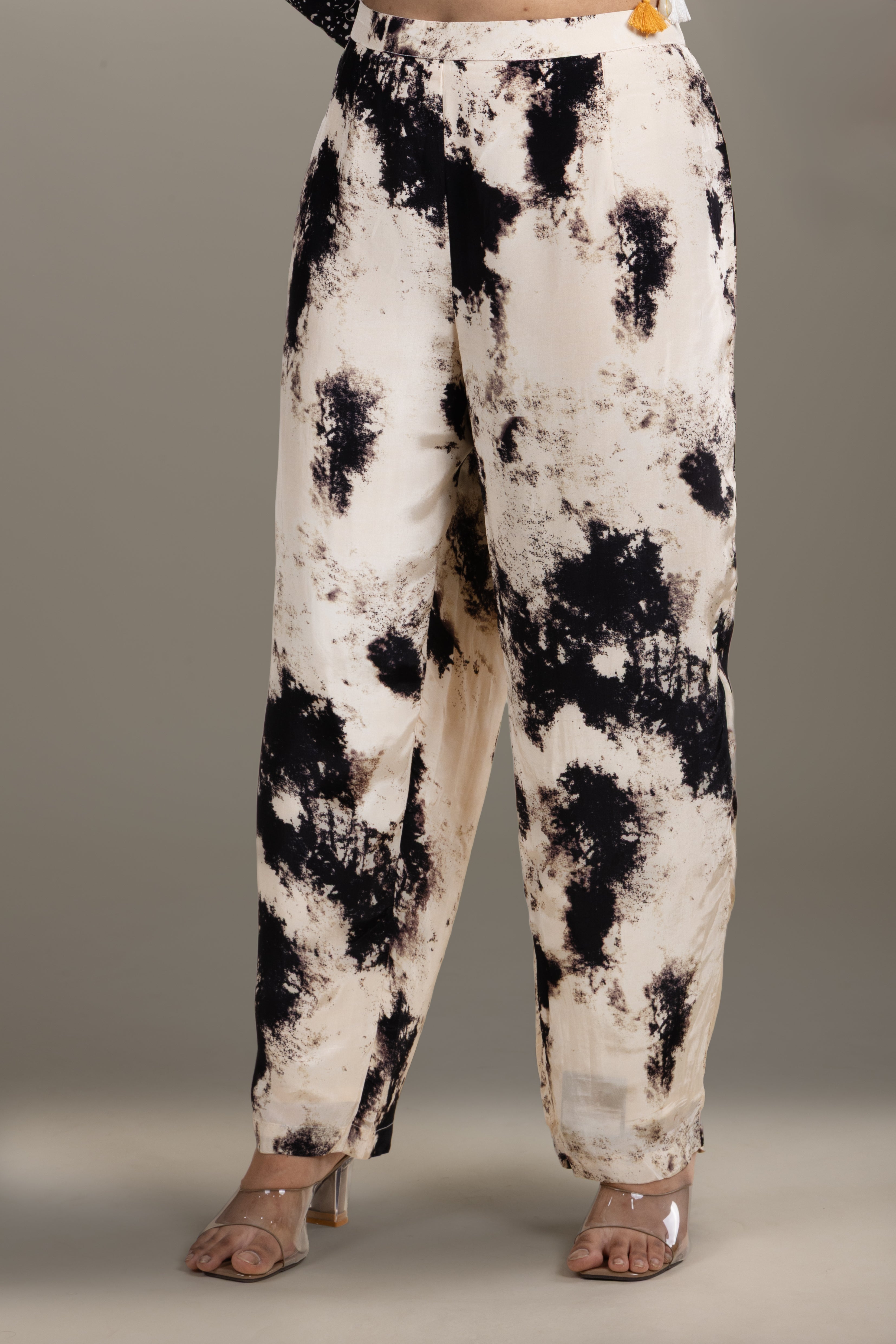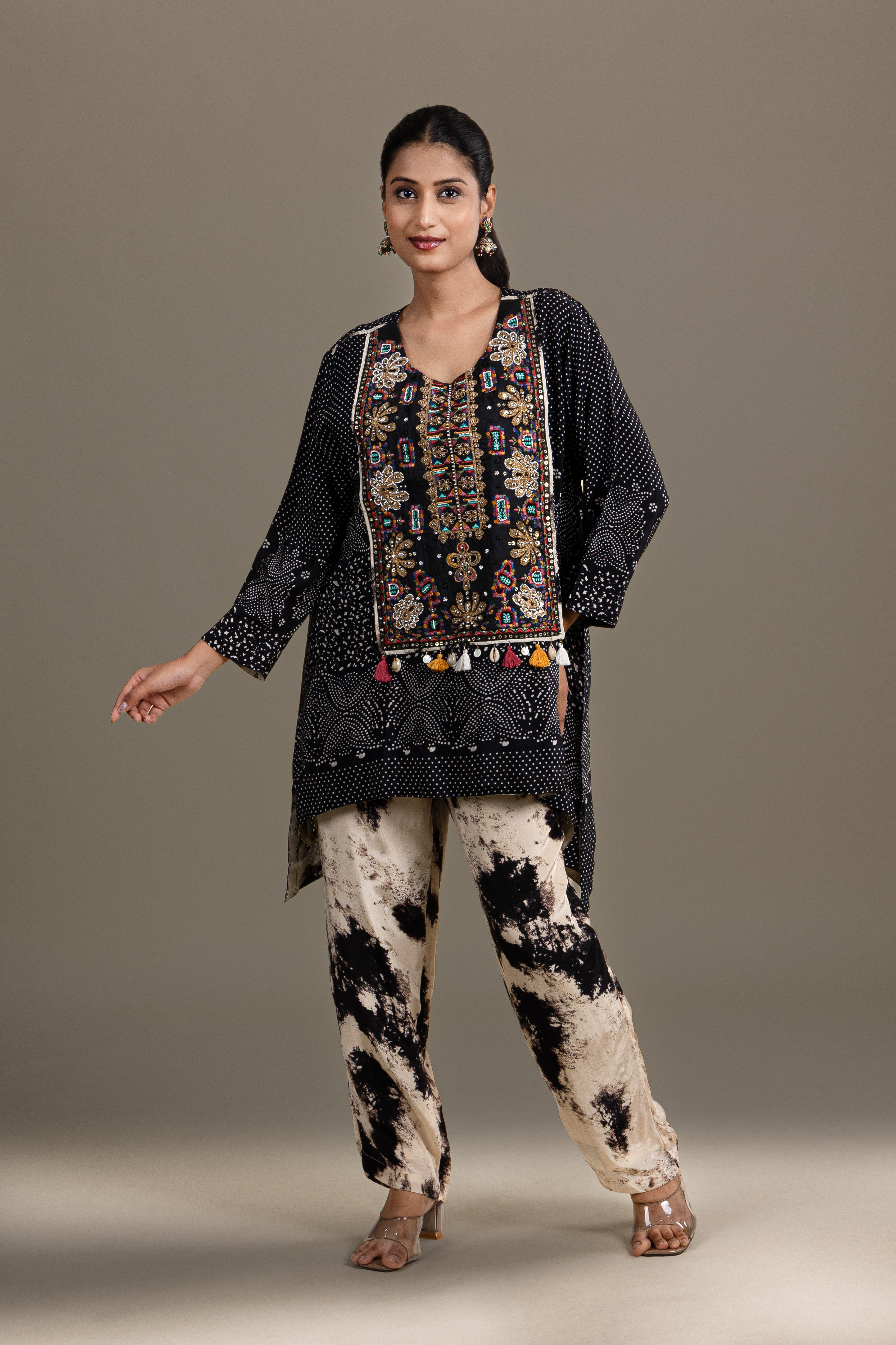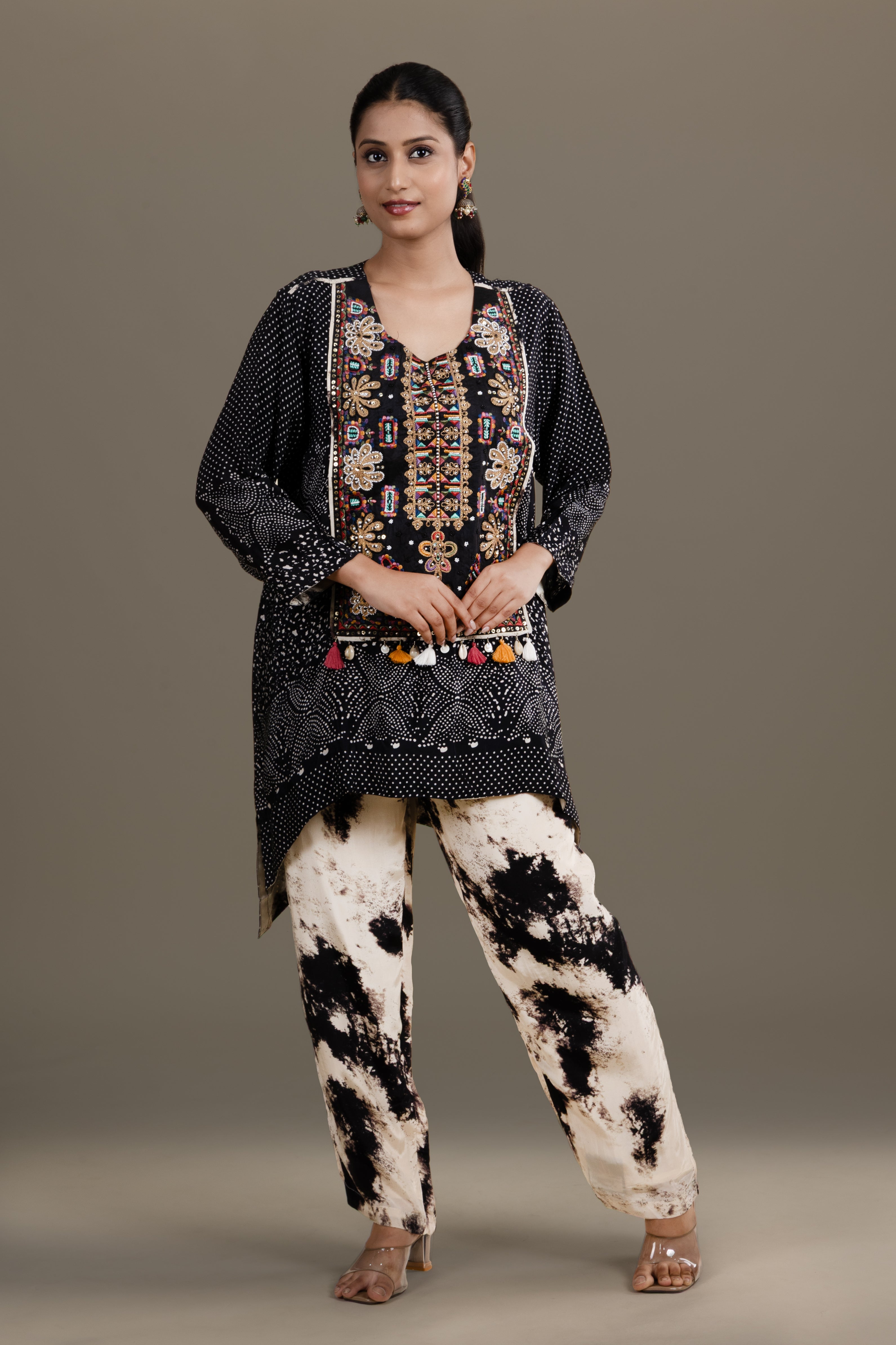 A unique black kurta featuring rich embroidery paired with trendy tie-dye effect pants, offering a perfect fusion of traditional and contemporary style.