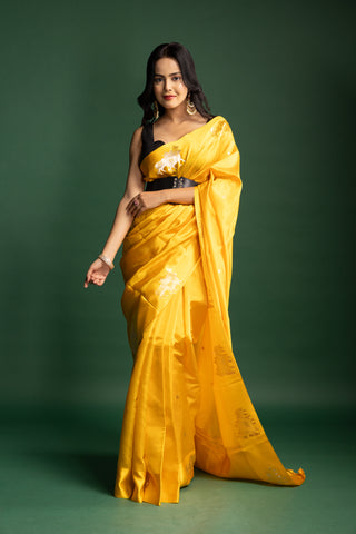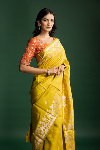Luminous Golden Marigold Silk Saree with Intricate Heritage Zari Weaving