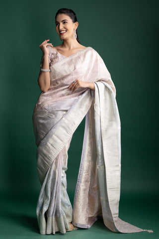 Elegant Champagne Gold Silk Saree with Subtle Metallic Checks and Floral Embellishments