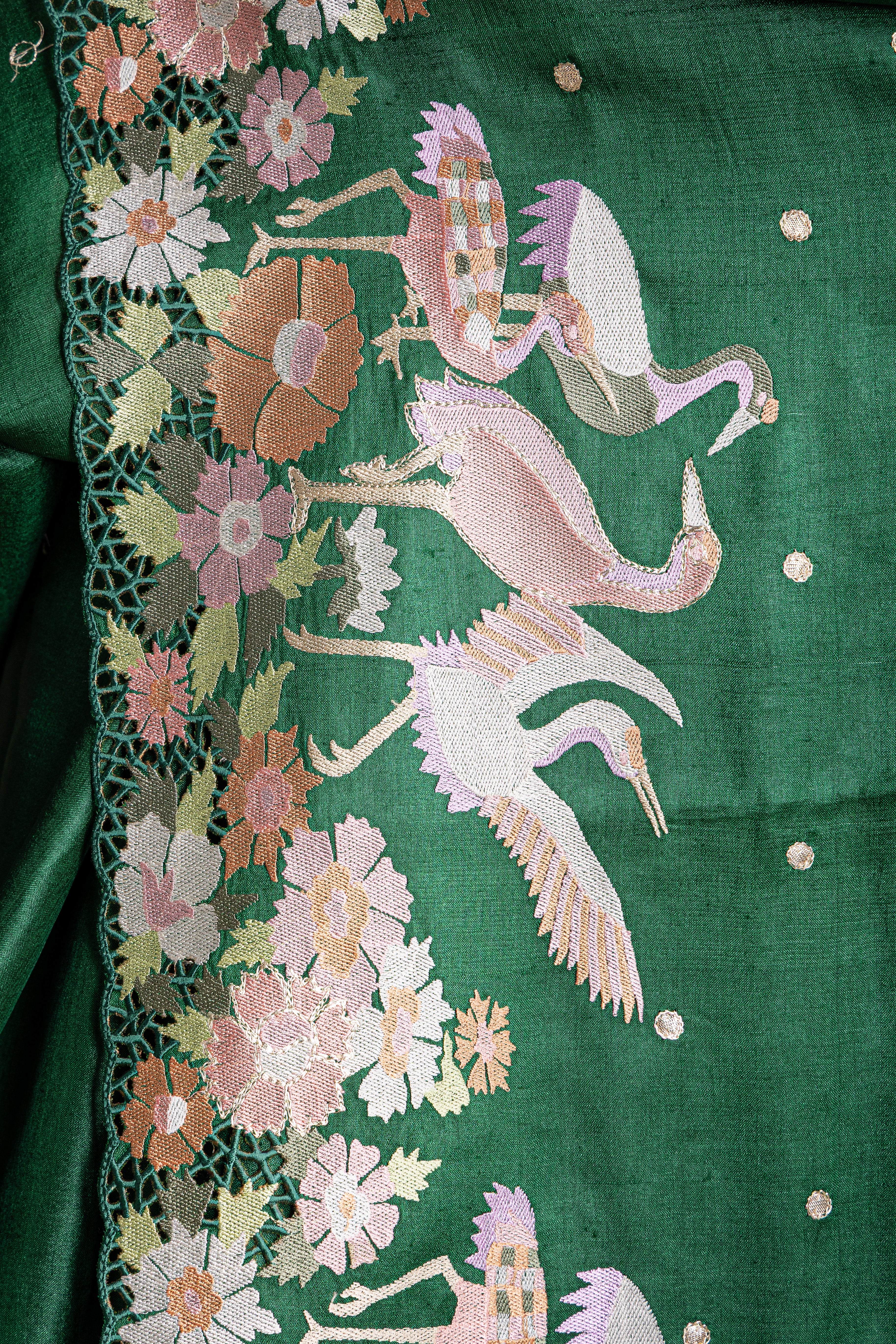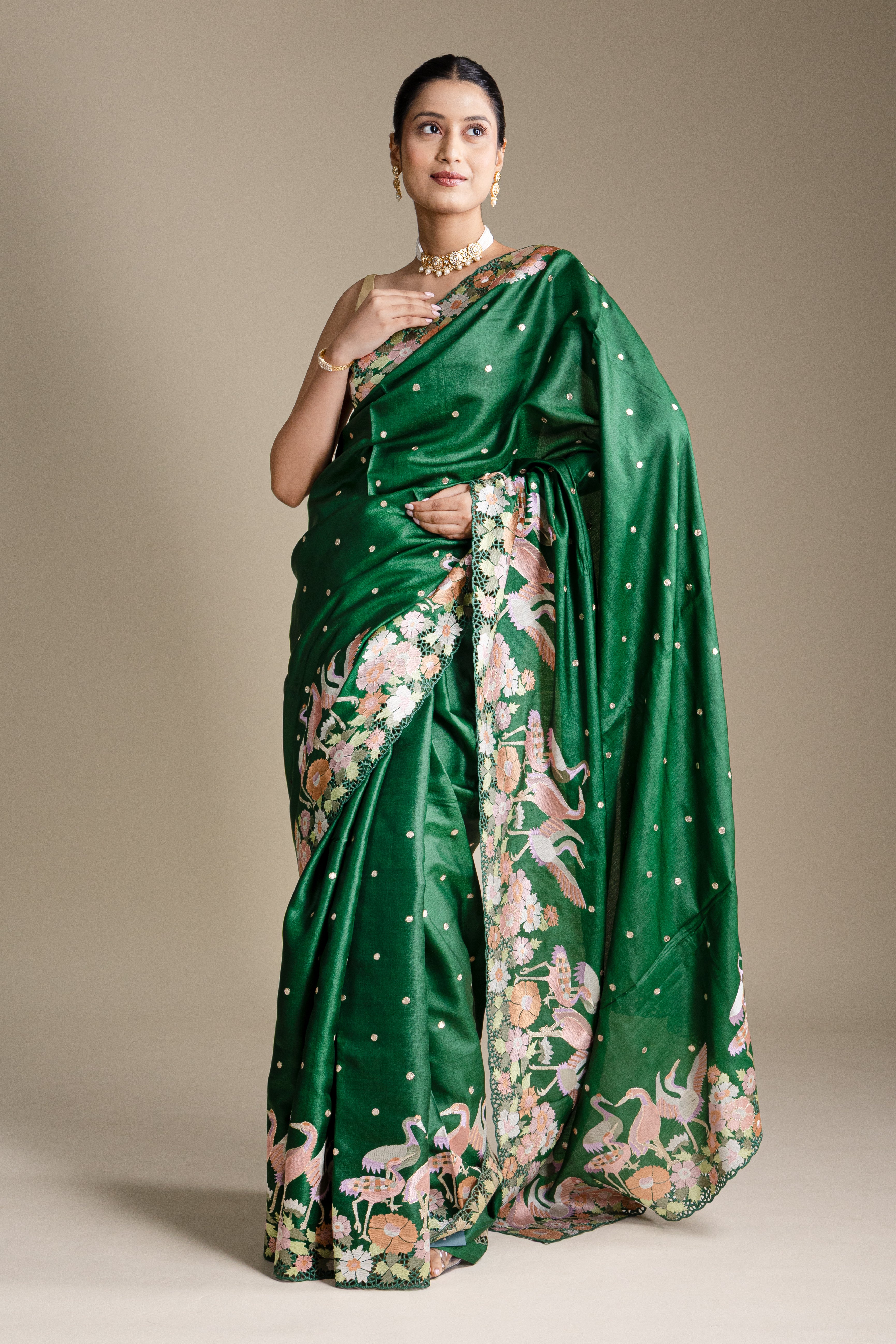 An enchanting blend of bottle green silk and delicate pastel floral borders, this saree embodies understated luxury for modern connoisseurs.