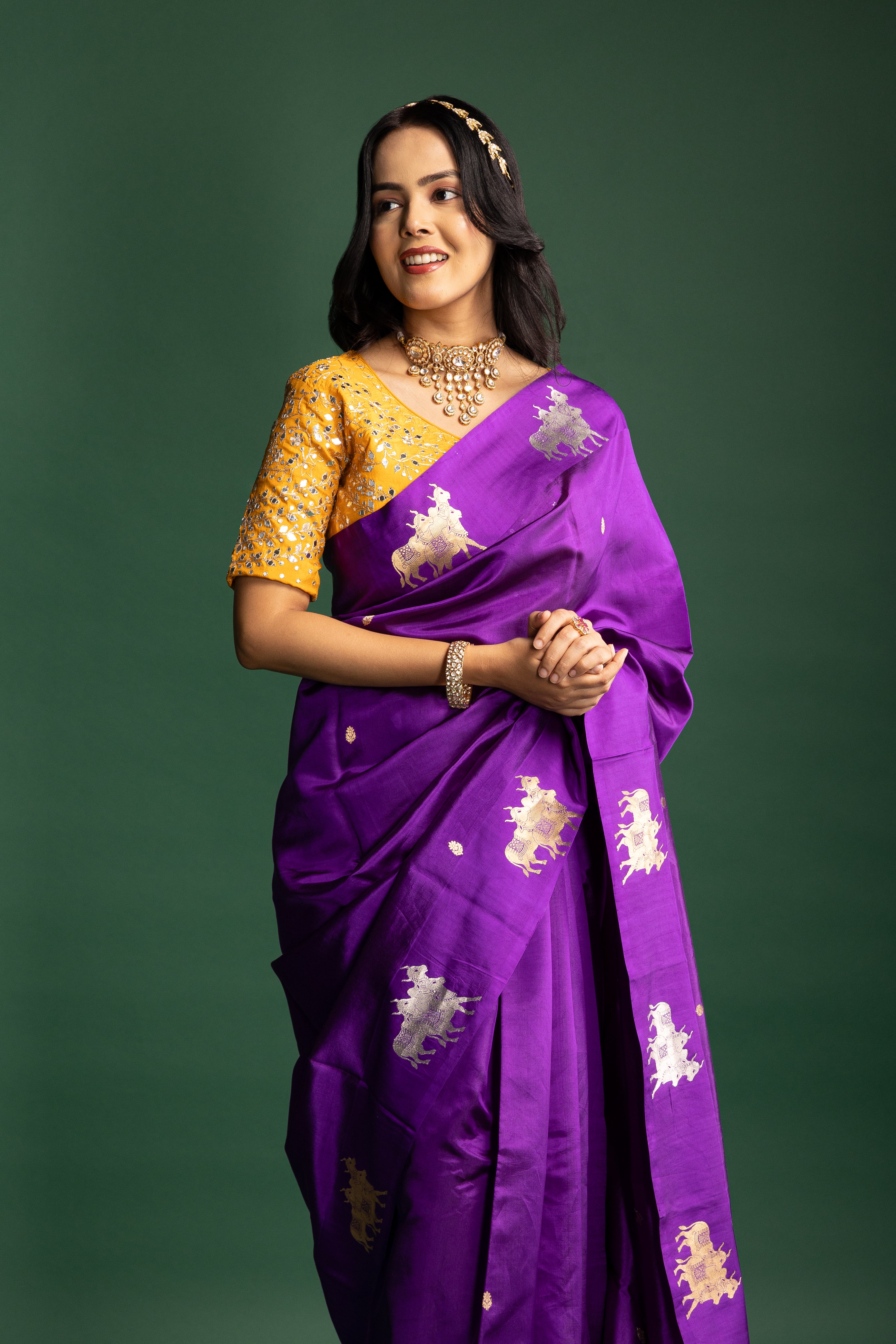 This amethyst purple silk saree features intricate golden motifs, blending heritage craftsmanship with modern luxury. A bold, elegant drape designed for women who appreciate timeless artistry