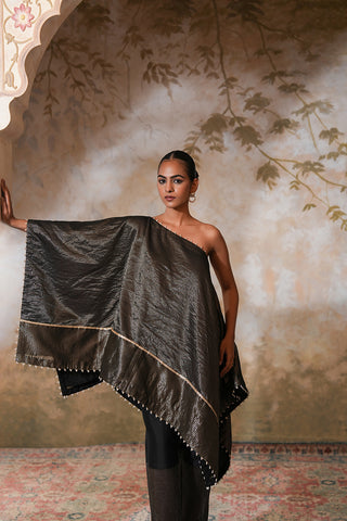 Sophisticated One-Shoulder Midnight Noir Cape Set with Metallic Texture
