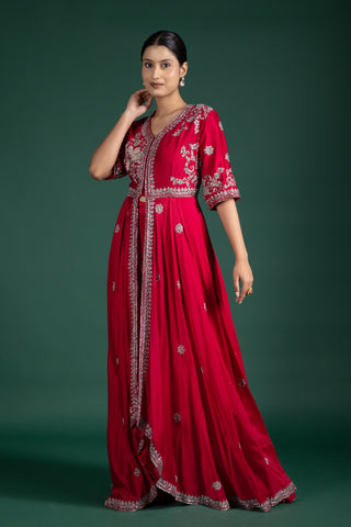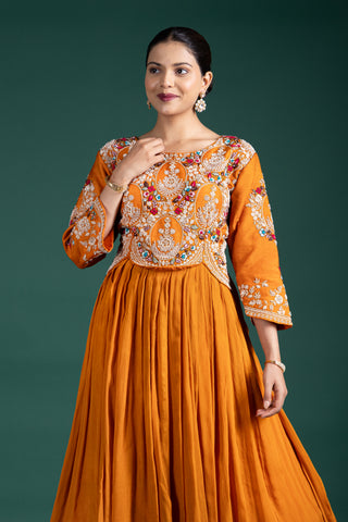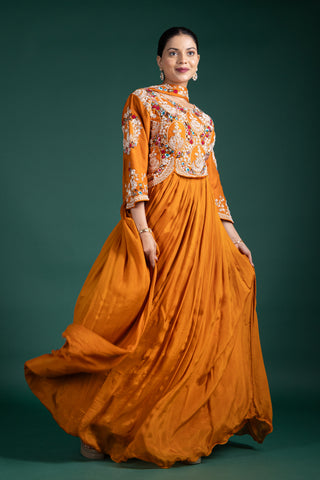 Chic Burnt Sienna Luxe Drape Gown With Embroidered Jacket