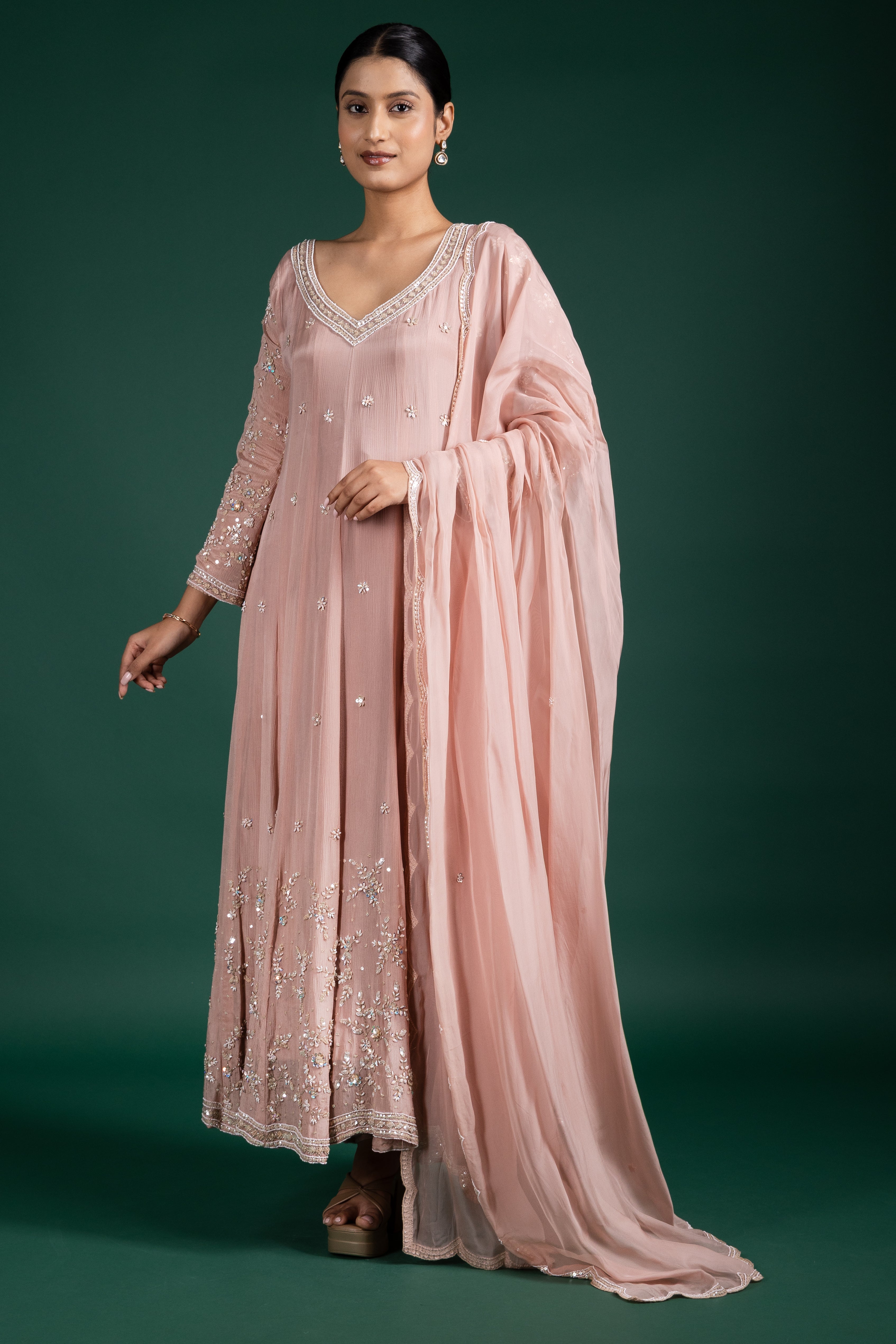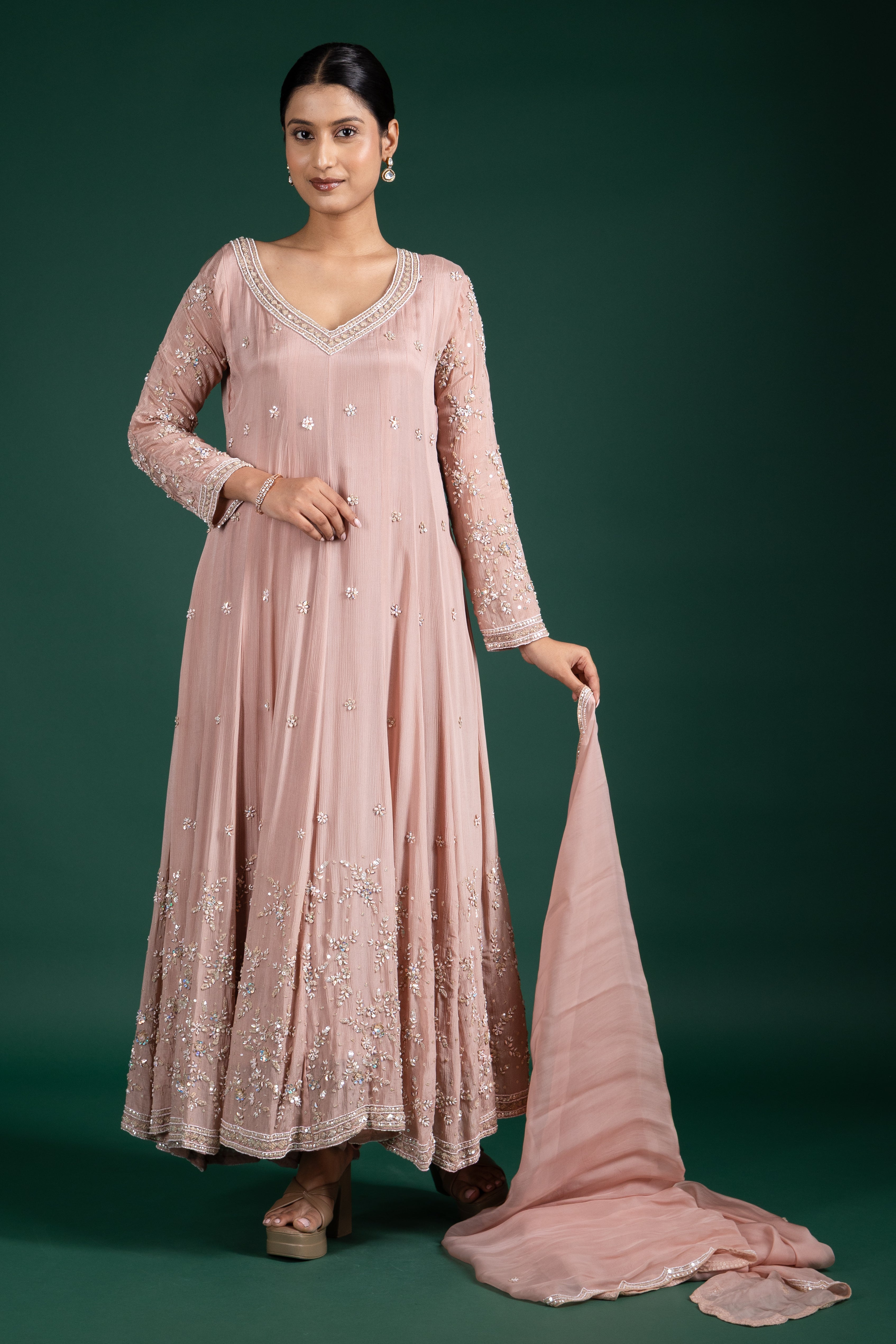 Delicate blush pink Anarkali adorned with fine sequin embroidery and a soft net dupatta.