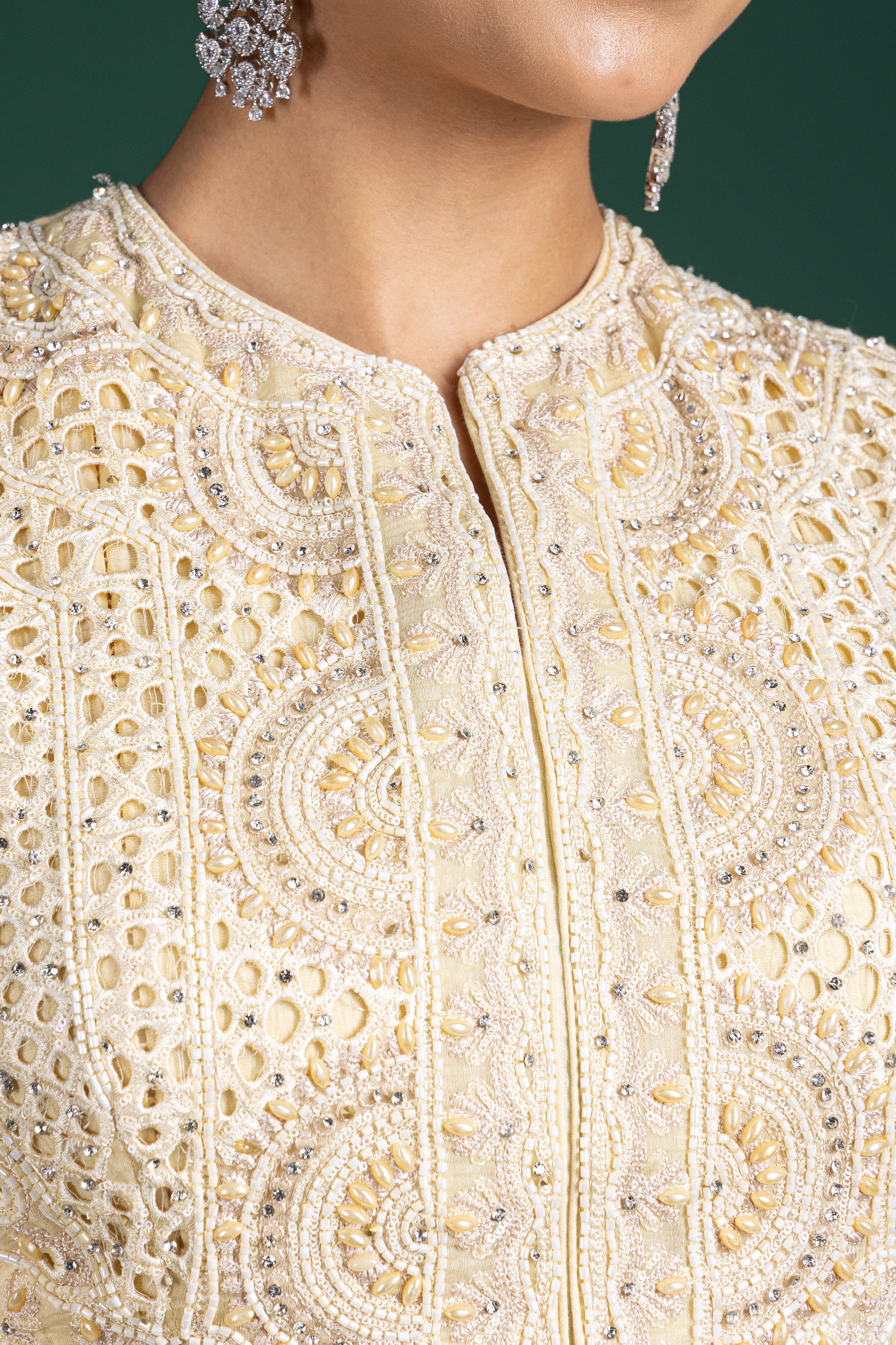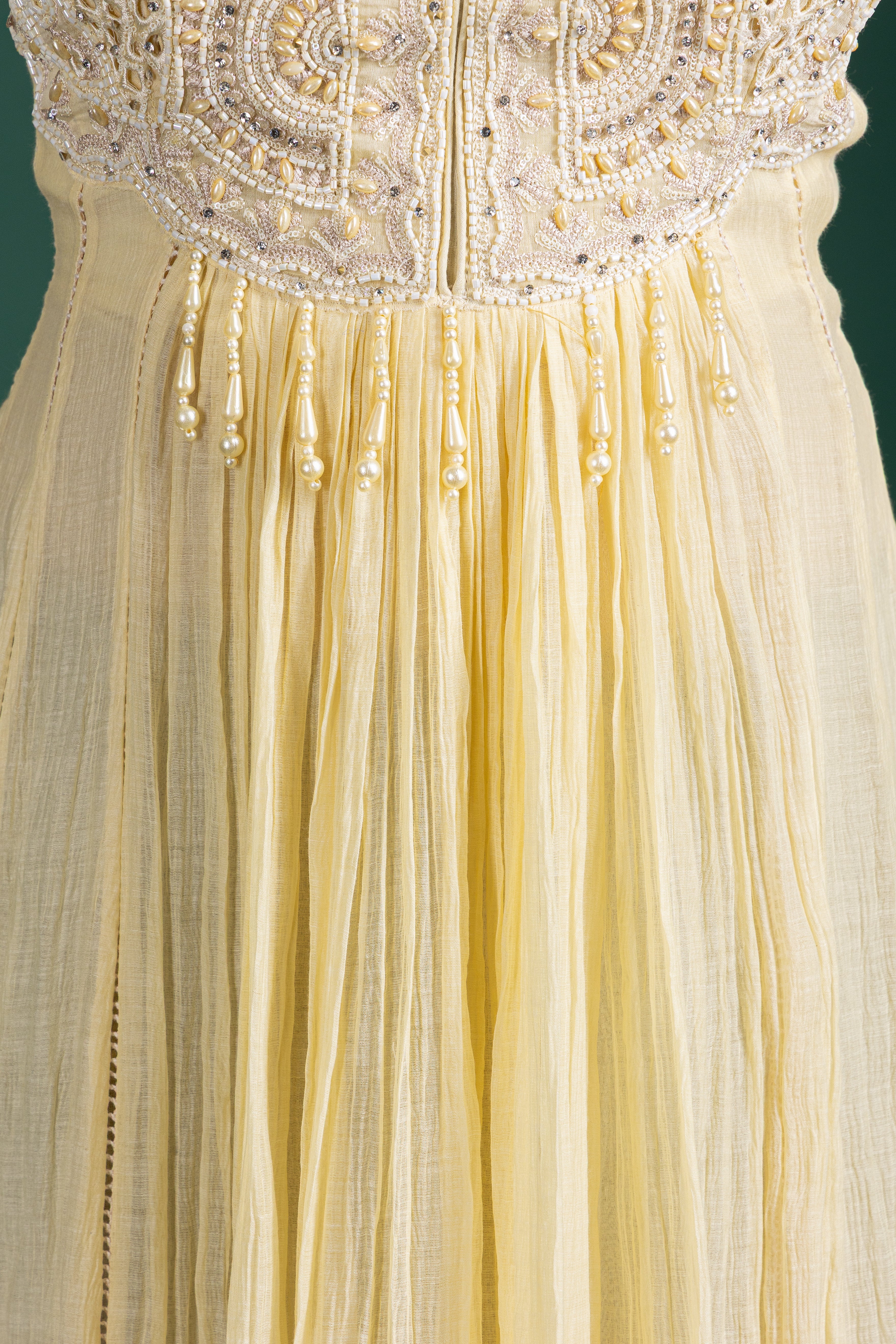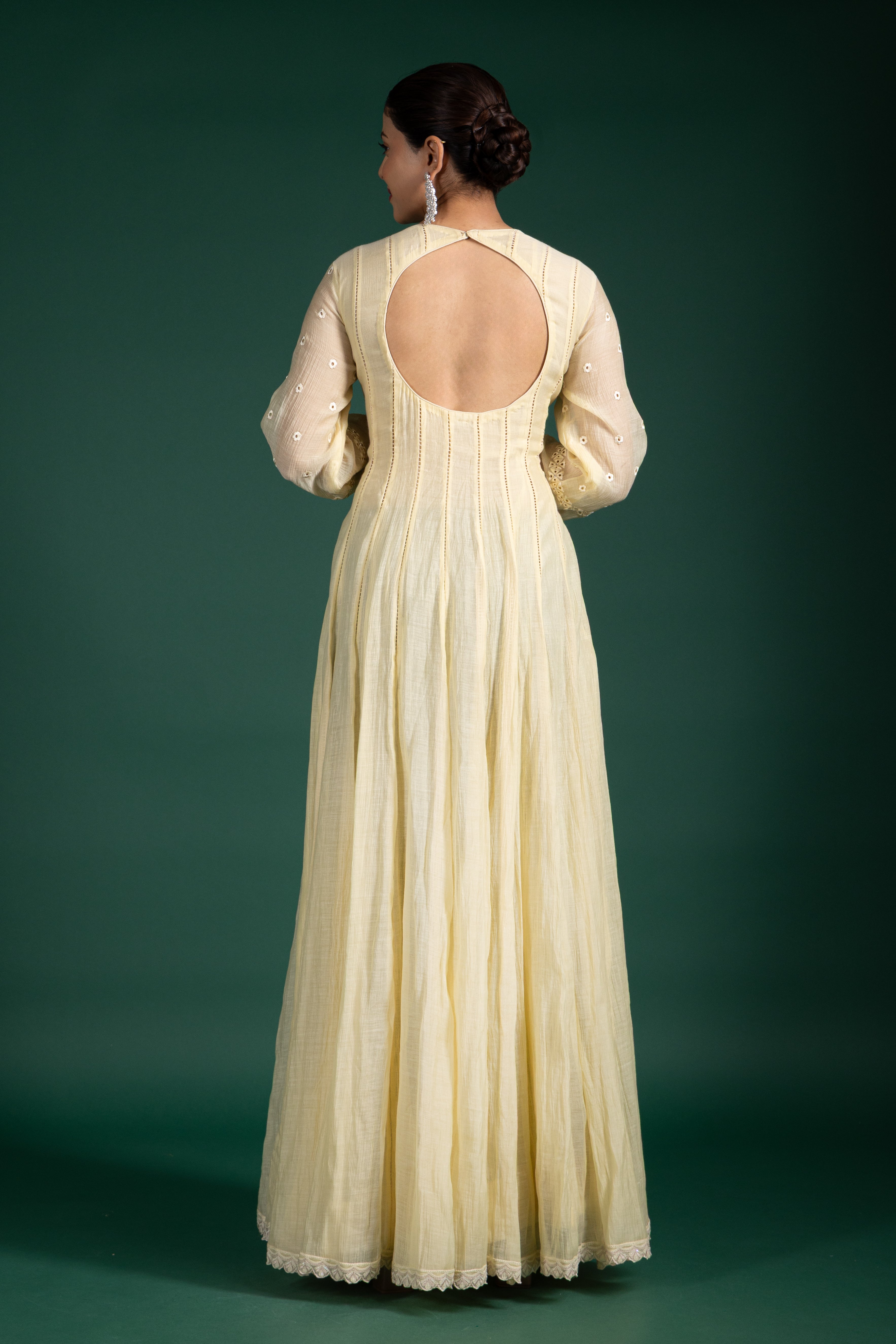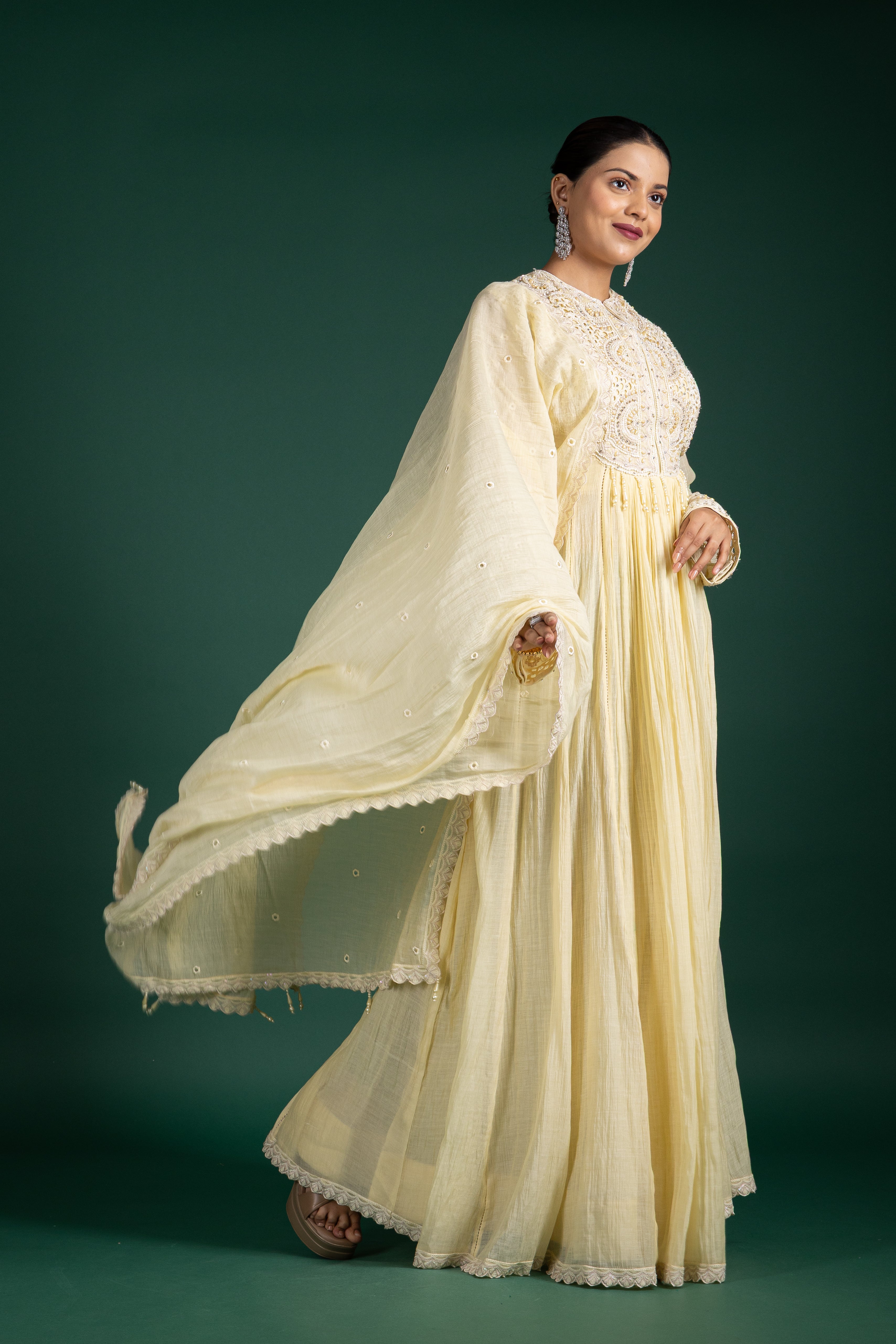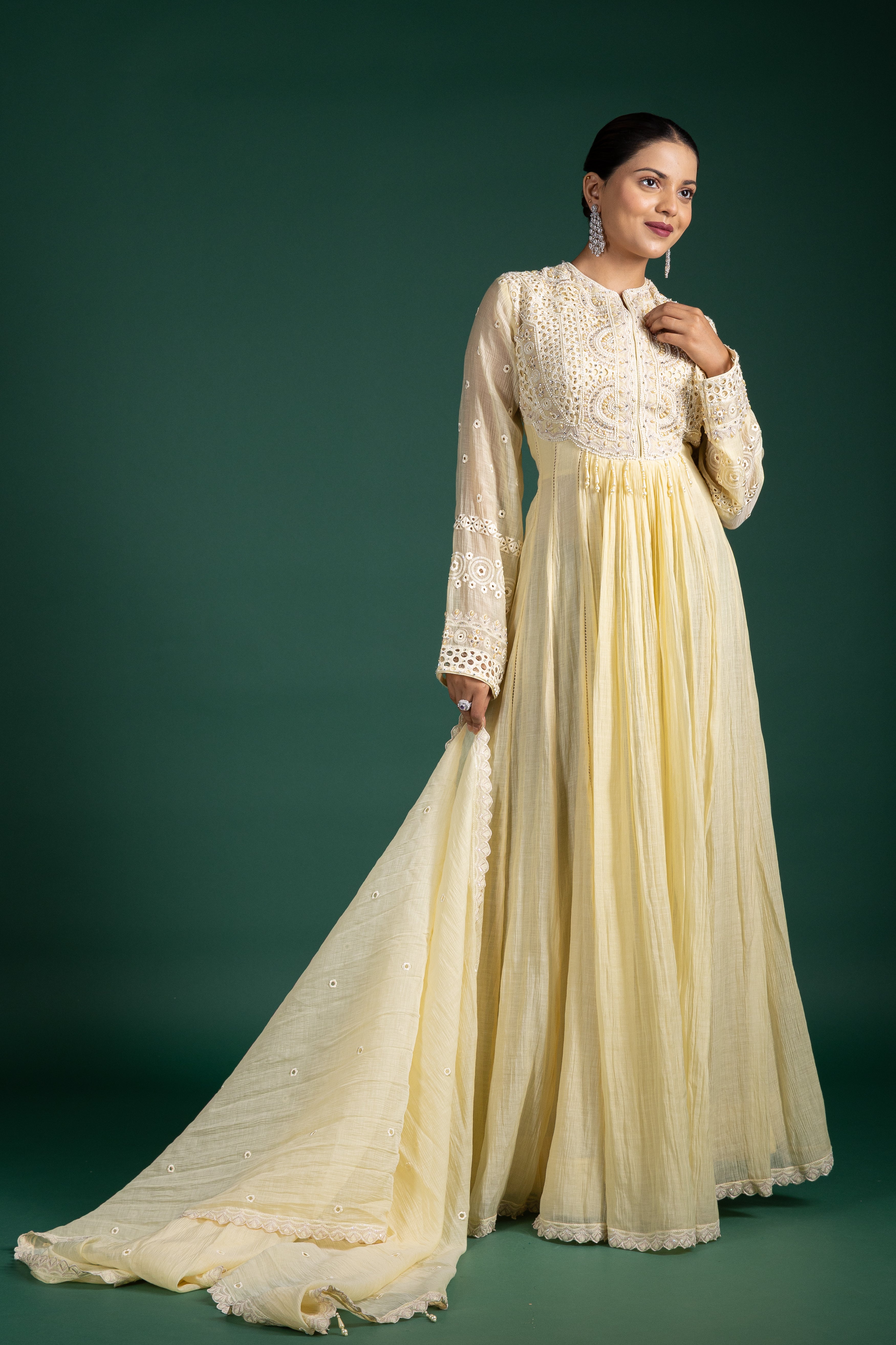 Step into subtle luxury with this ivory lemon sorbet anarkali, beautifully crafted with mirror accents and soft pleats for a breezy and elegant feel.