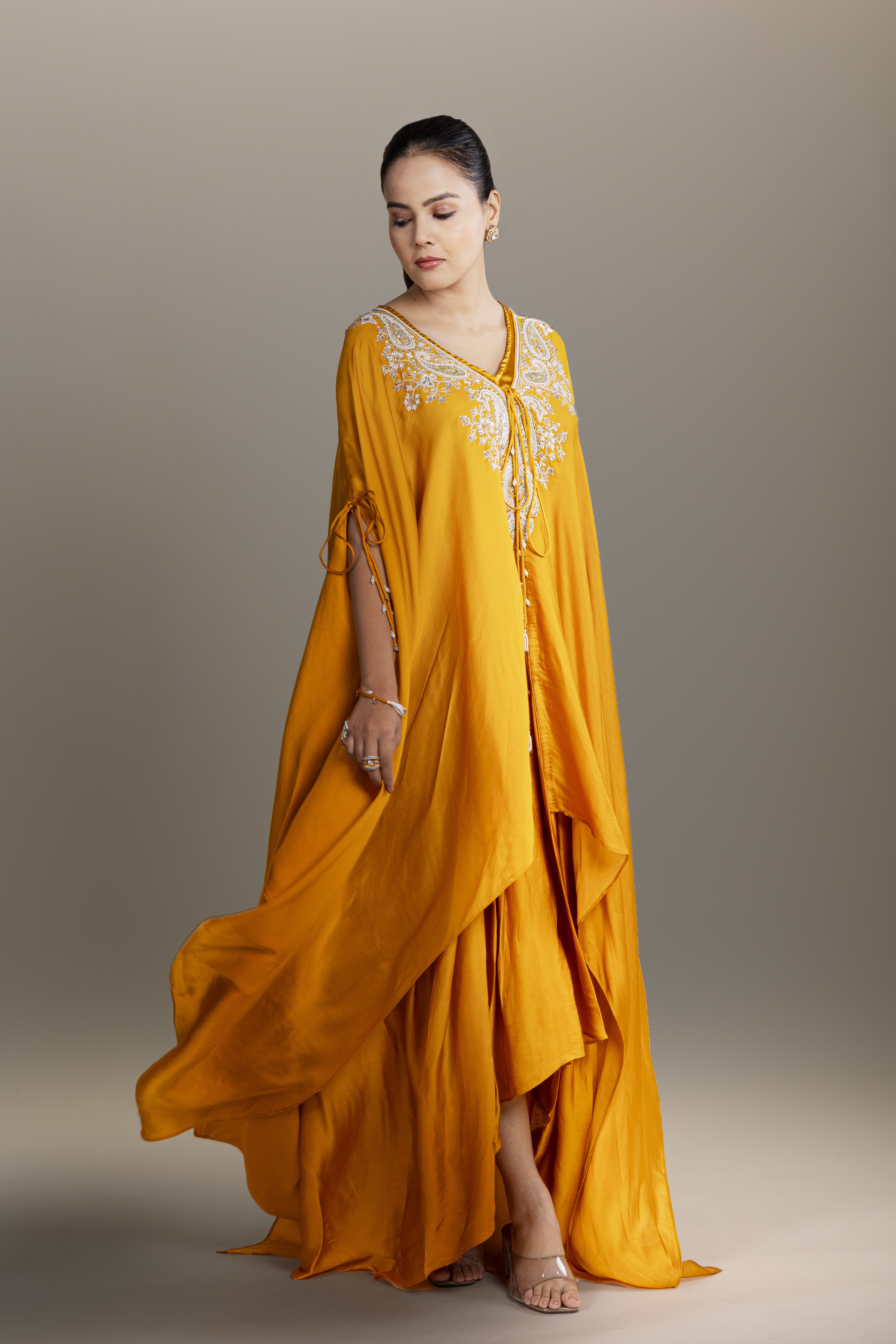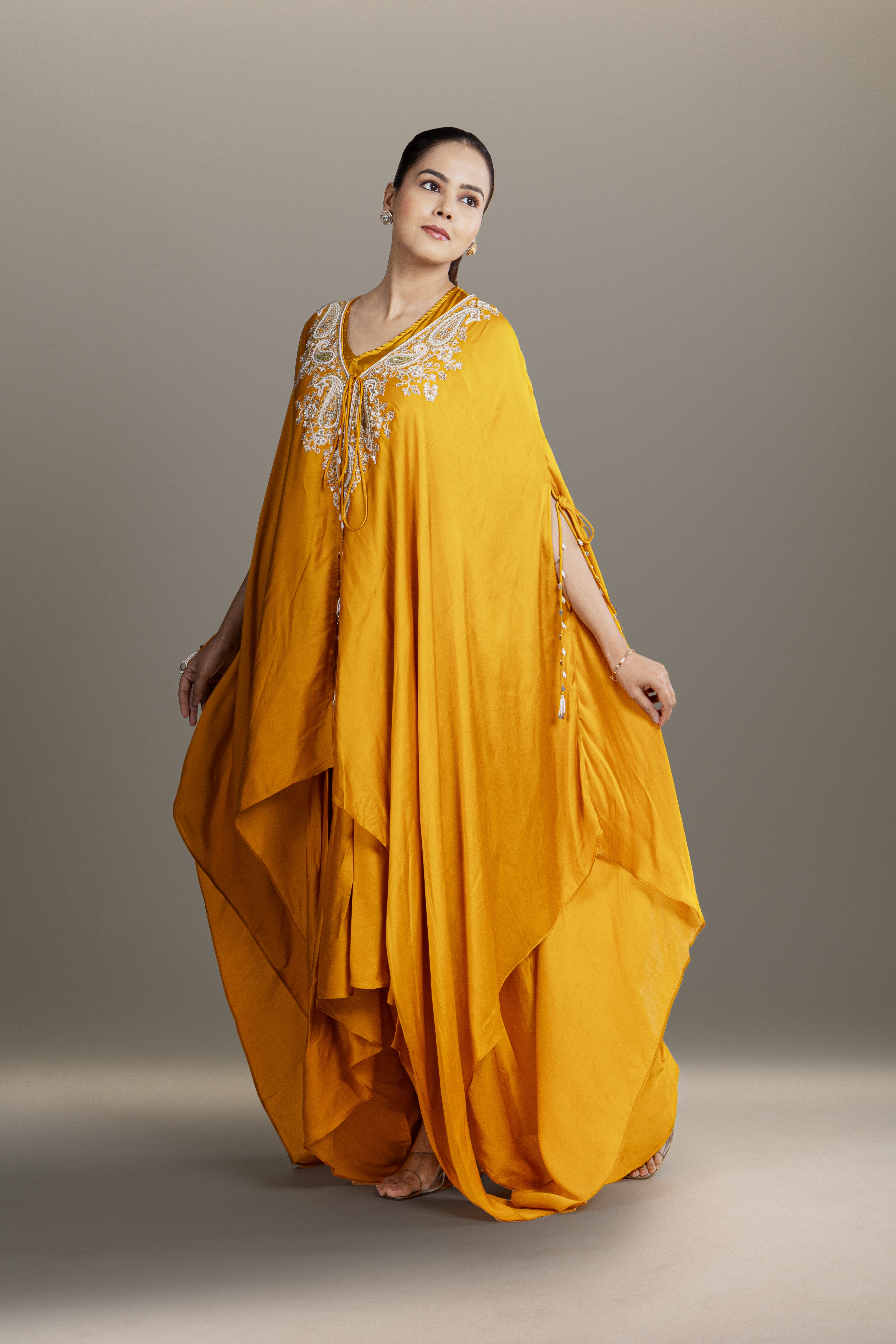 This breezy mustard kaftan set showcases exquisite embroidery, combining bohemian charm with luxurious finesse. Designed for those who value comfort with style.