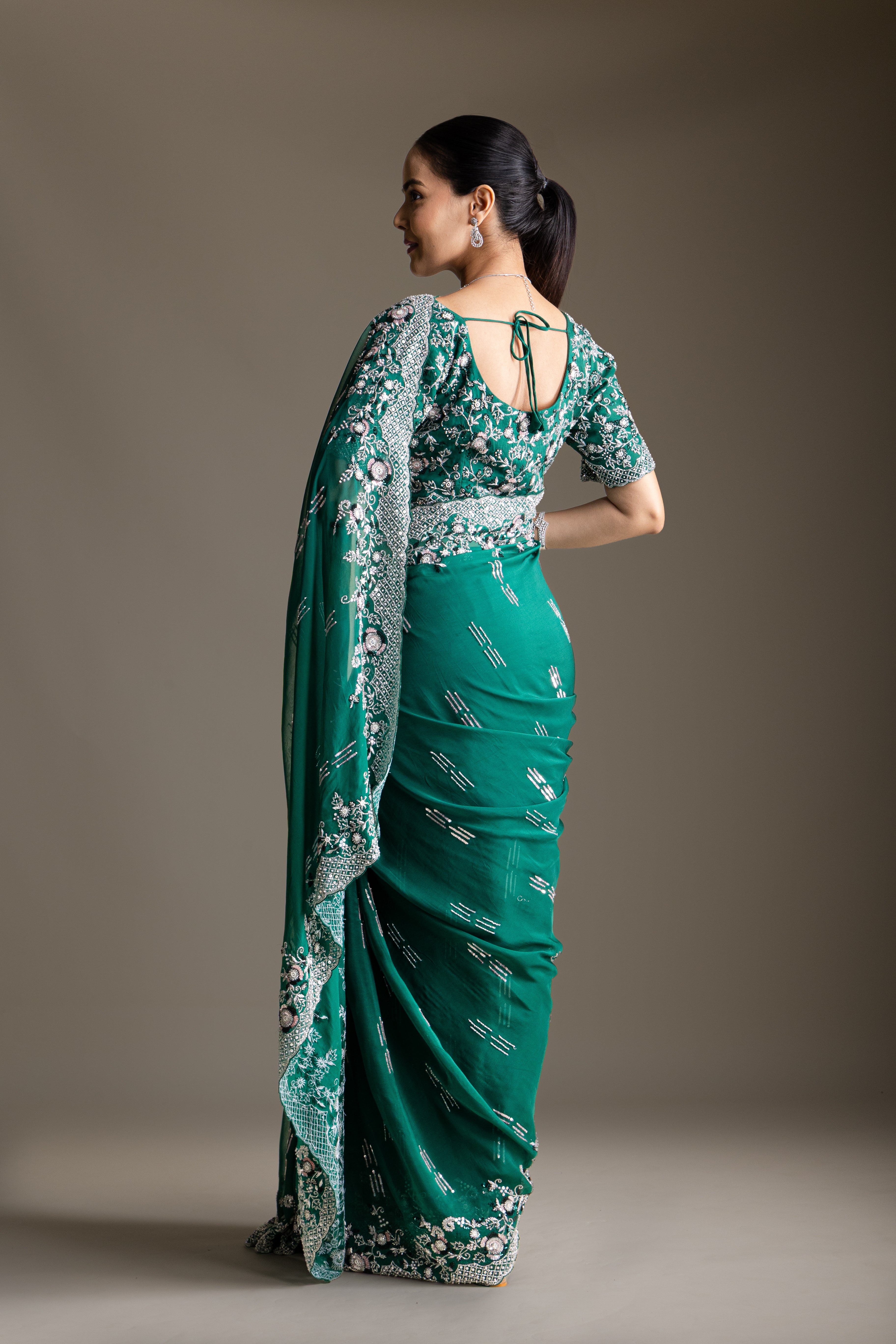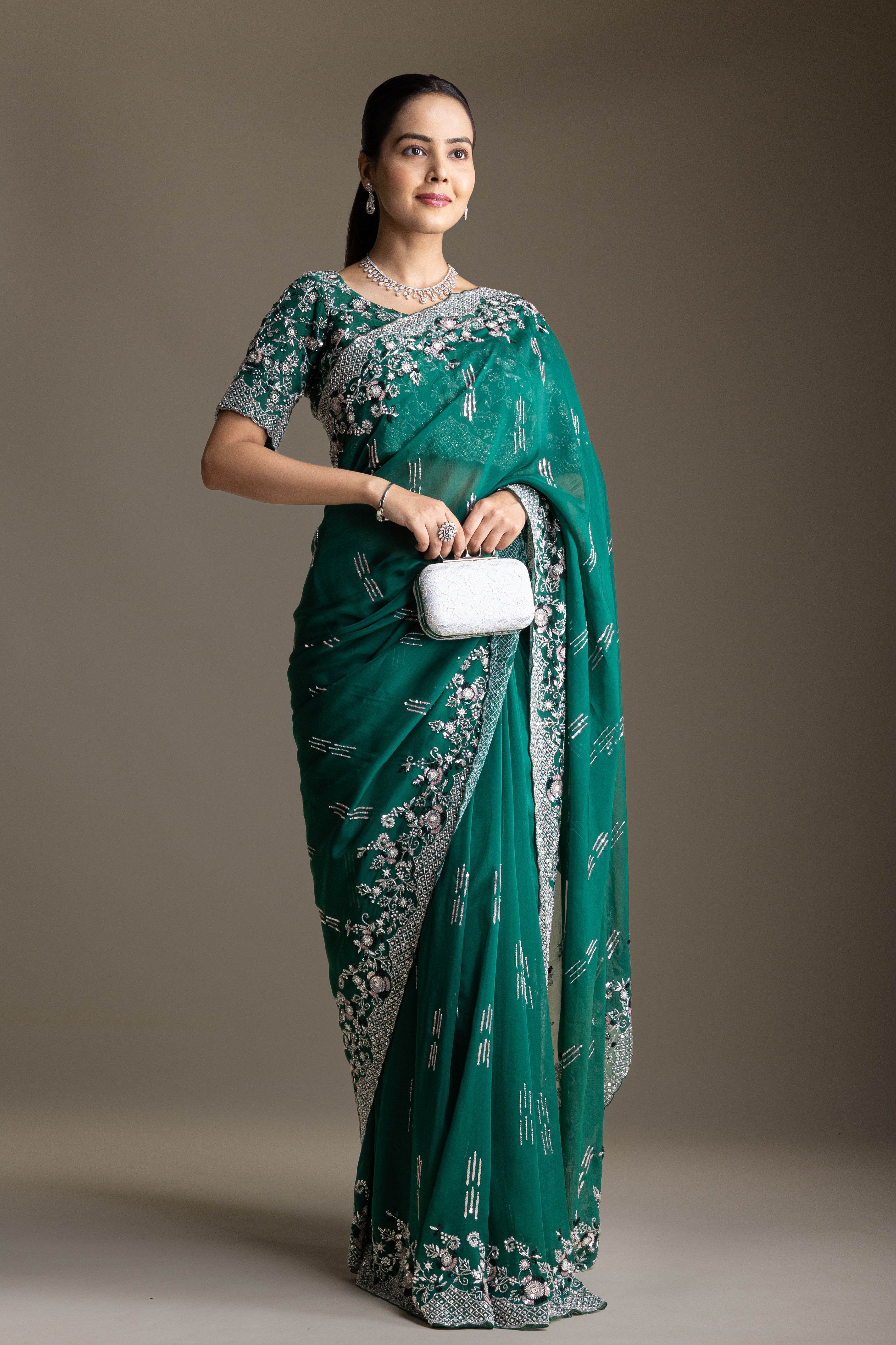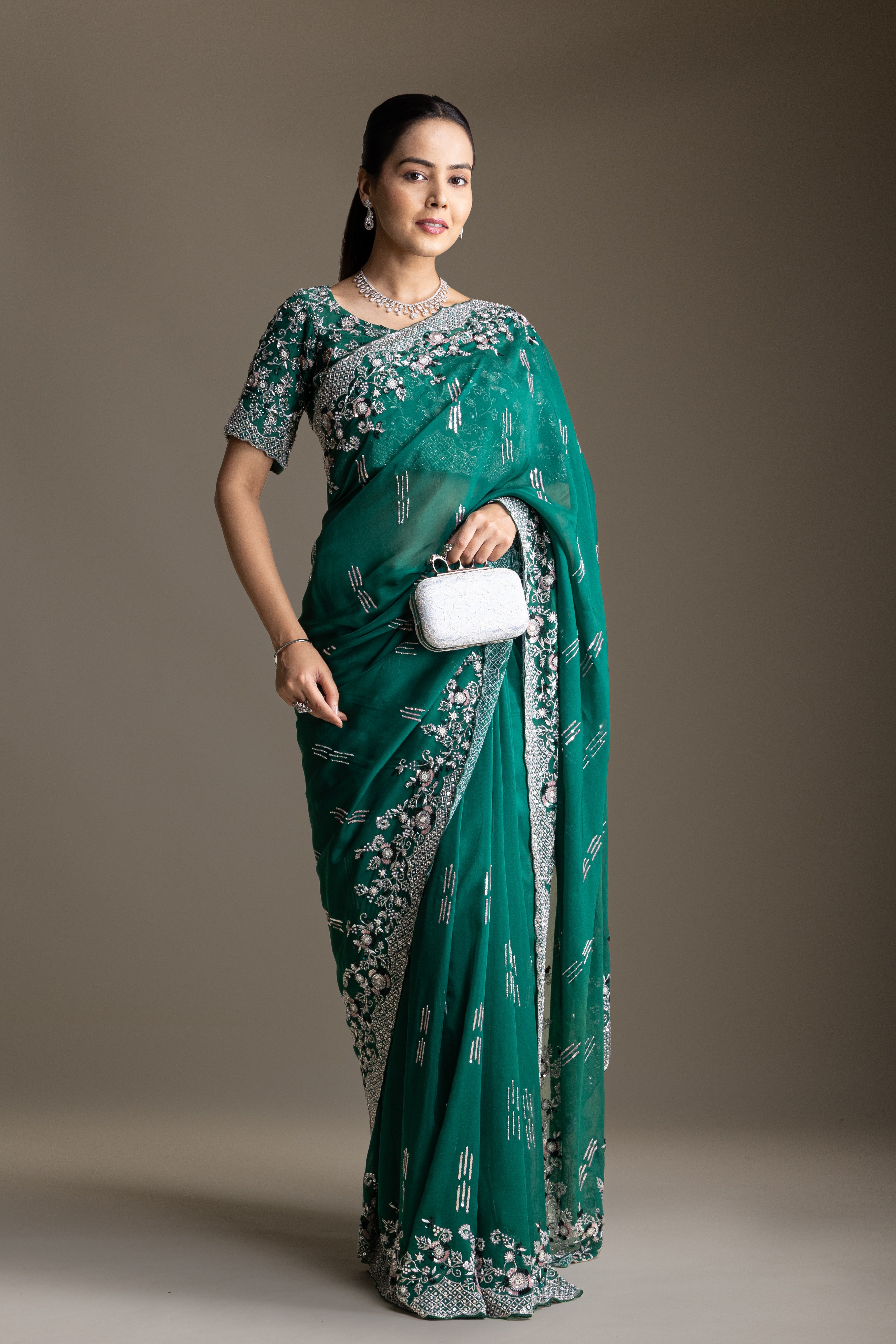 A graceful emerald green designer saree featuring intricate crystal floral embroidery, perfect for a luxurious yet subtle festive statement.