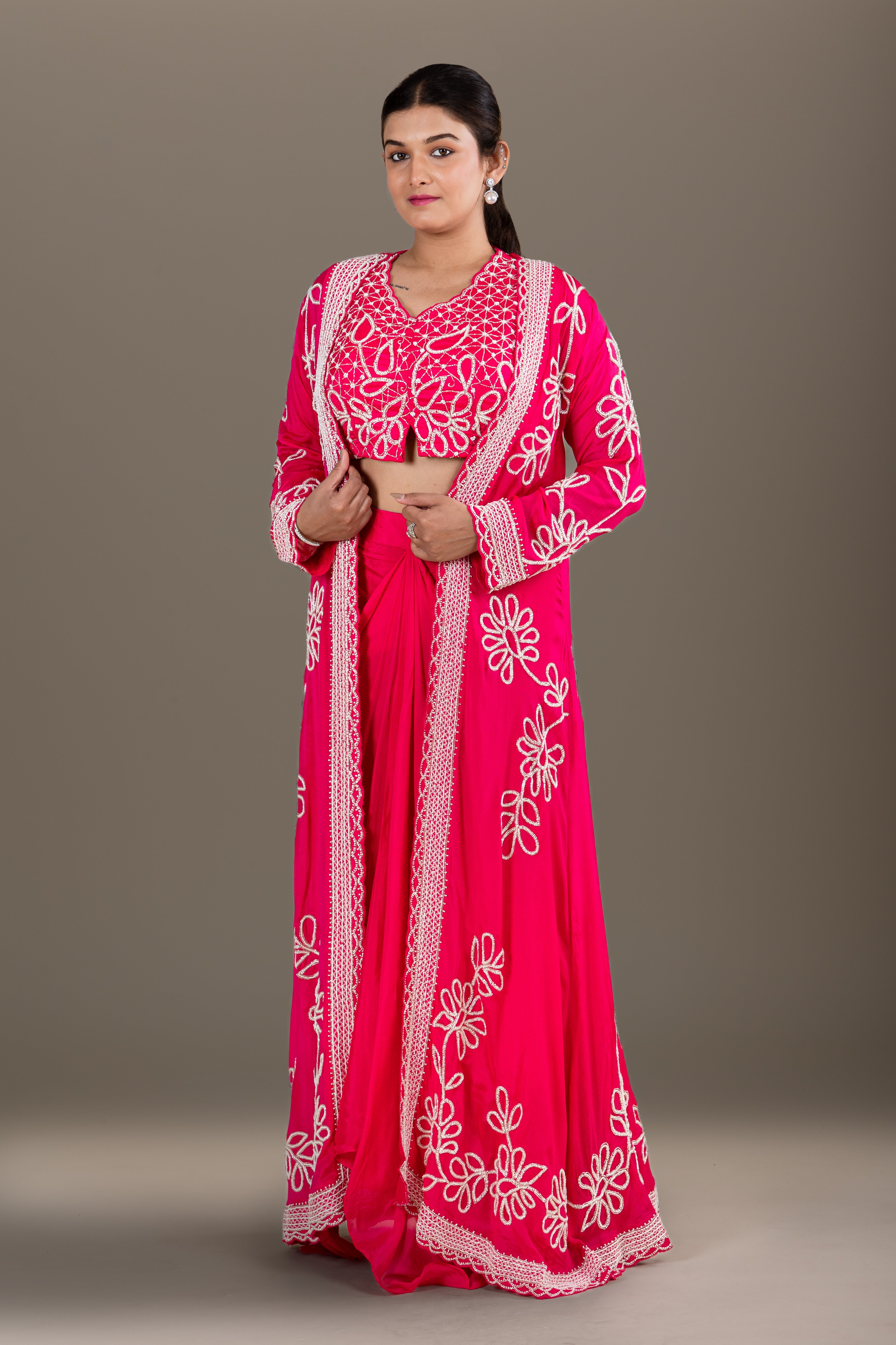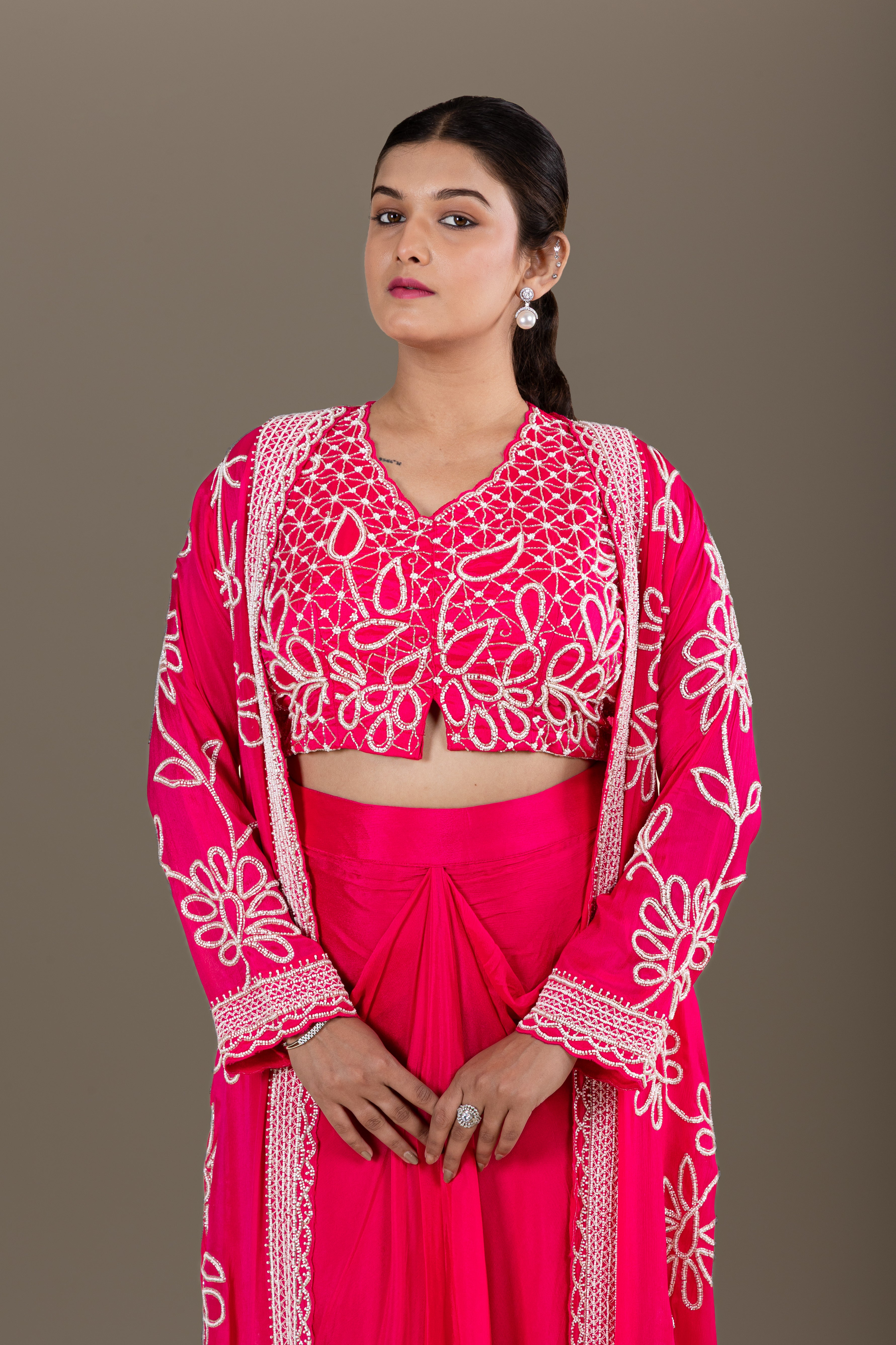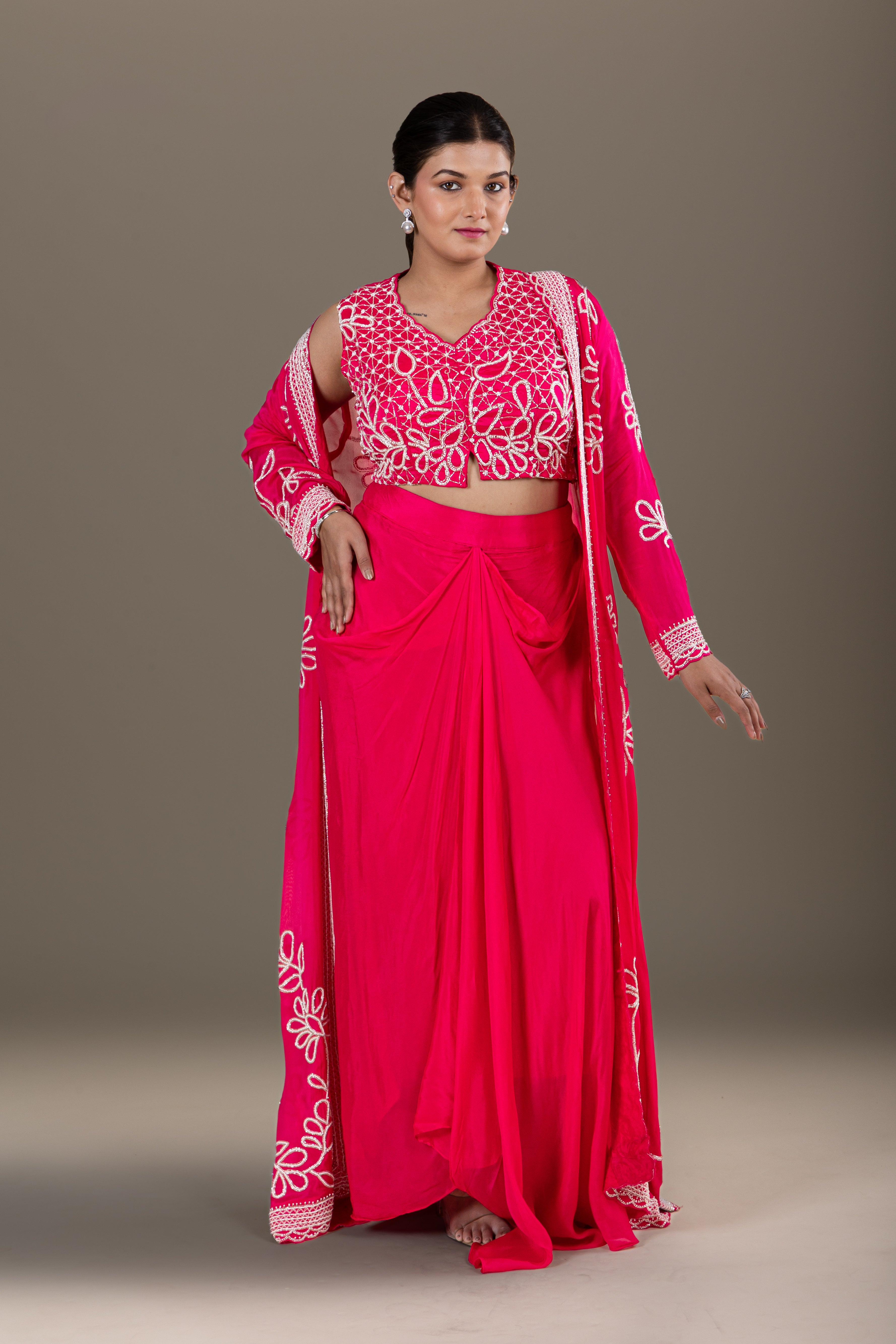 Vibrant Fuchsia Drape Skirt Set with Intricate Thread Embroidery