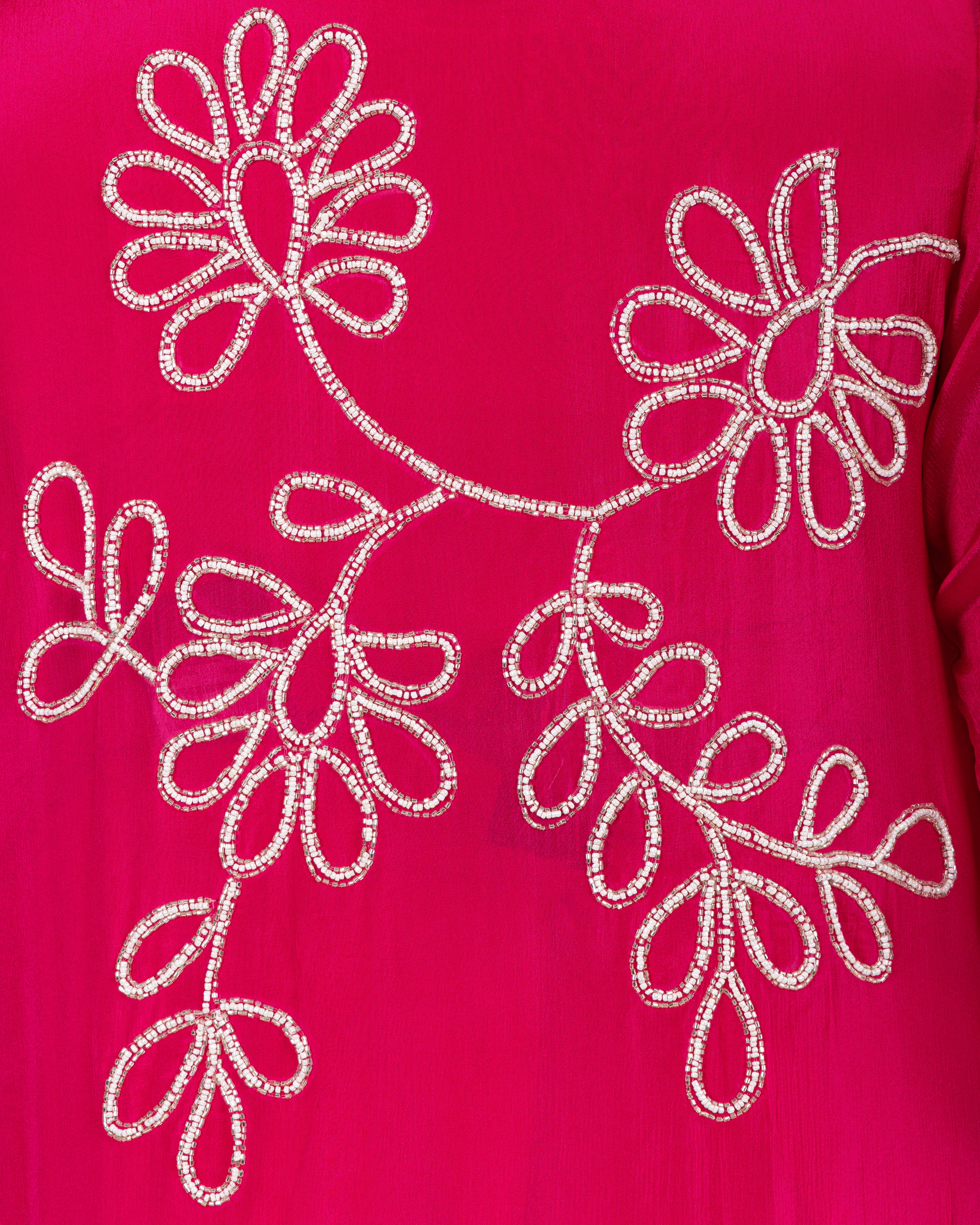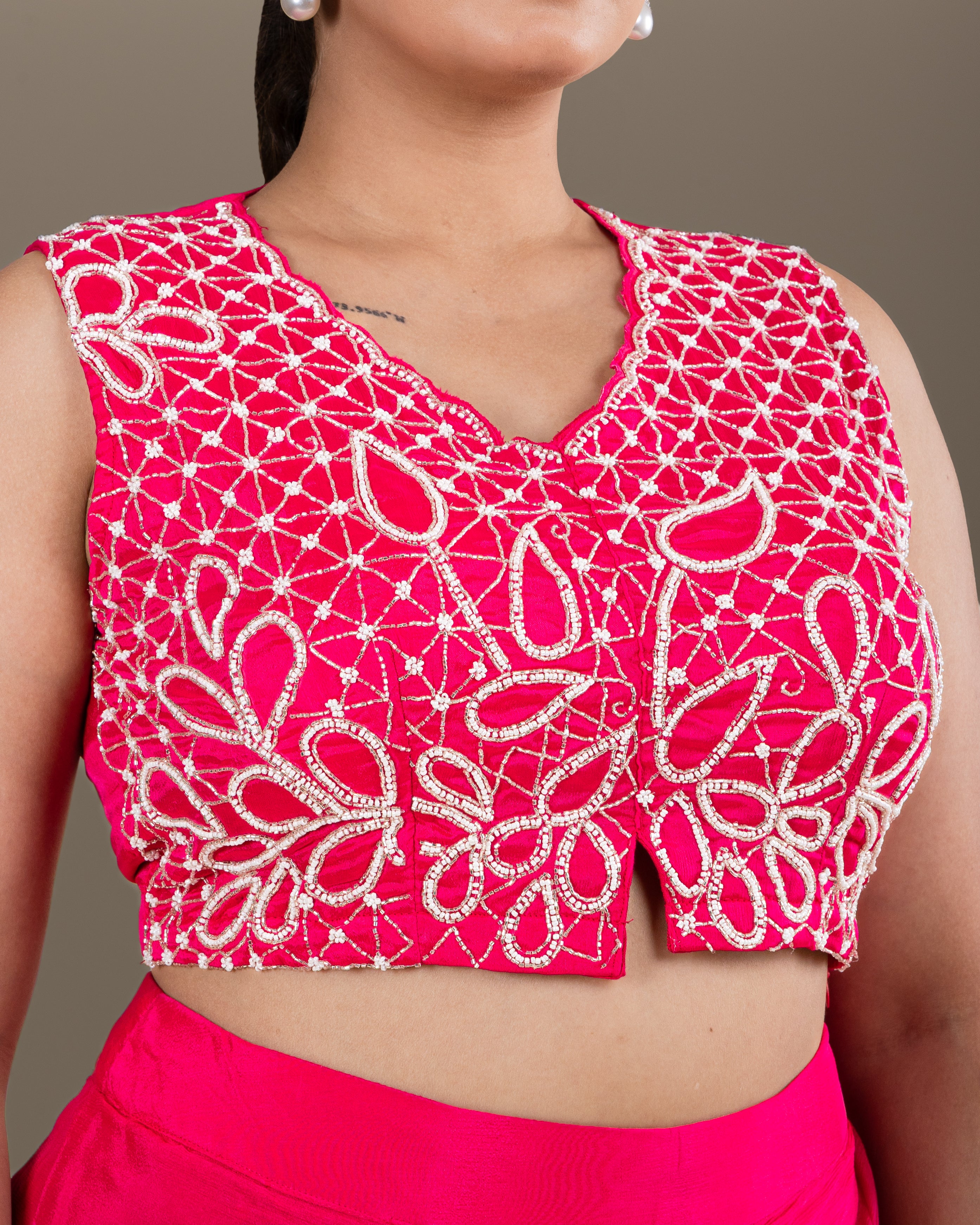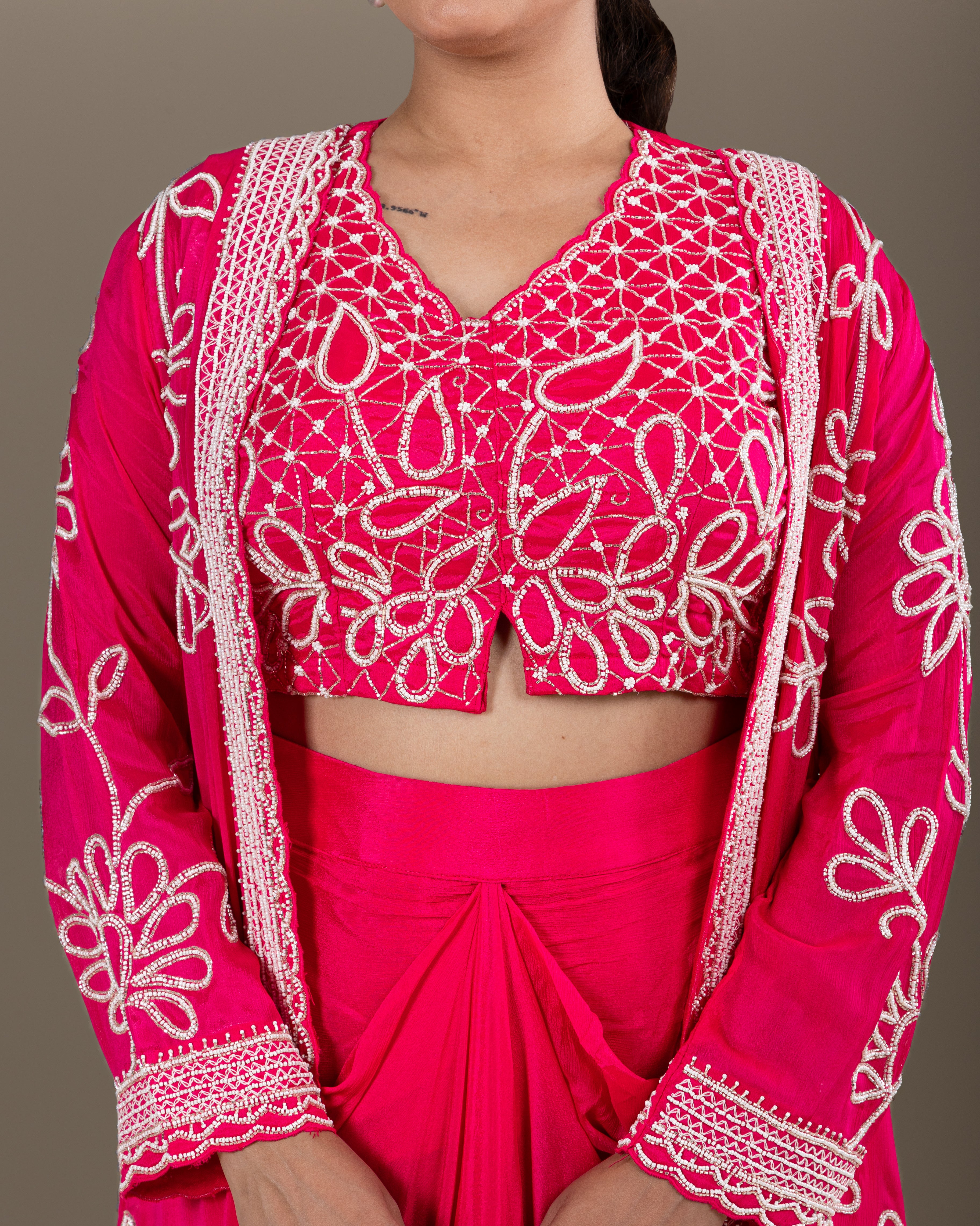 Vibrant Fuchsia Drape Skirt Set with Intricate Thread Embroidery