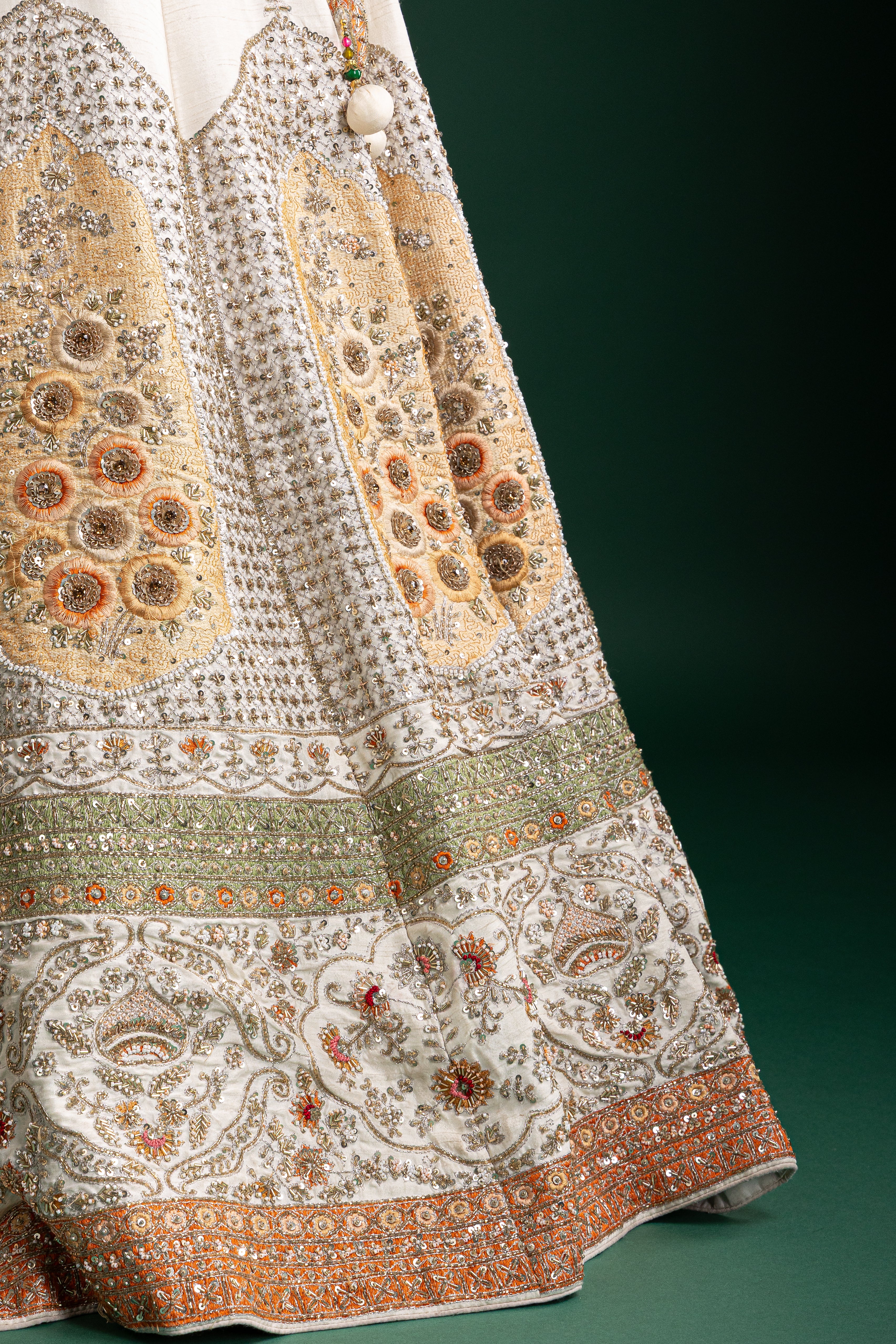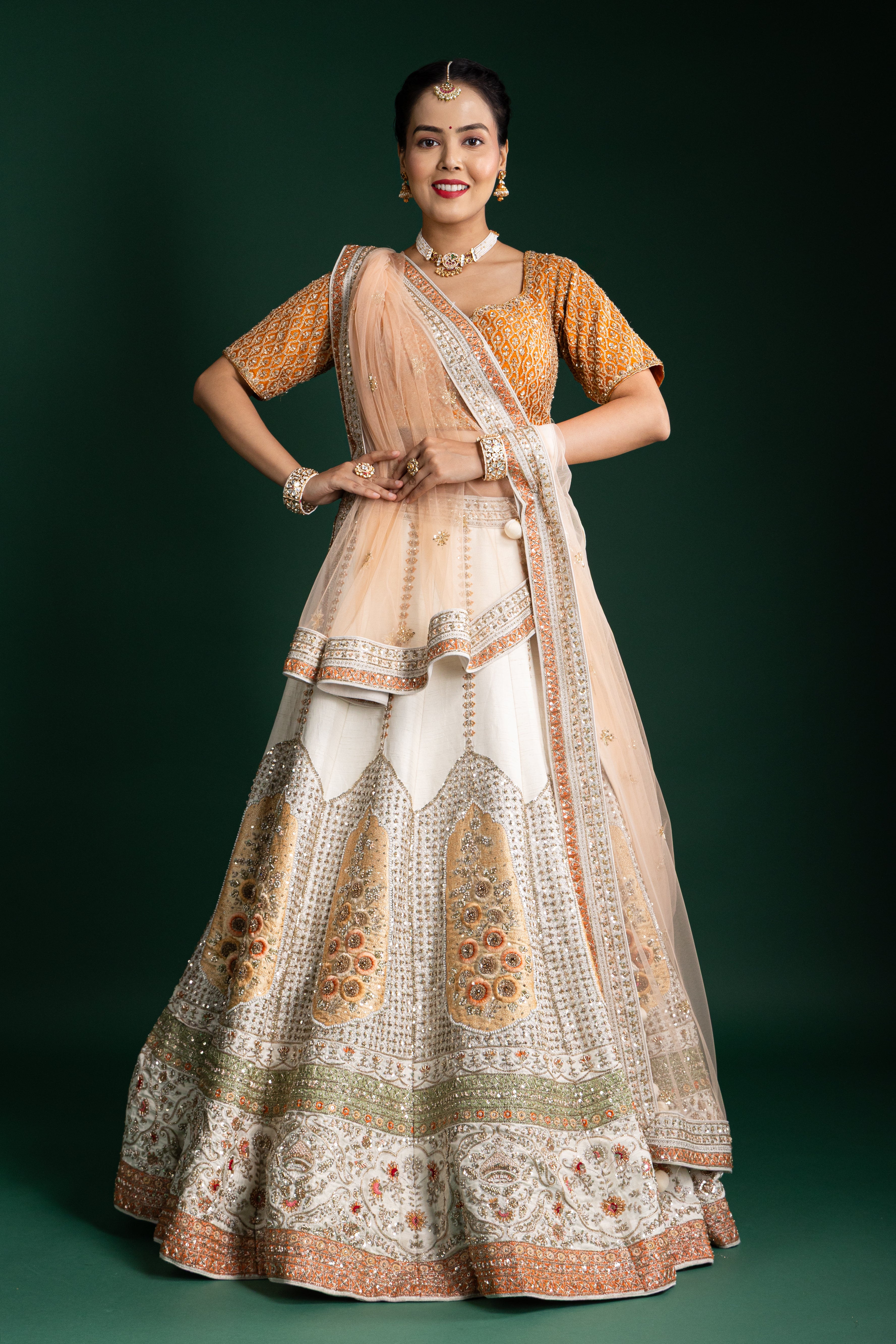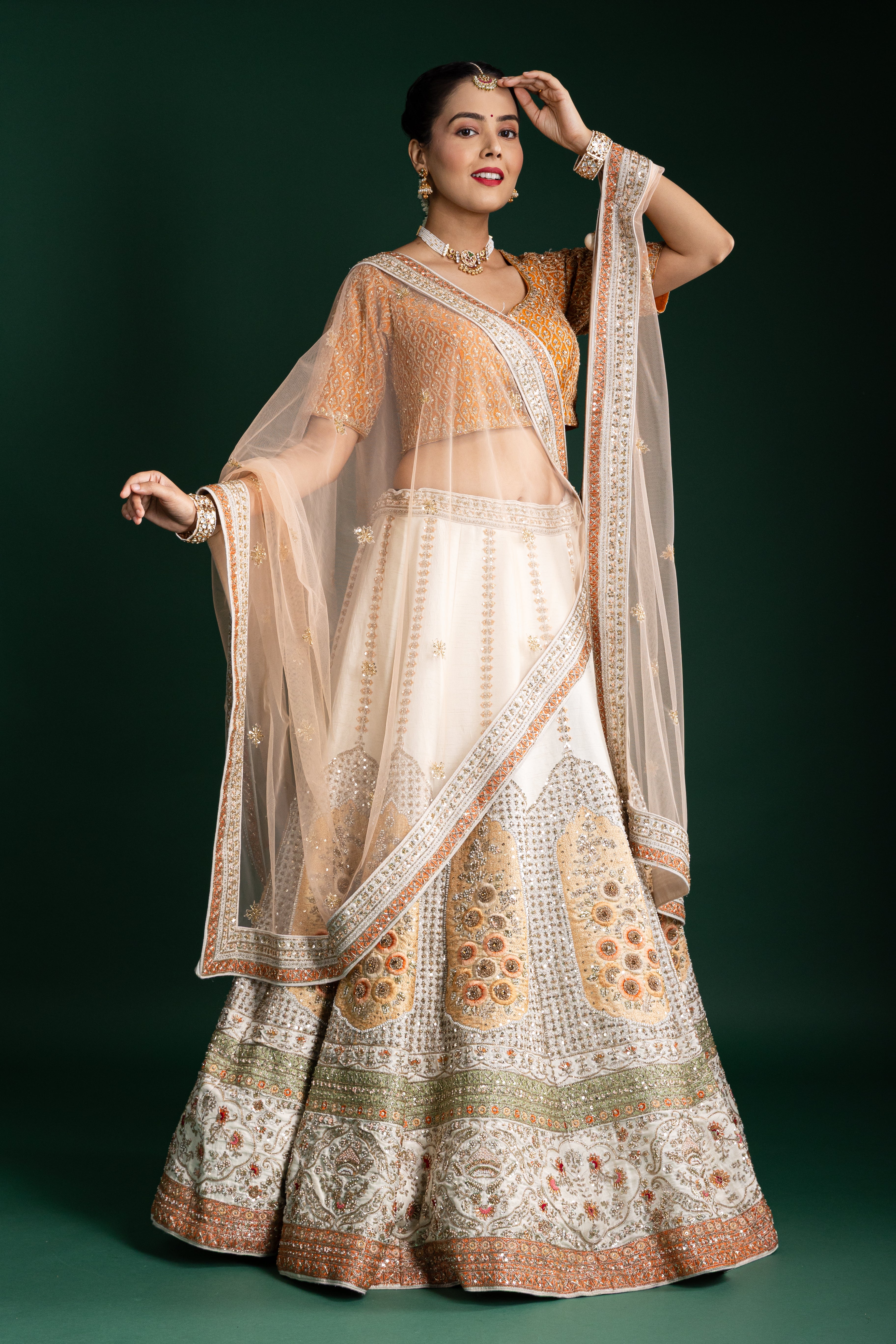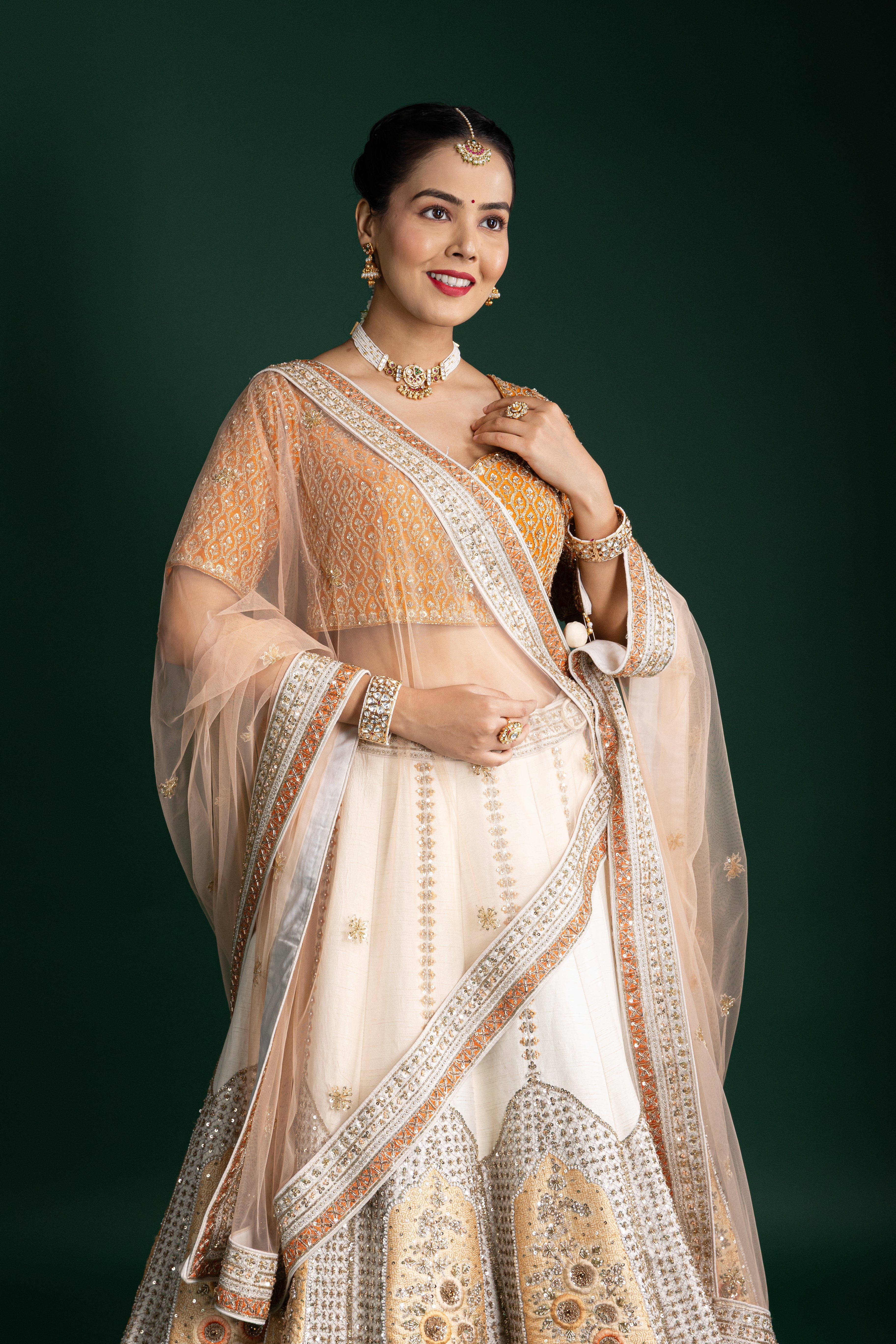 A regal champagne gold lehenga paired with a burnt orange blouse, featuring intricate mirrorwork and thread embroidery for a contemporary yet traditional masterpiece.