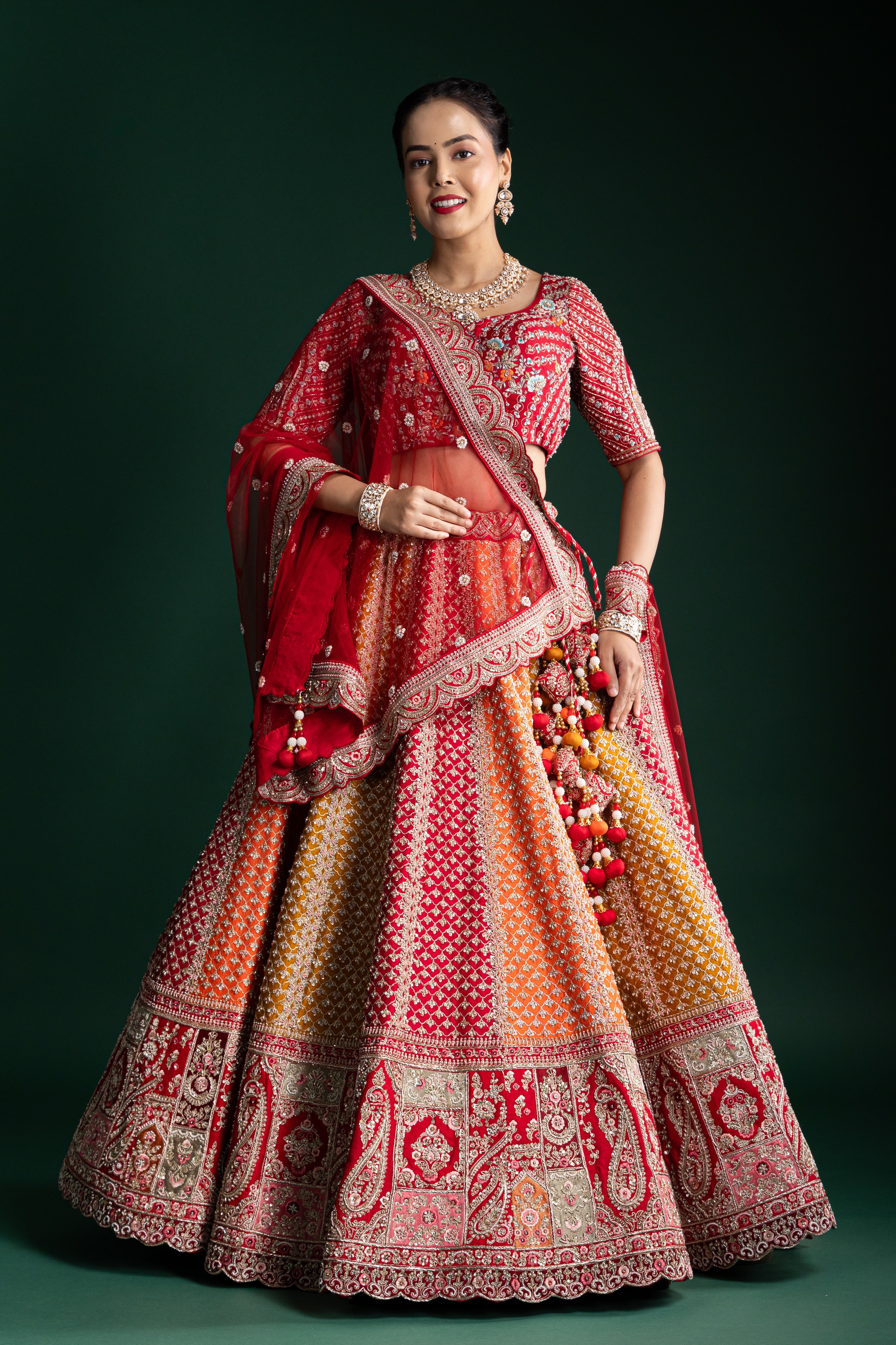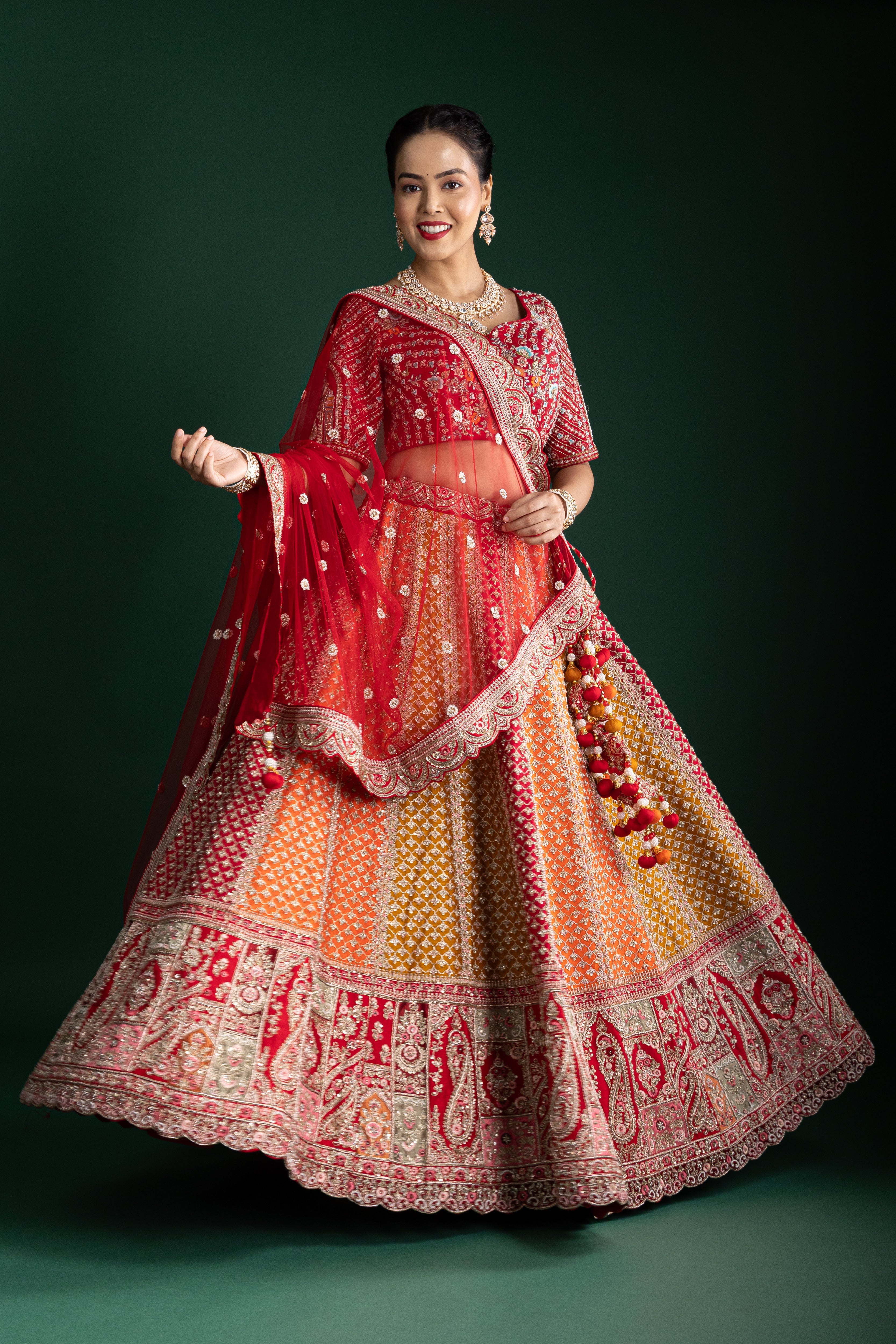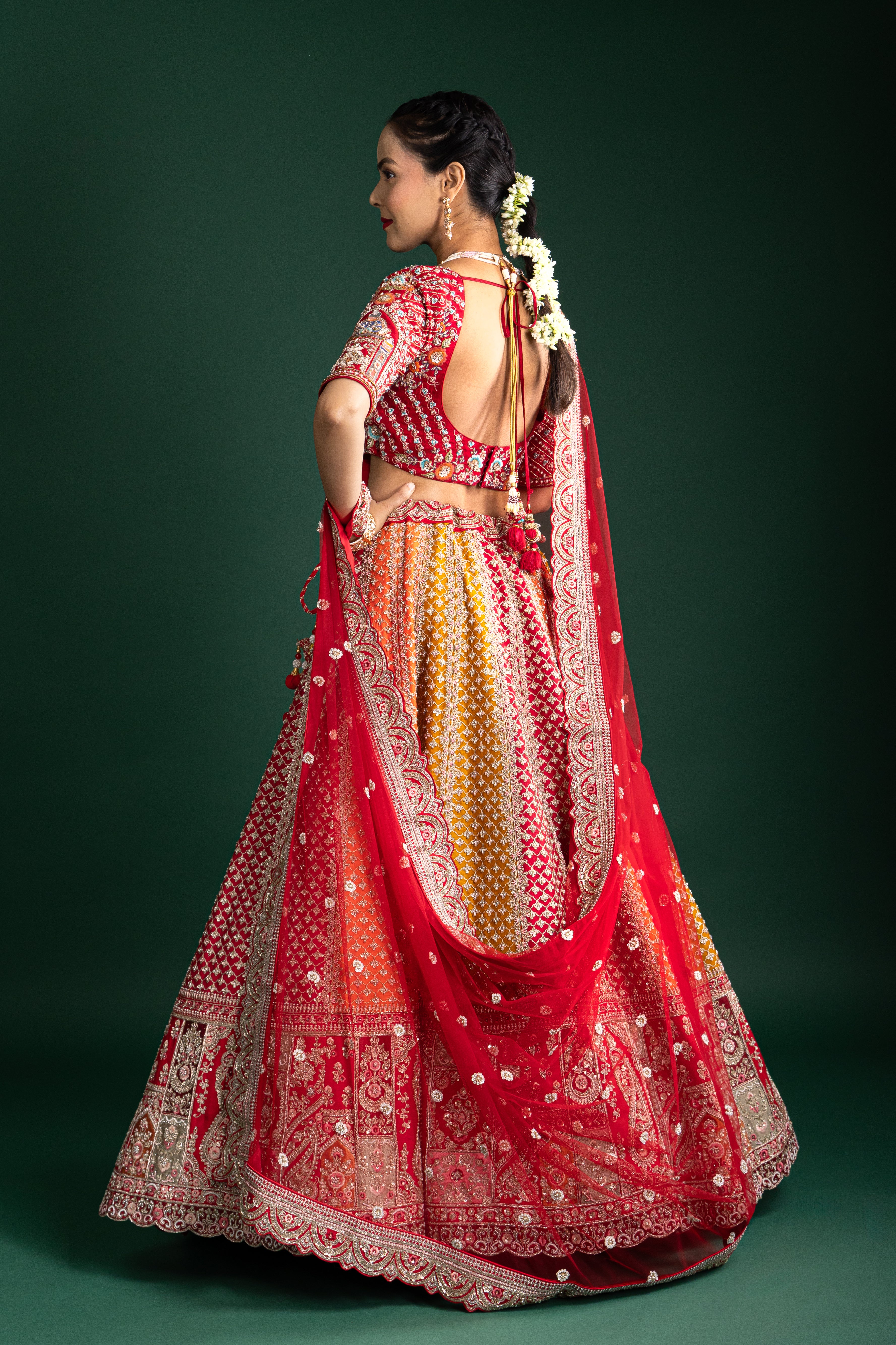 A vibrant ombre lehenga blending fiery hues of red, orange, and yellow, embellished with fine embroidery and mirror work. A statement piece for brides wanting bold elegance.