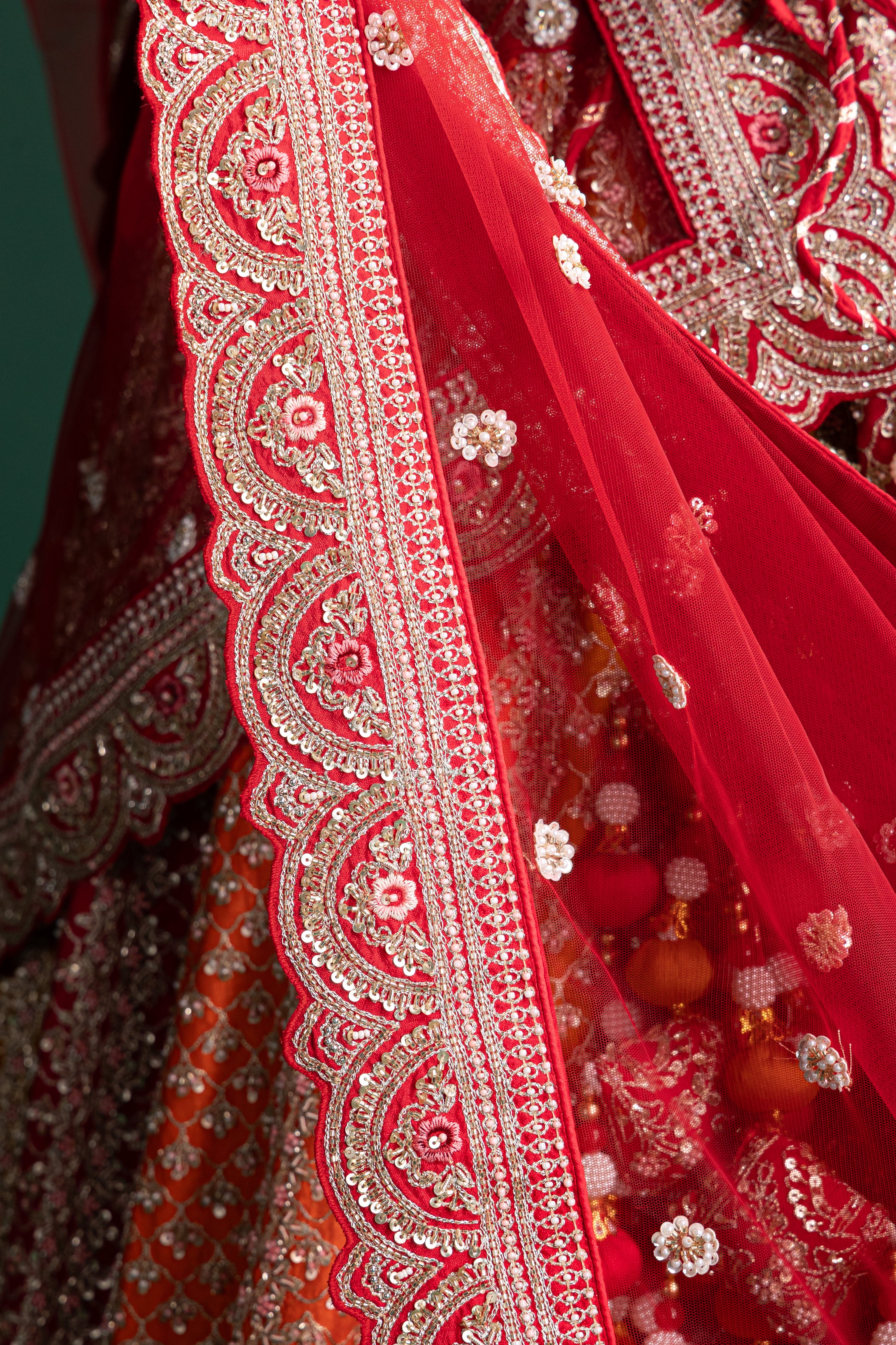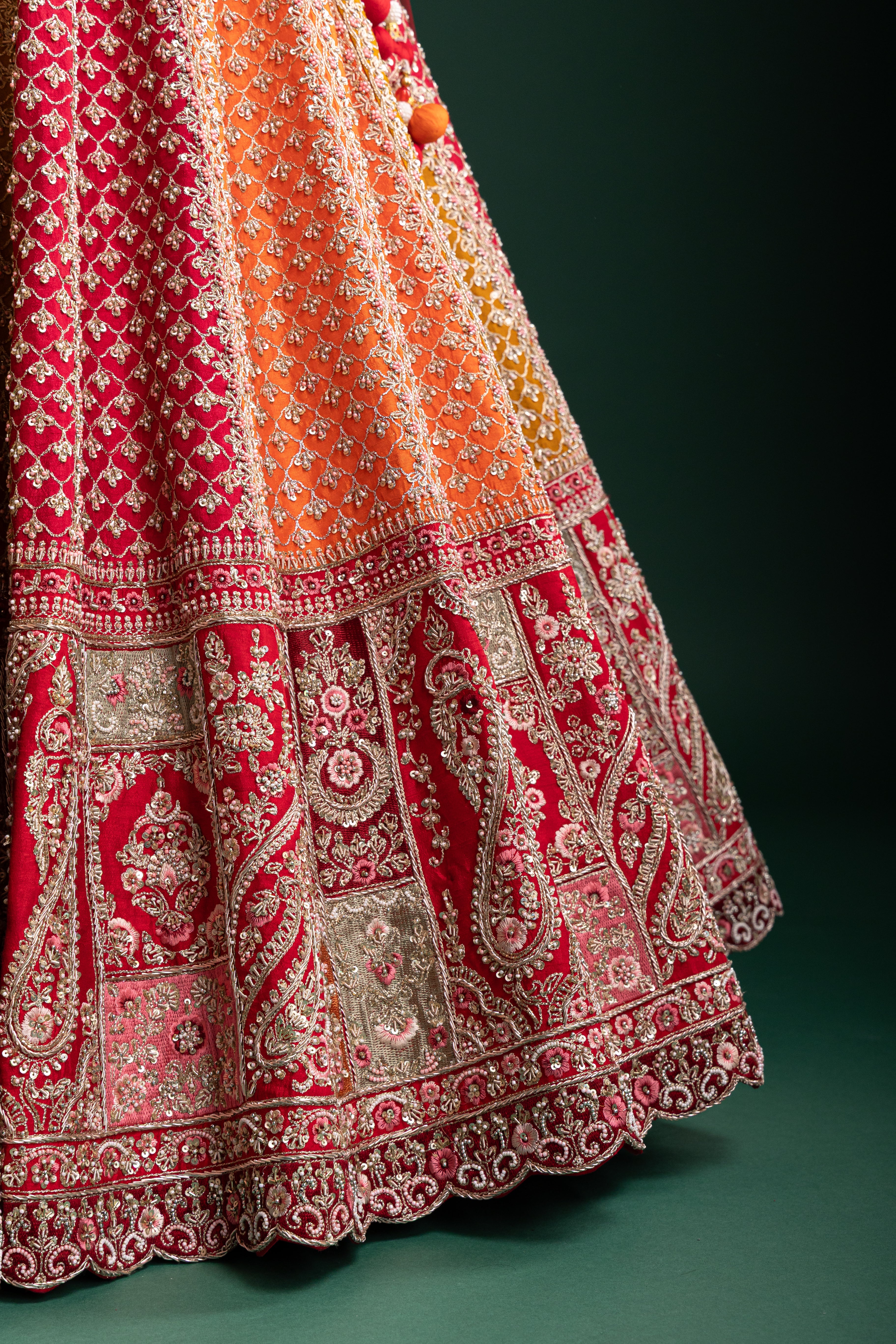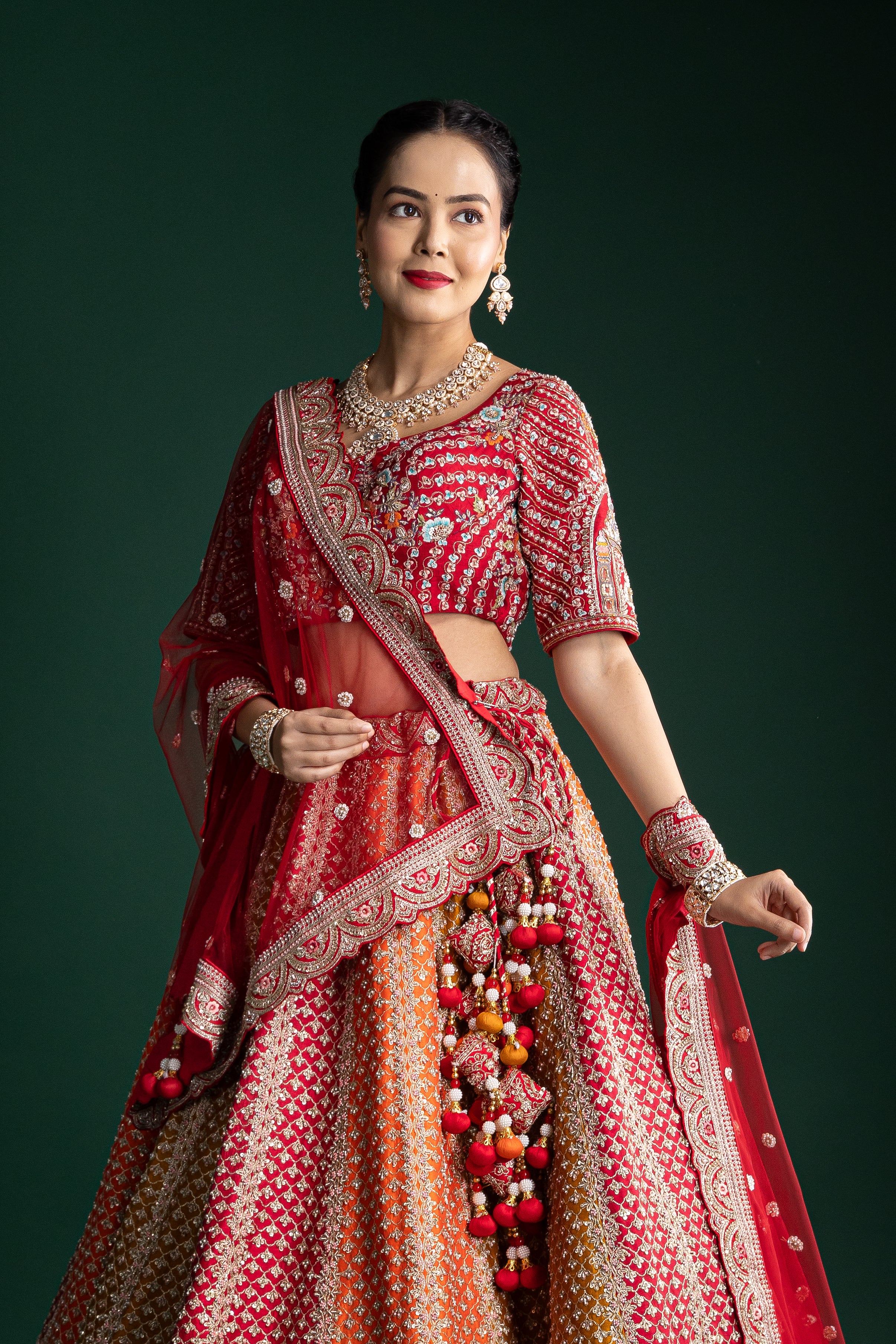 A vibrant ombre lehenga blending fiery hues of red, orange, and yellow, embellished with fine embroidery and mirror work. A statement piece for brides wanting bold elegance.