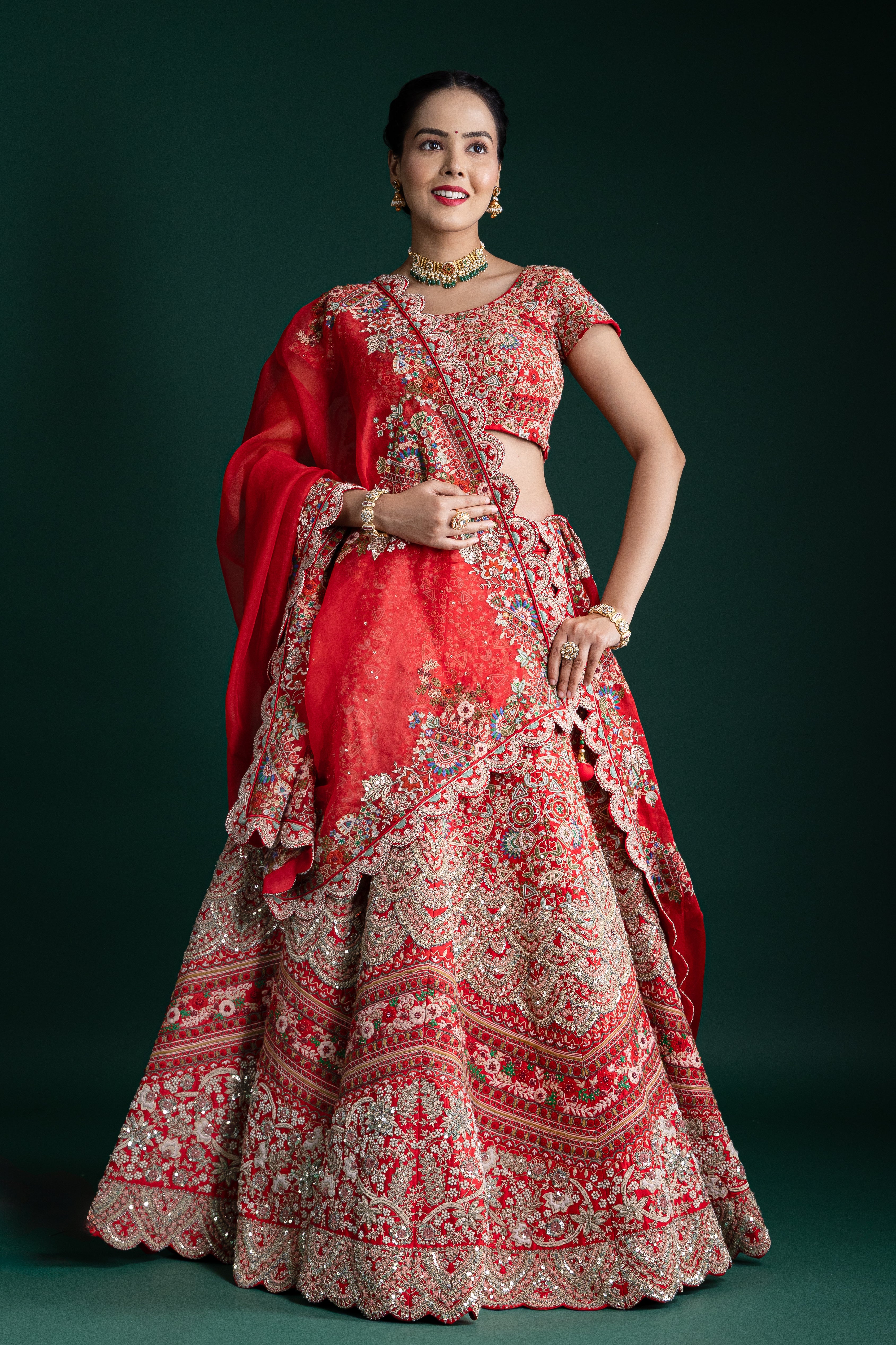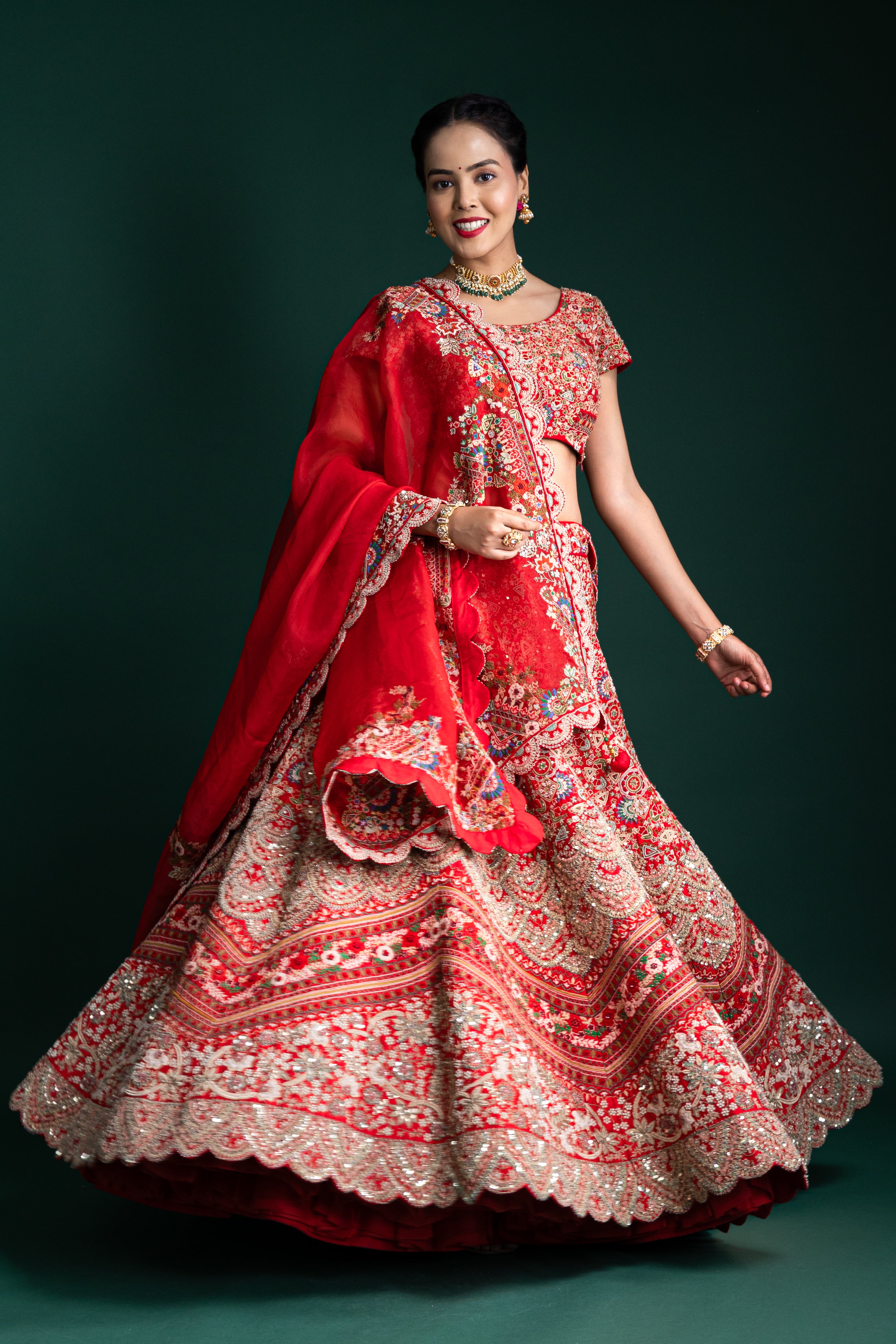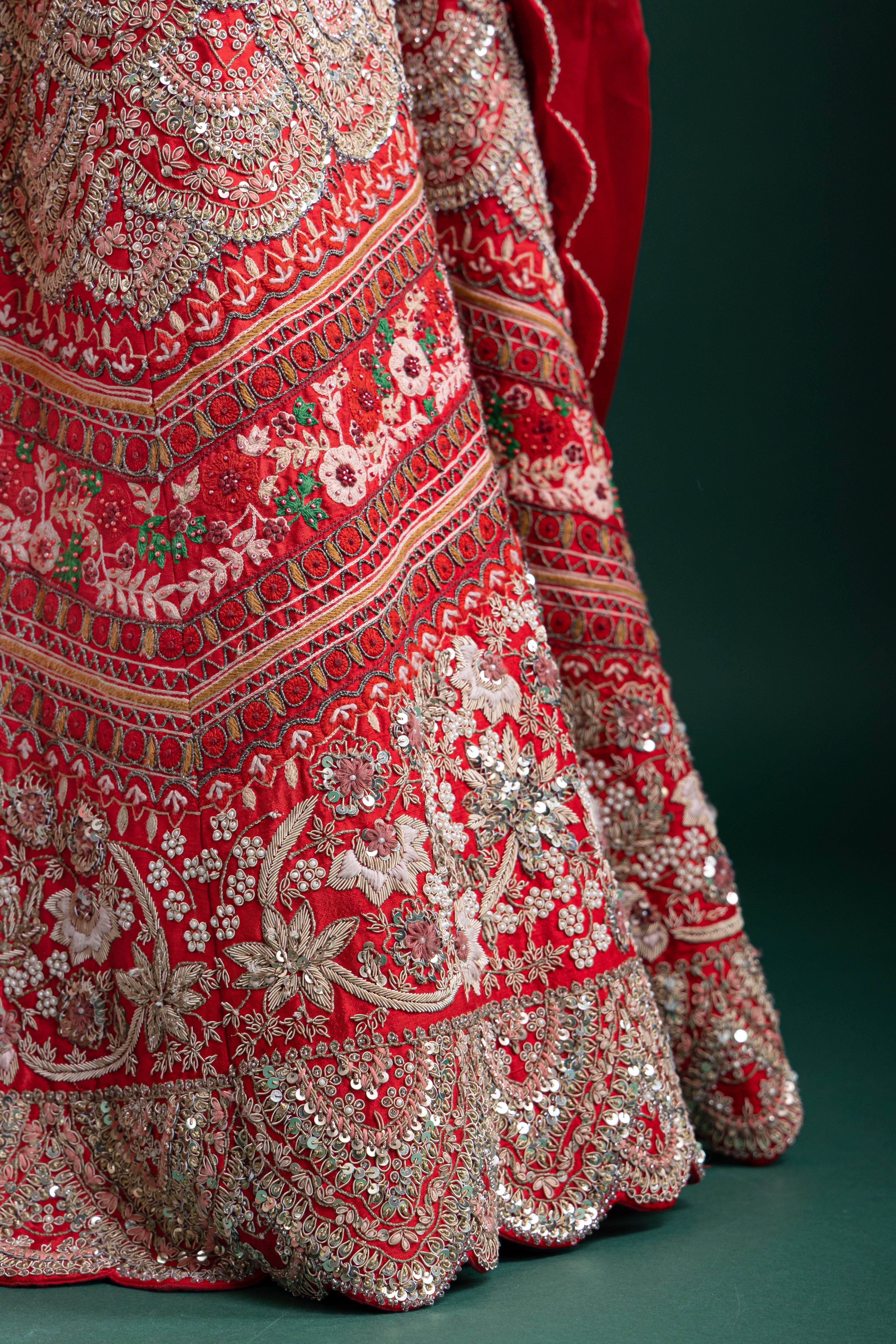This stunning scarlet red lehenga features opulent zari and sequin work with floral motifs, creating a majestic aura perfect for grand celebrations and wedding soirées.