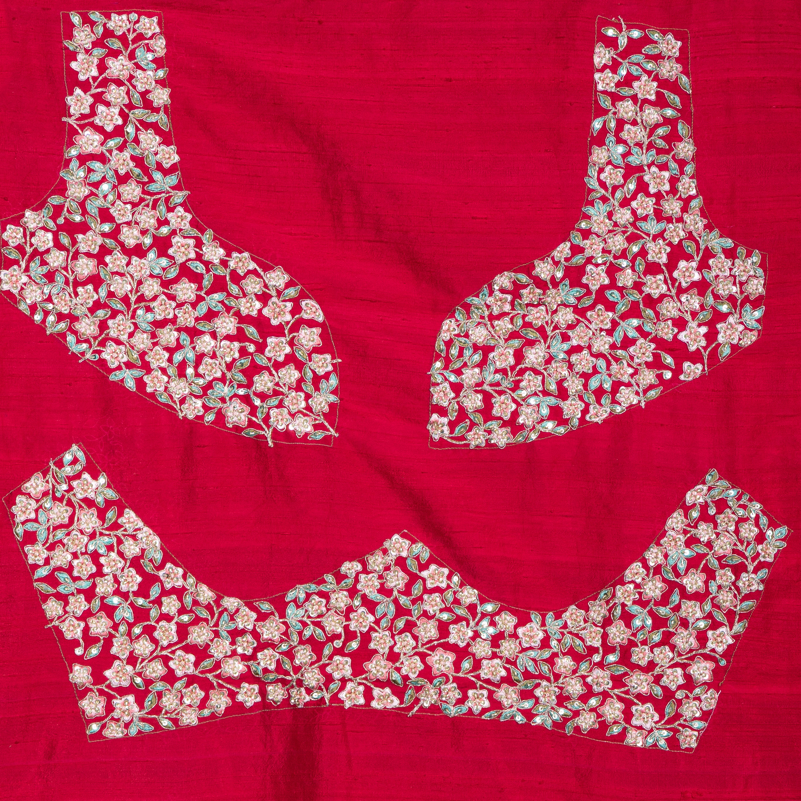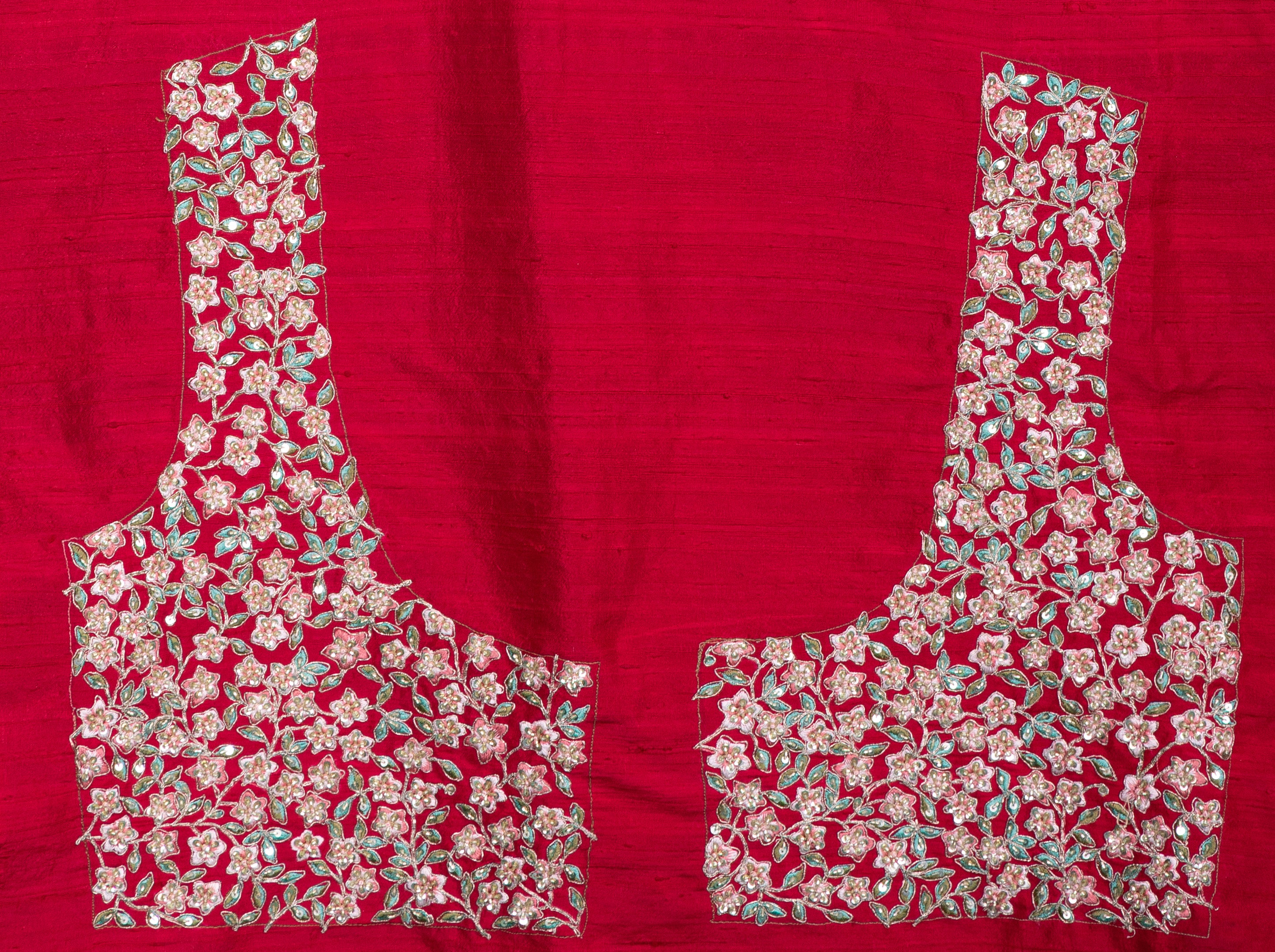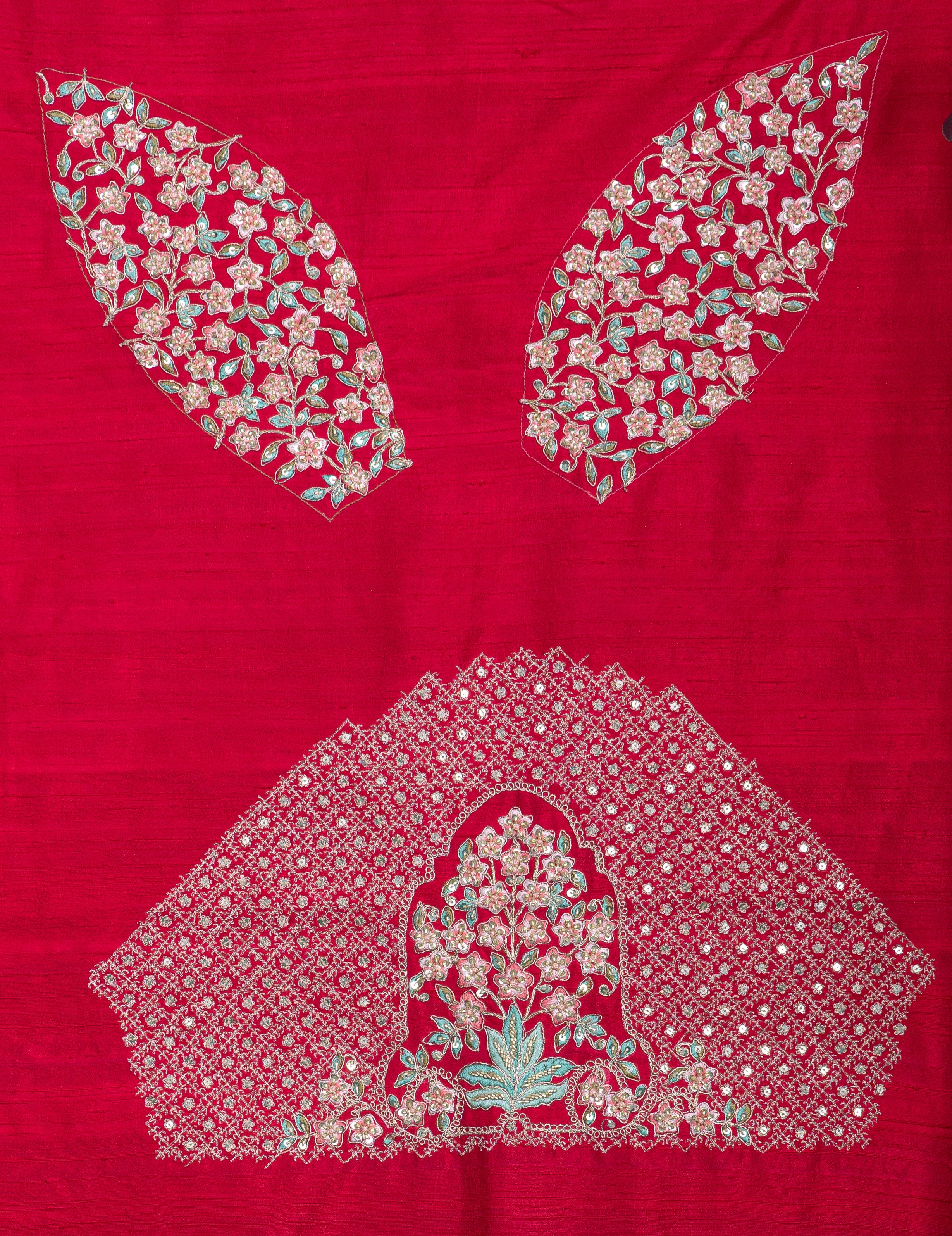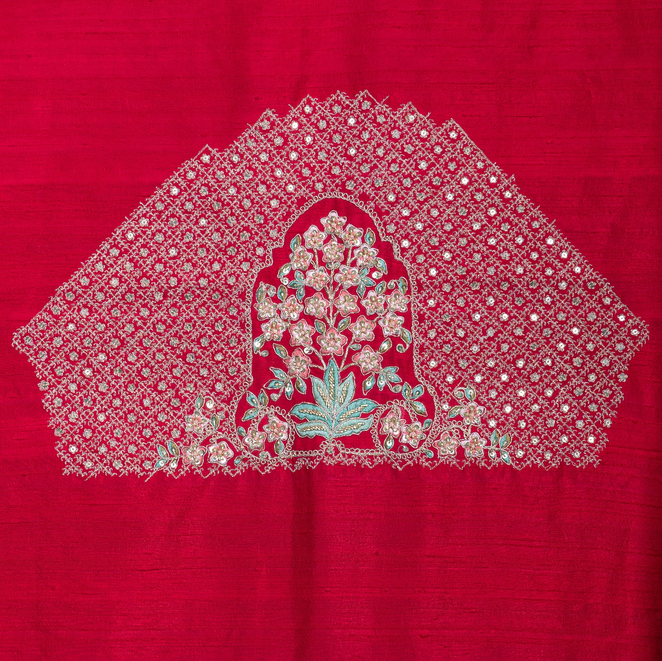 This stunning scarlet red lehenga features opulent zari and sequin work with floral motifs, creating a majestic aura perfect for grand celebrations and wedding soirées.