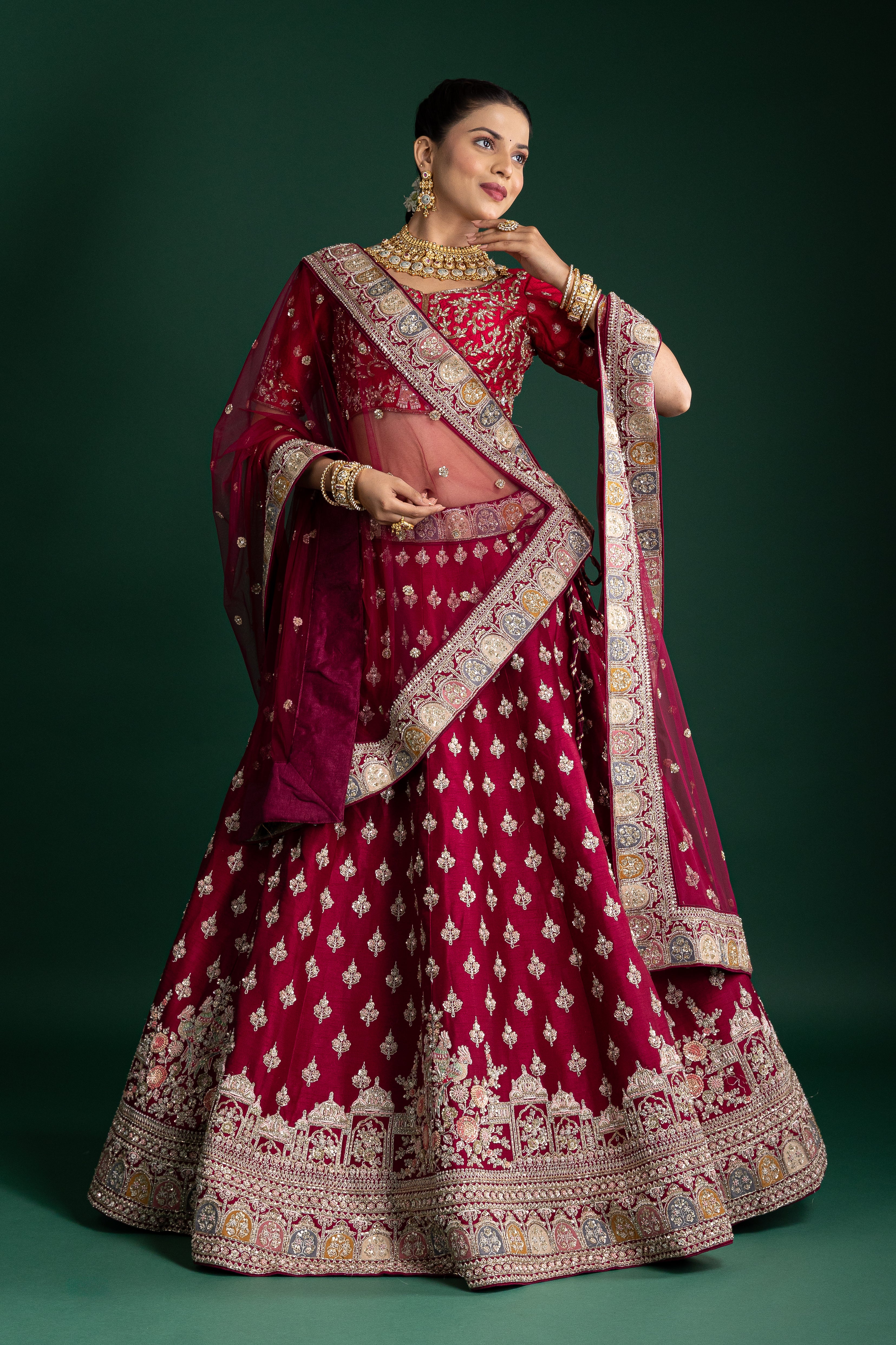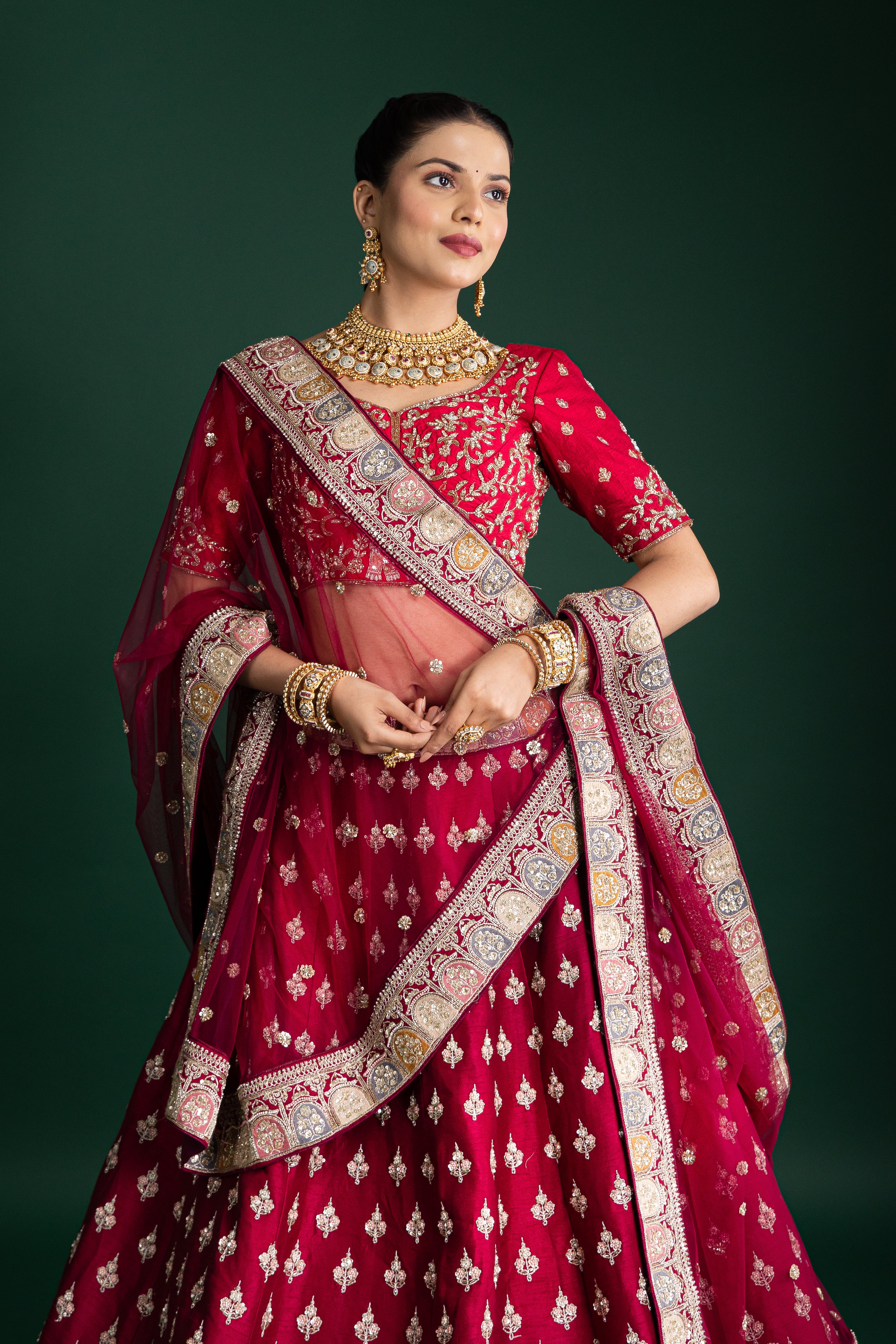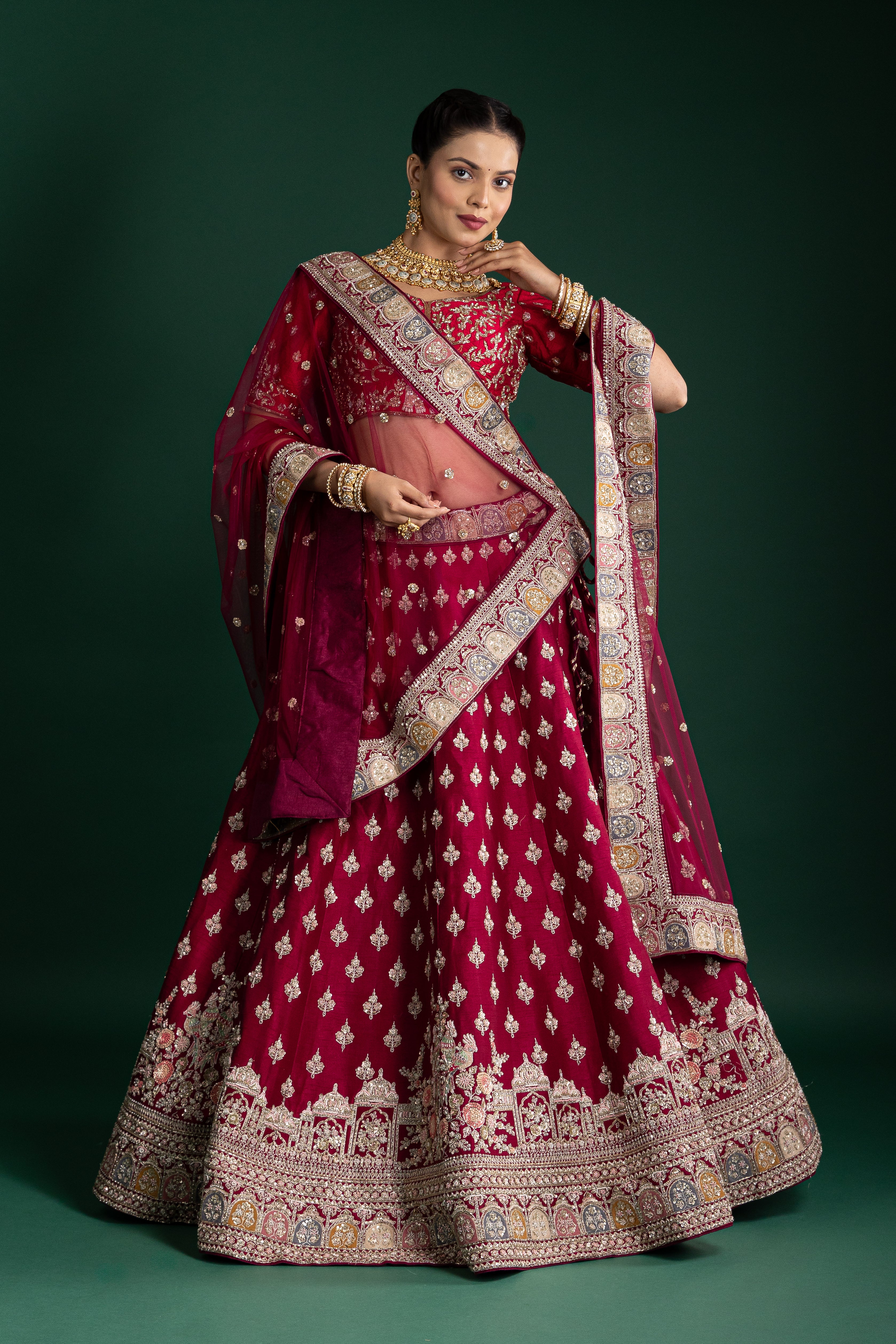 A luxurious deep wine red lehenga with intricate handcrafted borders and zari embroidery, making it a masterpiece of timeless tradition and sophistication.