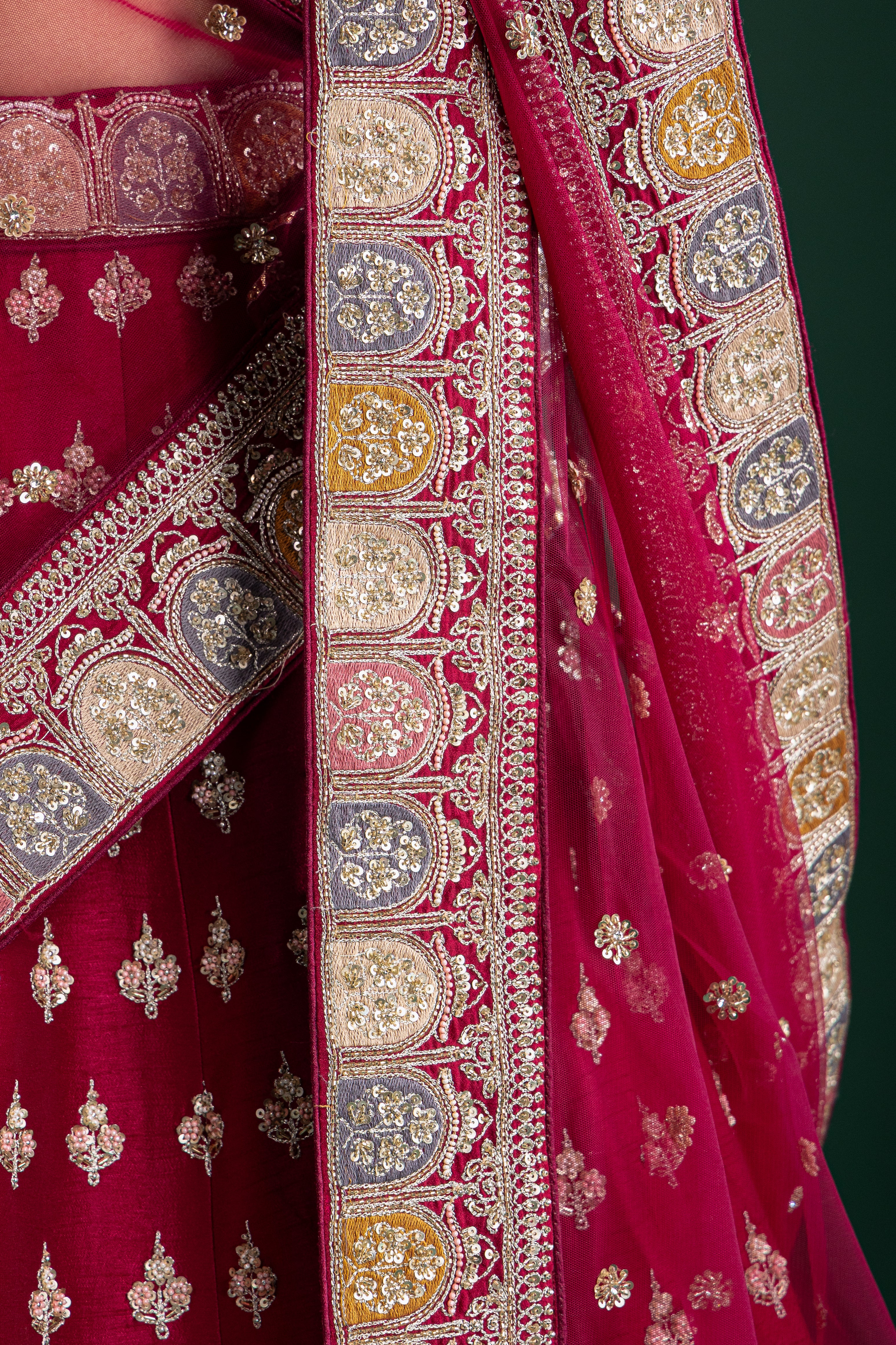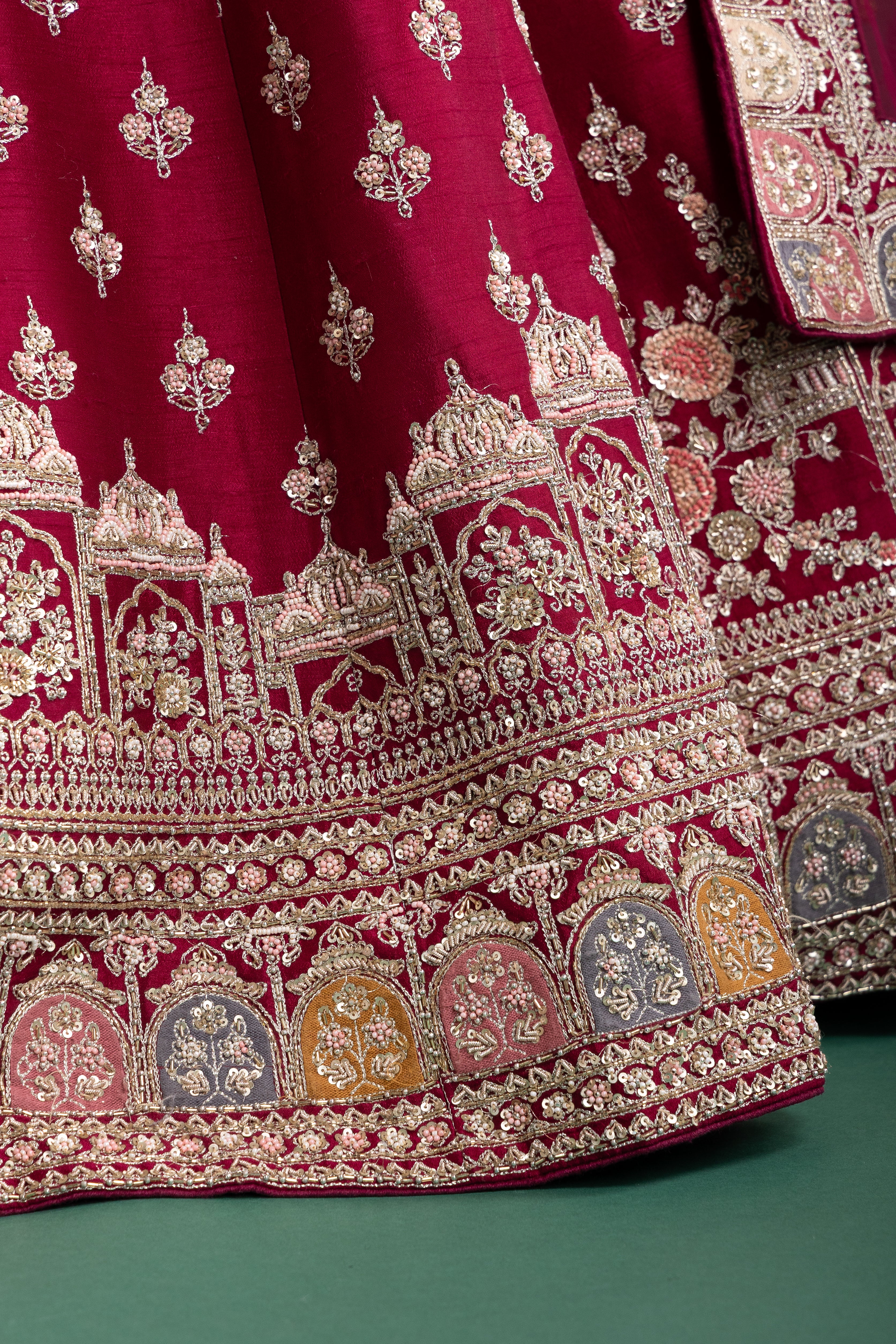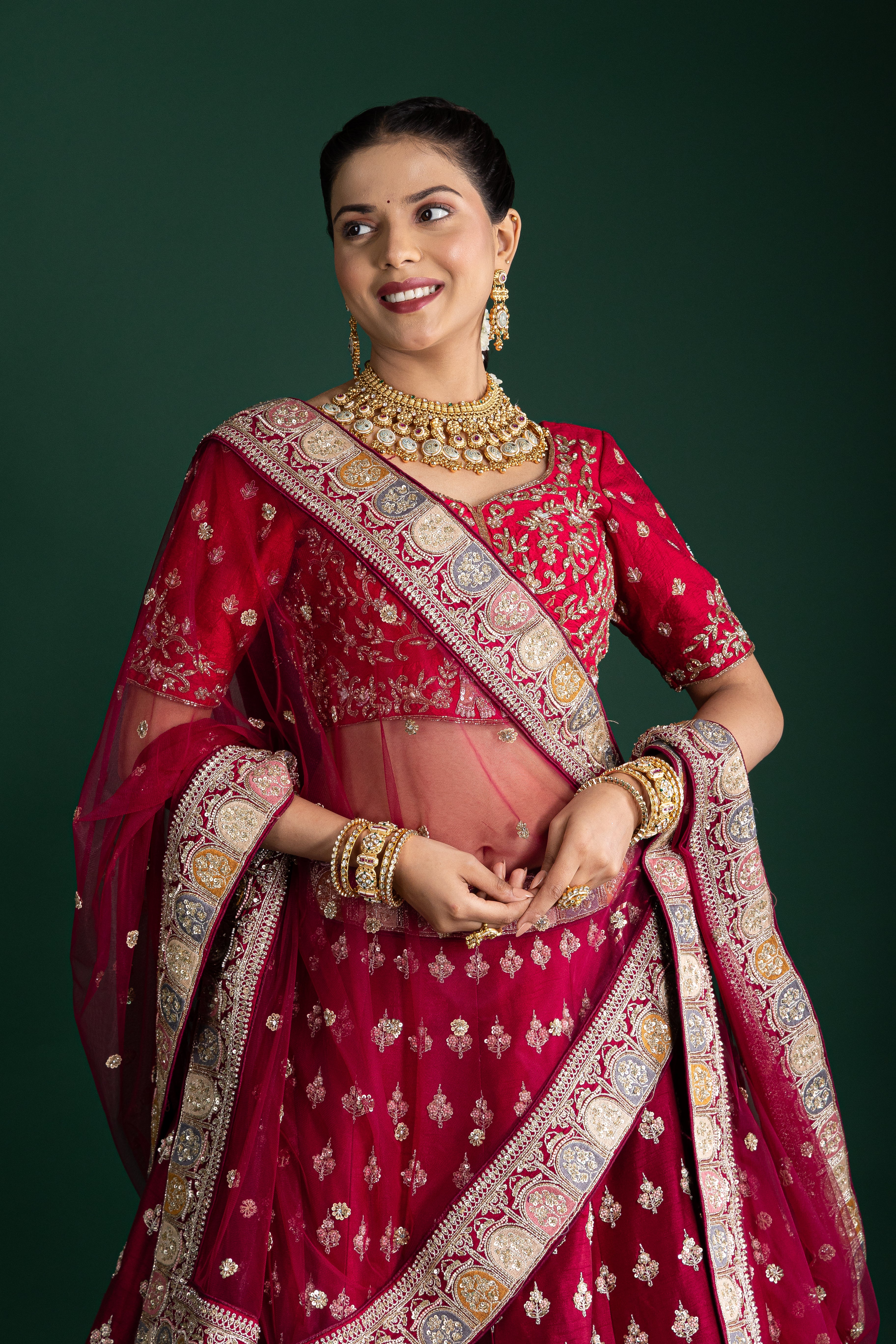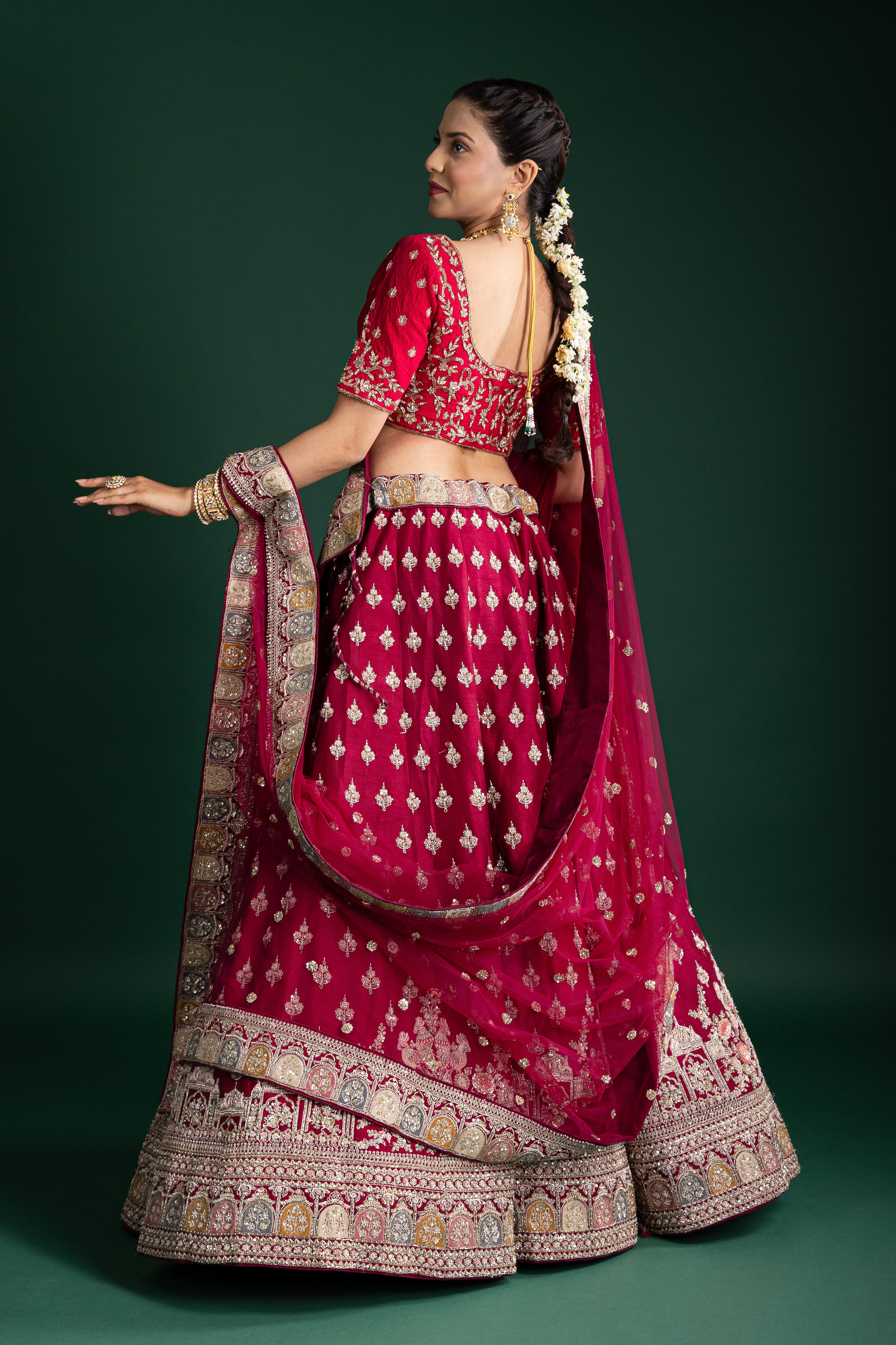 A luxurious deep wine red lehenga with intricate handcrafted borders and zari embroidery, making it a masterpiece of timeless tradition and sophistication.