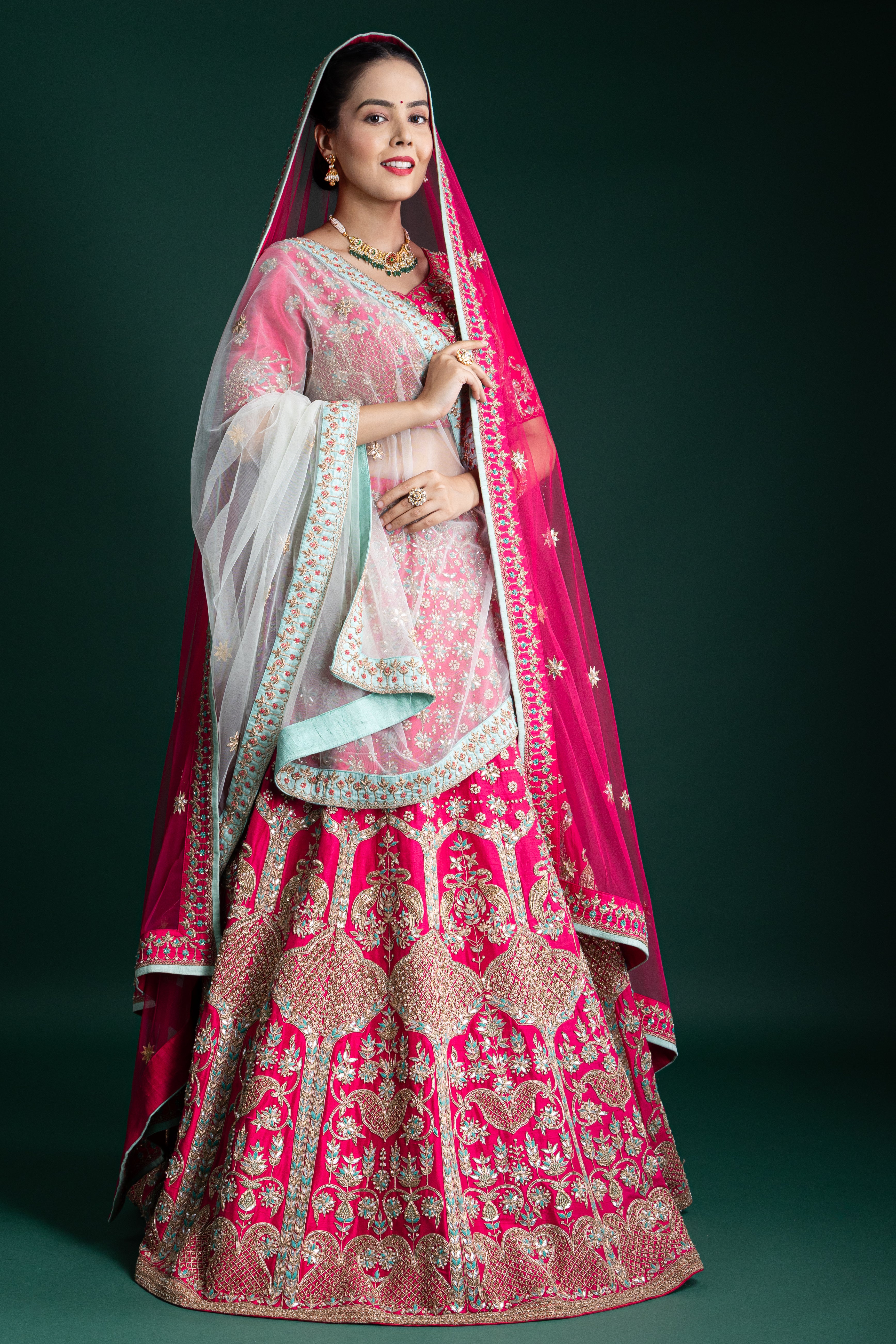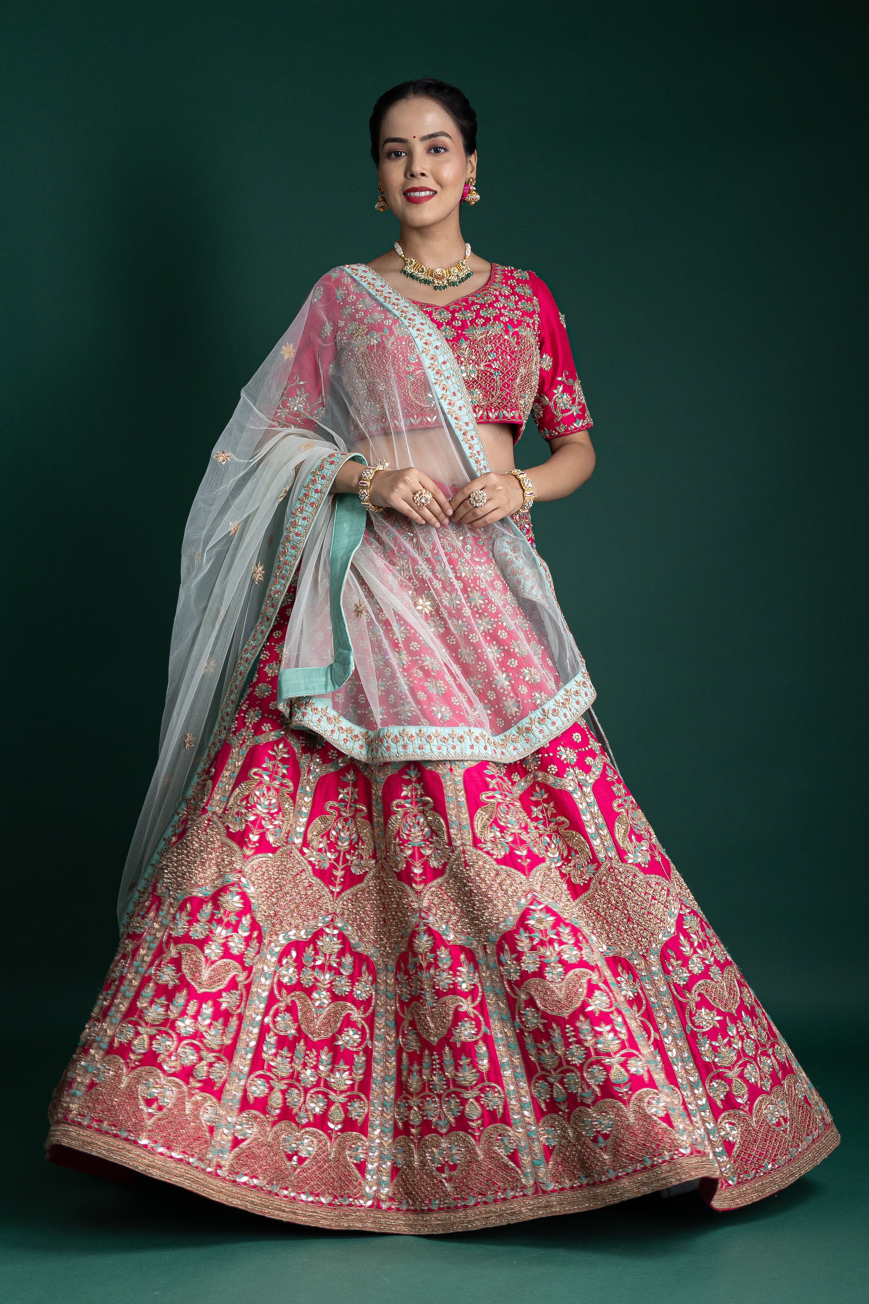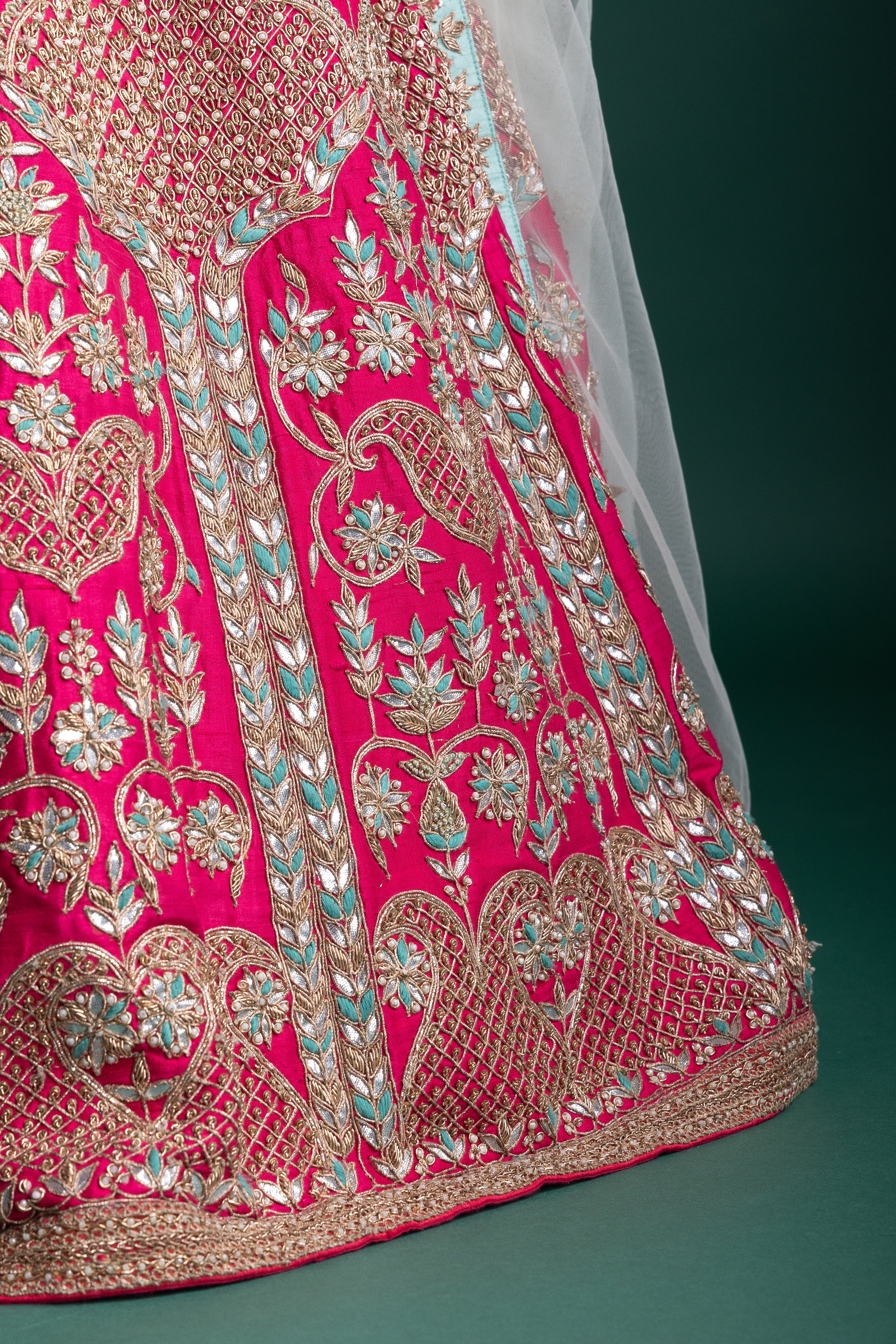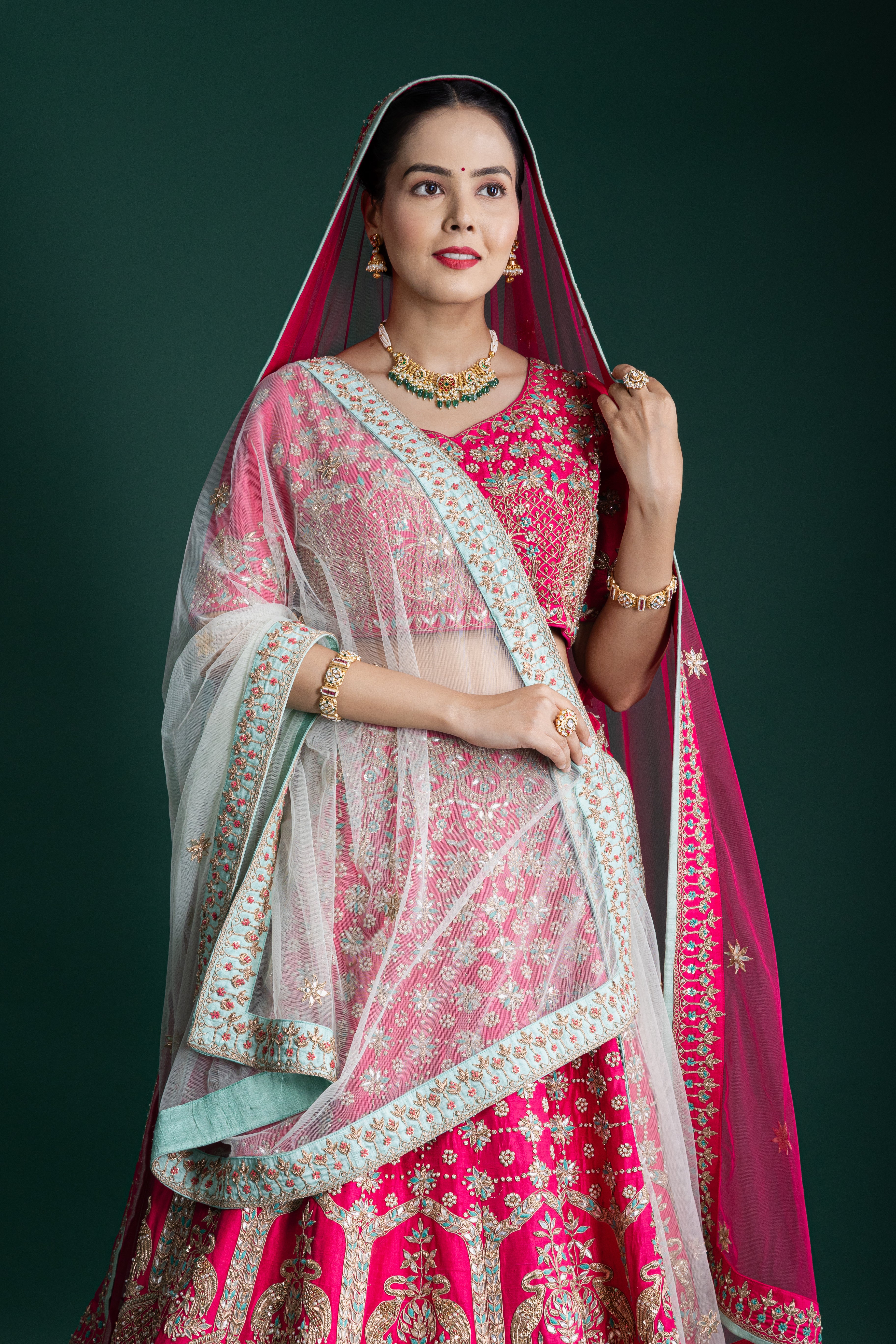 This fuchsia pink lehenga paired with a frosted aqua dupatta is a perfect fusion of vibrancy and finesse, ideal for brides seeking a playful yet luxurious vibe.