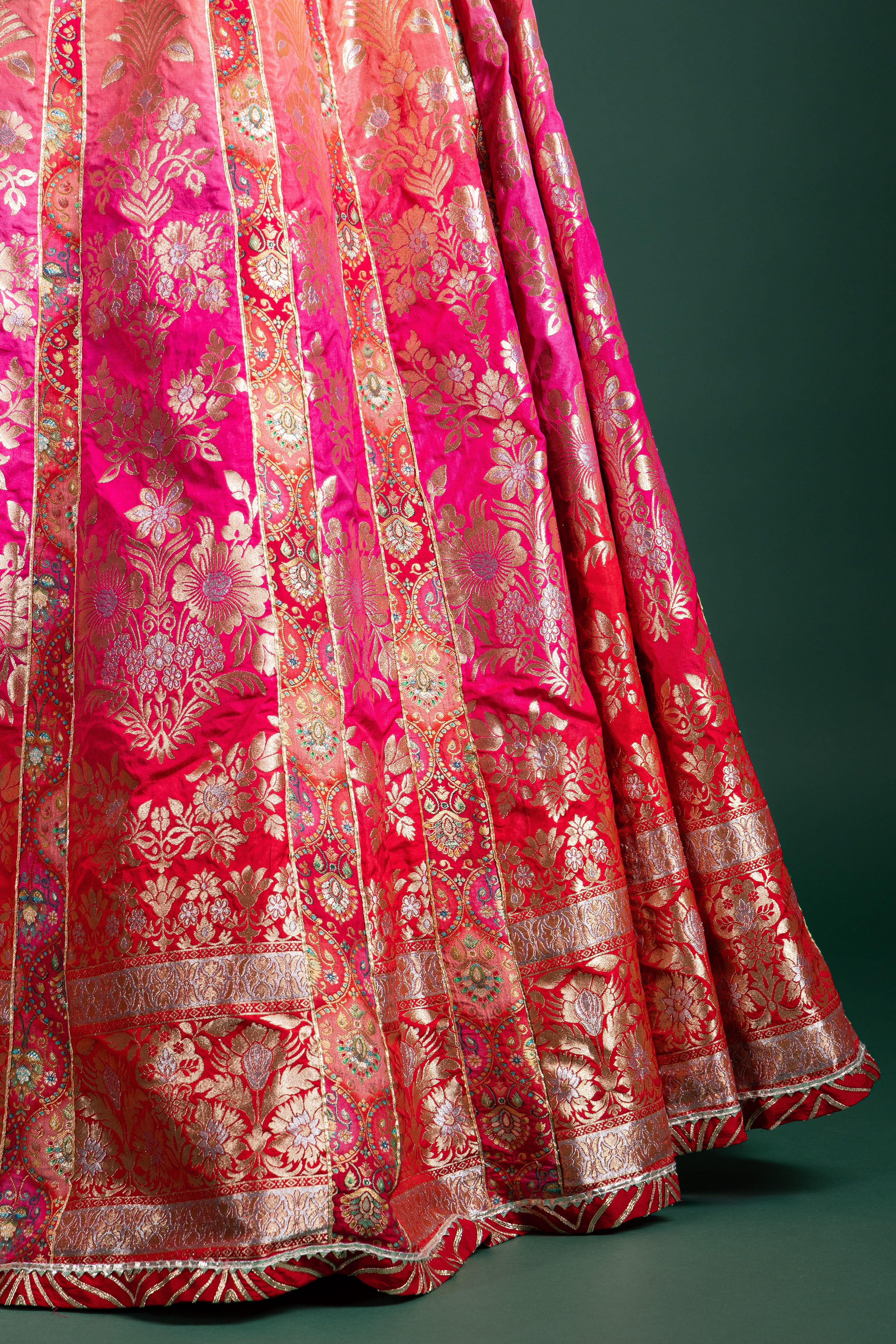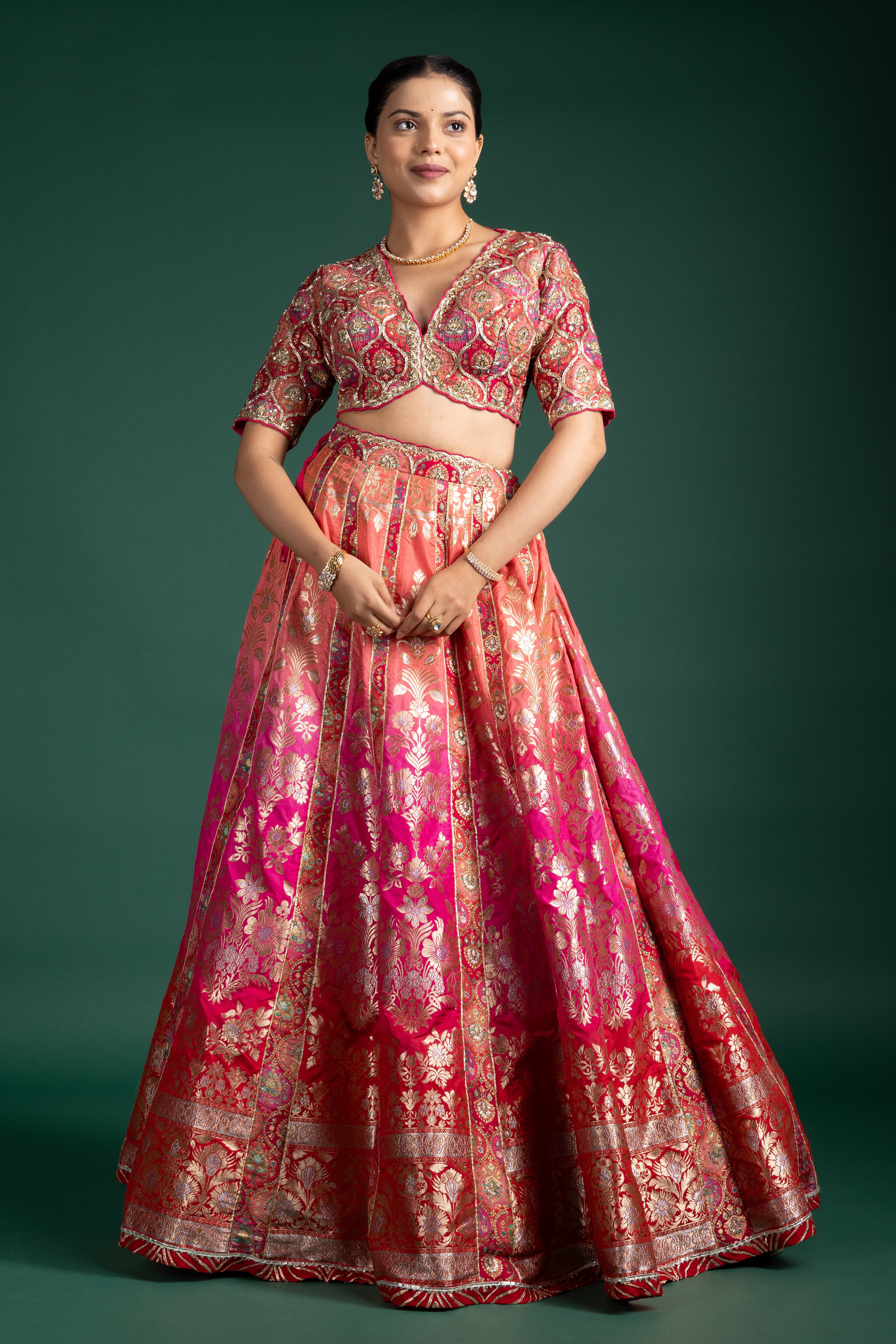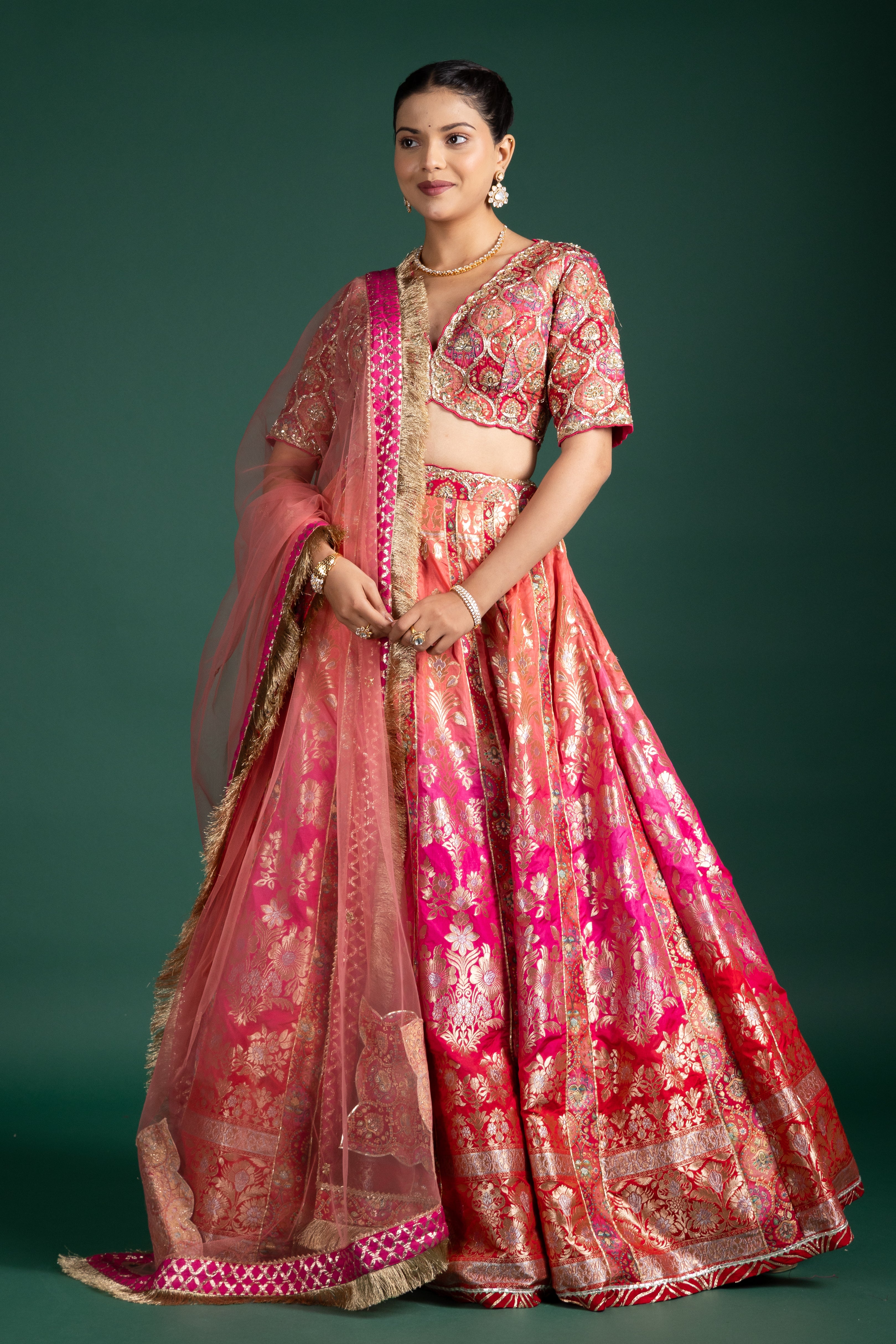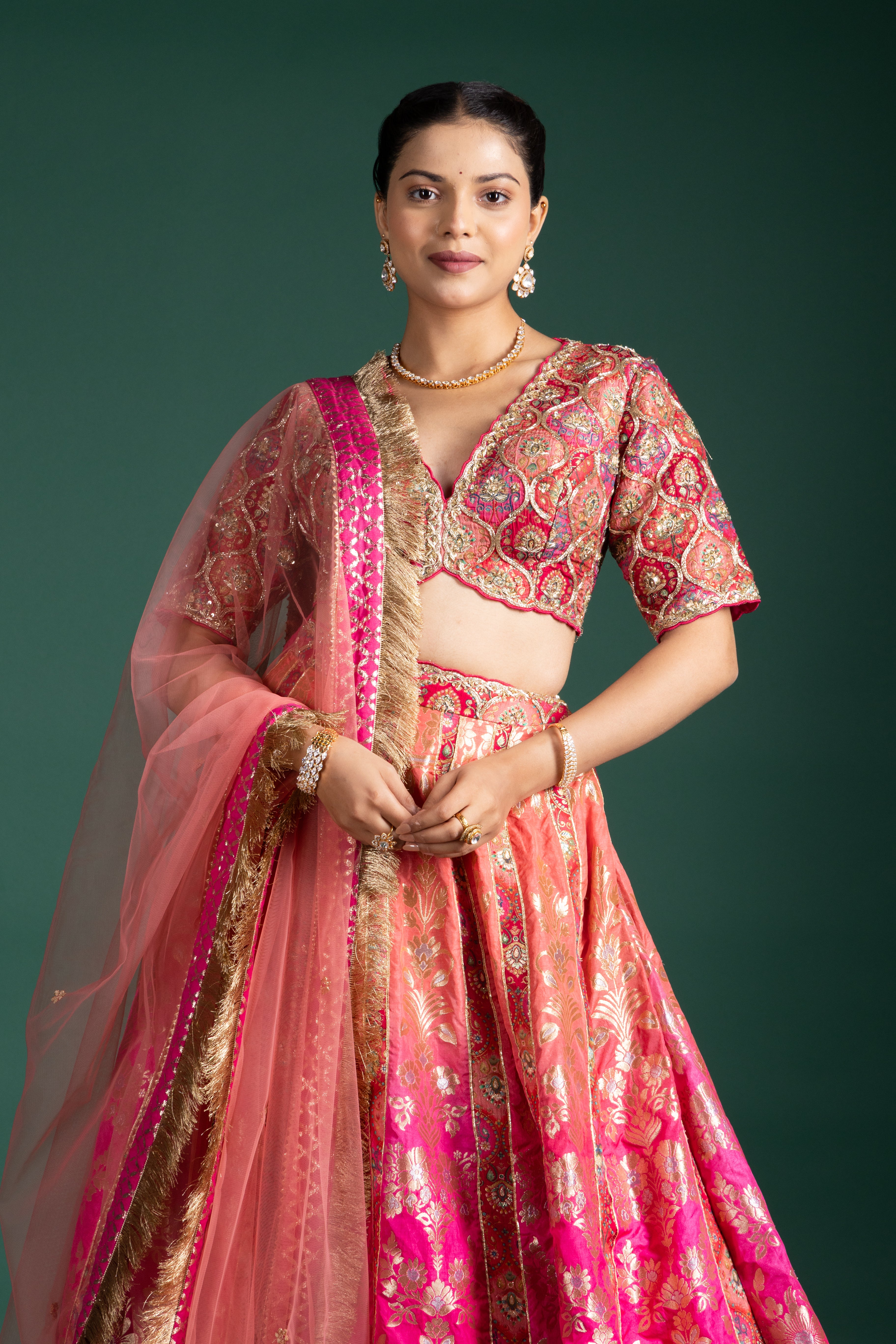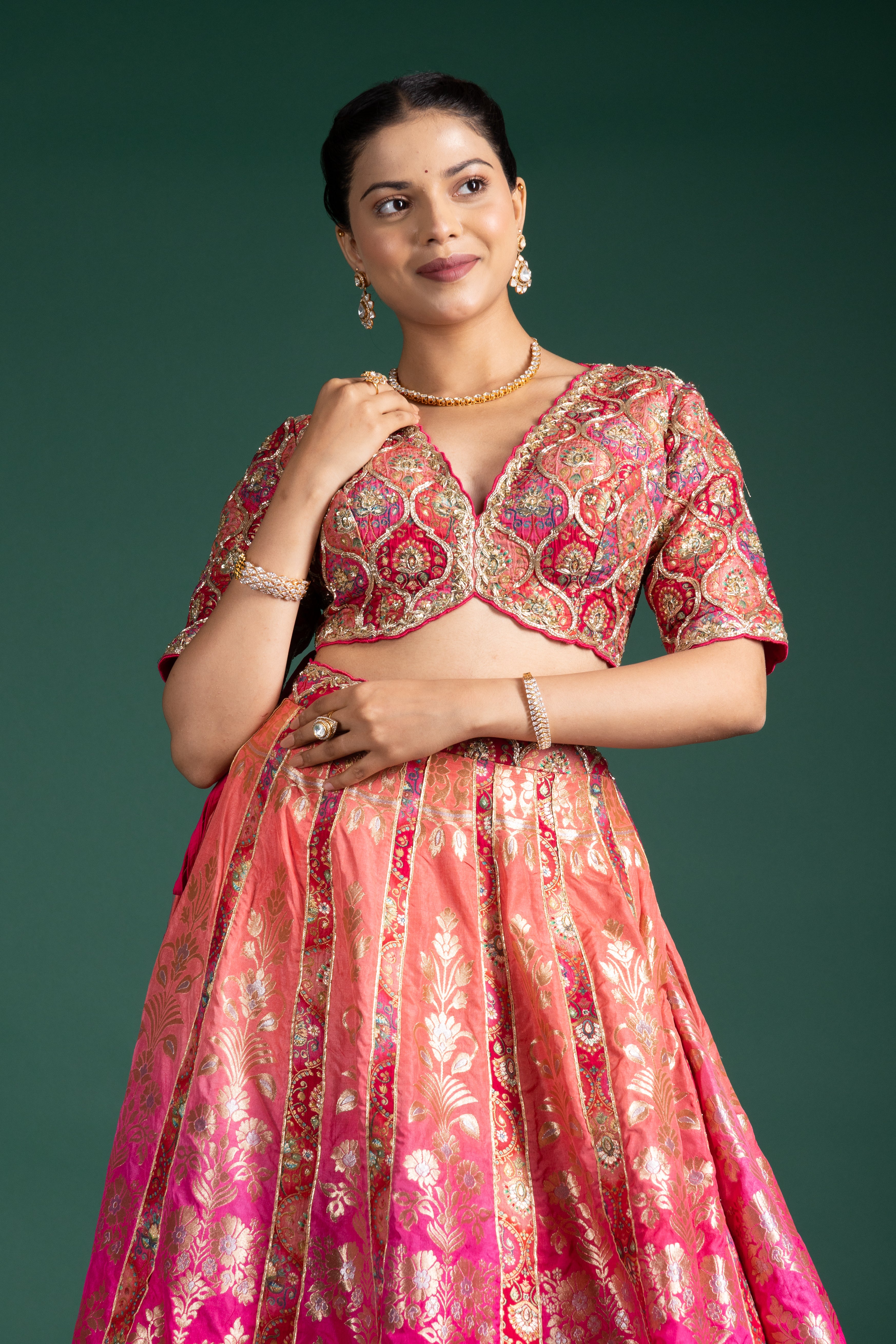 Blush Coral Lehenga with Opulent Golden Zari Accents