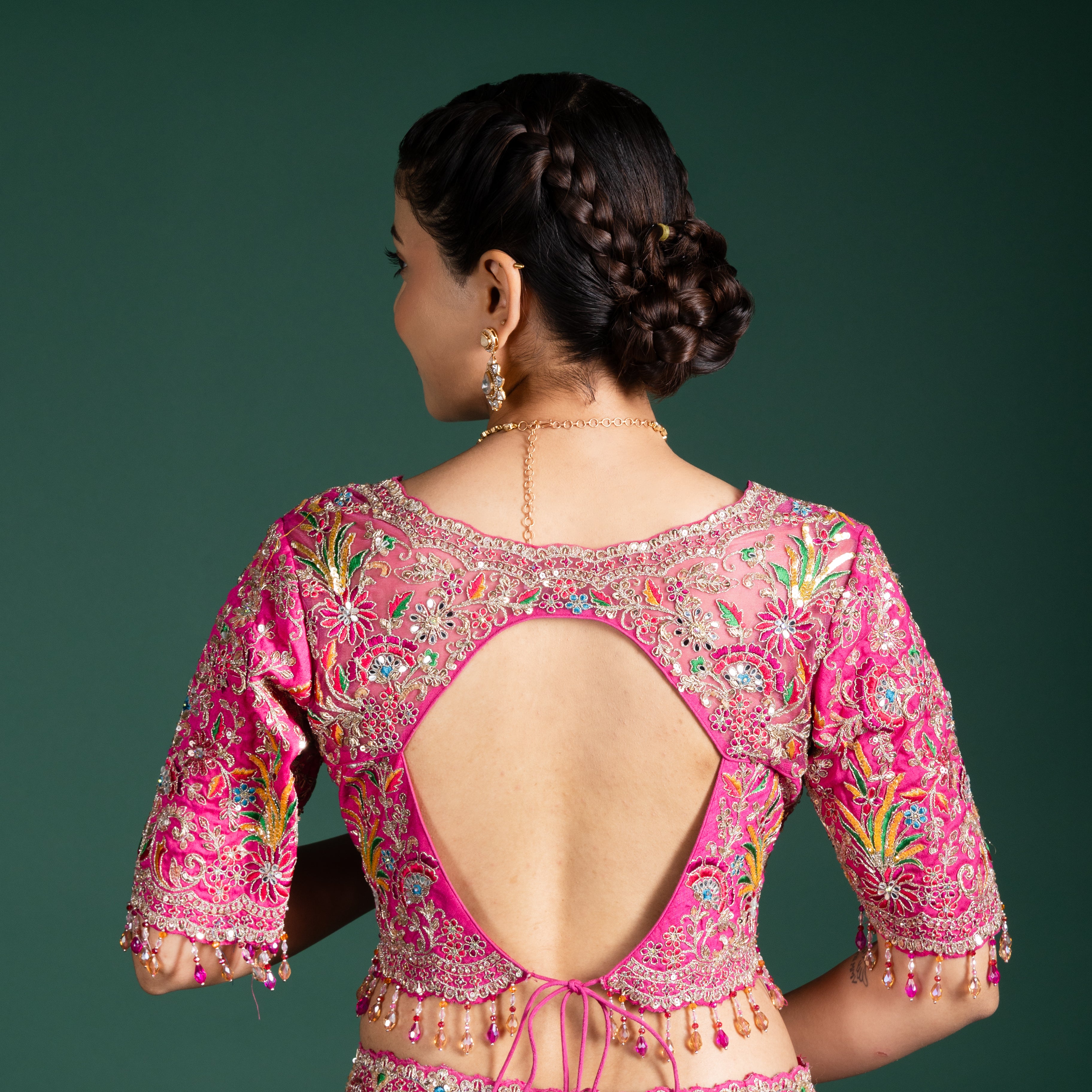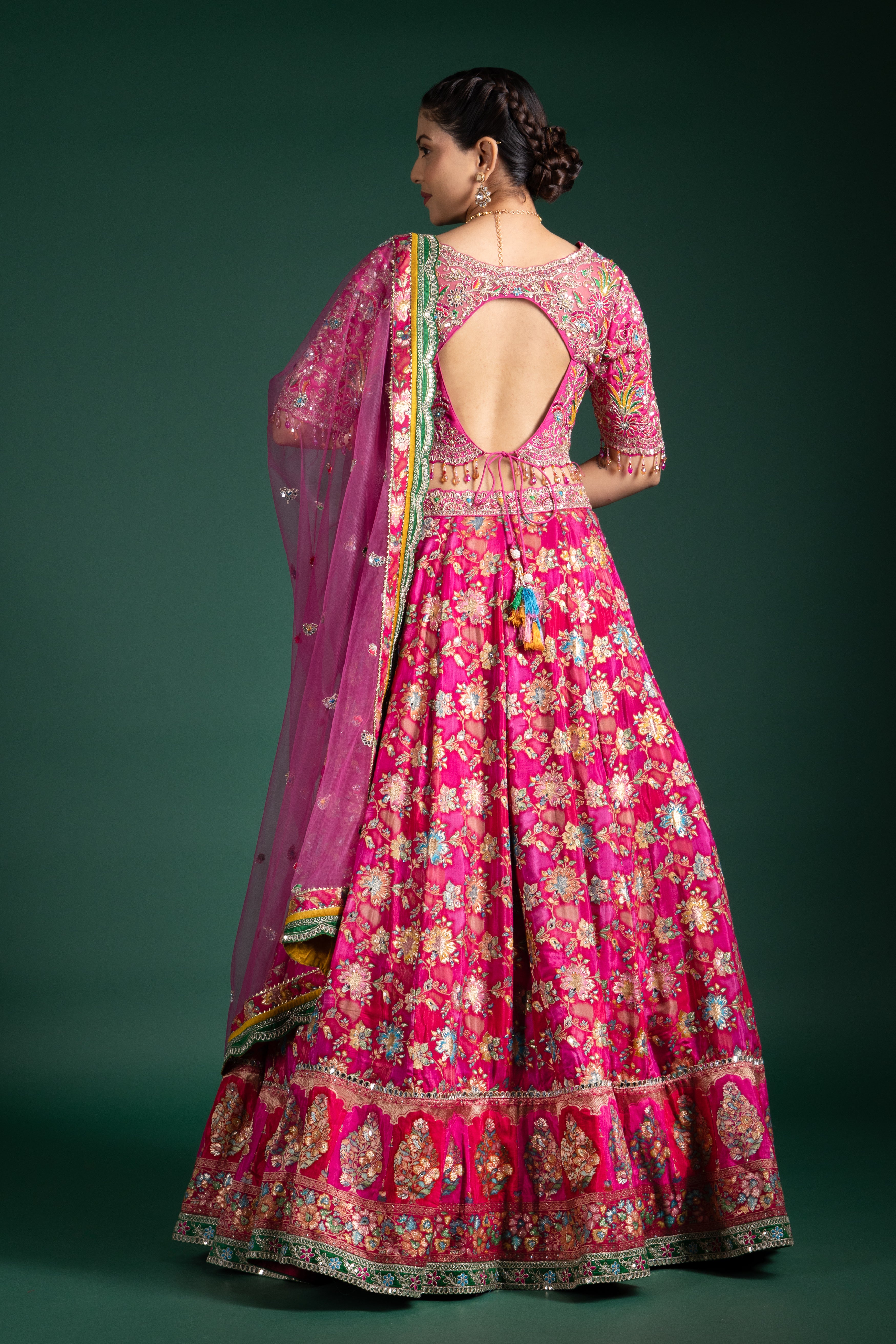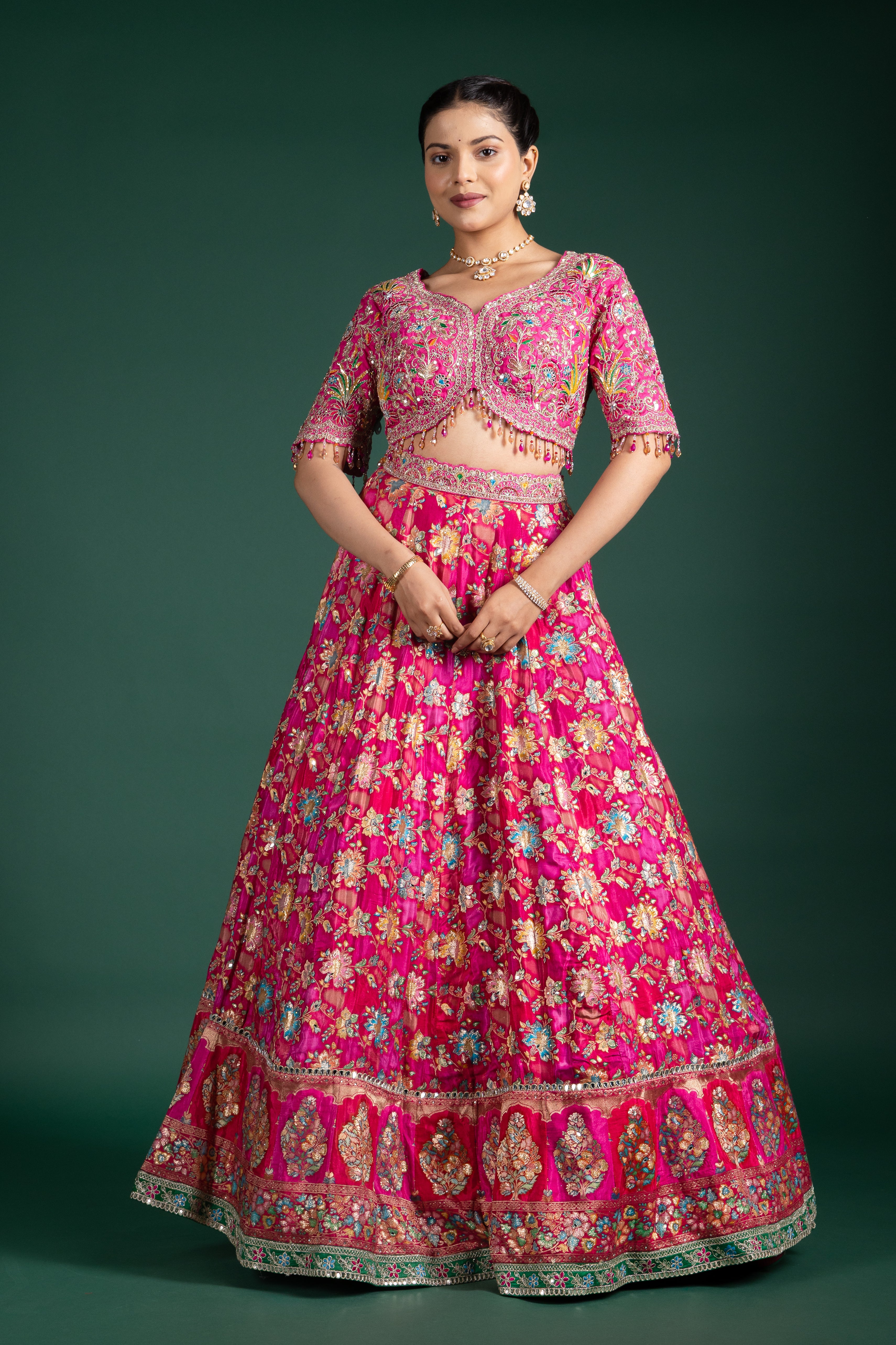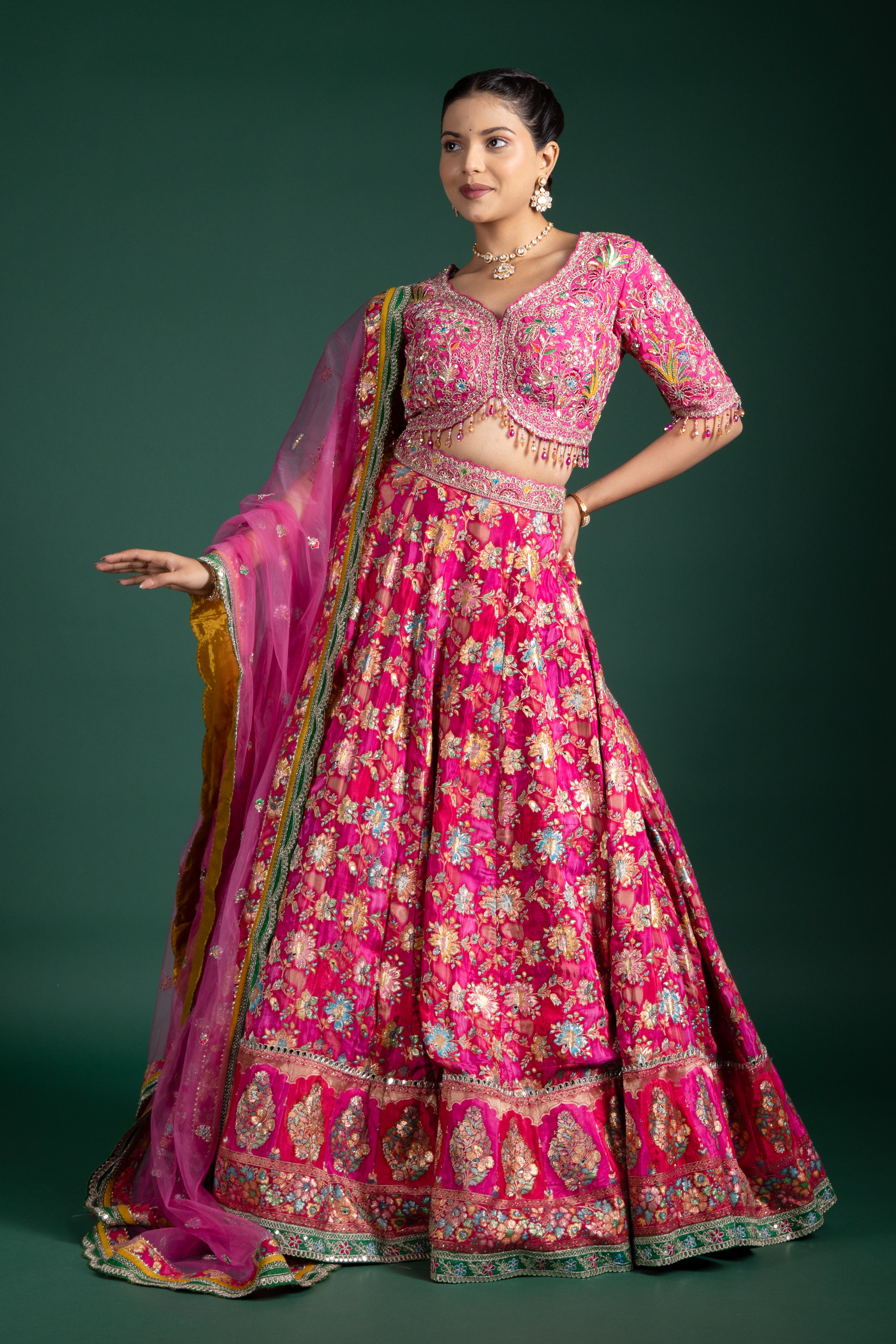 Crafted in luxurious fuchsia pink with intricate multicolour embroidery, this lehenga is a statement piece for festive occasions and weddings, reflecting elegance and sophistication.