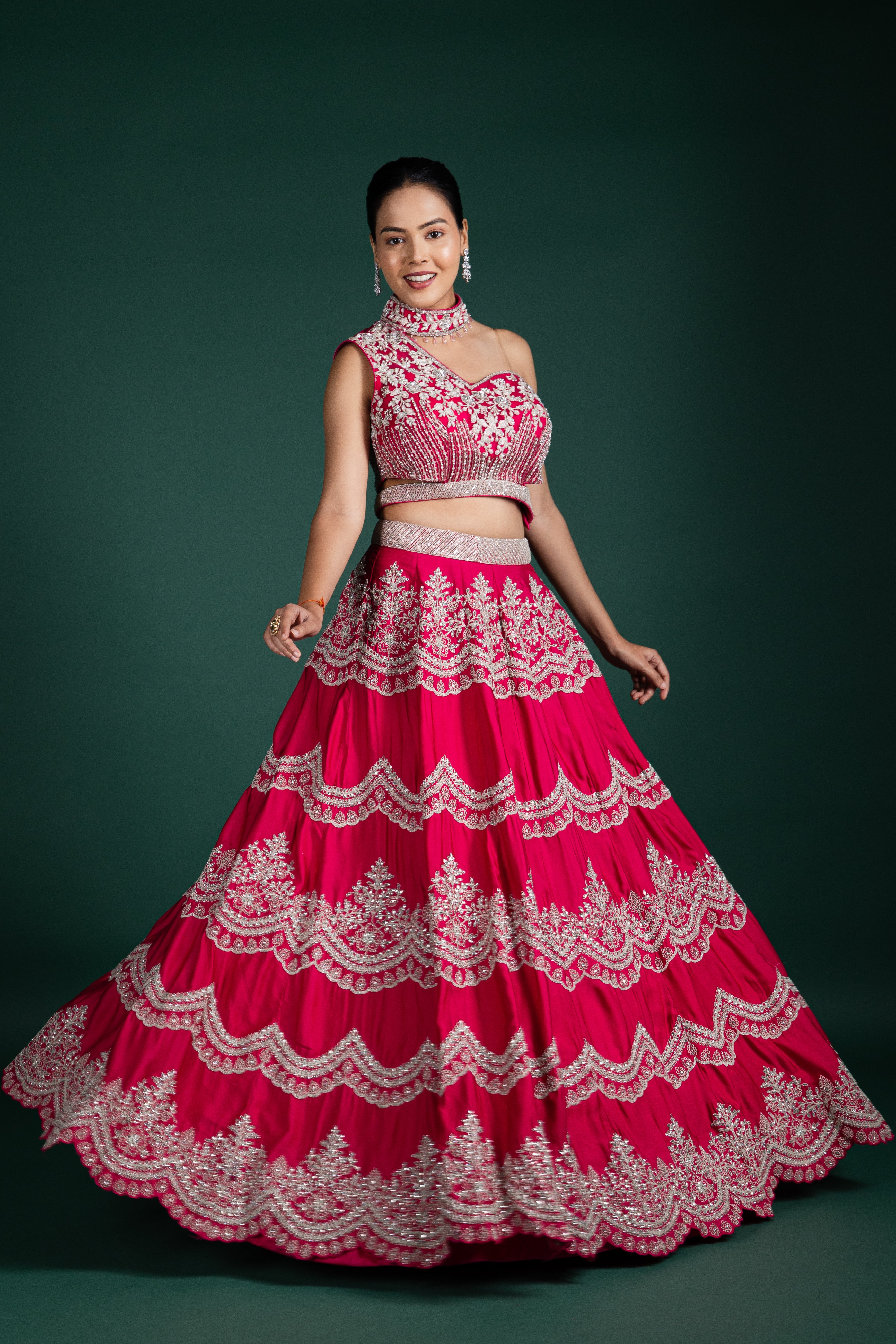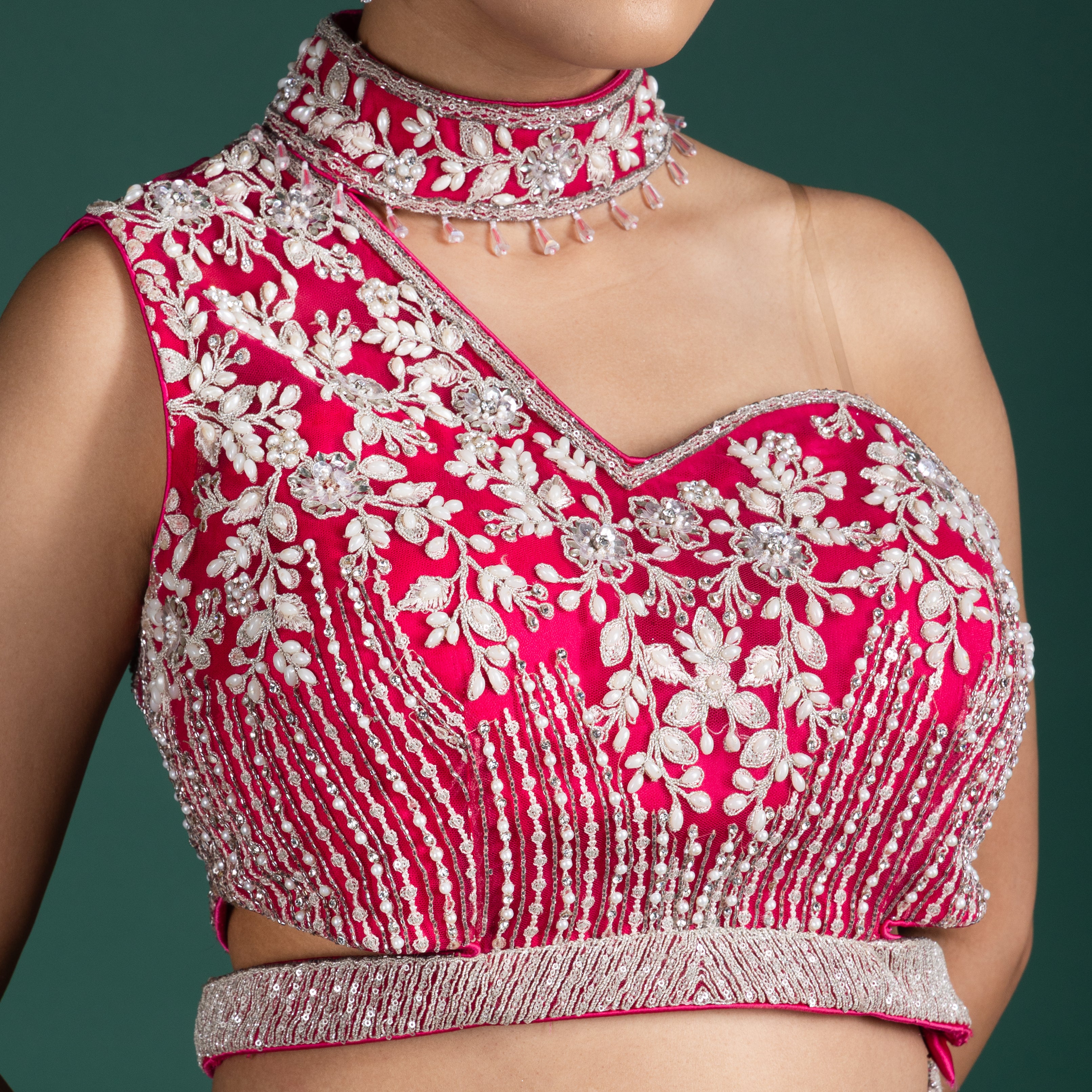 This raspberry pink lehenga features intricate zardozi embroidery and a bold one-shoulder blouse, perfect for making a grand entry at any celebration.