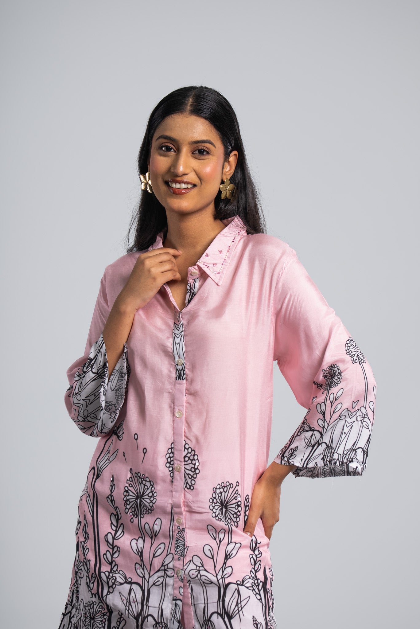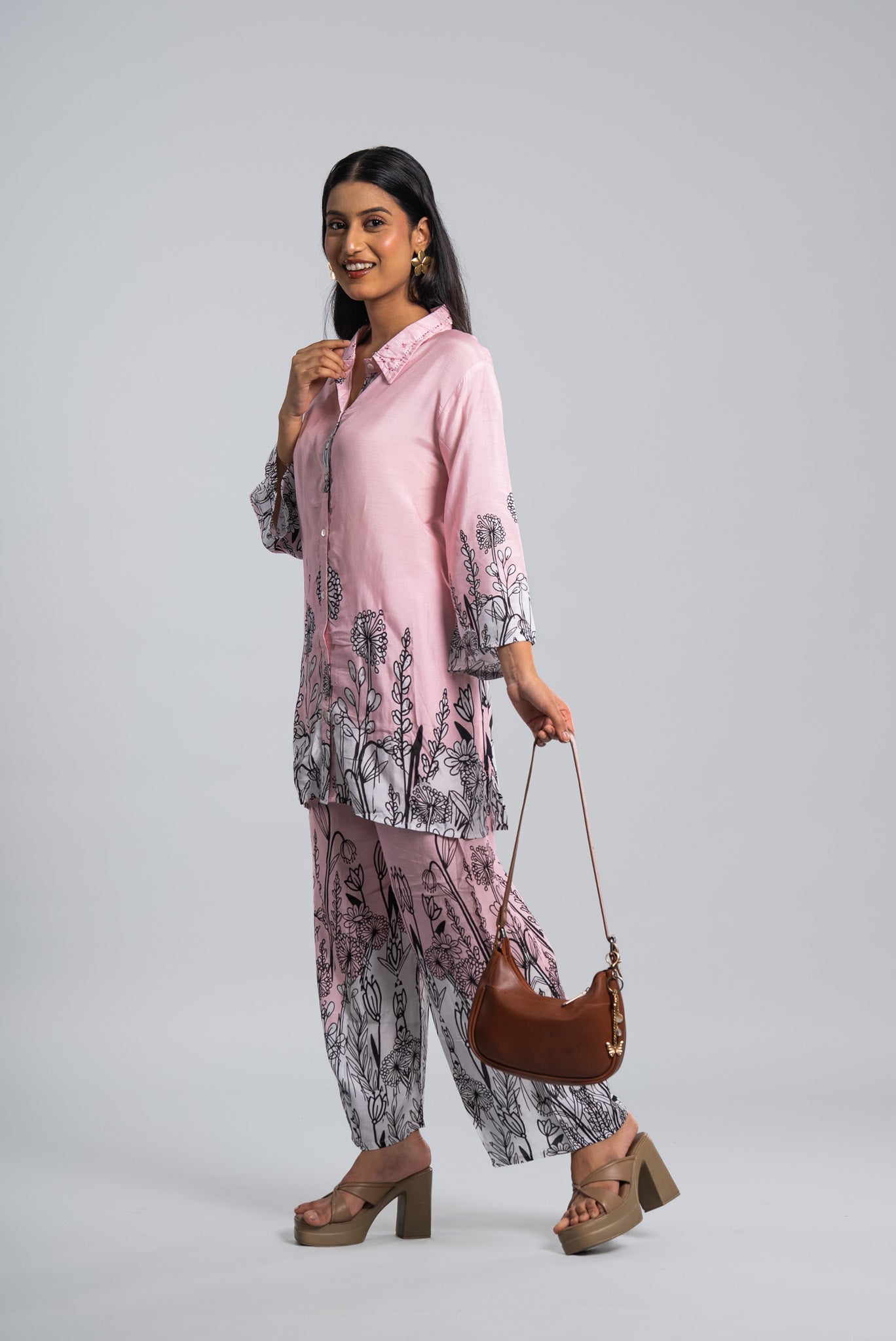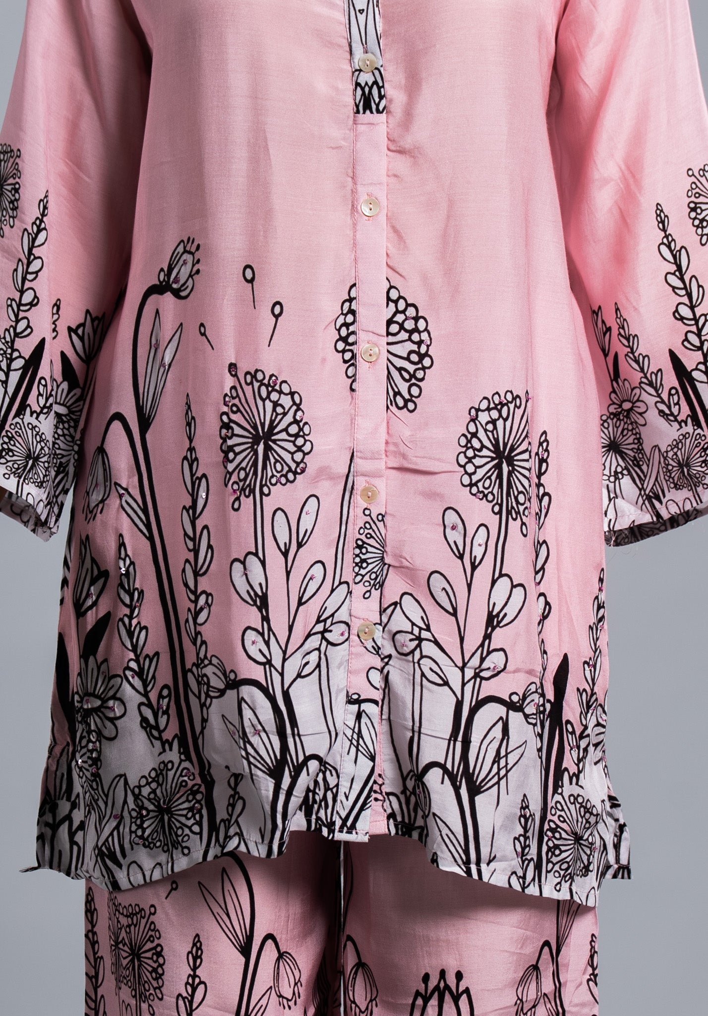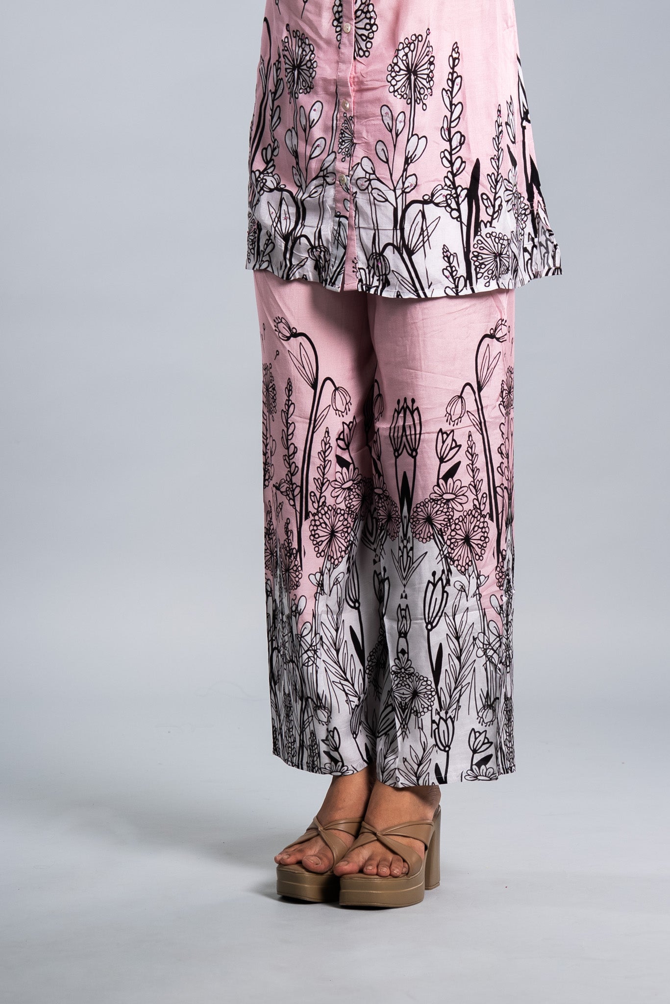 A graceful blush pink co-ord set featuring artistic botanical prints and flowy flared sleeves. The soft silhouette blends comfort and contemporary charm, perfect for daytime elegance.