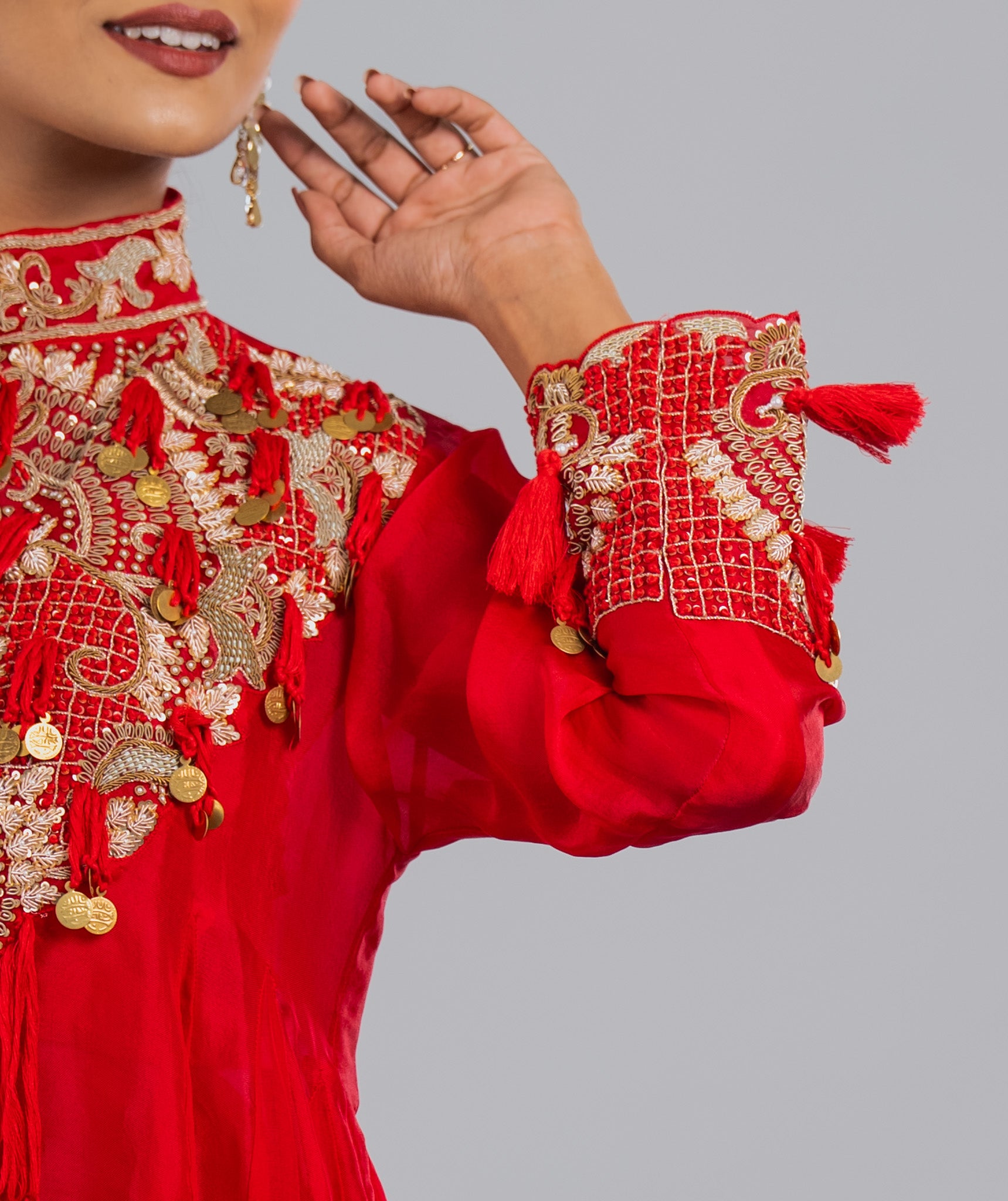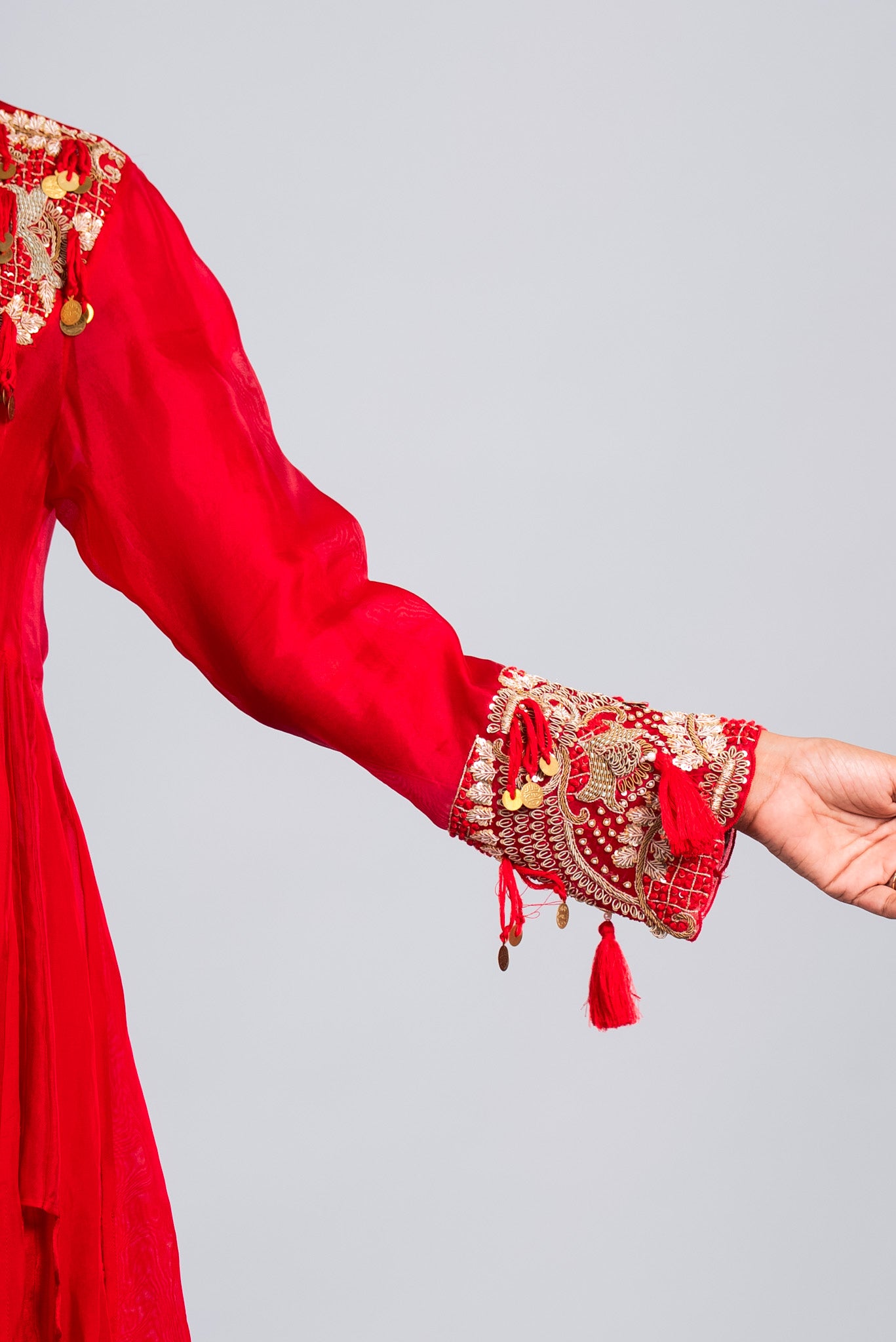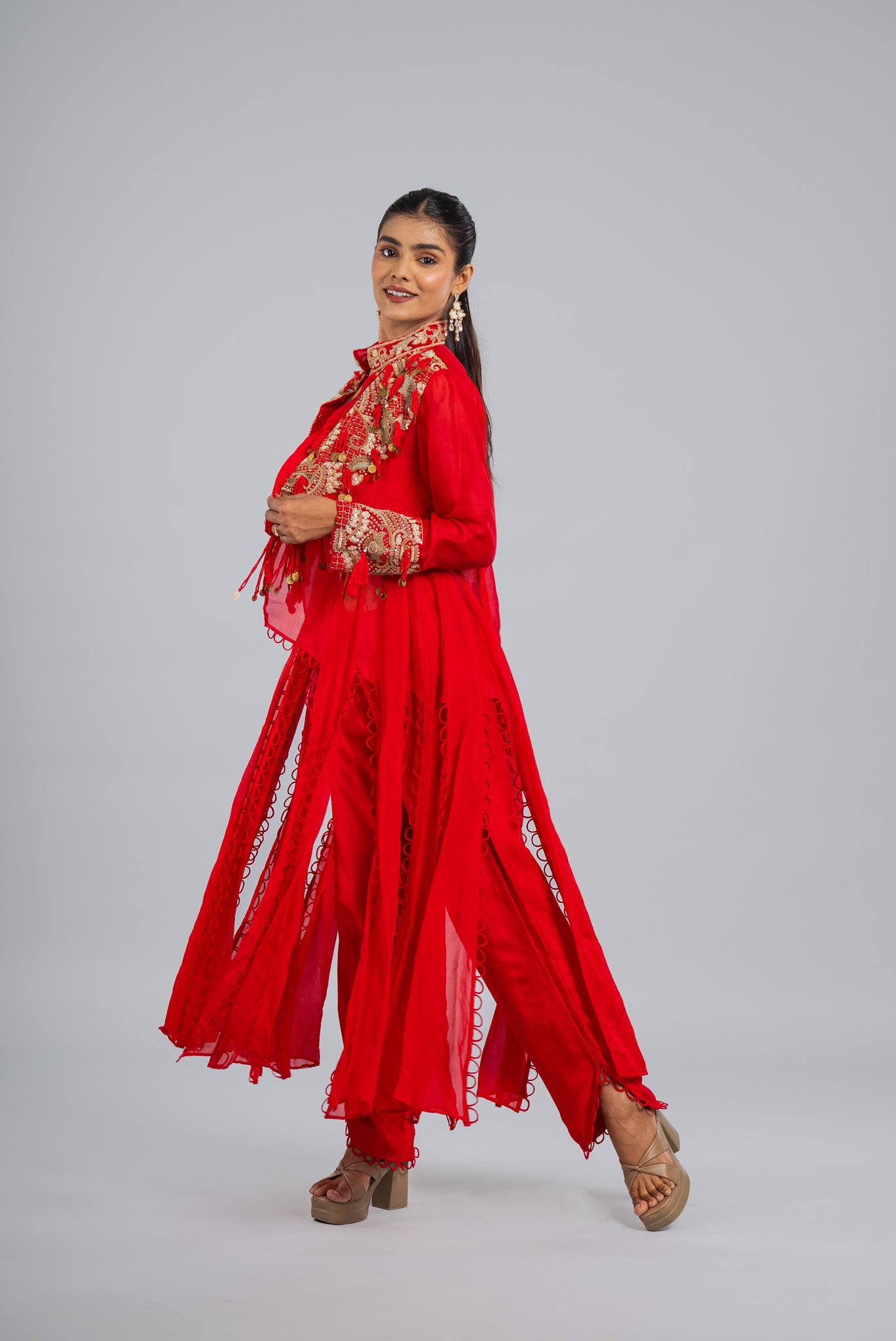 A regal crimson set featuring an intricately embroidered high-neck jacket with heavy work. A luxurious festive choice that blends royal detailing with modern flair.