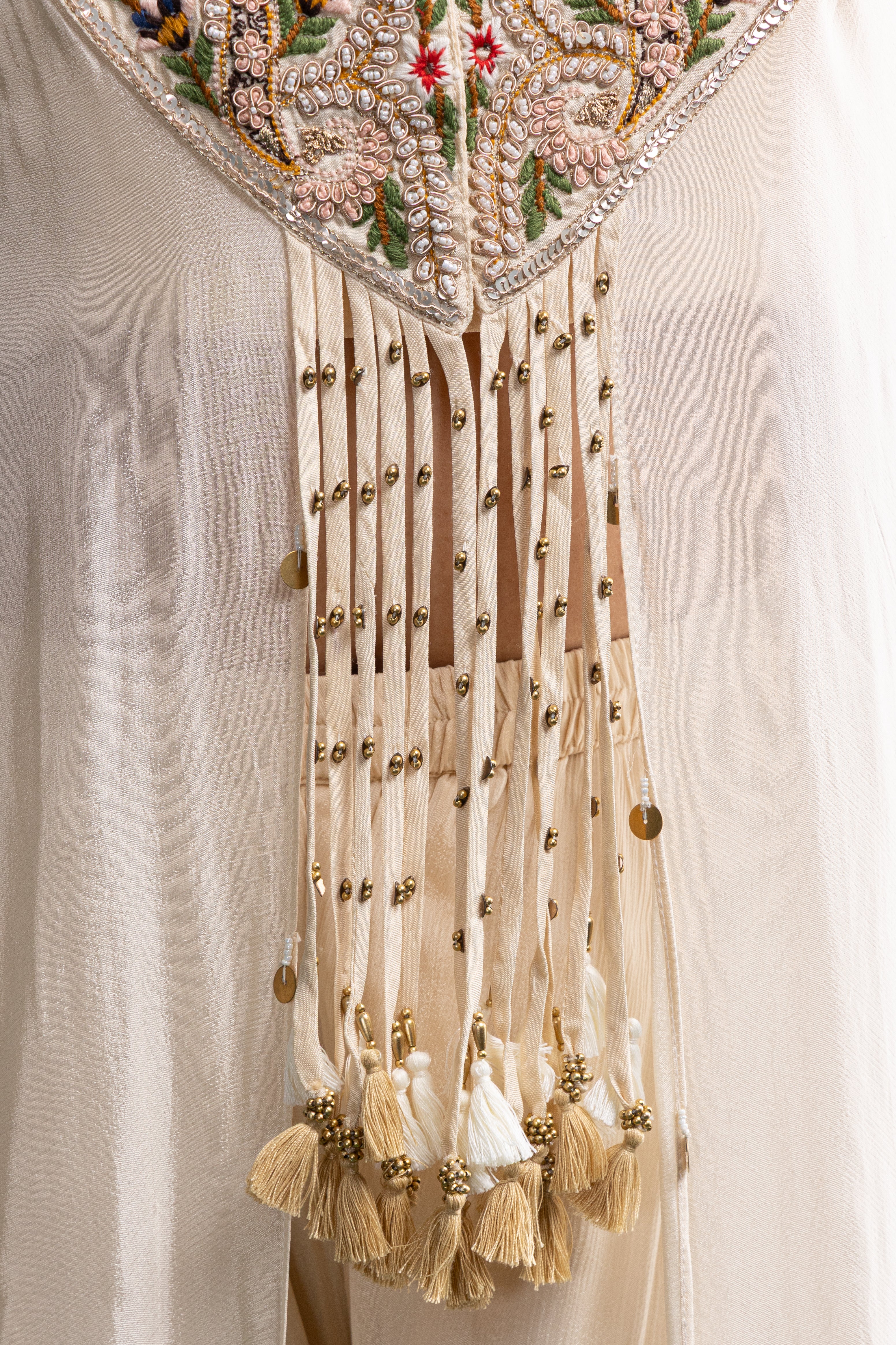 Effortlessly chic, this ivory gold kaftan style cape set features intricate multicolor embroidery, delicate mirror work, and soft flare pants. Ideal for destination weddings and pre-wedding functions.