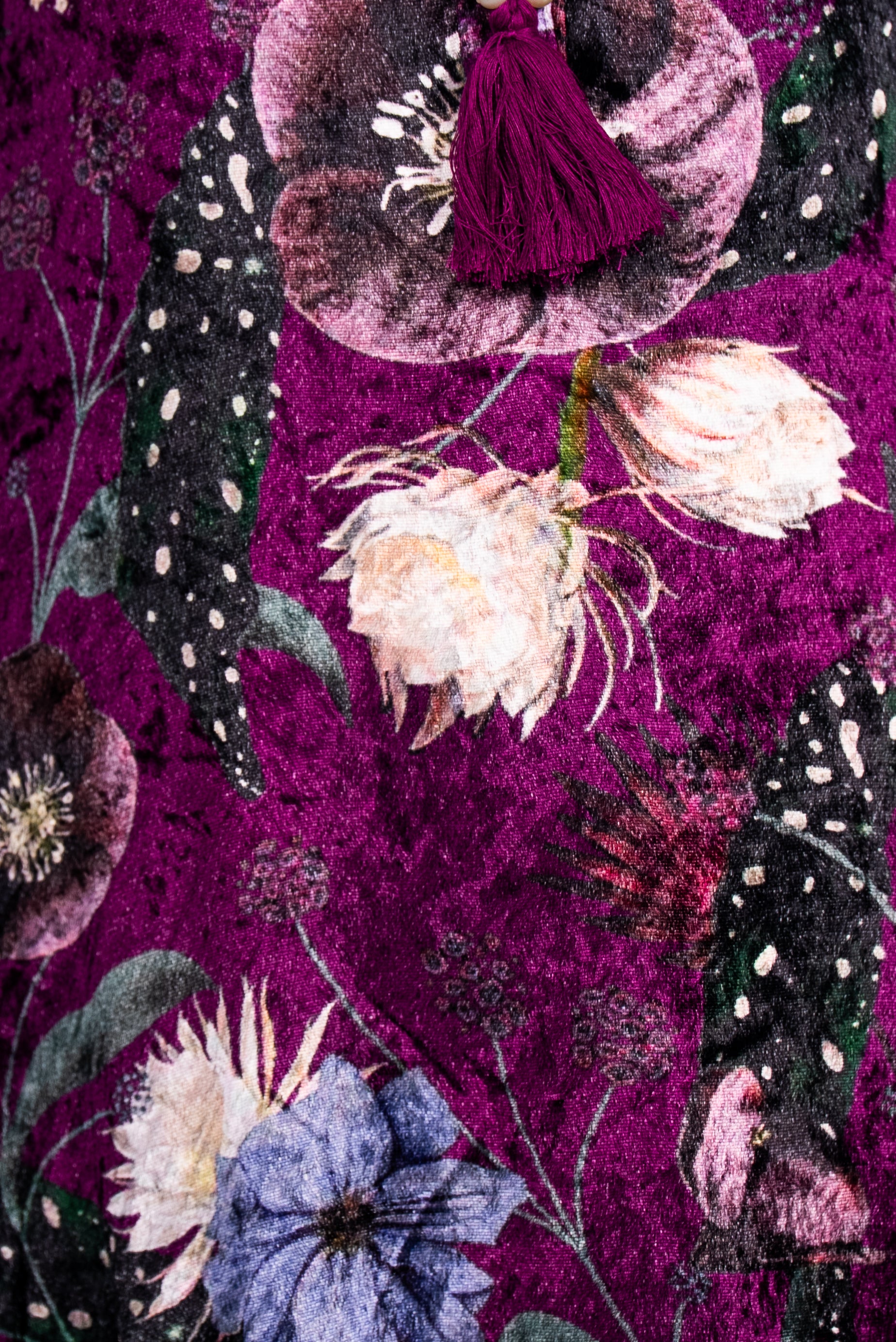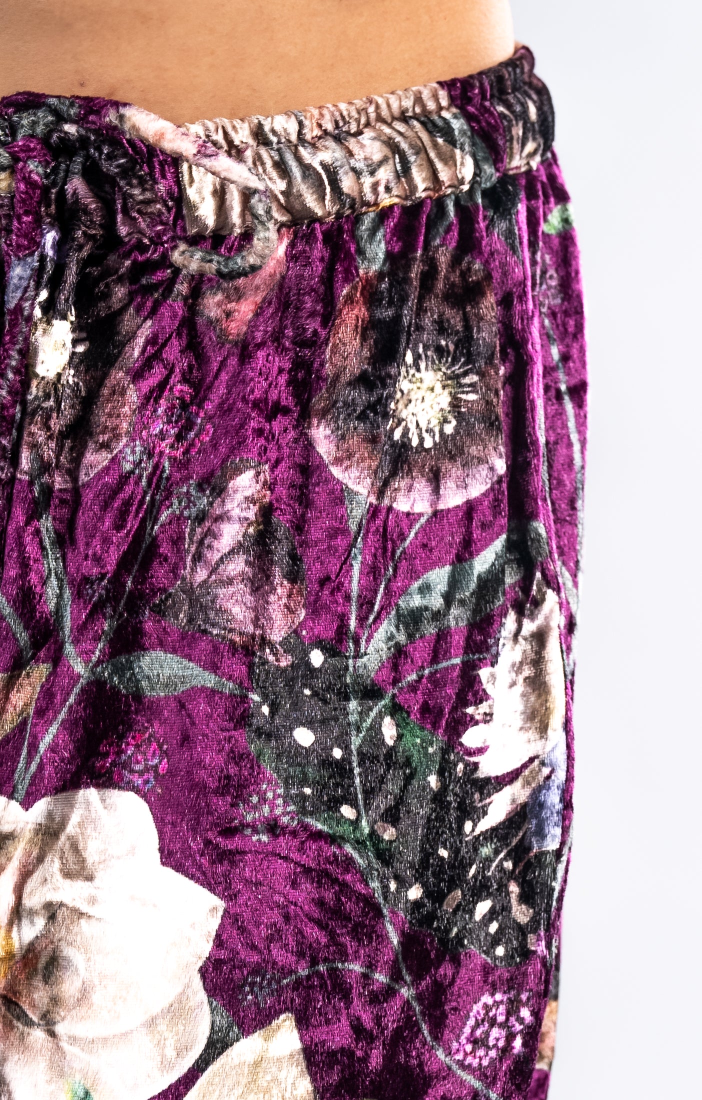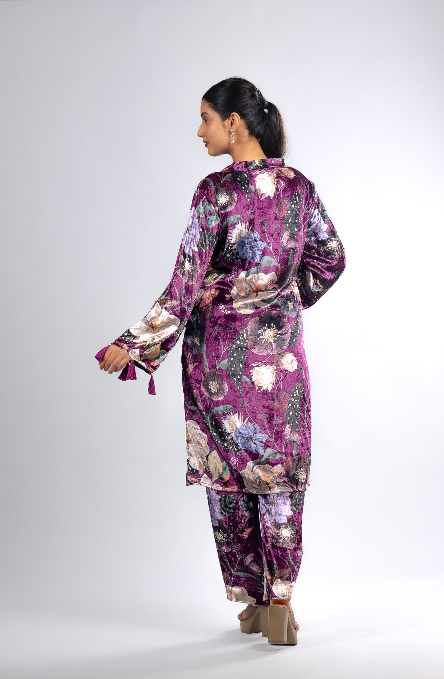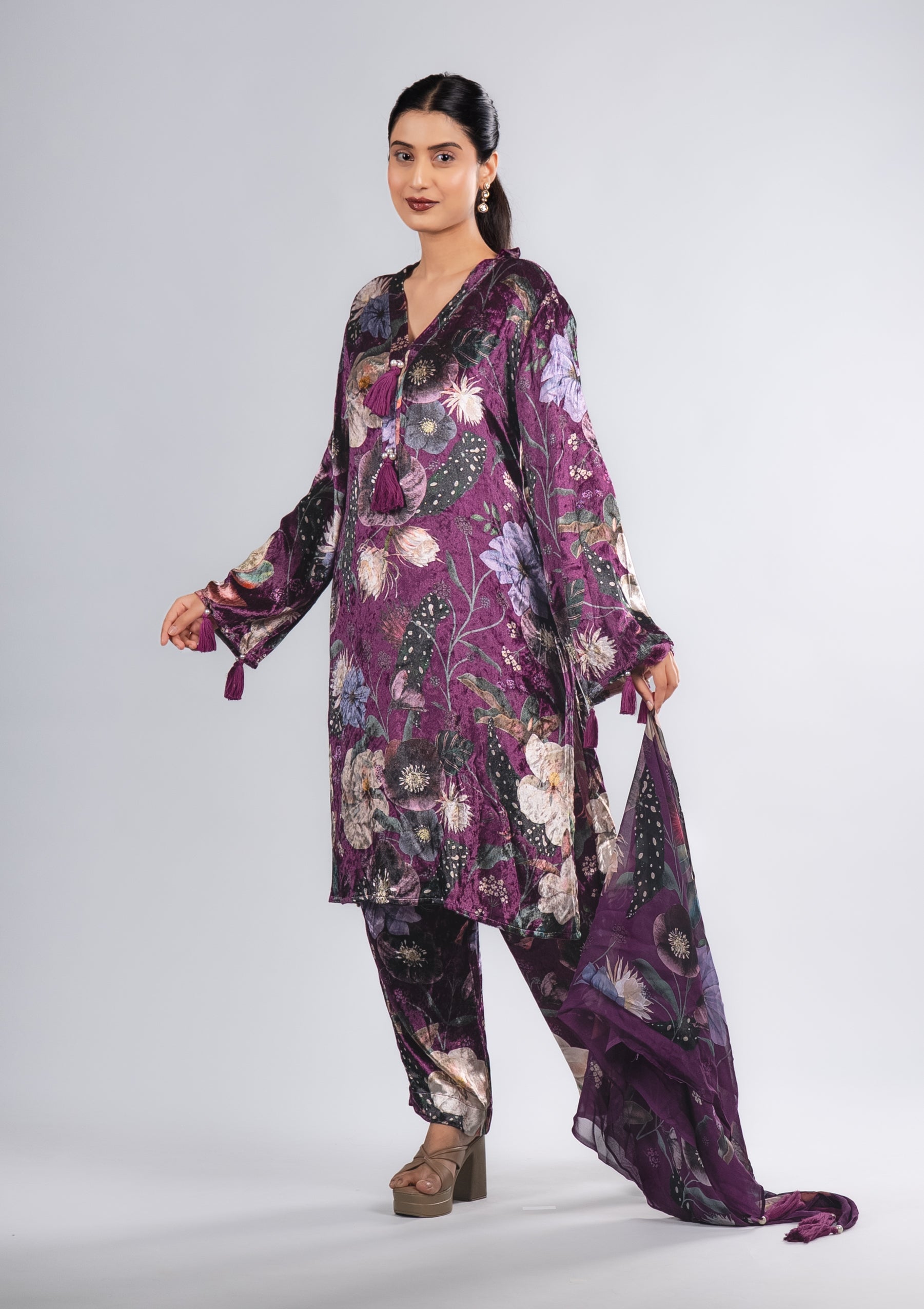 A regal plum velvet suit featuring multicolour floral prints, matched with straight pants and a flowing Scarf. Perfect for evening gatherings, weddings, and festive celebrations.