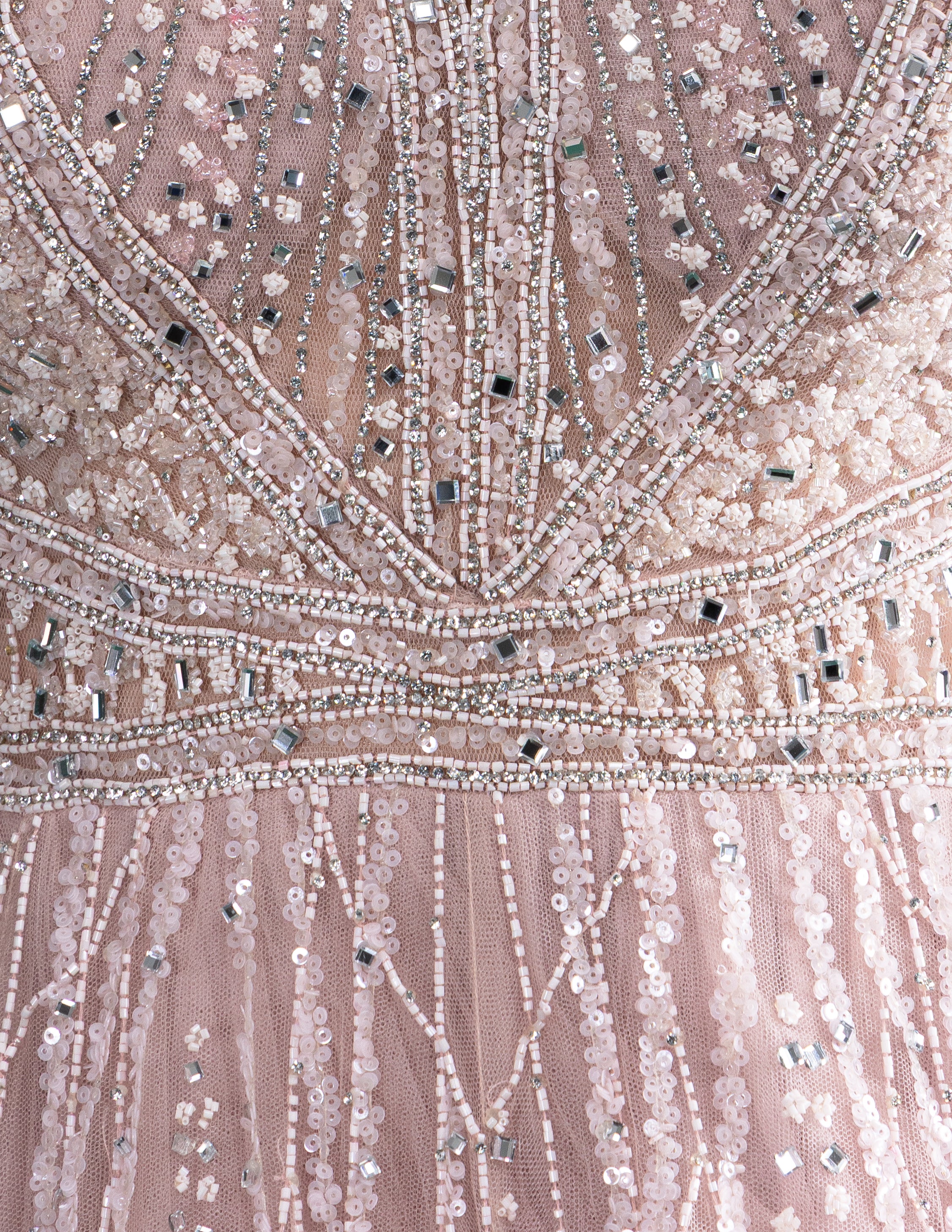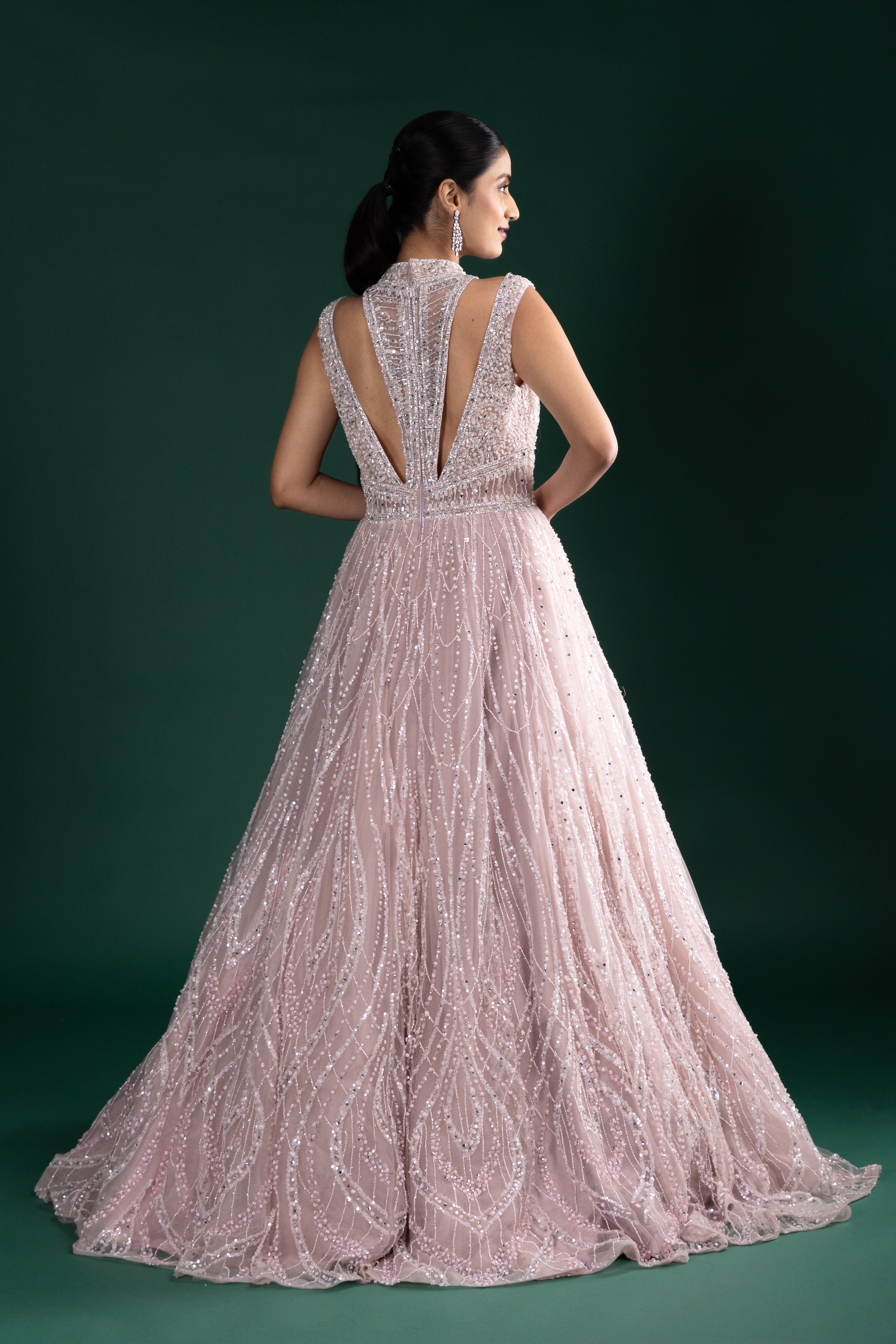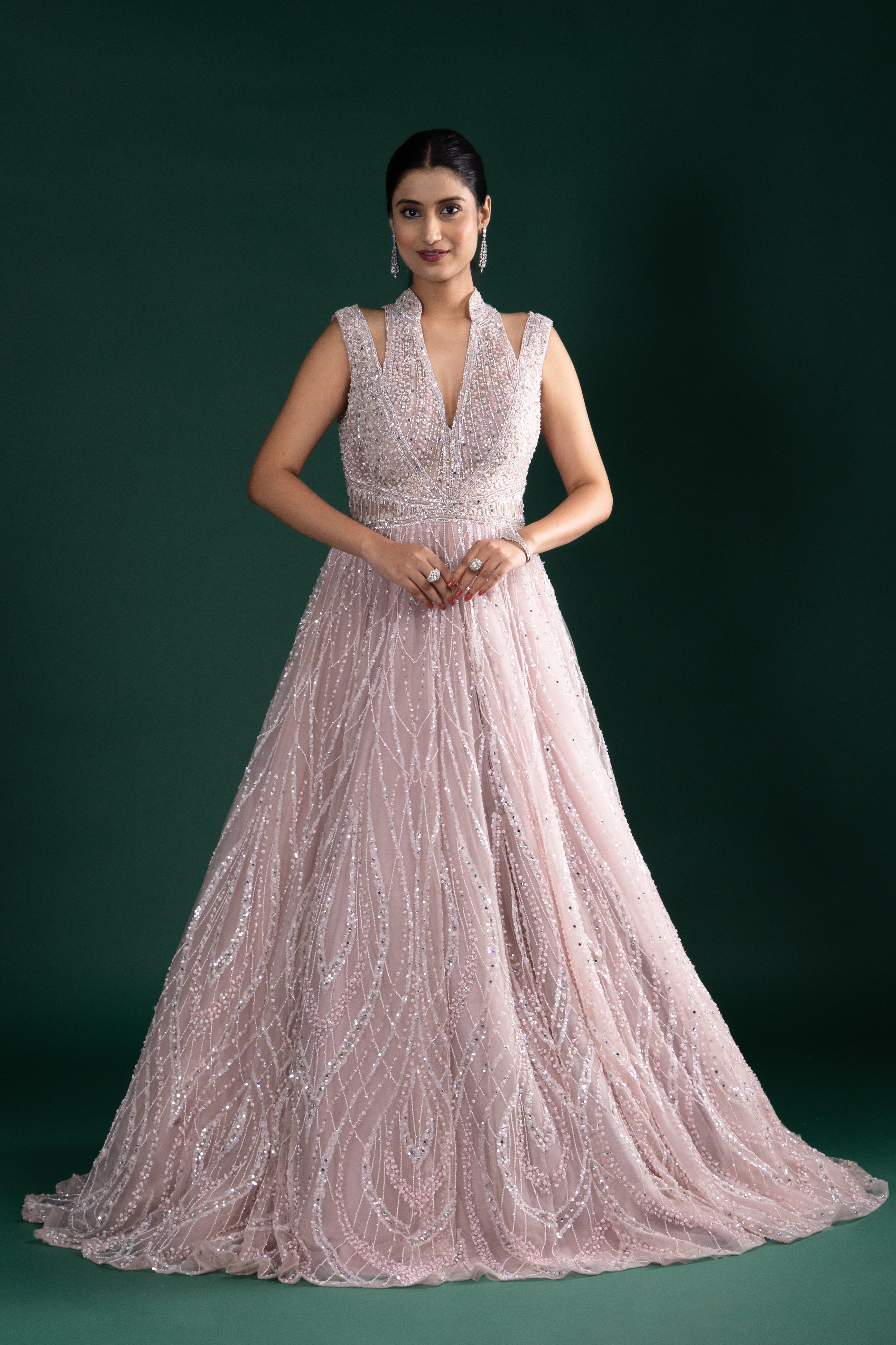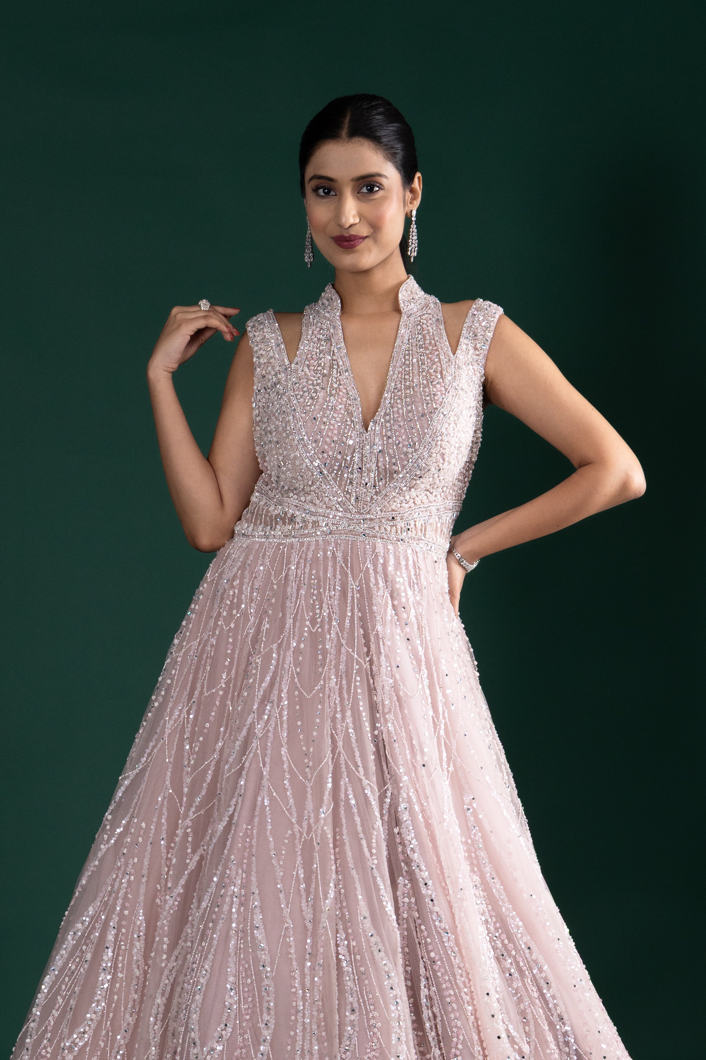 Add romance to your look with this soft blush pink gown, featuring intricate silver sequin embroidery, a flattering V neckline, and a wide flared hem for graceful movement.