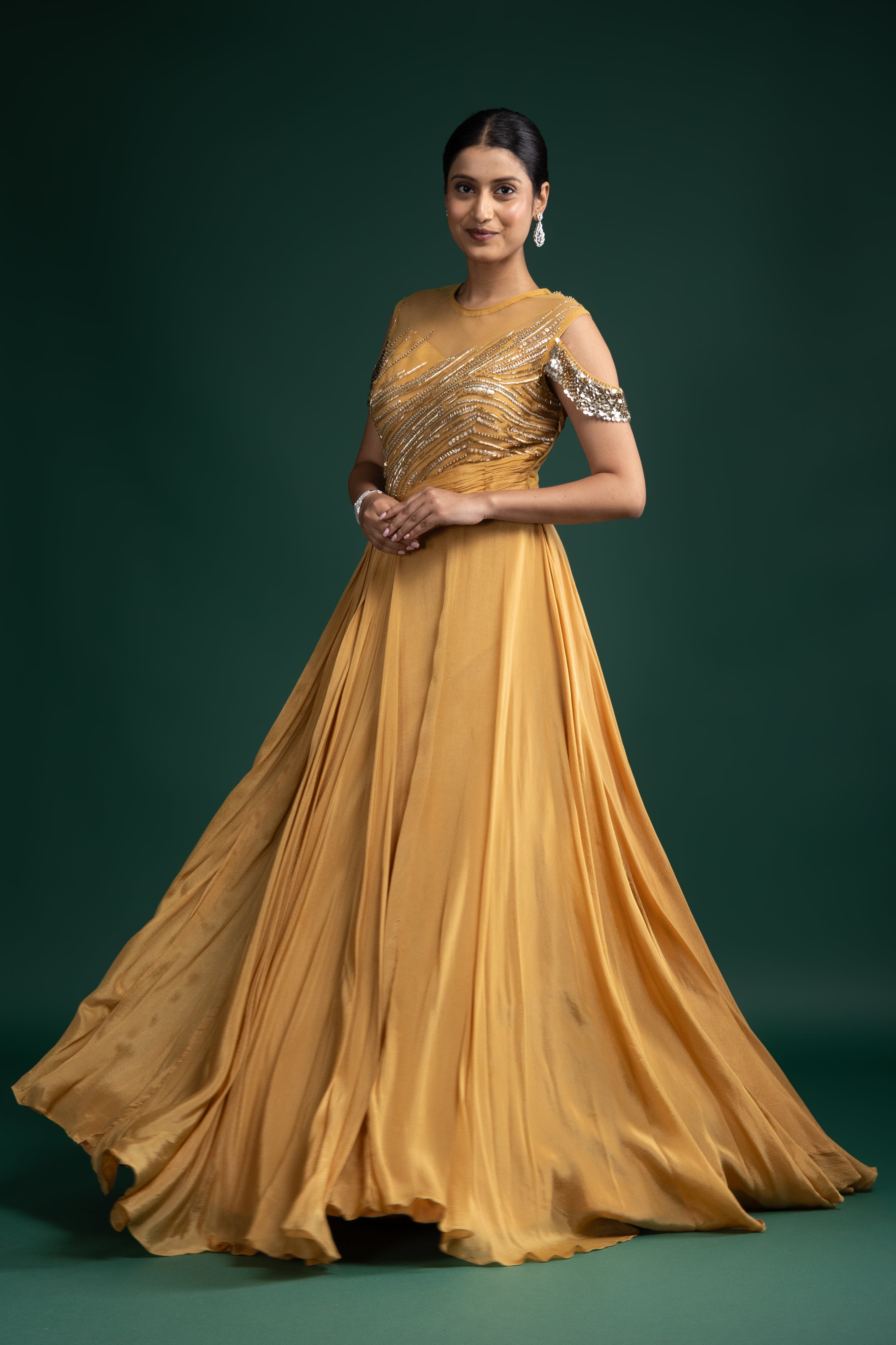 Glow in Royal Mustard Gold with this striking gown featuring shoulder cut-outs, silver sequin highlights, and a floor-grazing, flowy hemline. Ideal for glam evening events.