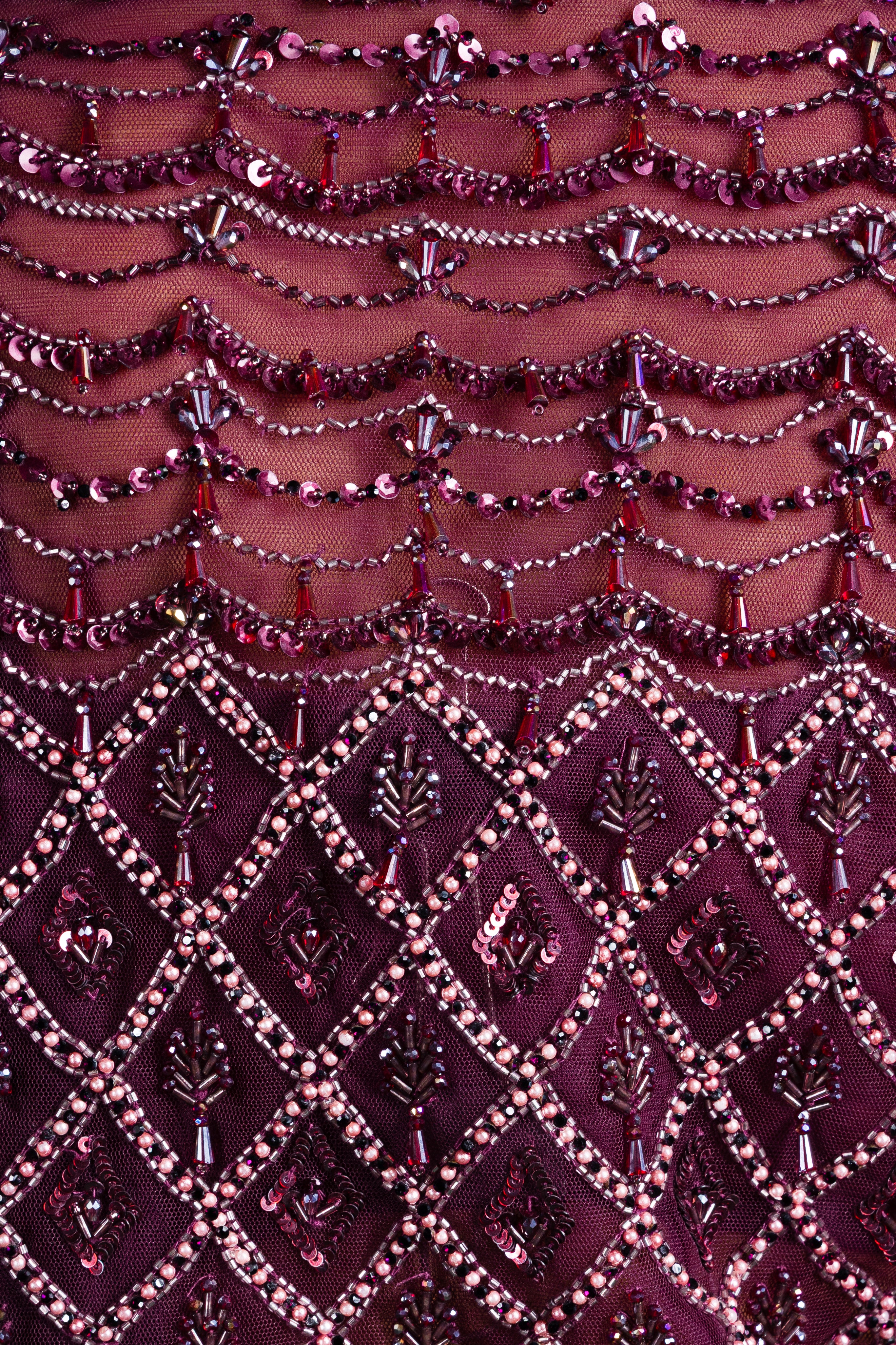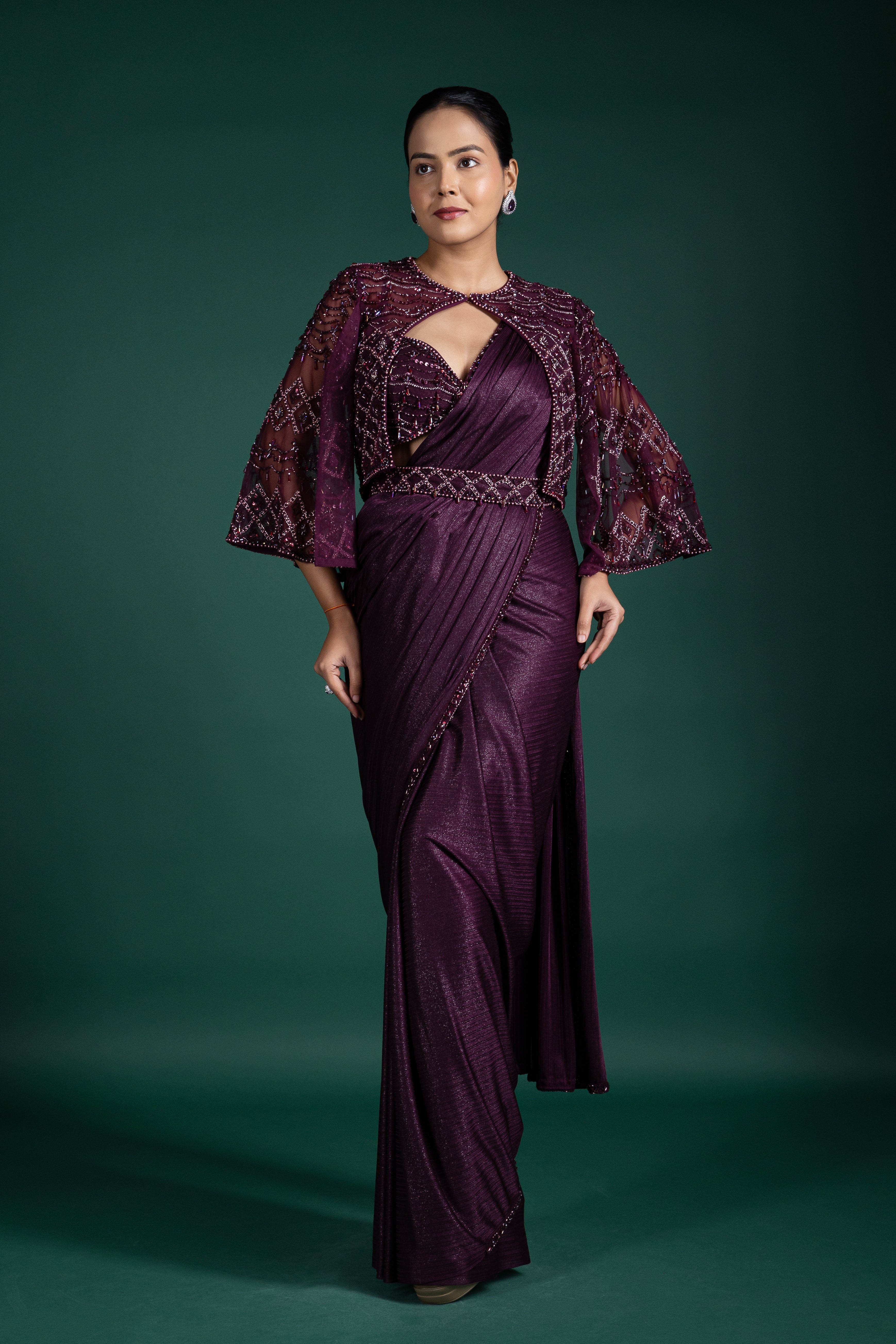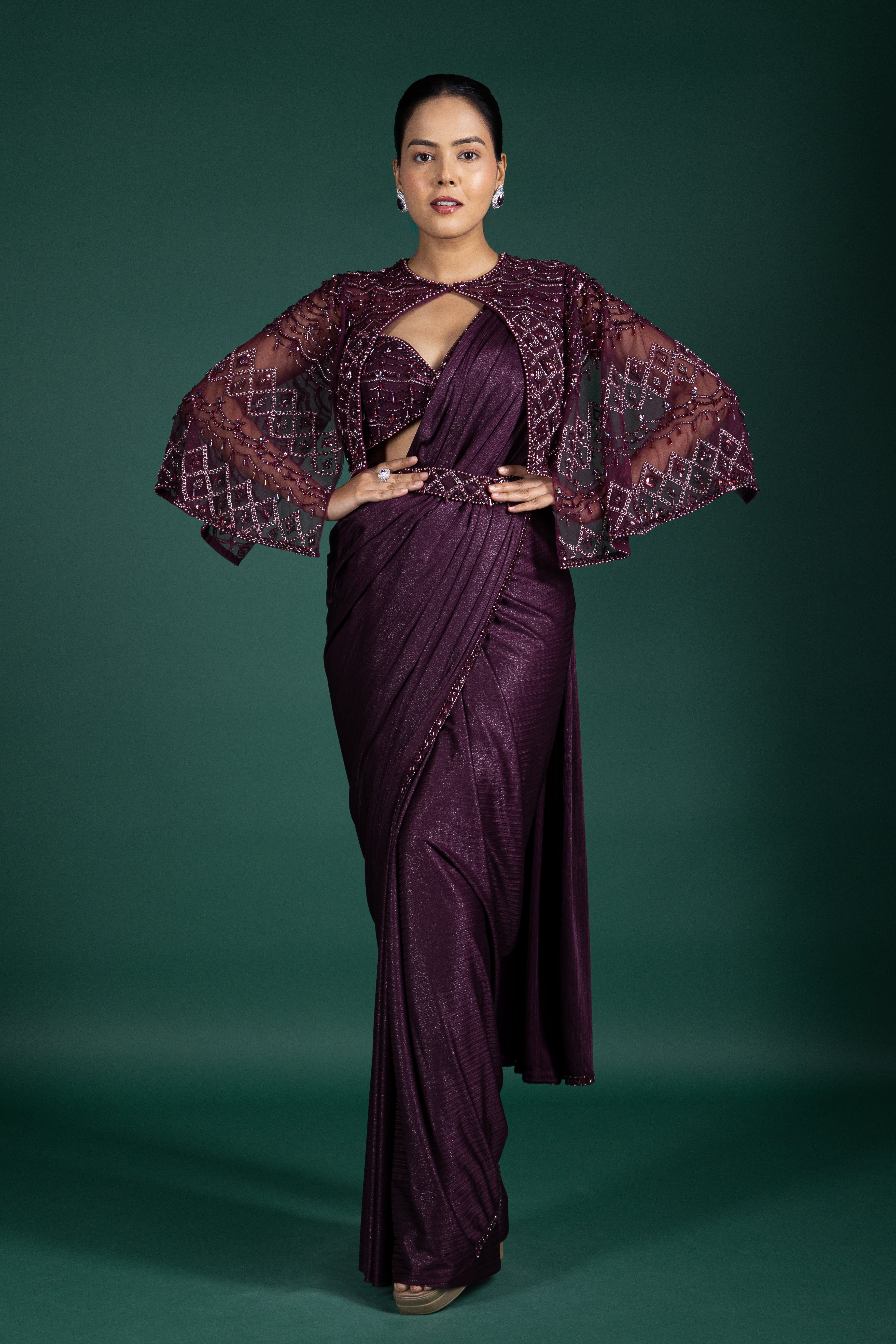 Elevate your evening style with this wine maroon draped saree, paired with a heavily sequined cape, ideal for reception glam.