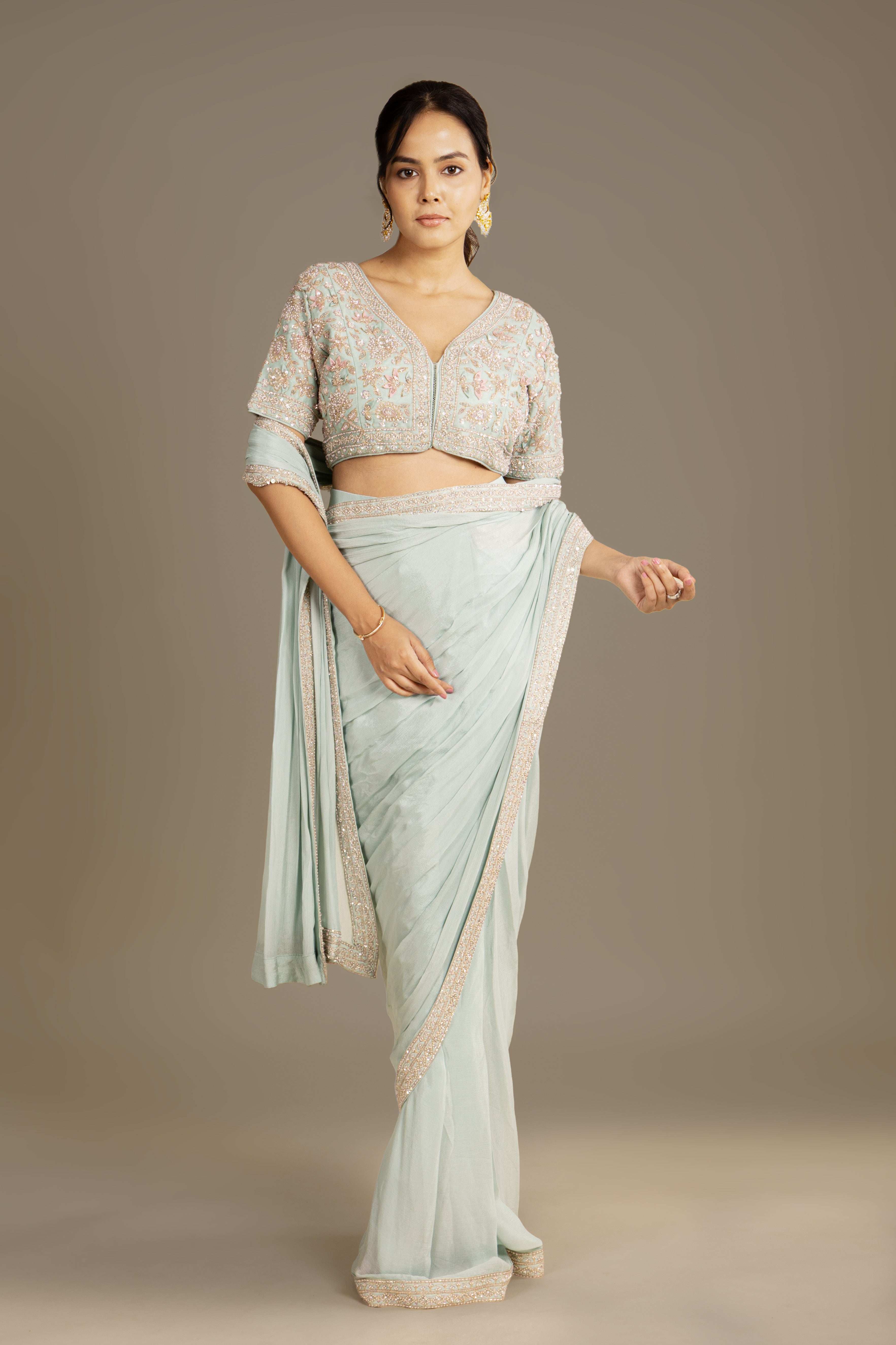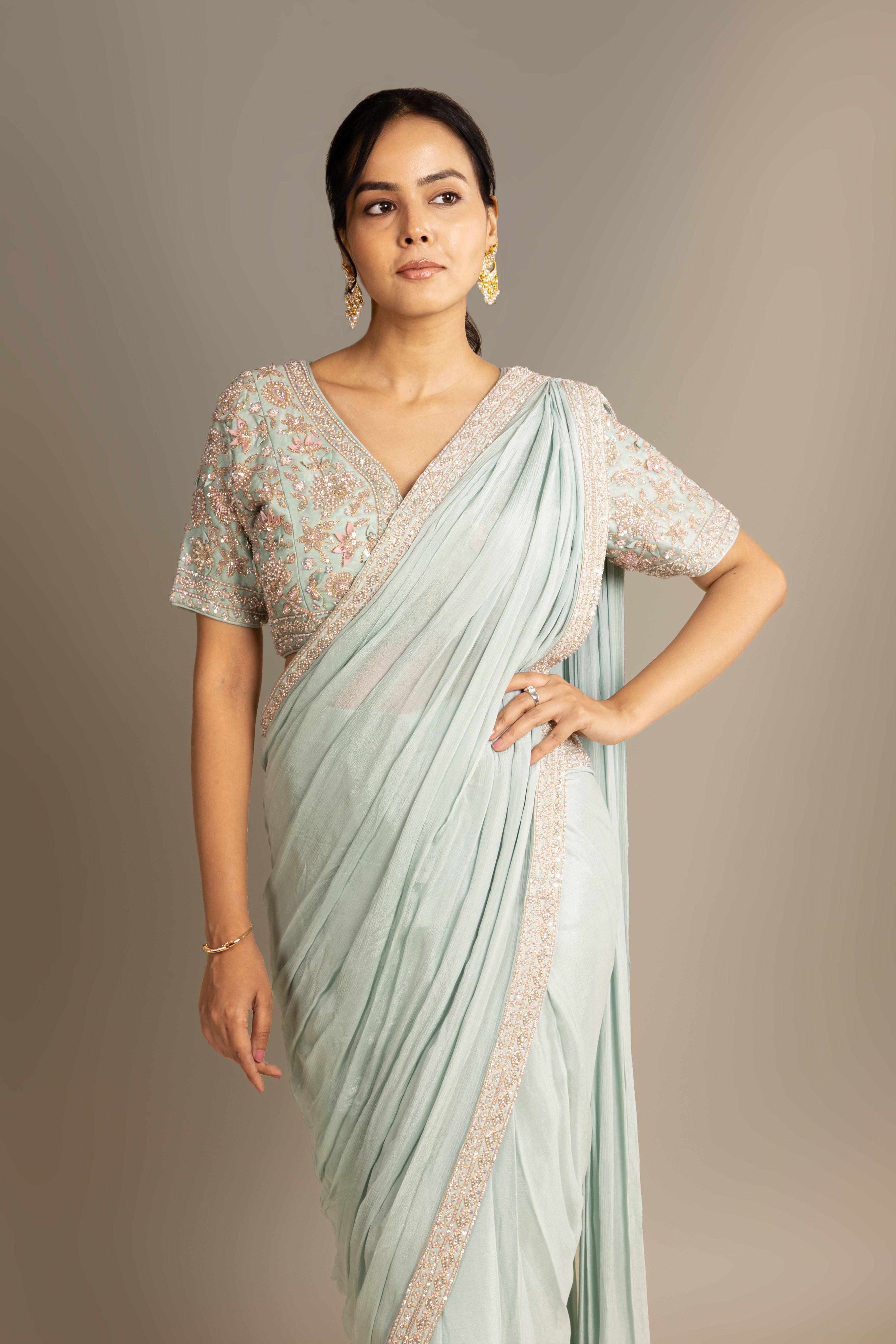 Refreshing and elegant, this seafoam mint saree with delicate floral embroidery is a timeless pick for daytime weddings and elegant garden parties.