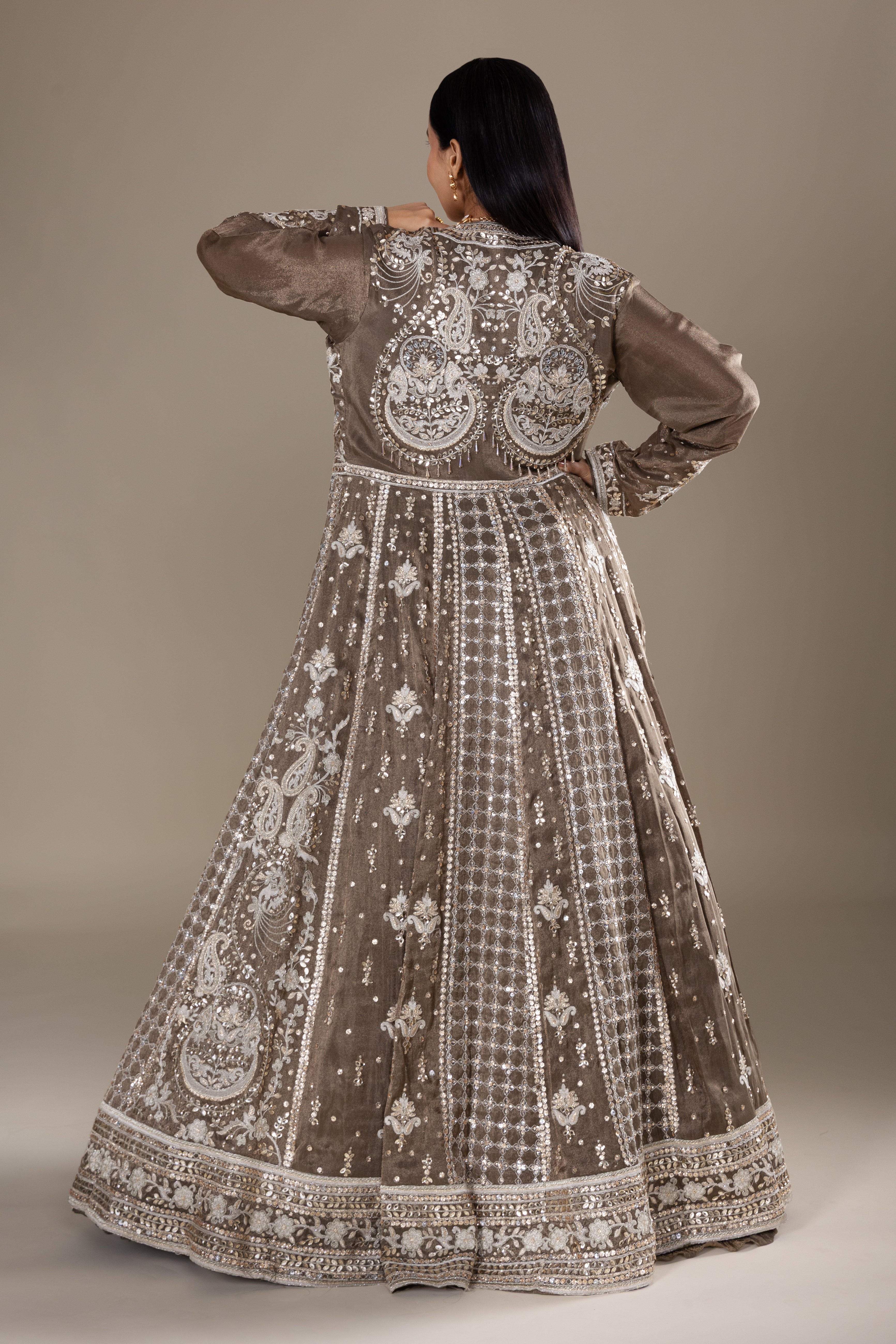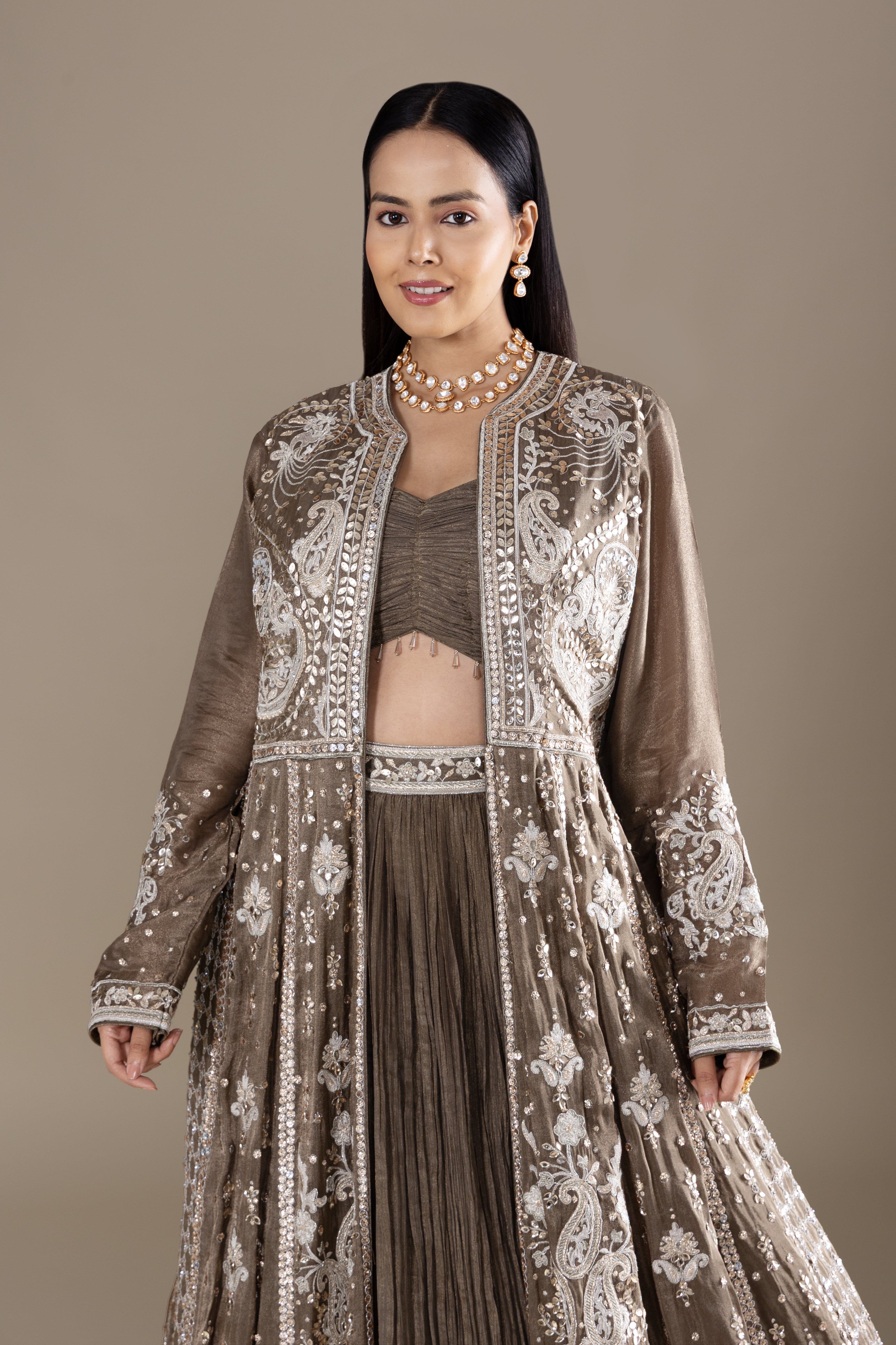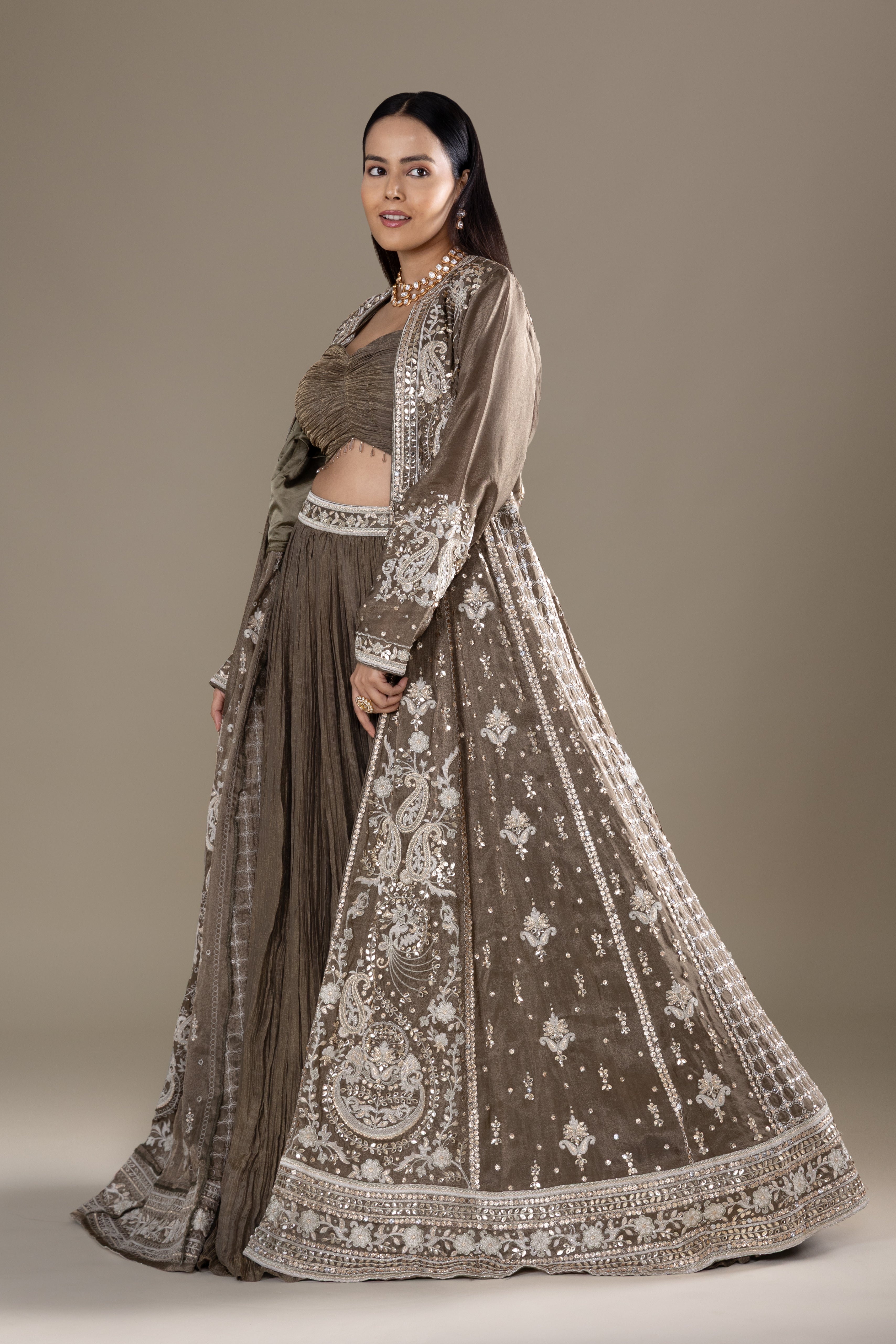 Elevate your evening look with this smokey taupe lehenga, exquisitely detailed with silver thread embroidery and a dramatic long jacket for effortless layering and contemporary flair.