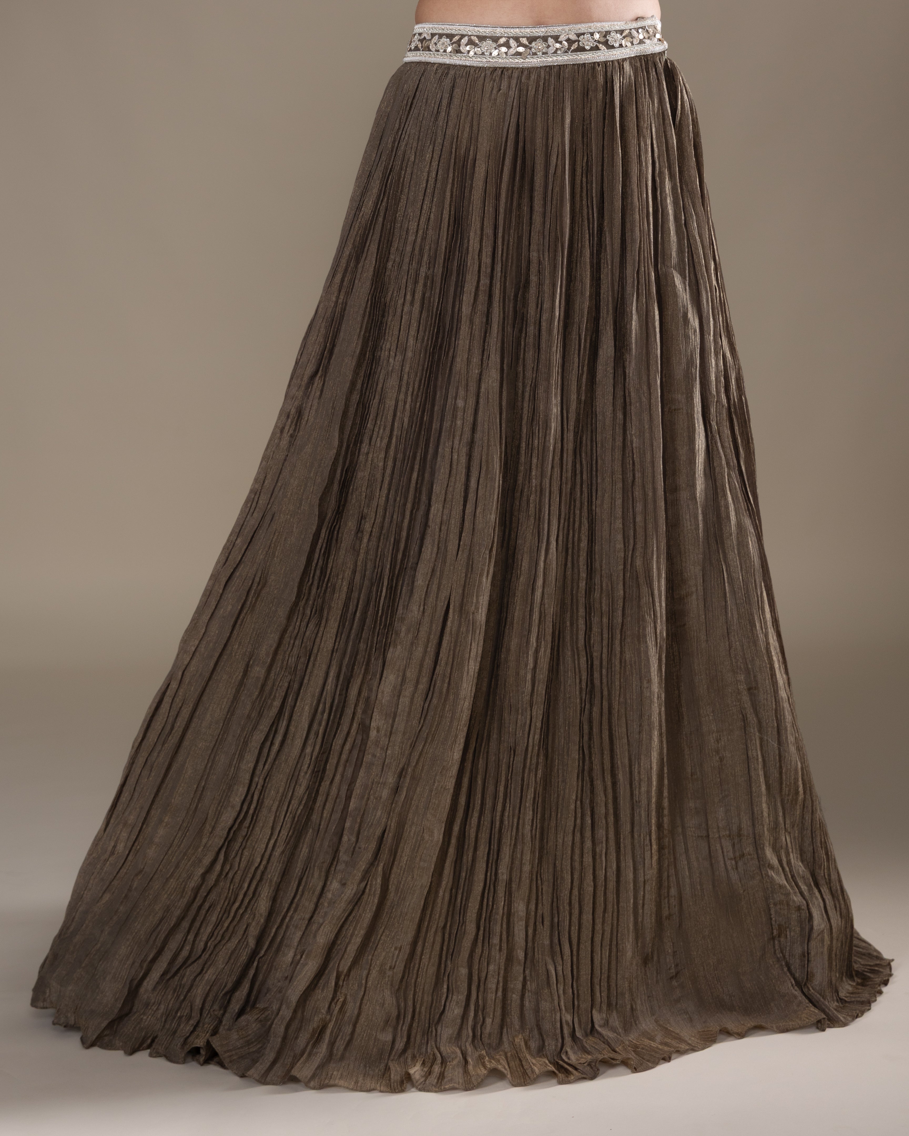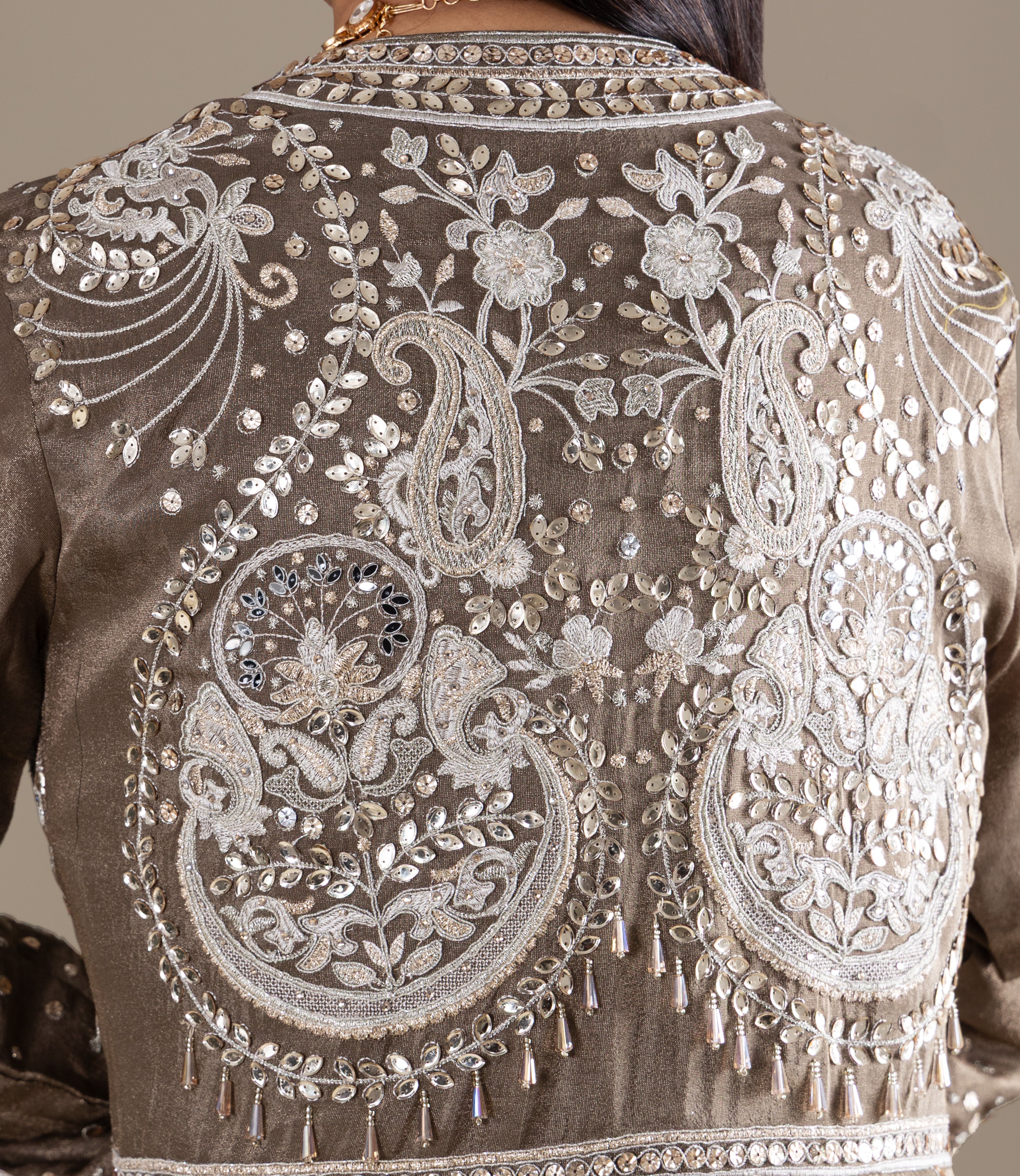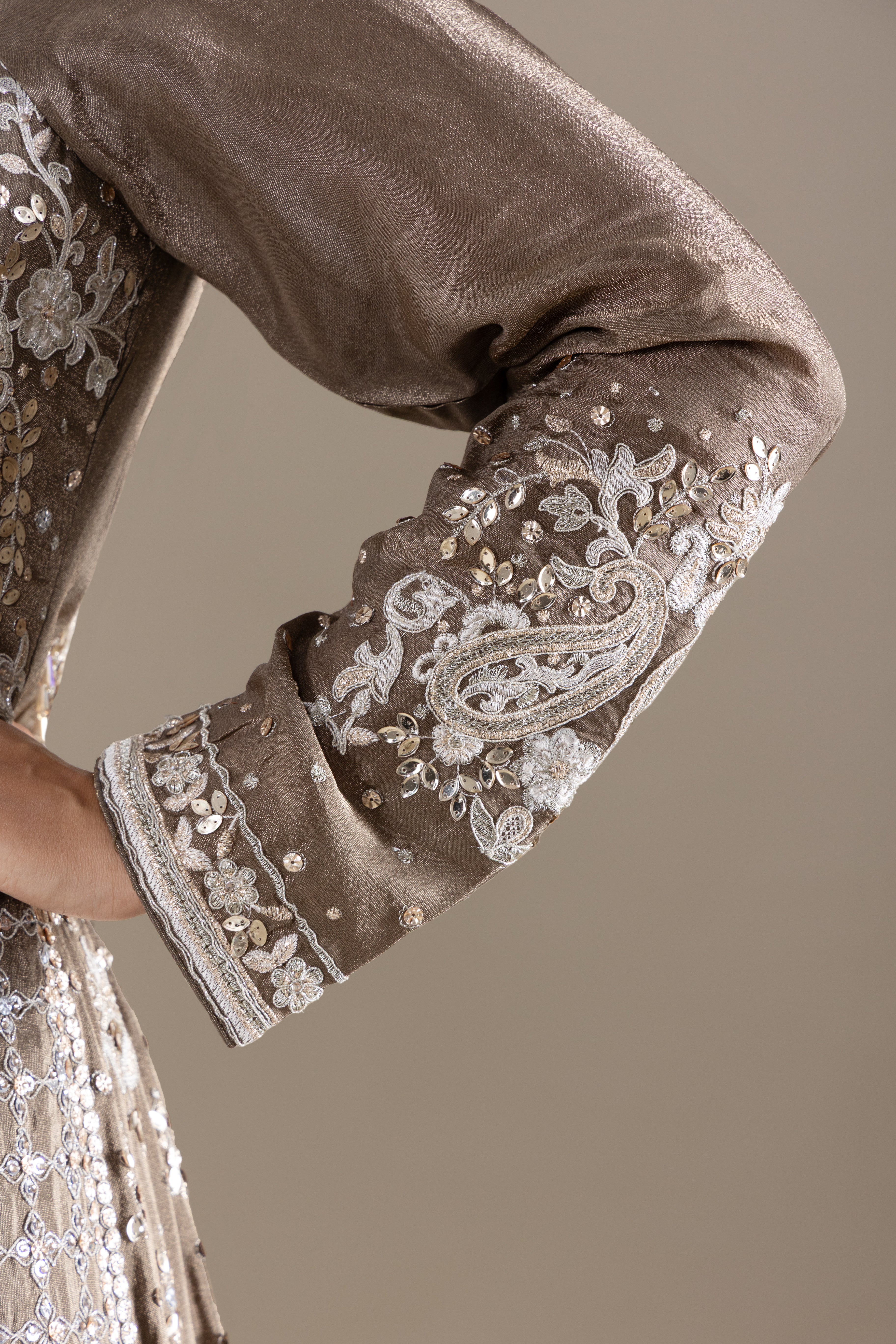 Elevate your evening look with this smokey taupe lehenga, exquisitely detailed with silver thread embroidery and a dramatic long jacket for effortless layering and contemporary flair.