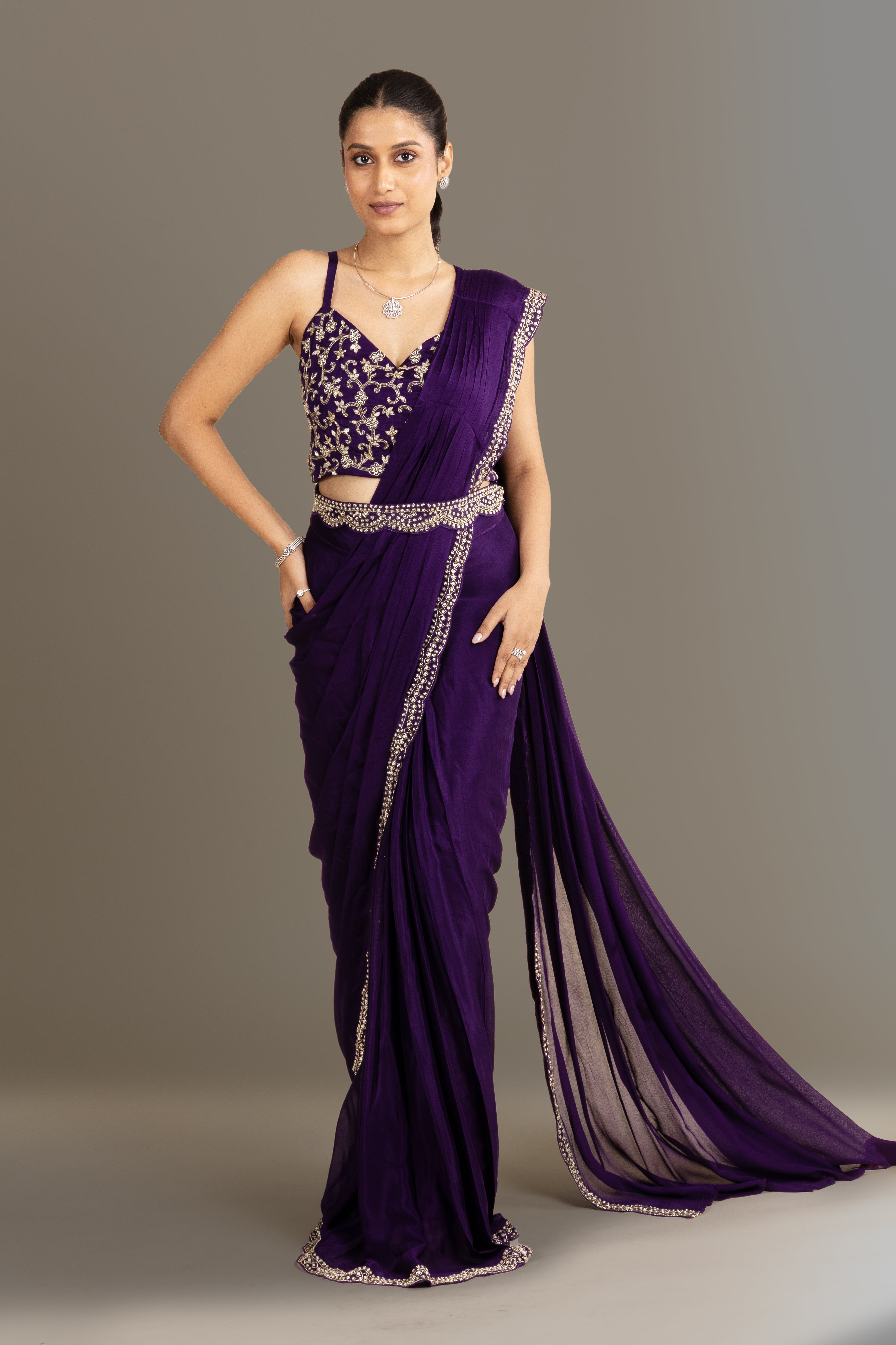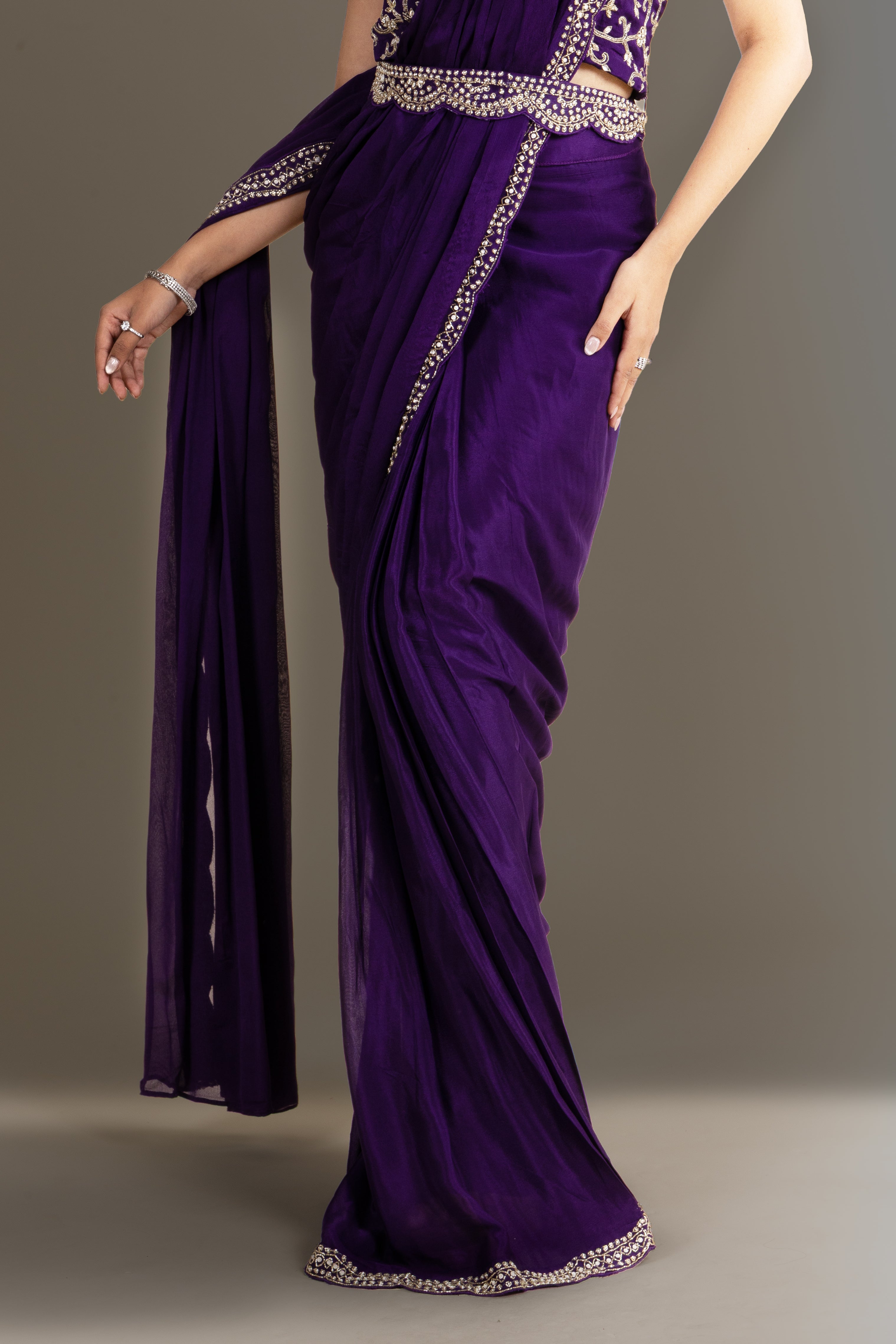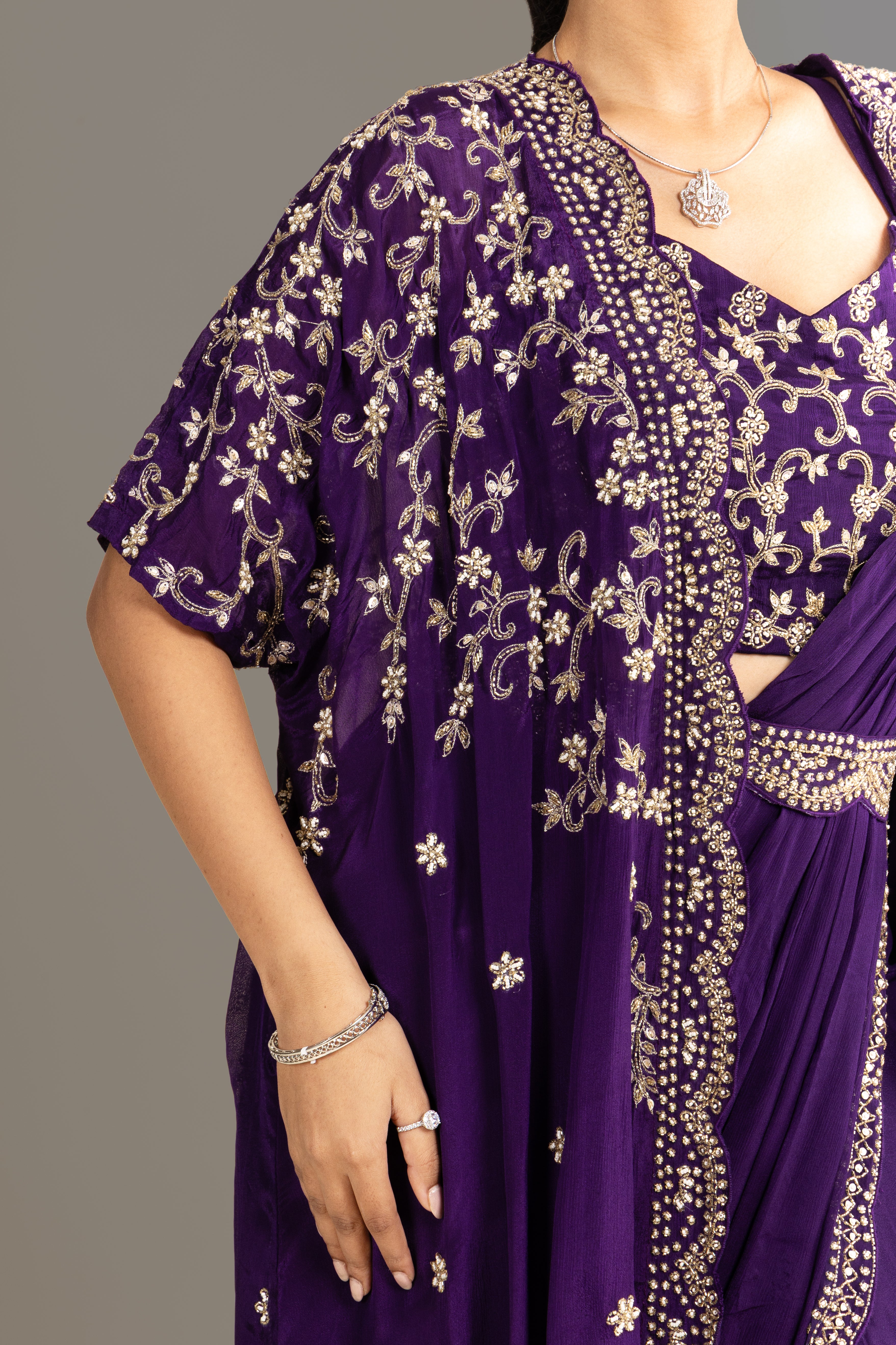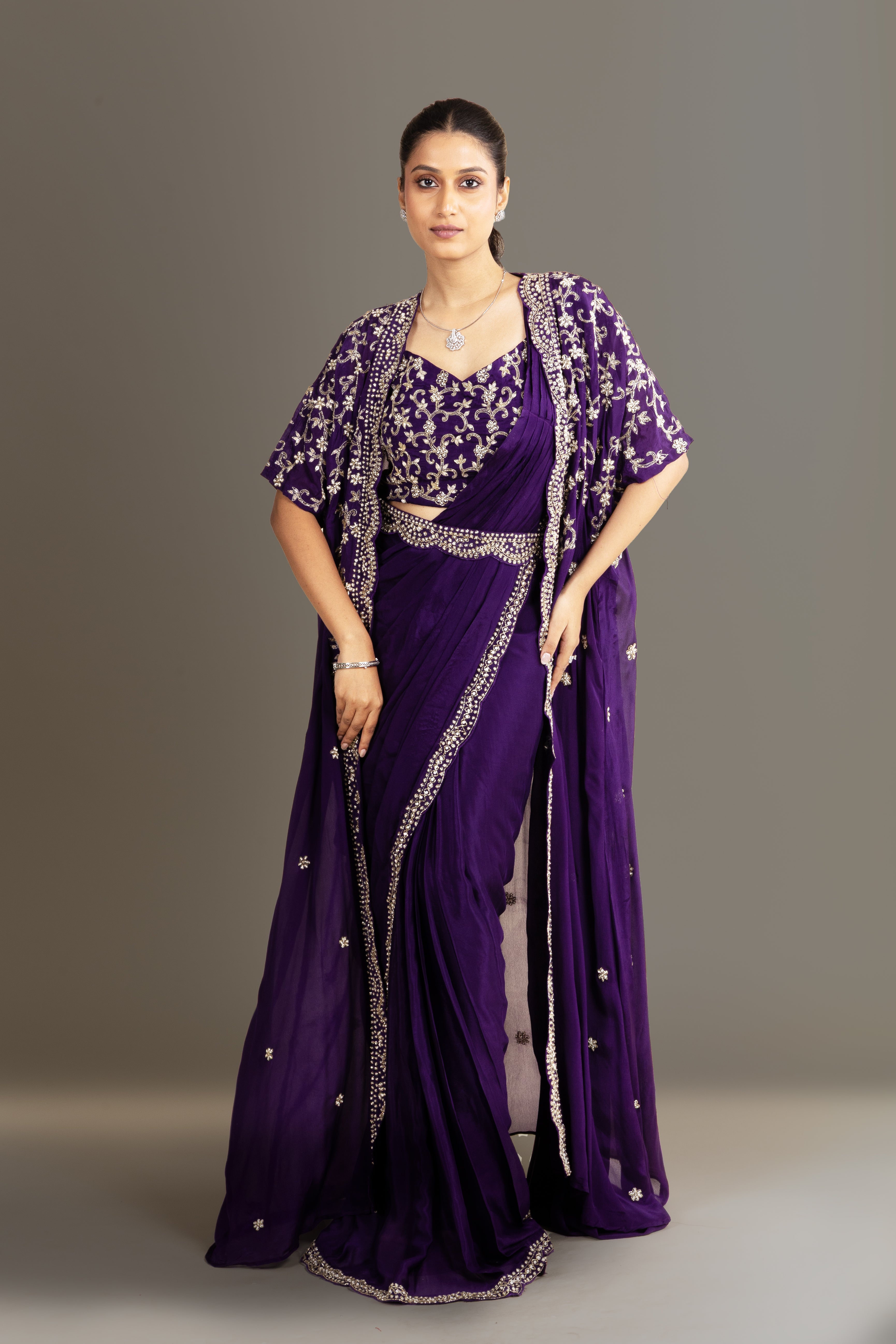 Immerse in regal charm with this deep Violet drape saree, beautifully layered with a hand-embroidered cape and ornate scalloped detailing, designed for sophisticated and elegant festive wear.