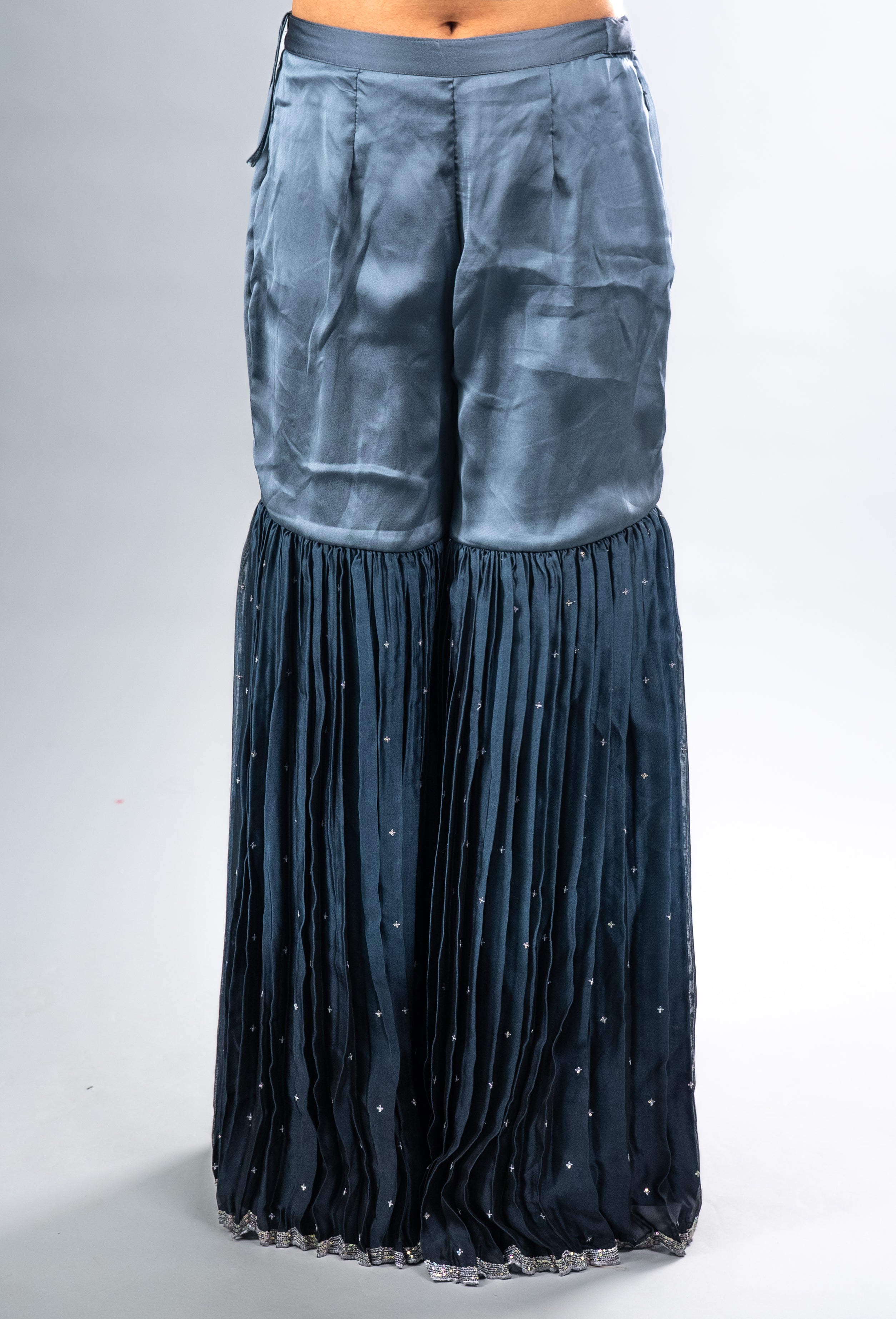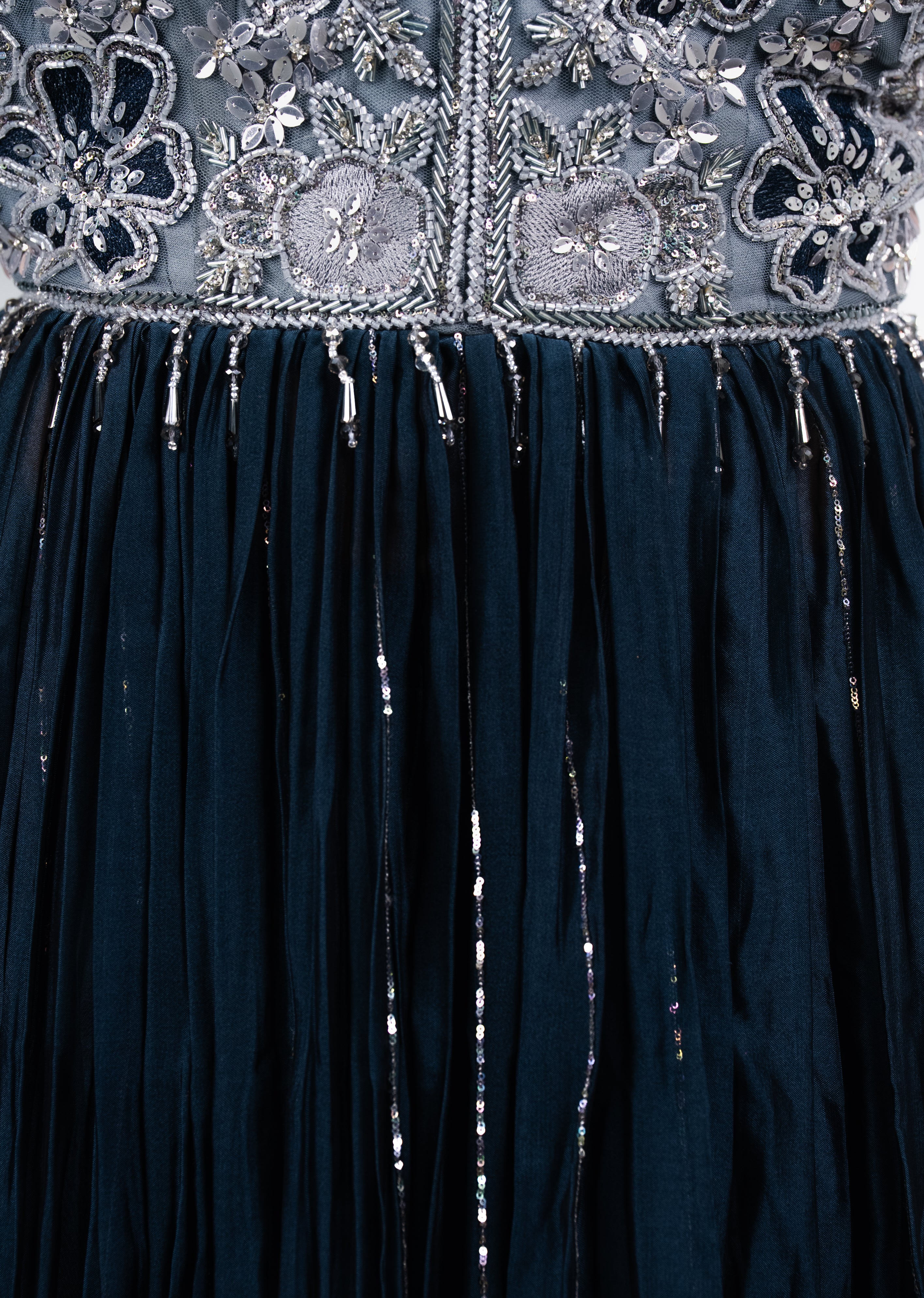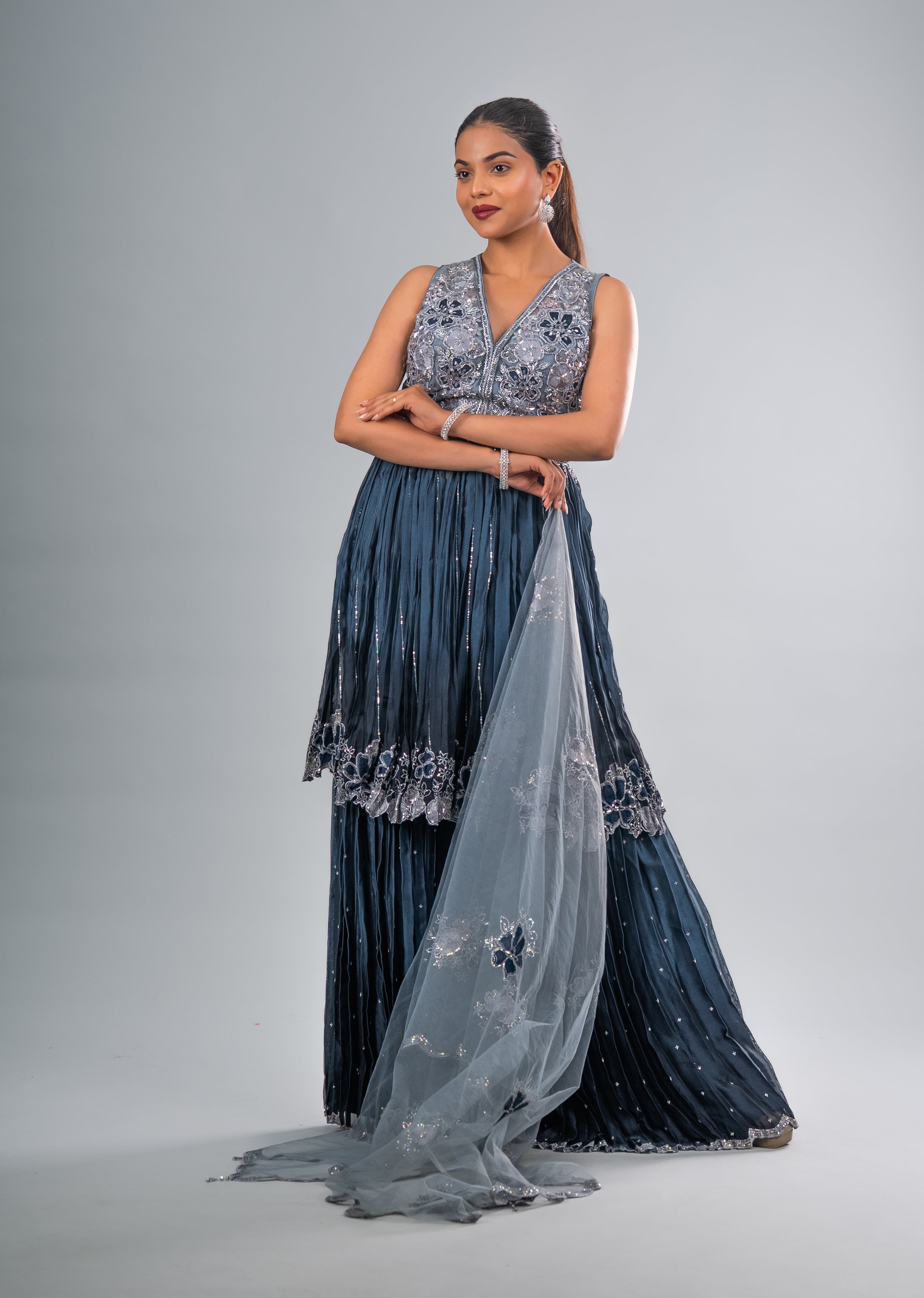 A luxurious navy blue garara set highlighted with intricate silver embroidery and sequins, designed for elegance and grandeur—perfect for weddings, festive evenings, and glamorous receptions.