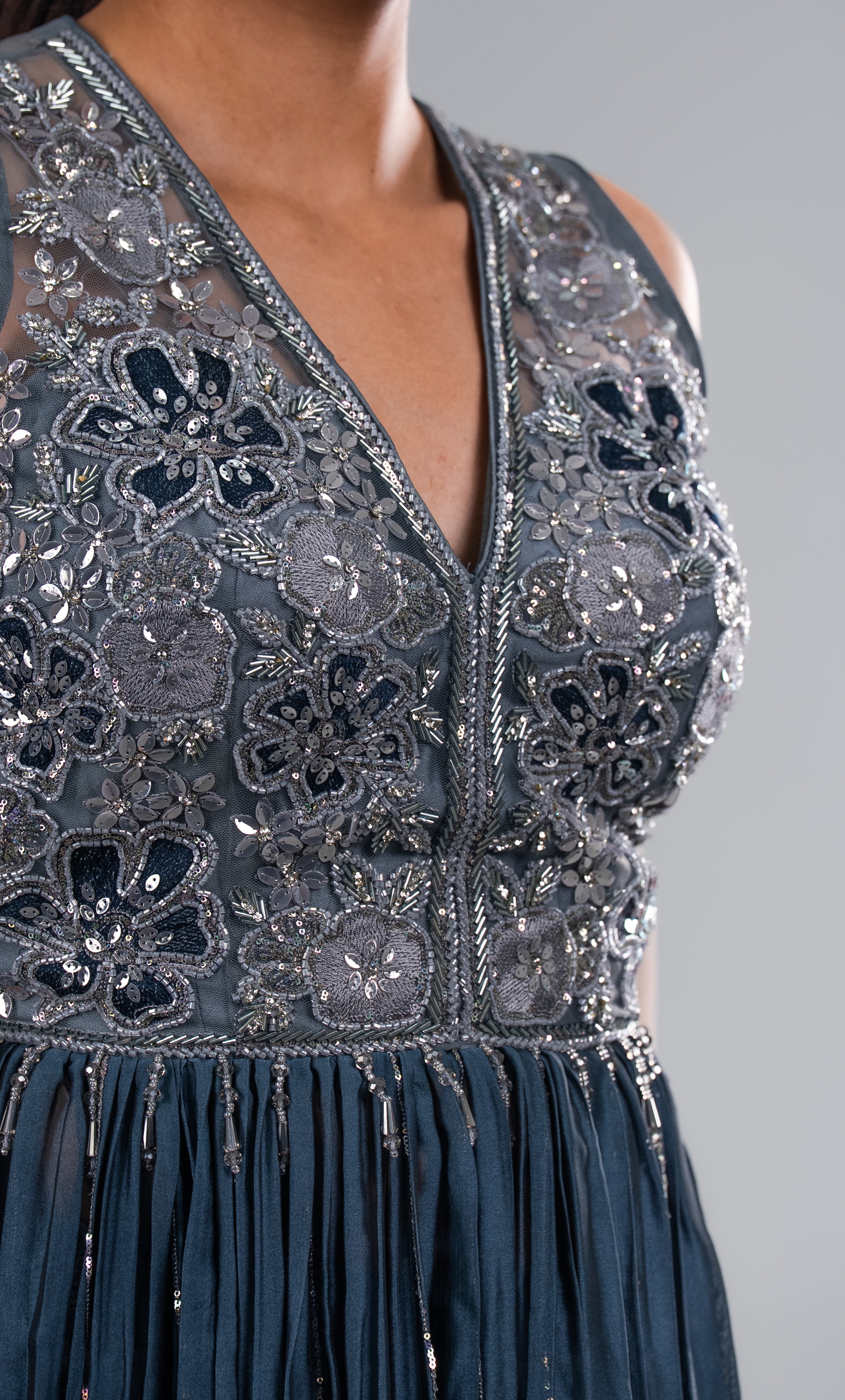 - Style & Fit Tips: The pleated garara adds volume and drama, while the embroidered bodice enhances structure. Pair with silver jewelry and soft waves for a graceful, regal look.