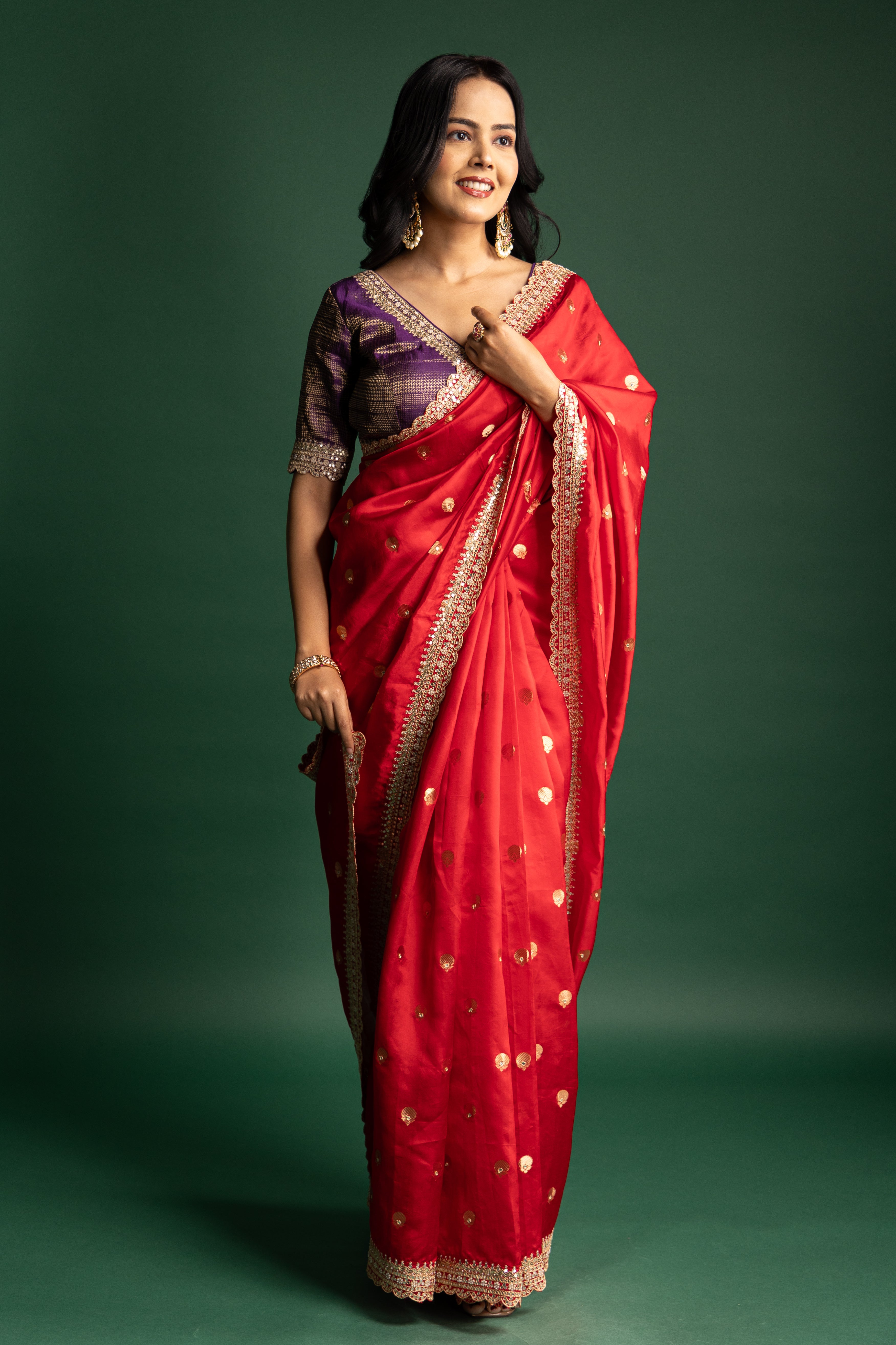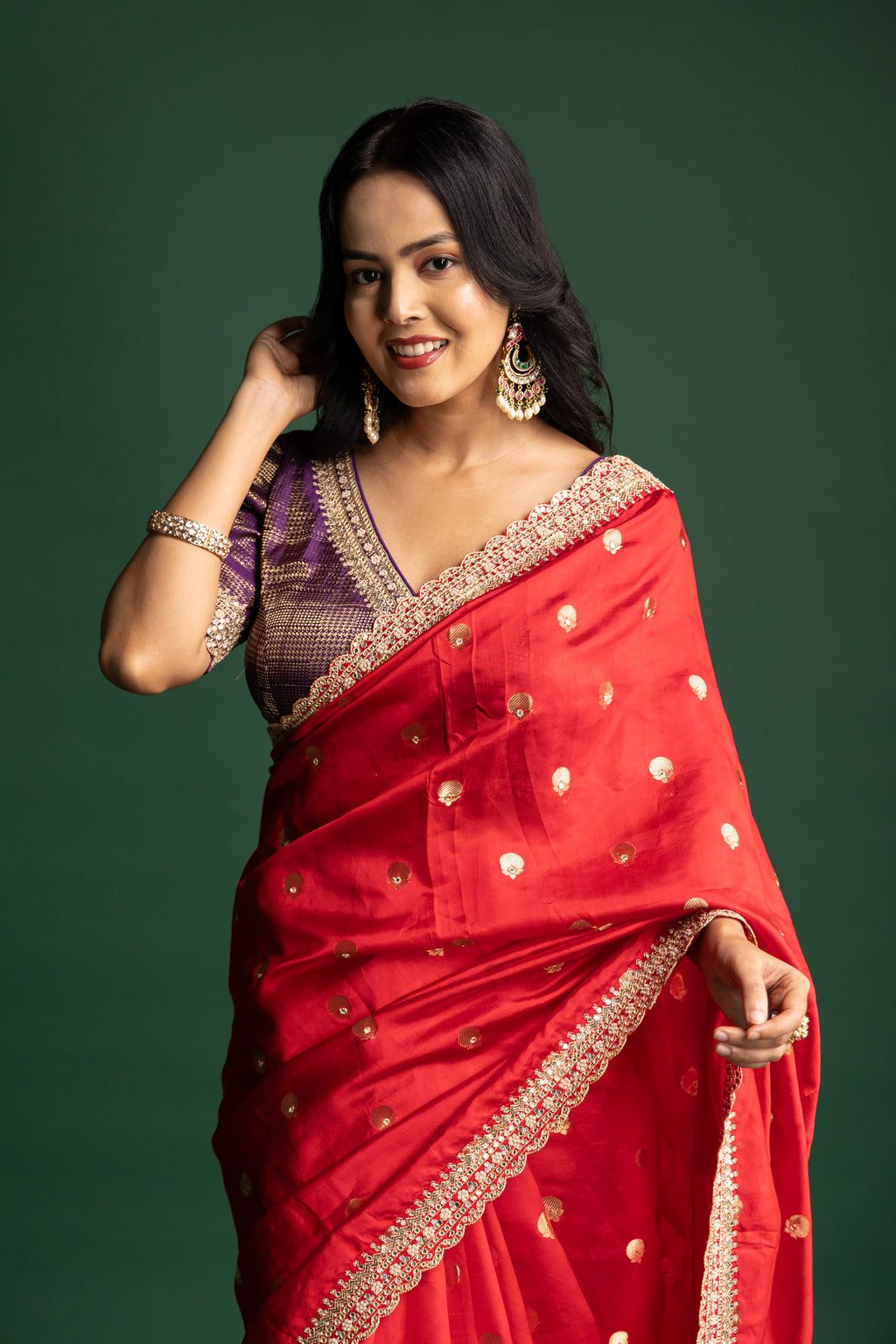 This ruby red silk saree features shimmering gold polka motifs and opulent borders, offering a richly traditional drape perfect for grand celebrations and high-end festive occasions.