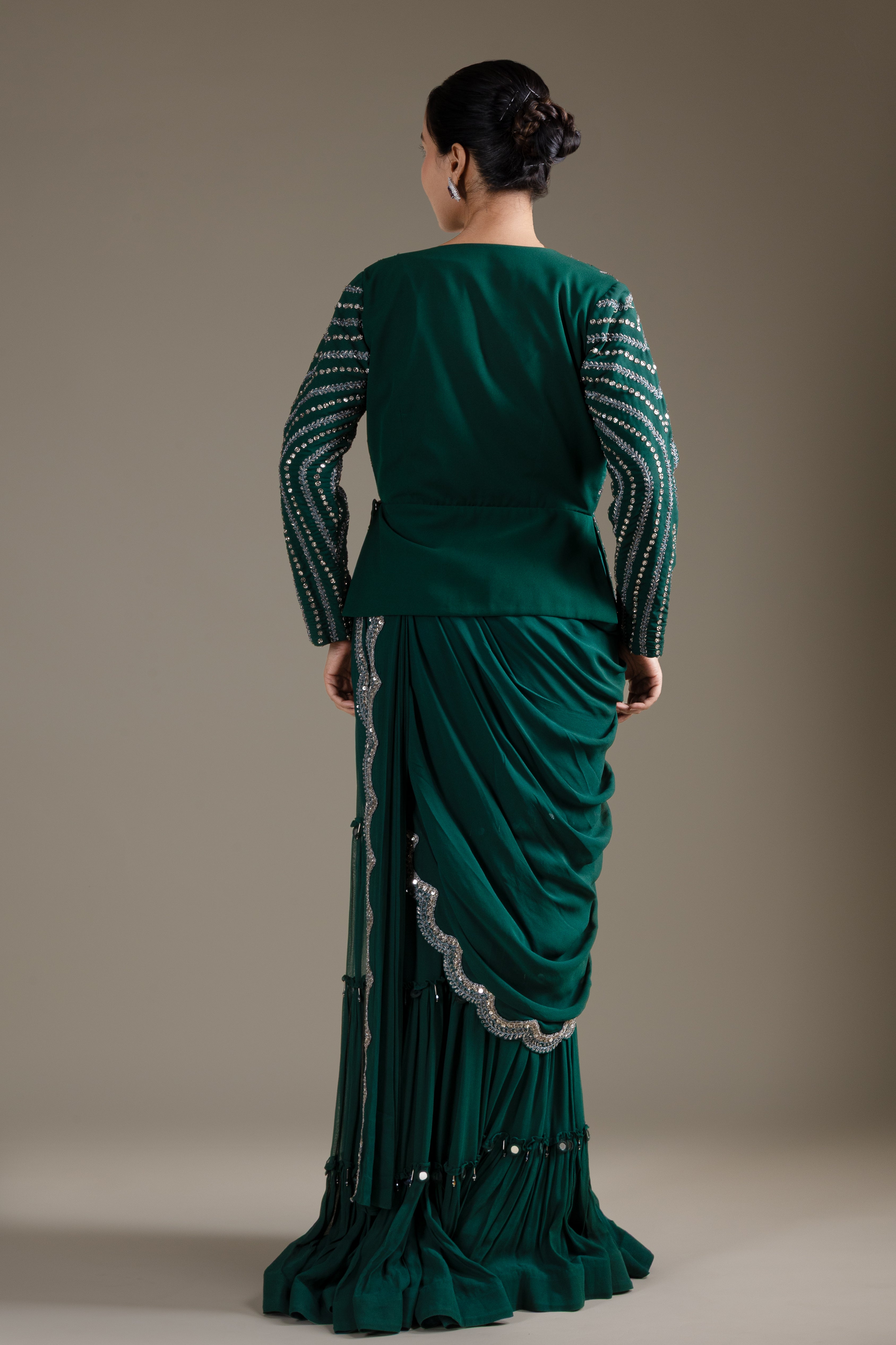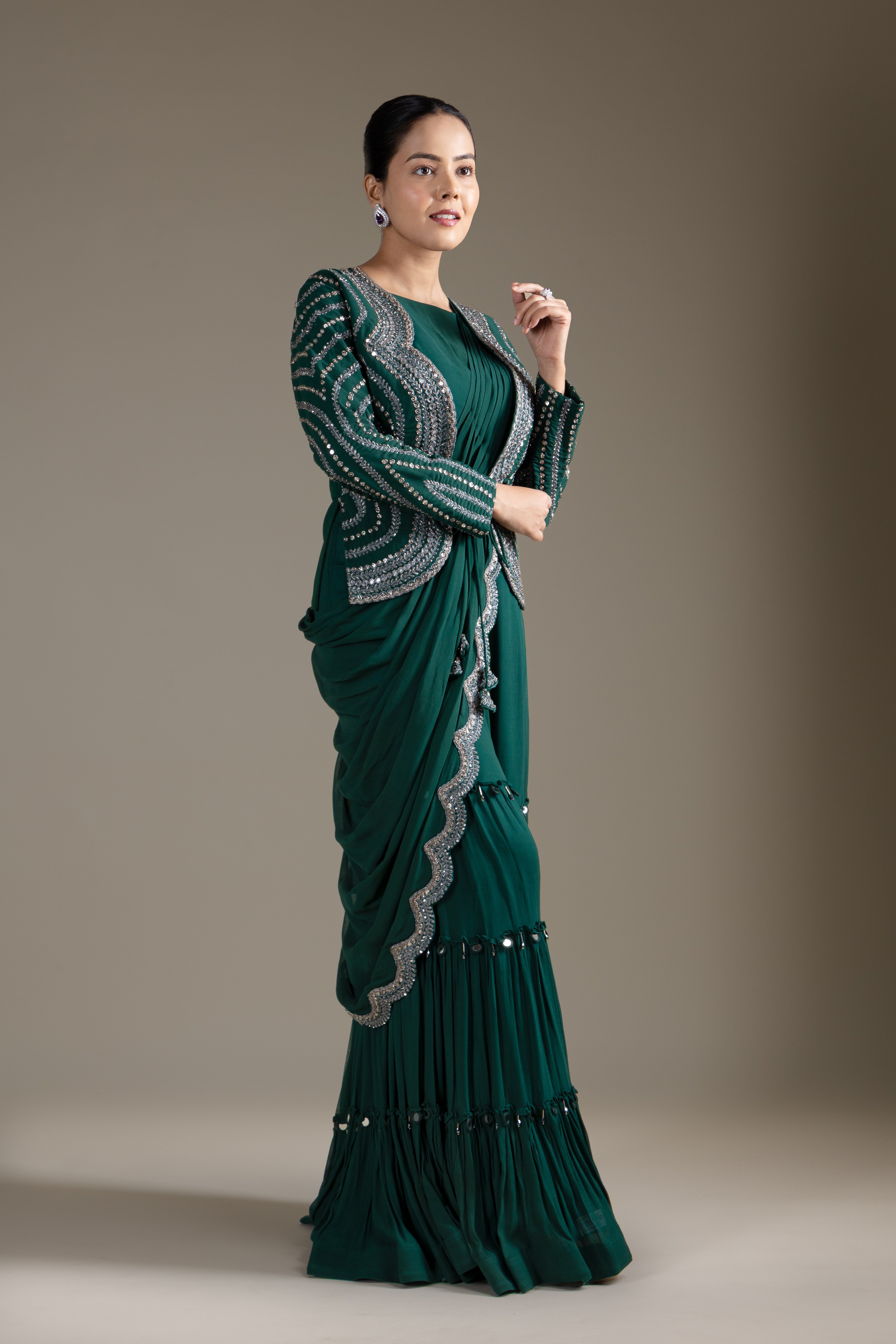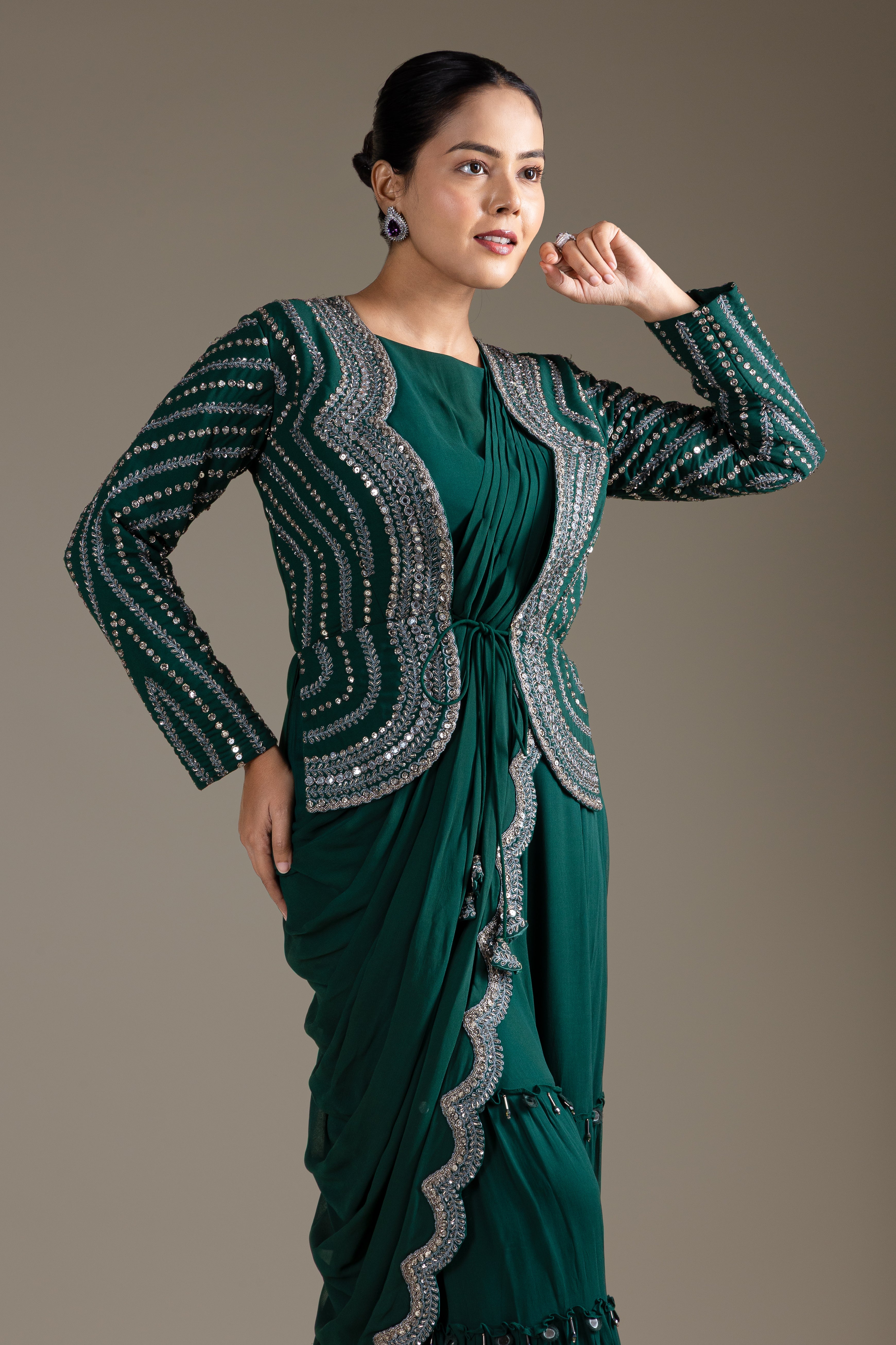 Emerald Illusion Mirrored Jacket with Pre-Draped Garara & Crop Top Set