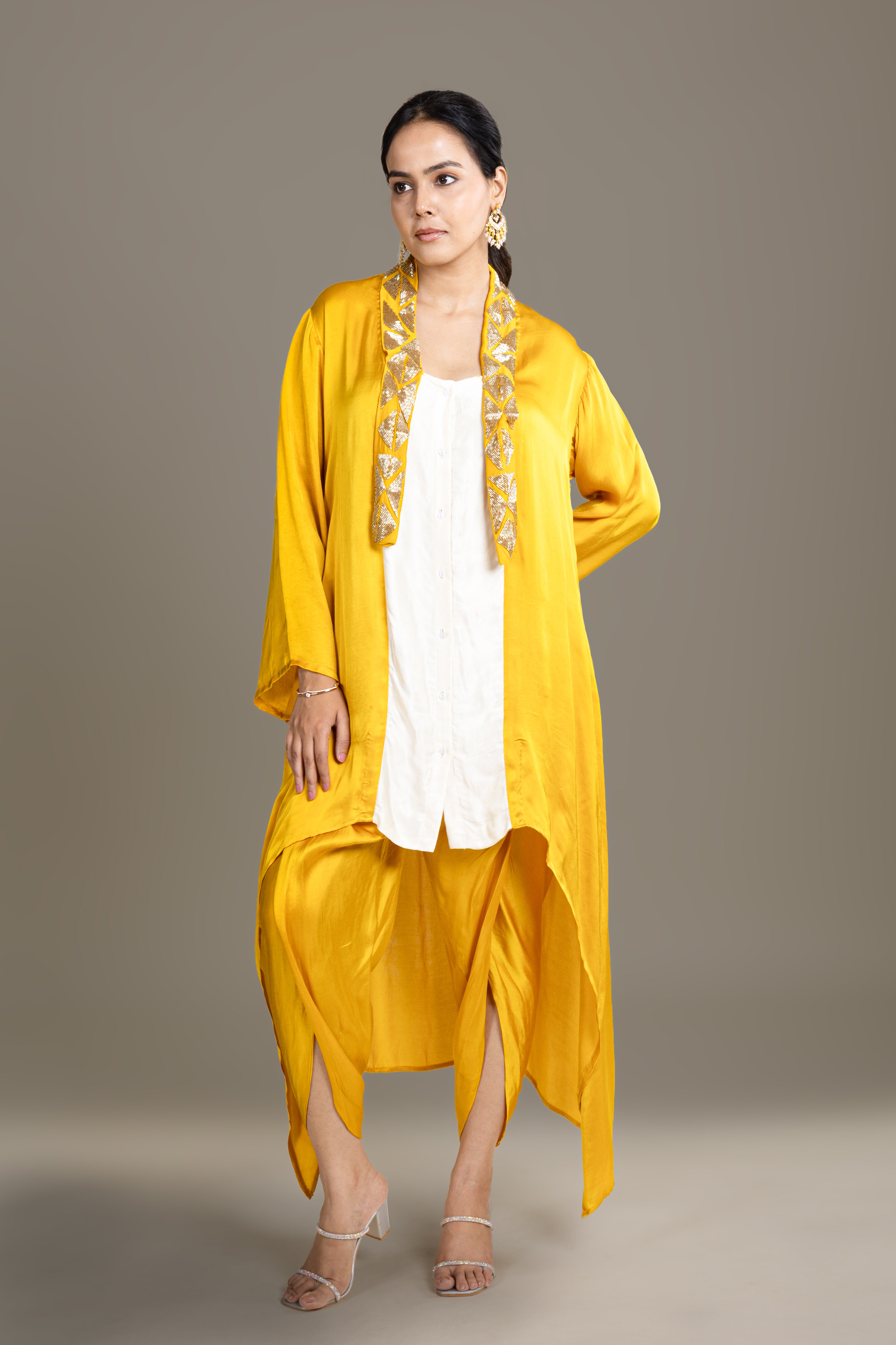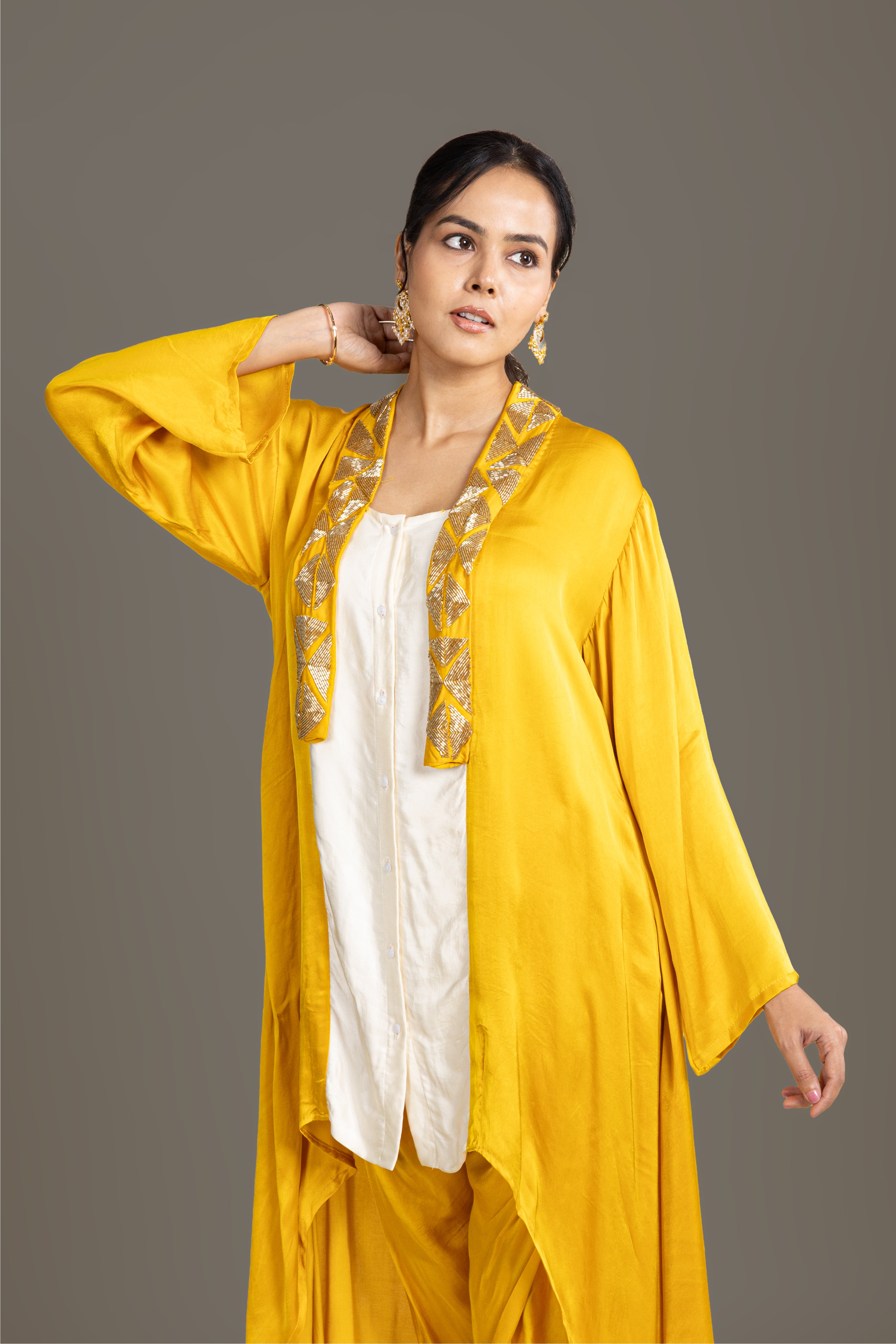 Radiate in this sunlit mustard high low kurta set, featuring an embellished collar and contemporary silhouette, designed to bring a modern twist to traditional festive and day events.